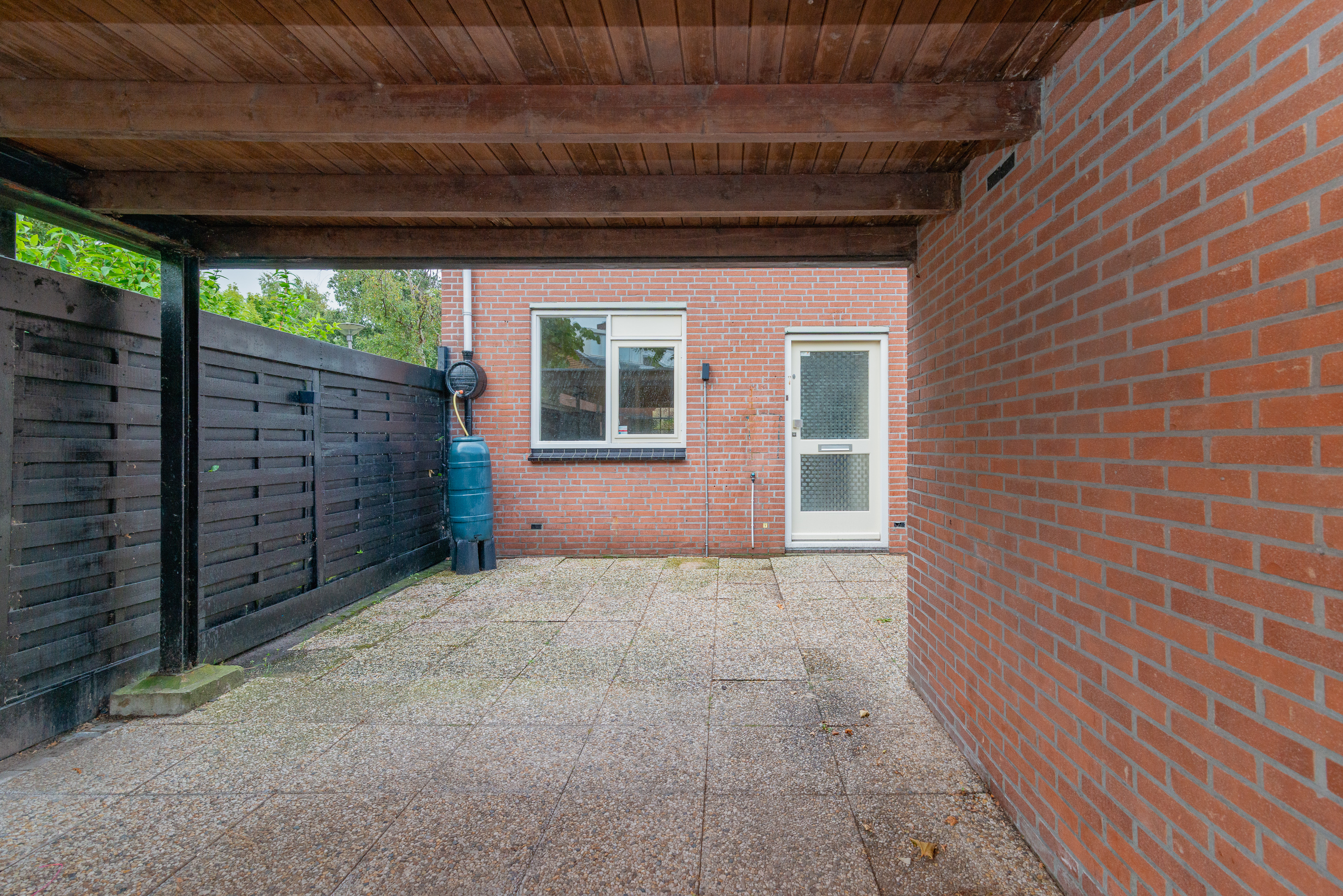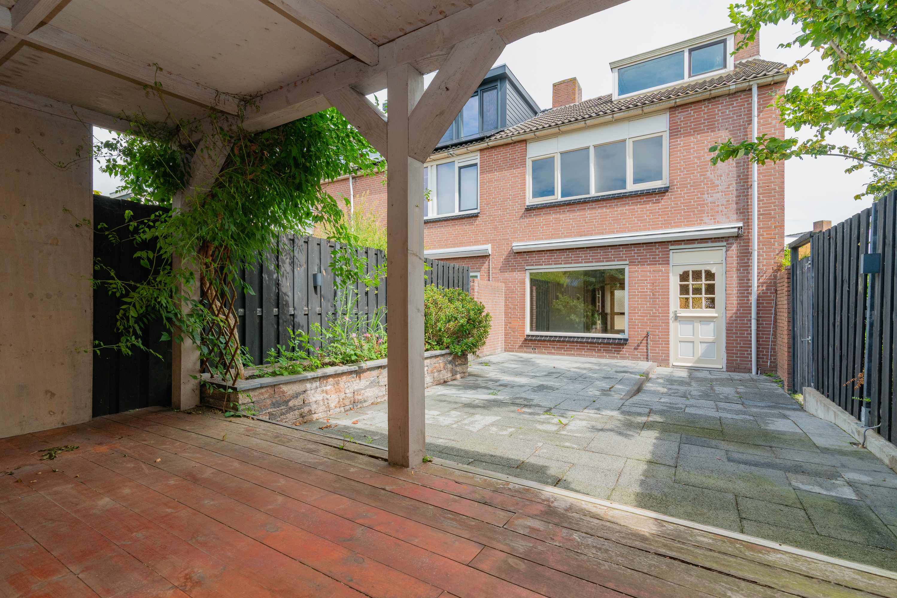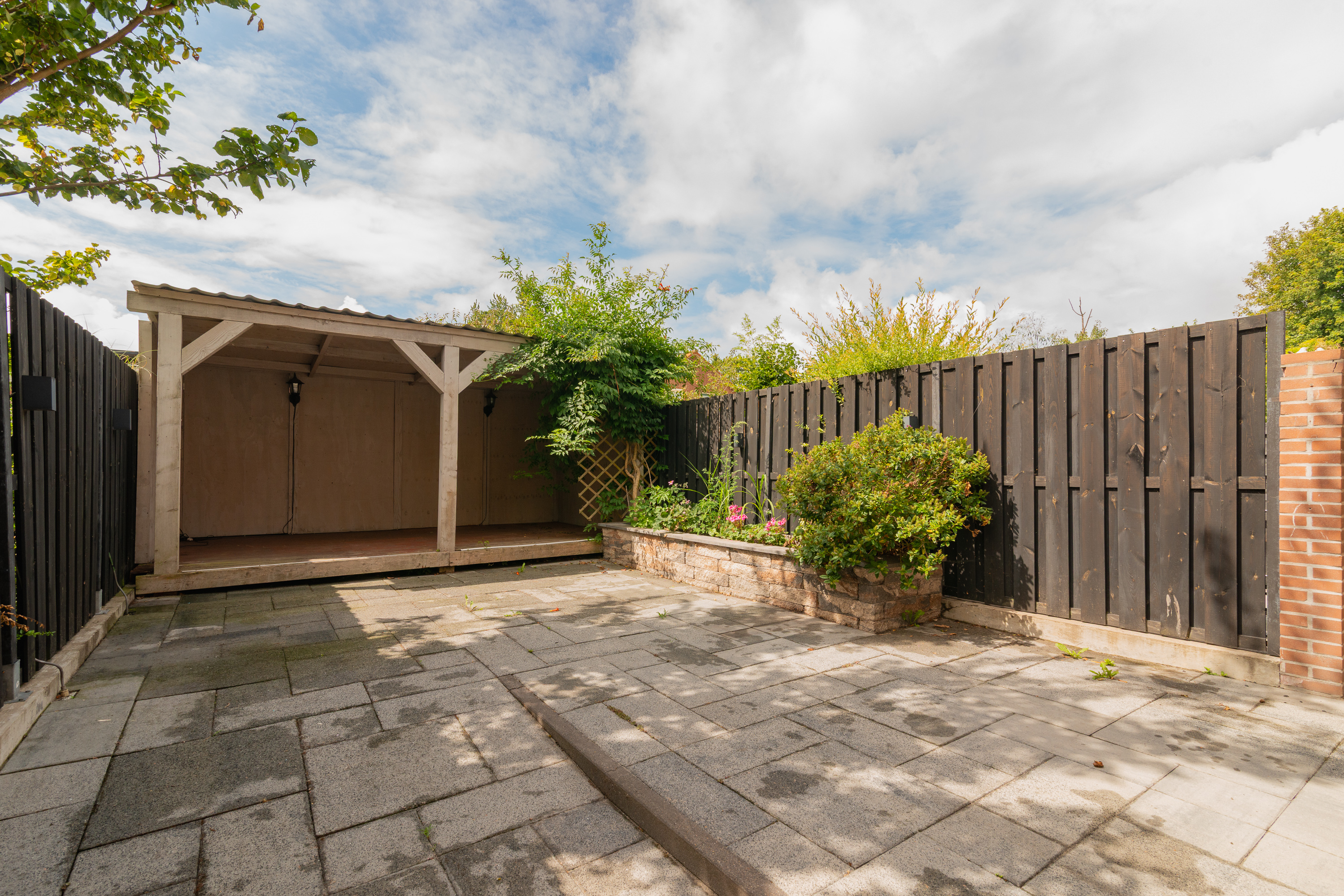 De achtertuin, gelegen op het westen, is bereikbaar vanuit de woonkamer en biedt volop ruimte voor een loungehoek of eettafel. Achterin de tuin staat nog een overkapping waar je zowel zomers als winters kunt genieten.