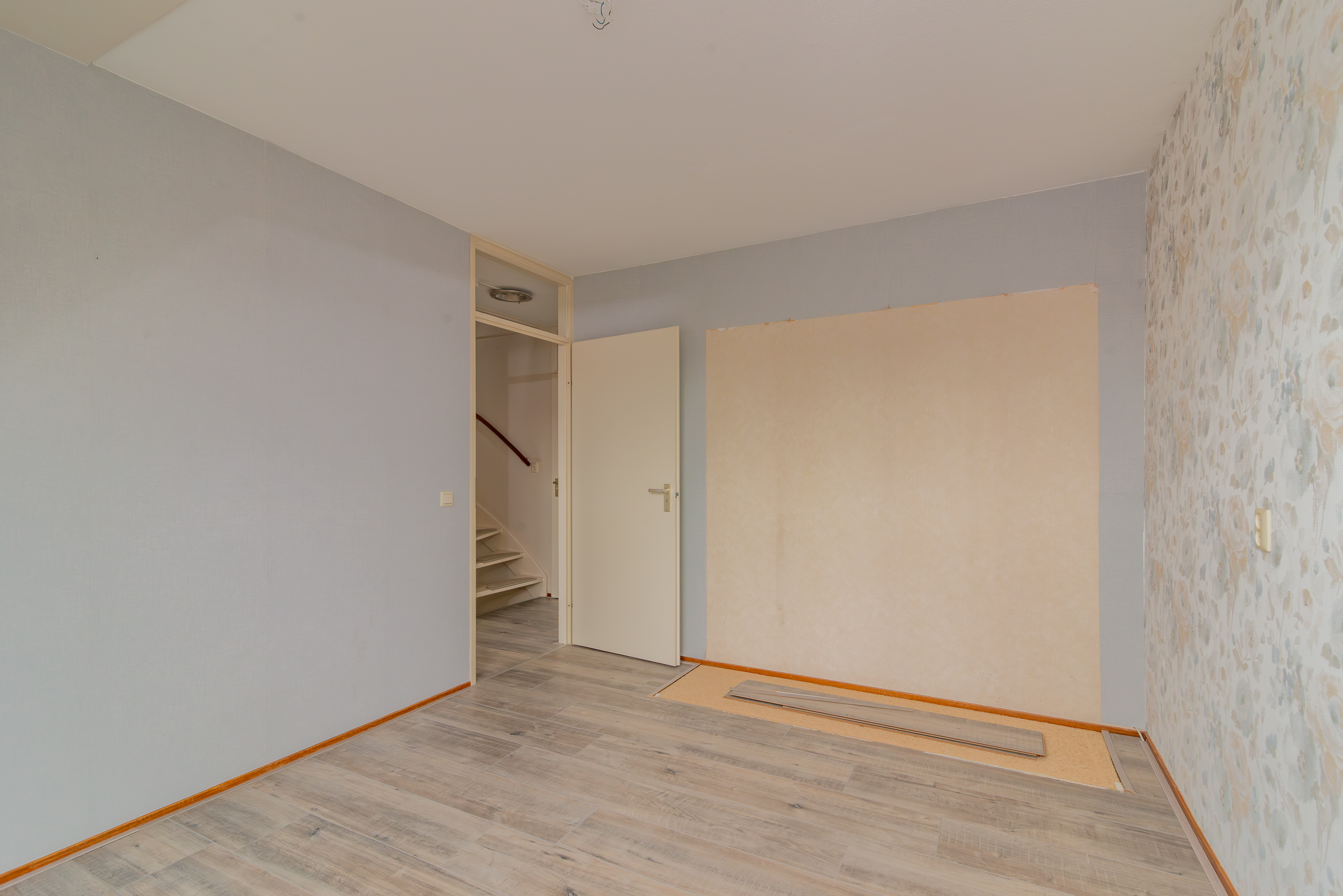 Je komt binnen in de hal, waar zich de meterkast, het toilet en de trap naar boven bevinden. Vanuit hier loop je door naar de woonkamer.