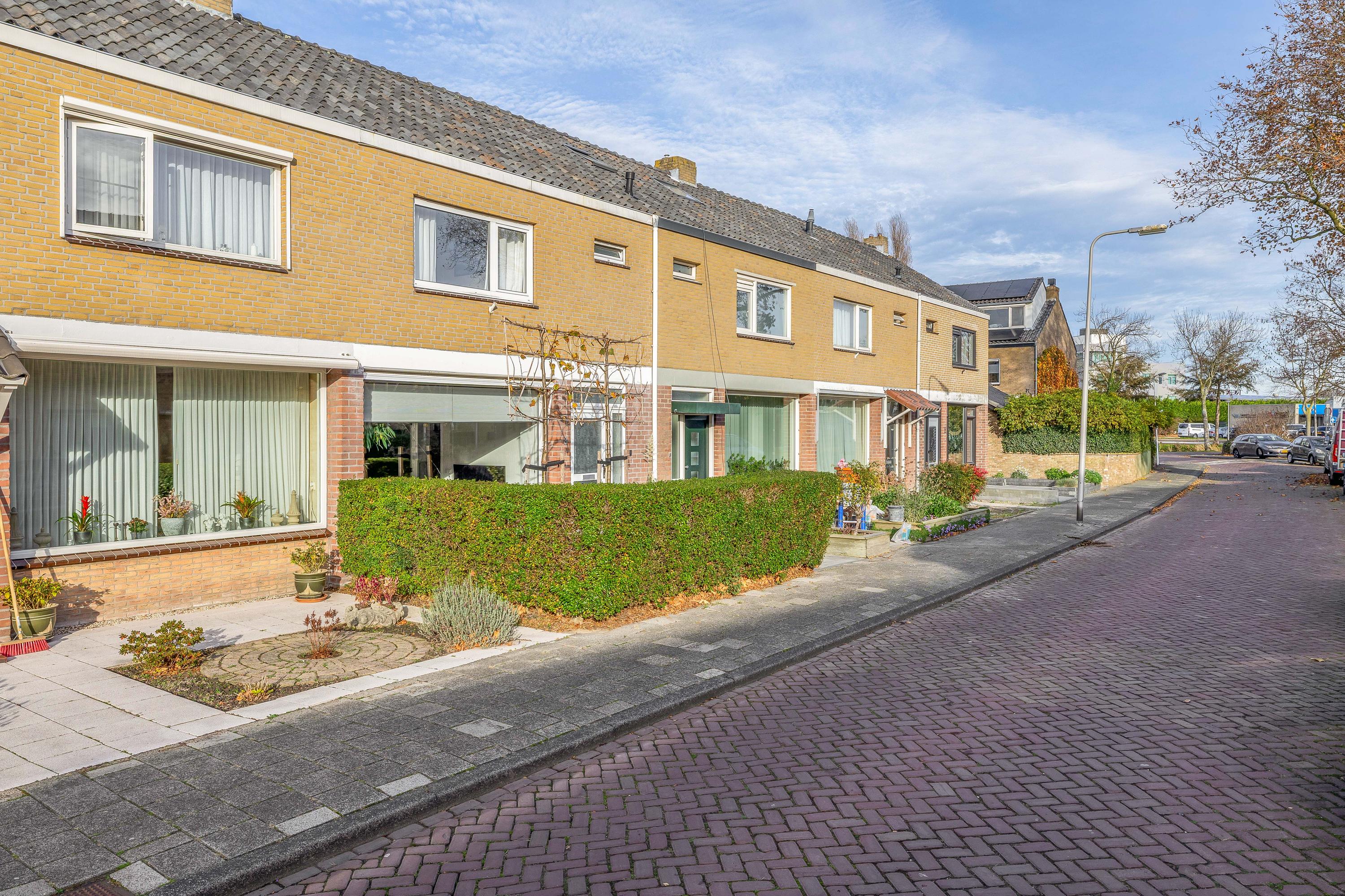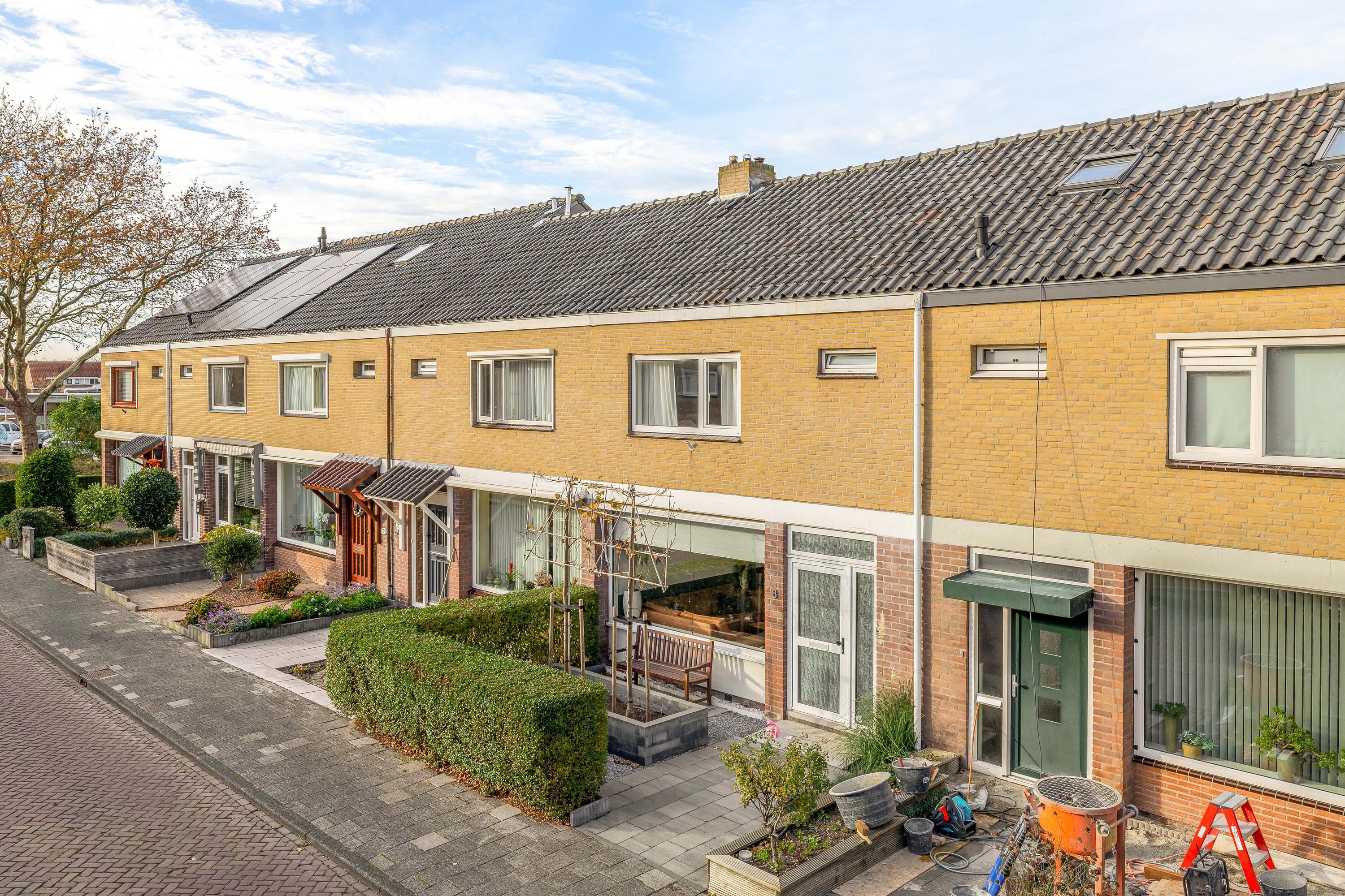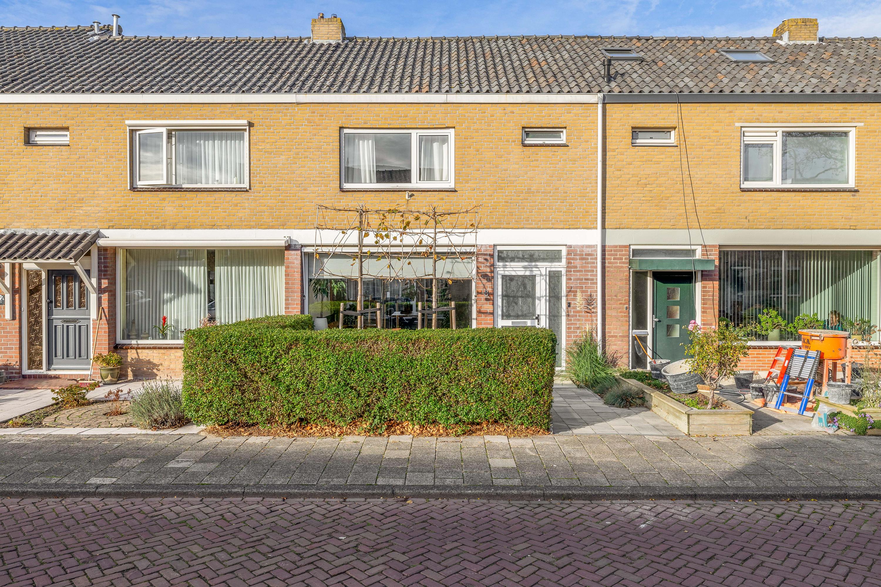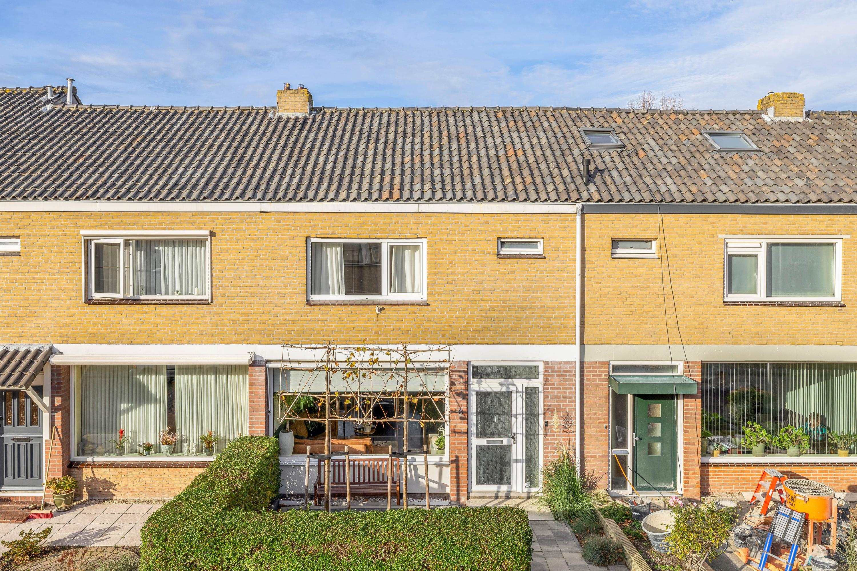 Aan de voorzijde beschikt de woning over een verzorgde voortuin met bestrating, groene borders en een verhoogde plantenbak met bomen. De brede raampartij en kunststof voordeur geven het huis een uitnodigende uitstraling.