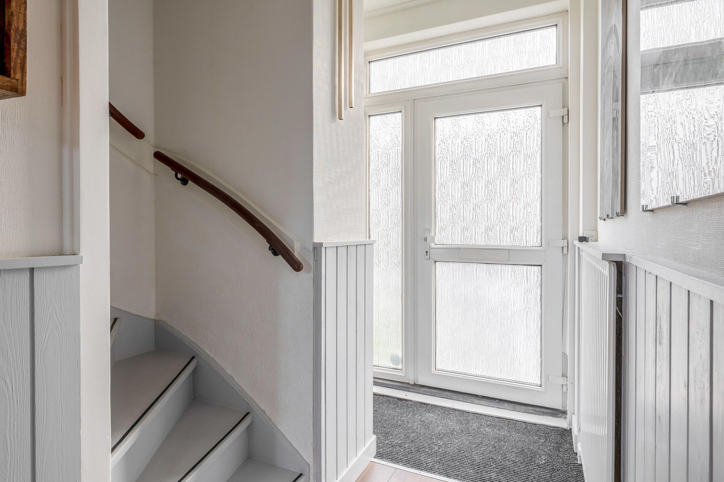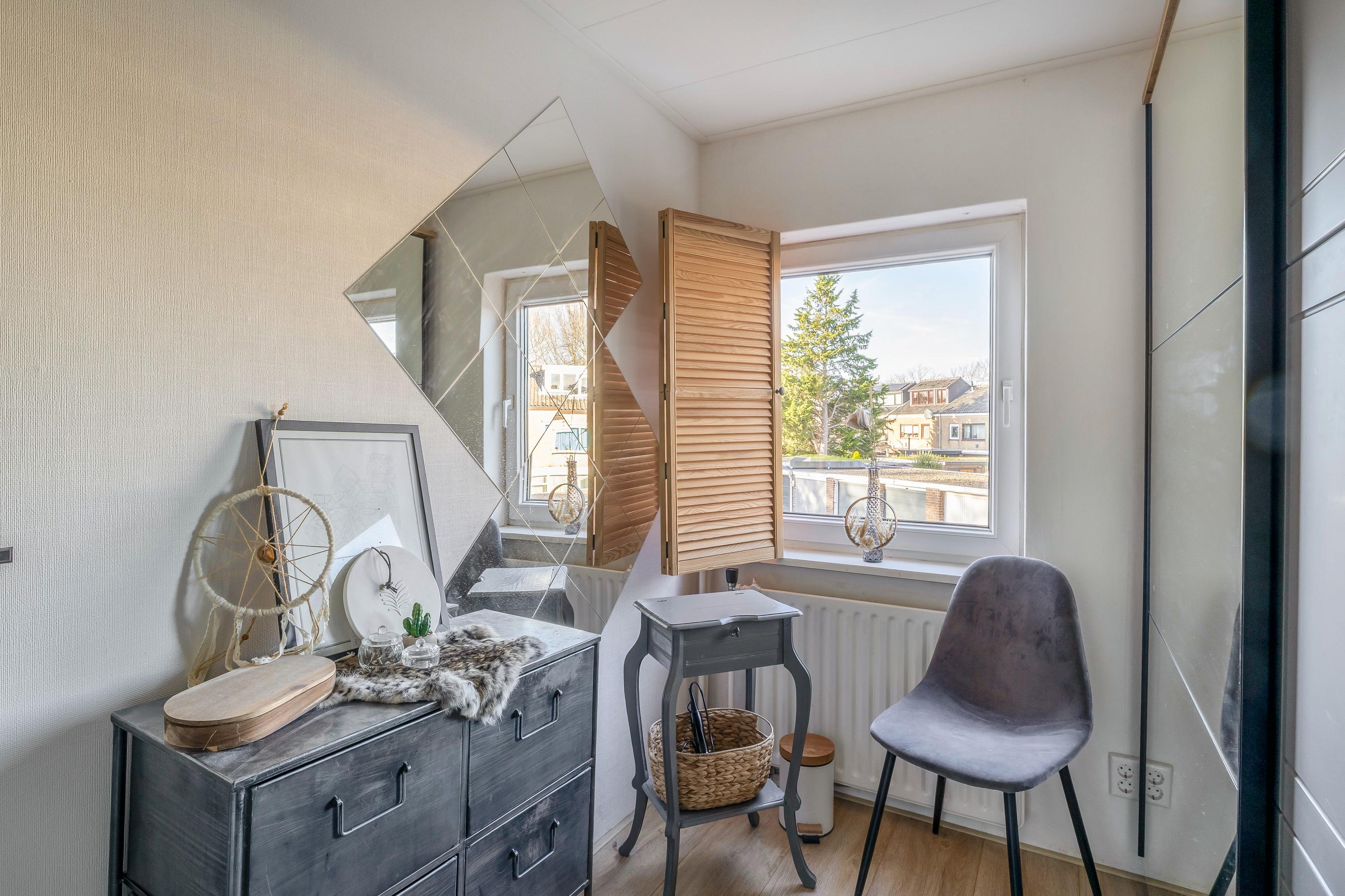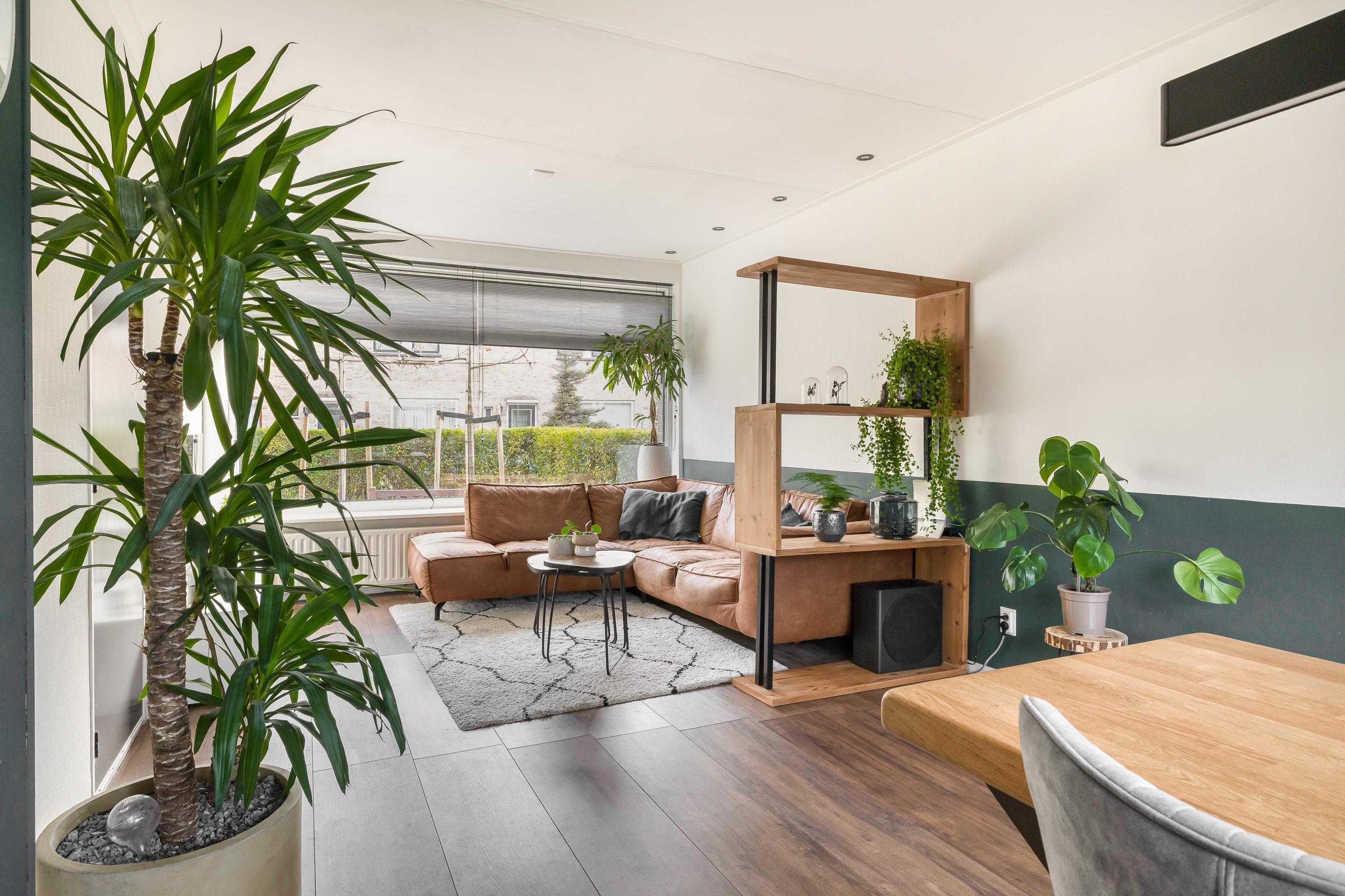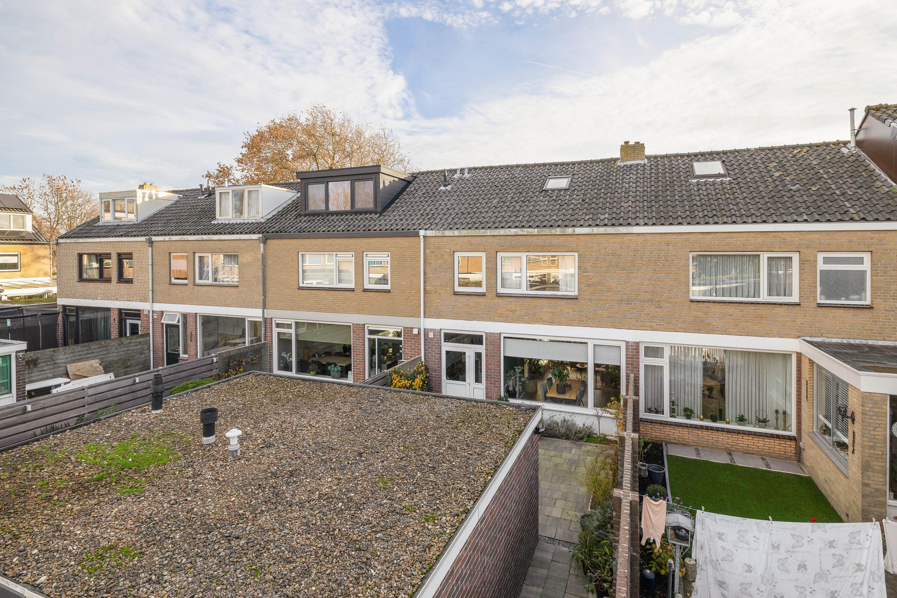 Aan de voorzijde beschikt de woning over een verzorgde voortuin met bestrating, groene borders en een verhoogde plantenbak met bomen. De brede raampartij en kunststof voordeur geven het huis een uitnodigende uitstraling.