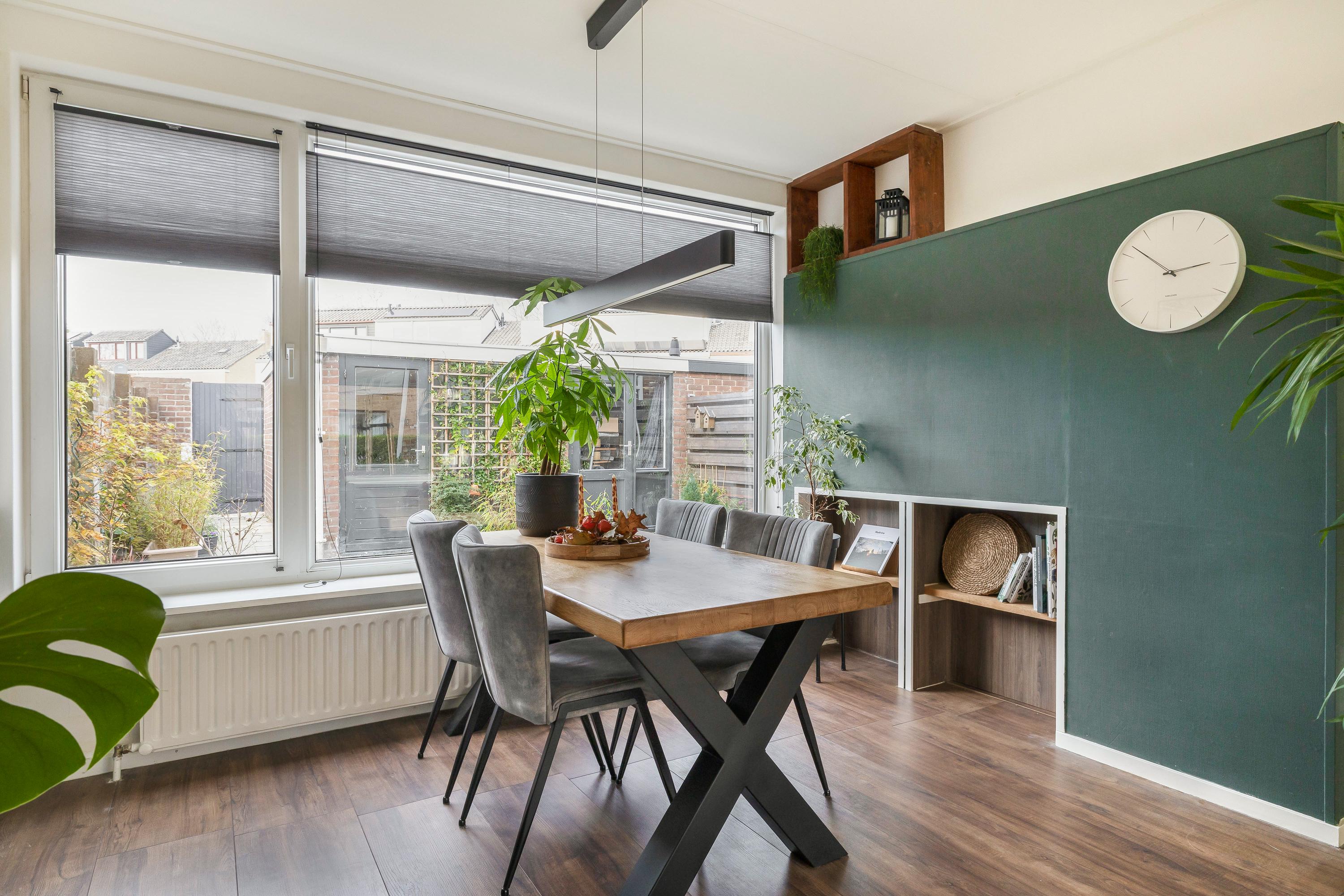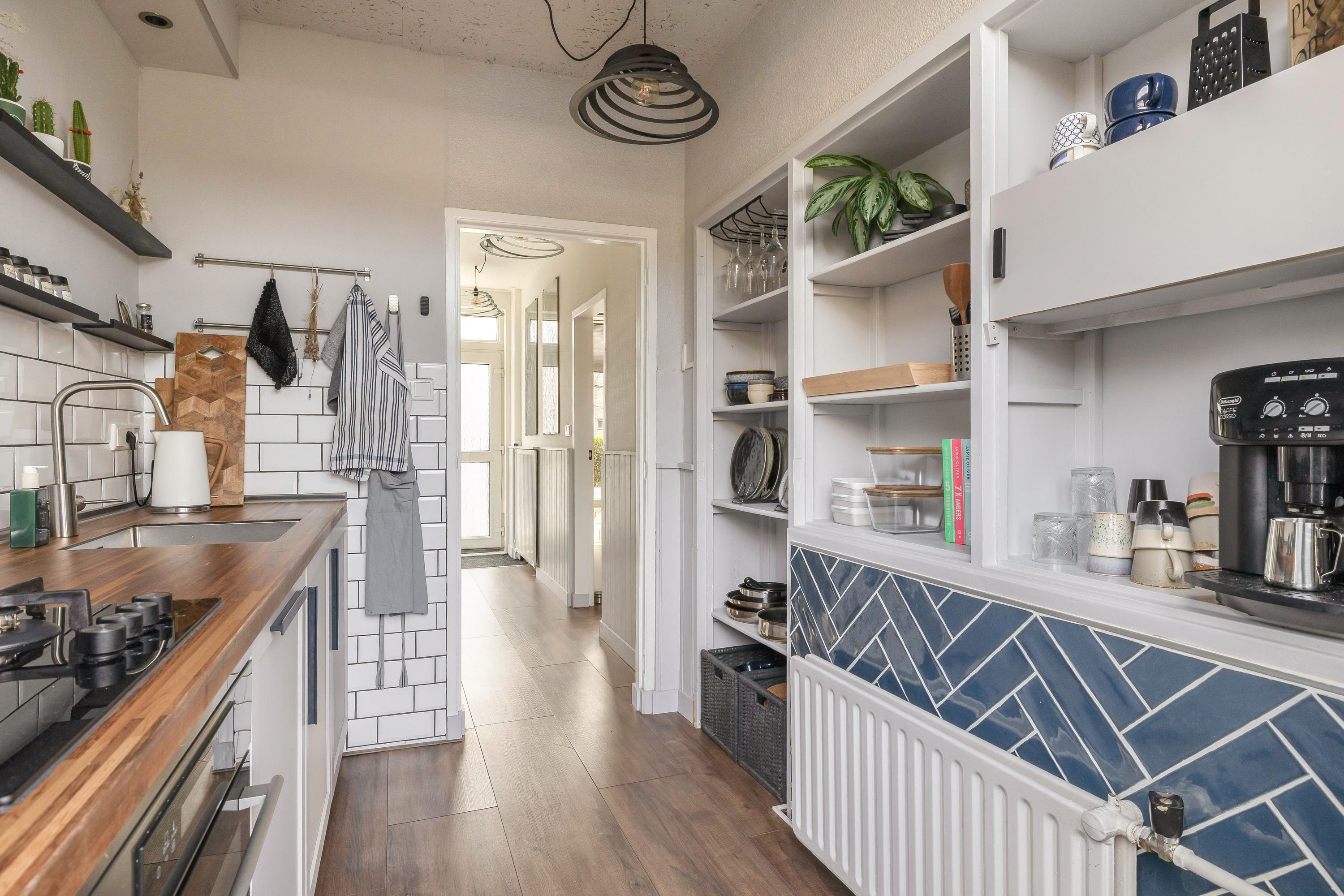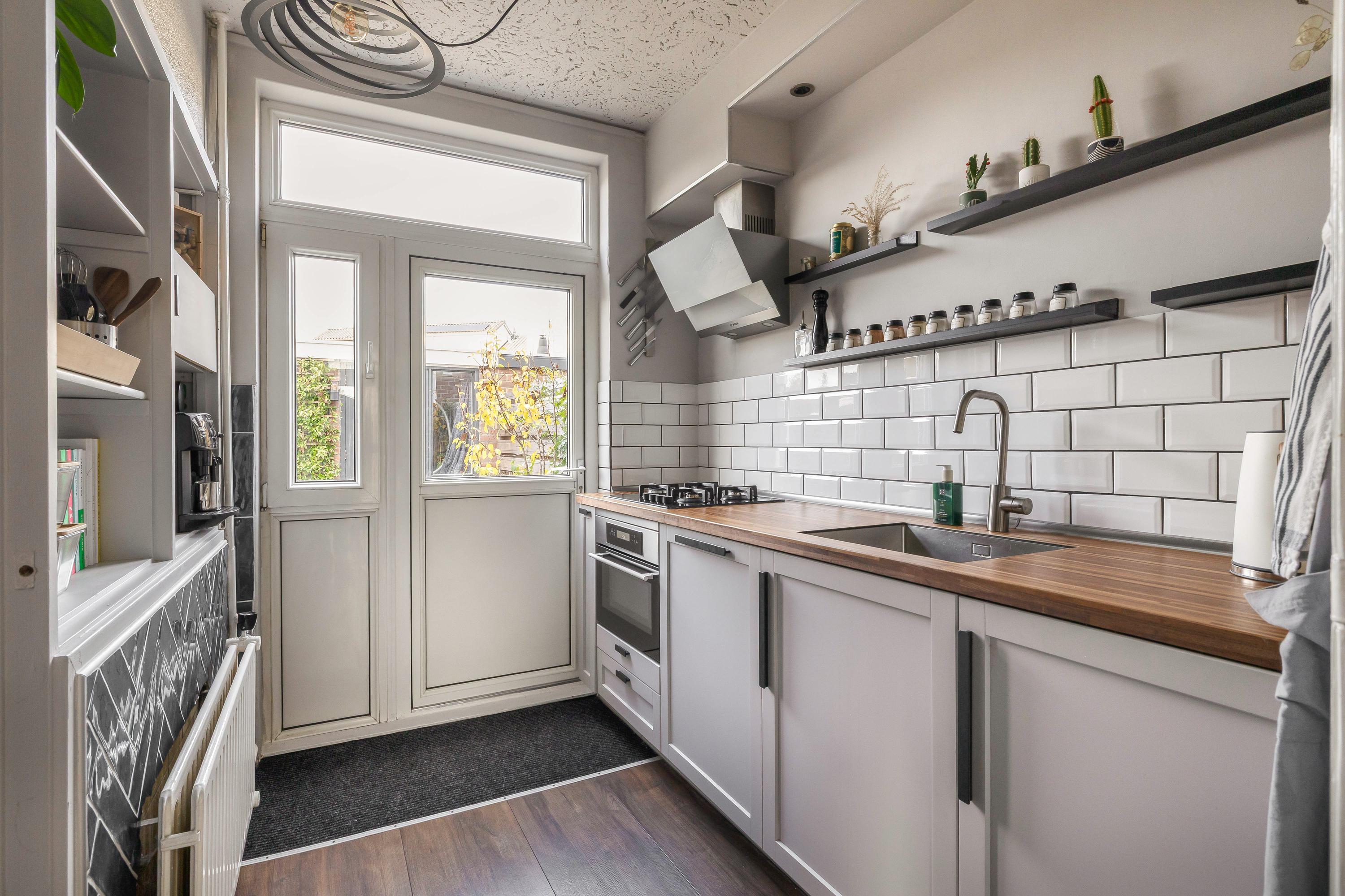 De keuken is uitgevoerd in een stijlvolle combinatie van witte fronten, een houten werkblad en zwarte accenten en is geplaatst in 2022. De keuken is voorzien van diverse inbouwapparatuur, waaronder een gaskookplaat, afzuigkap, vaatwasser en een combi magnetron / oven. Daarnaast is er een elektrische close-in boiler (2022) aanwezig voor warm tapwater in de keuken. Dankzij de praktische kastenwand en open planken is er meer dan voldoende bergruimte. Via de achterdeur is direct toegang tot de achtertuin.