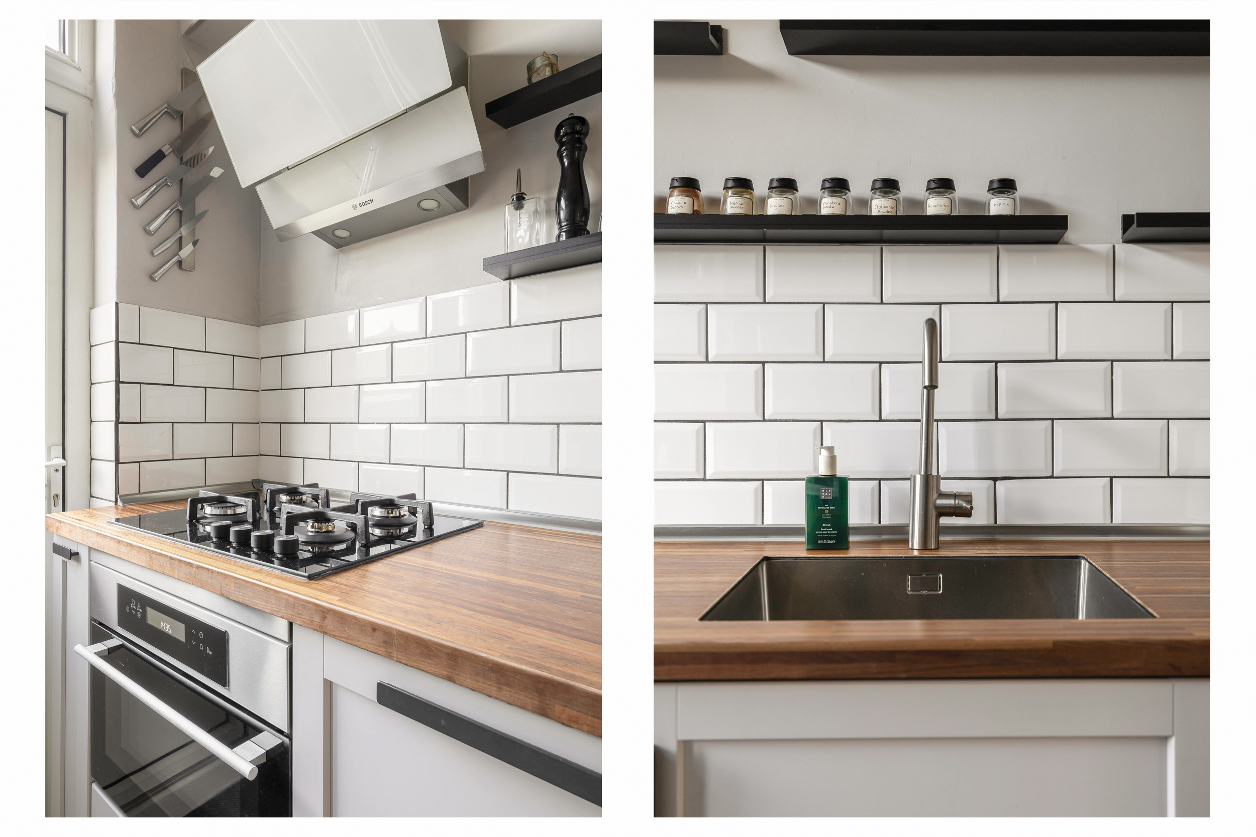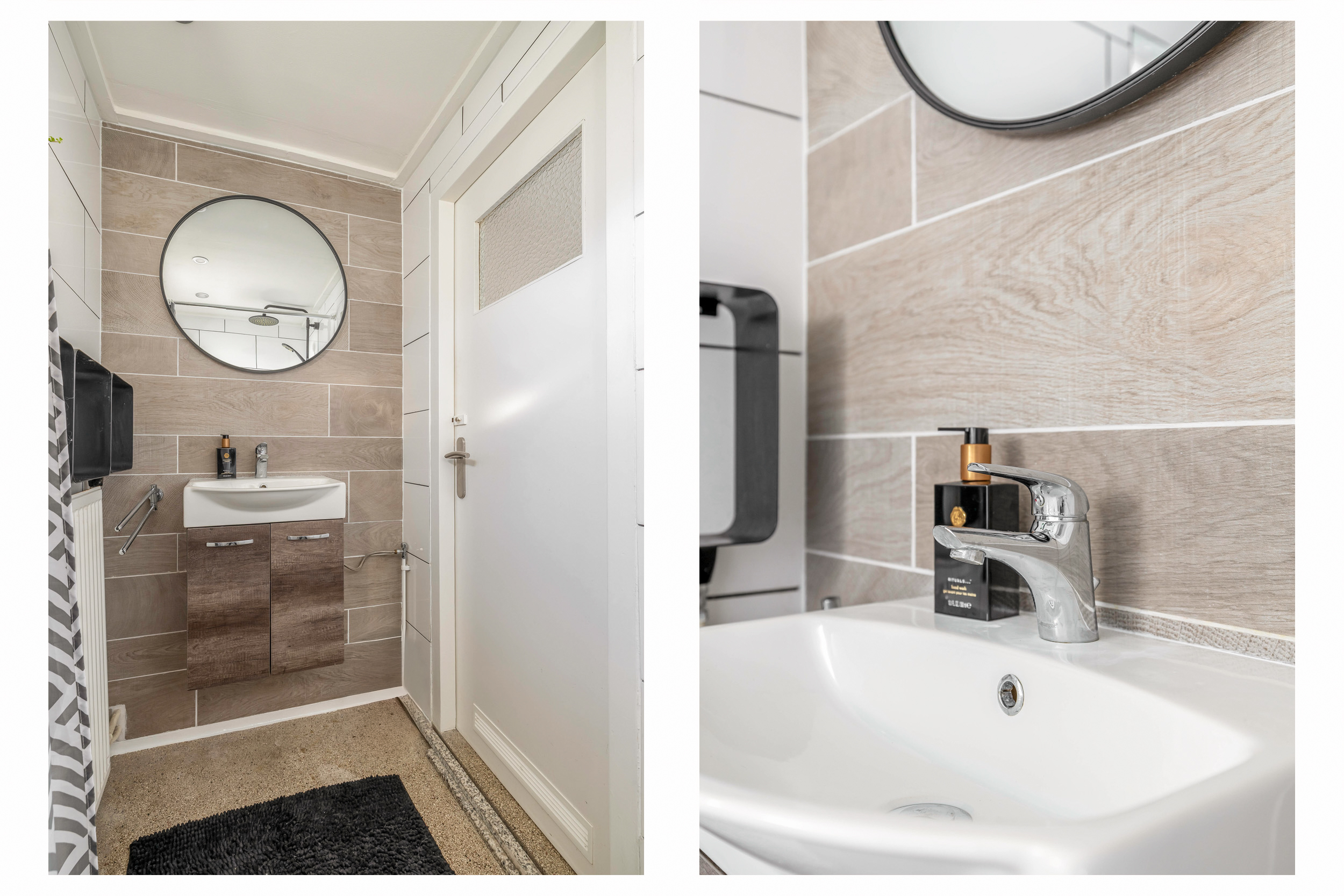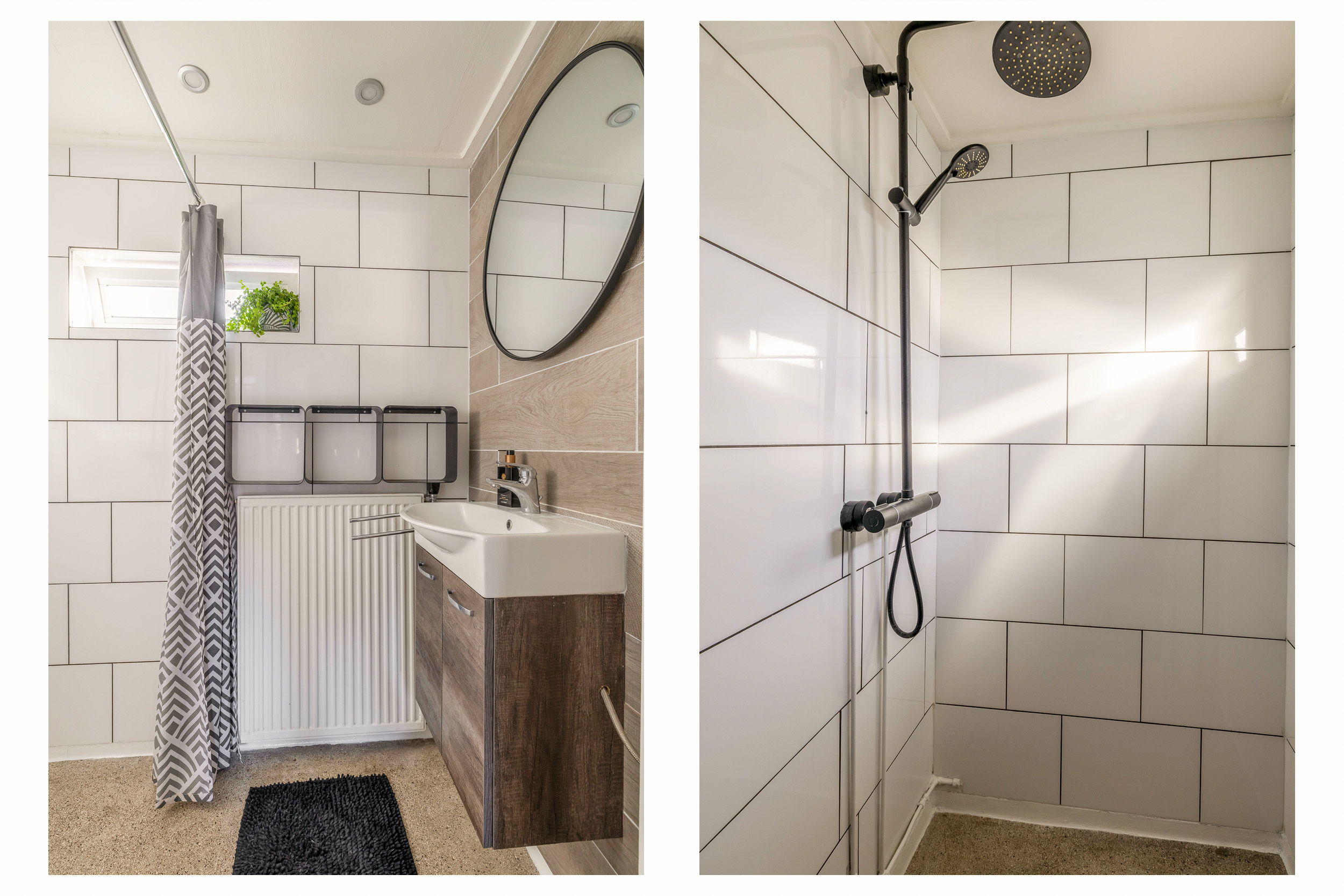 De keuken is uitgevoerd in een stijlvolle combinatie van witte fronten, een houten werkblad en zwarte accenten en is geplaatst in 2022. De keuken is voorzien van diverse inbouwapparatuur, waaronder een gaskookplaat, afzuigkap, vaatwasser en een combi magnetron / oven. Daarnaast is er een elektrische close-in boiler (2022) aanwezig voor warm tapwater in de keuken. Dankzij de praktische kastenwand en open planken is er meer dan voldoende bergruimte. Via de achterdeur is direct toegang tot de achtertuin.