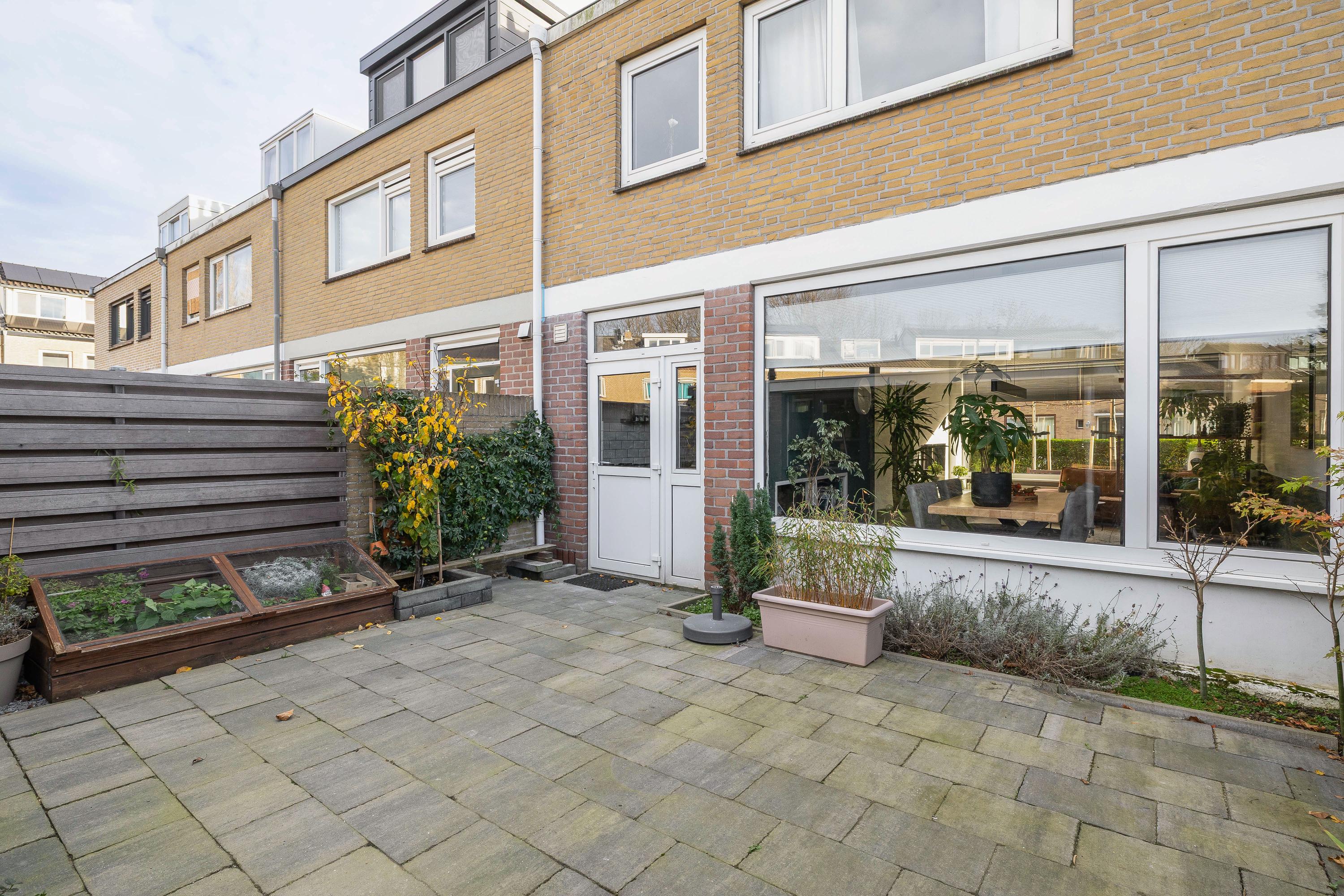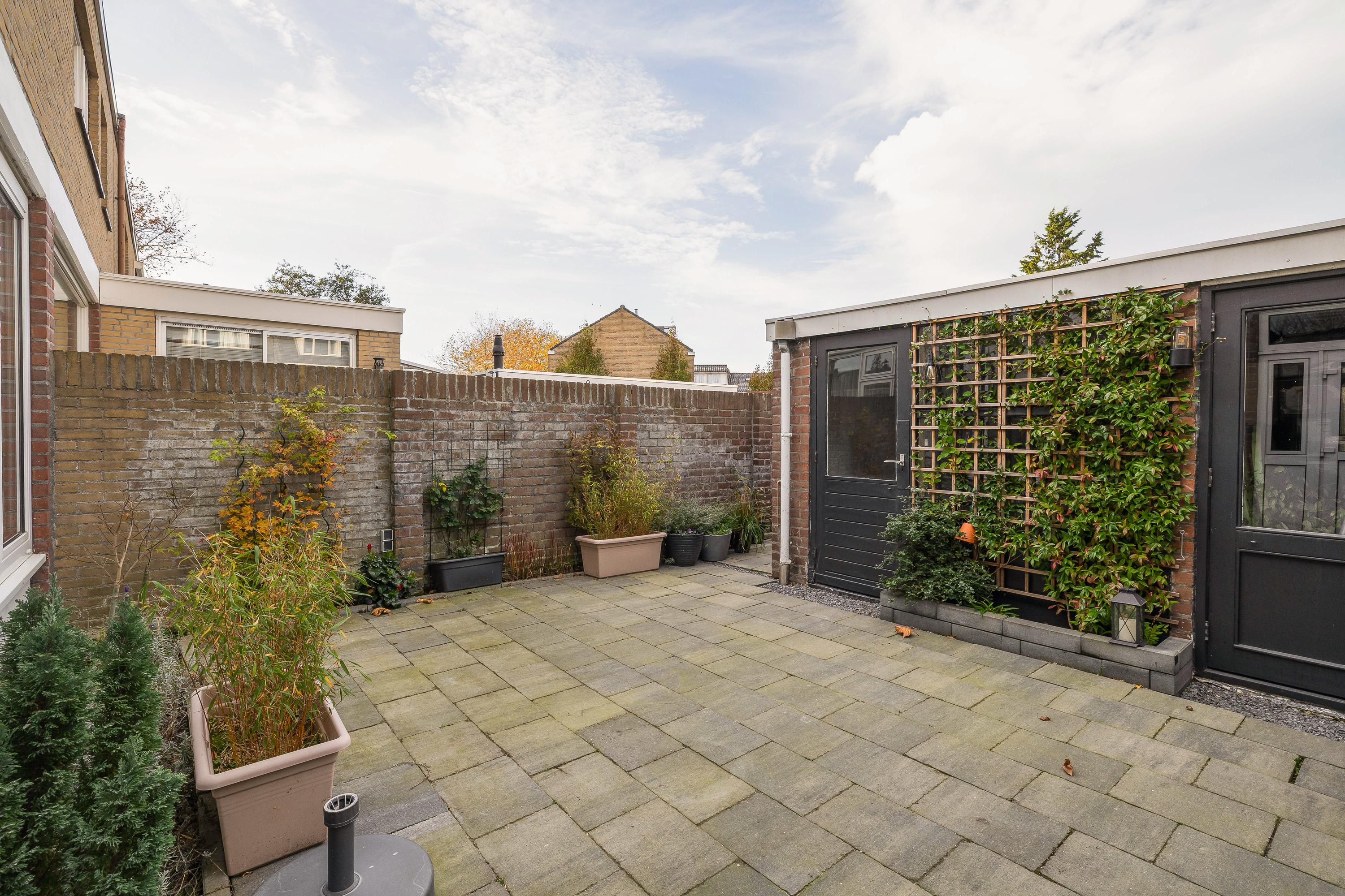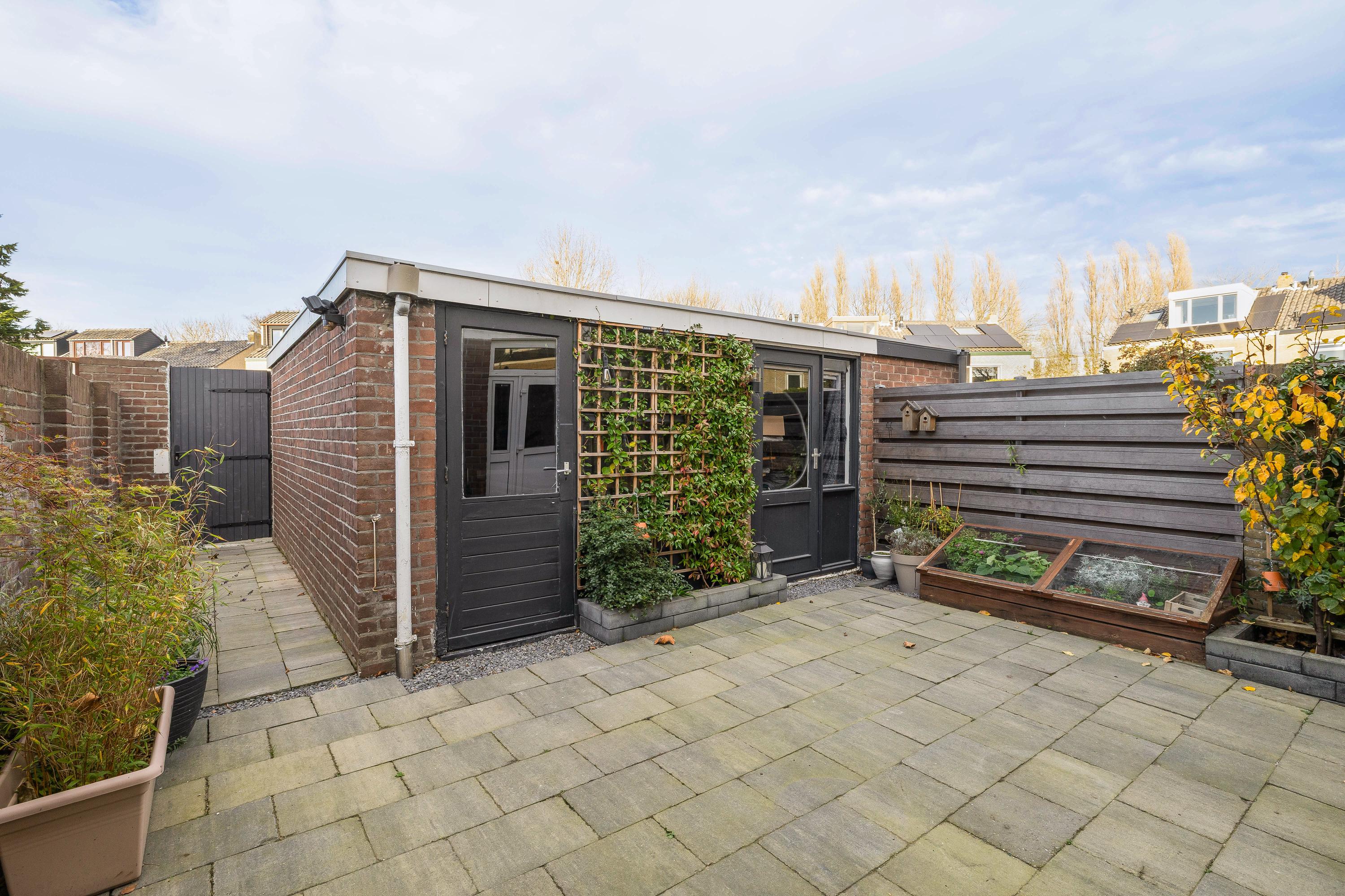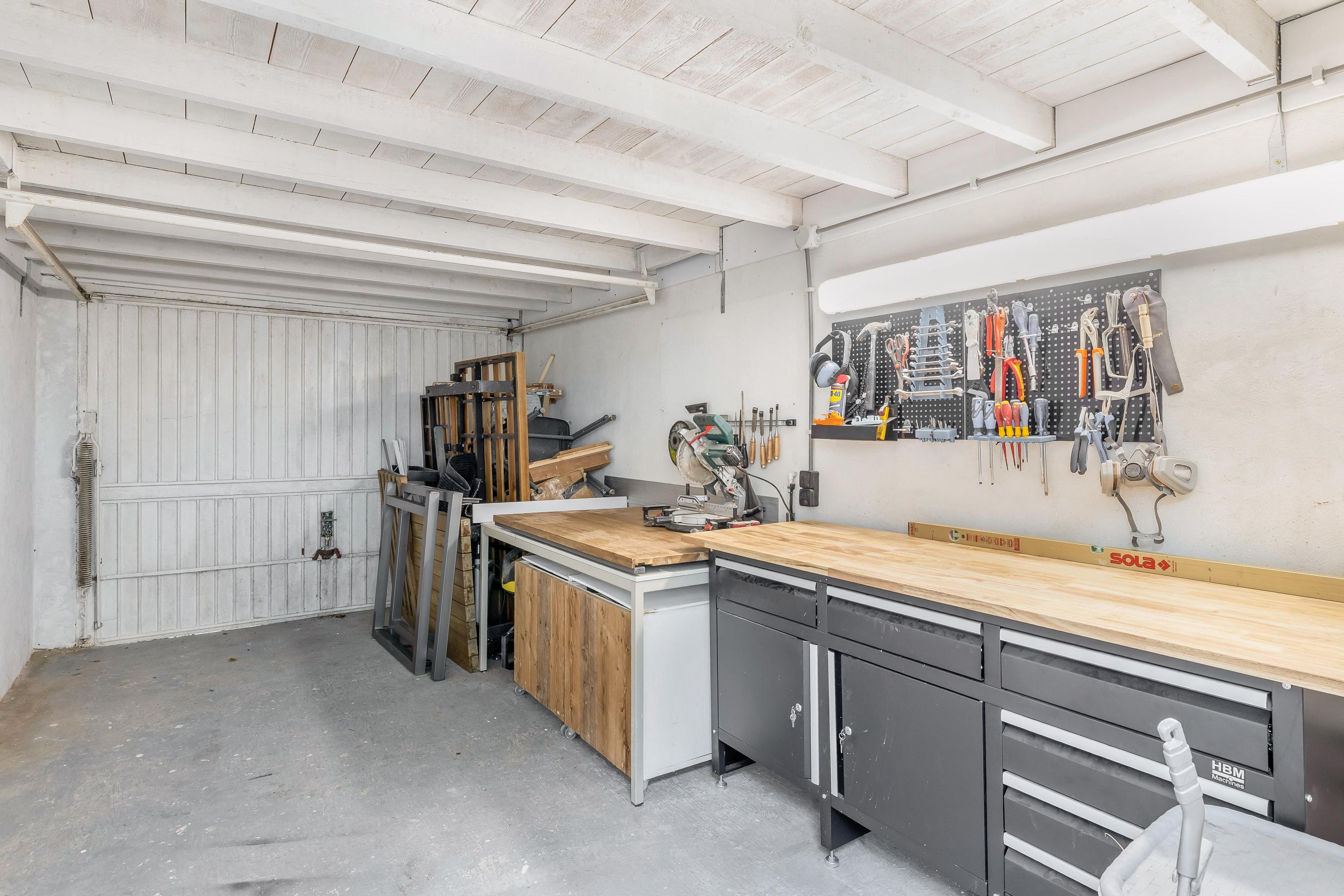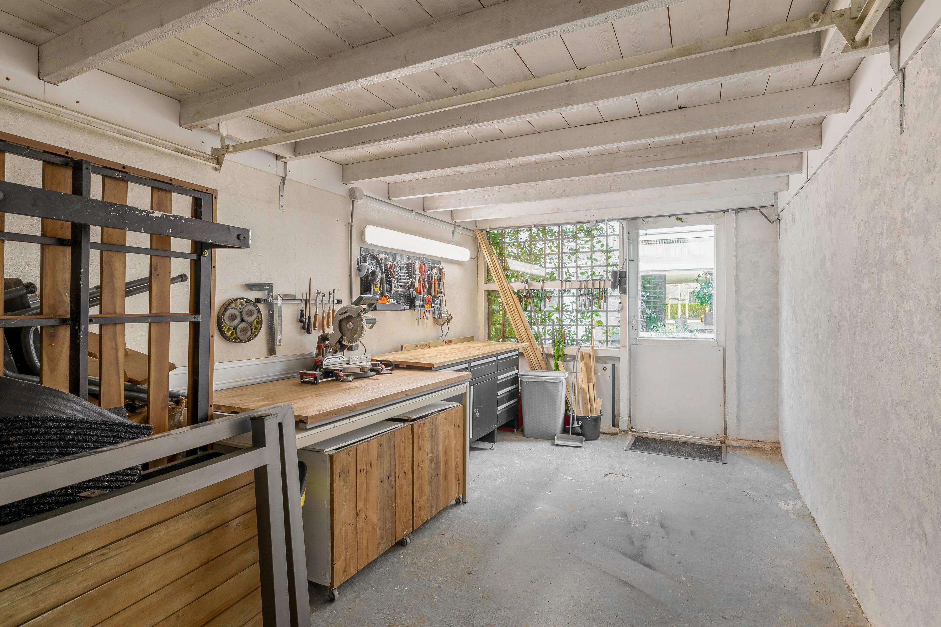 De achtertuin is gelegen op het noordwesten en beschikt over een berging met aangrenzende garage, beide bereikbaar vanuit de tuin én via de achterliggende straat. De garage biedt volop ruimte voor het stallen van een auto, motor of fietsen en is tevens geschikt als werk- of hobbyruimte.