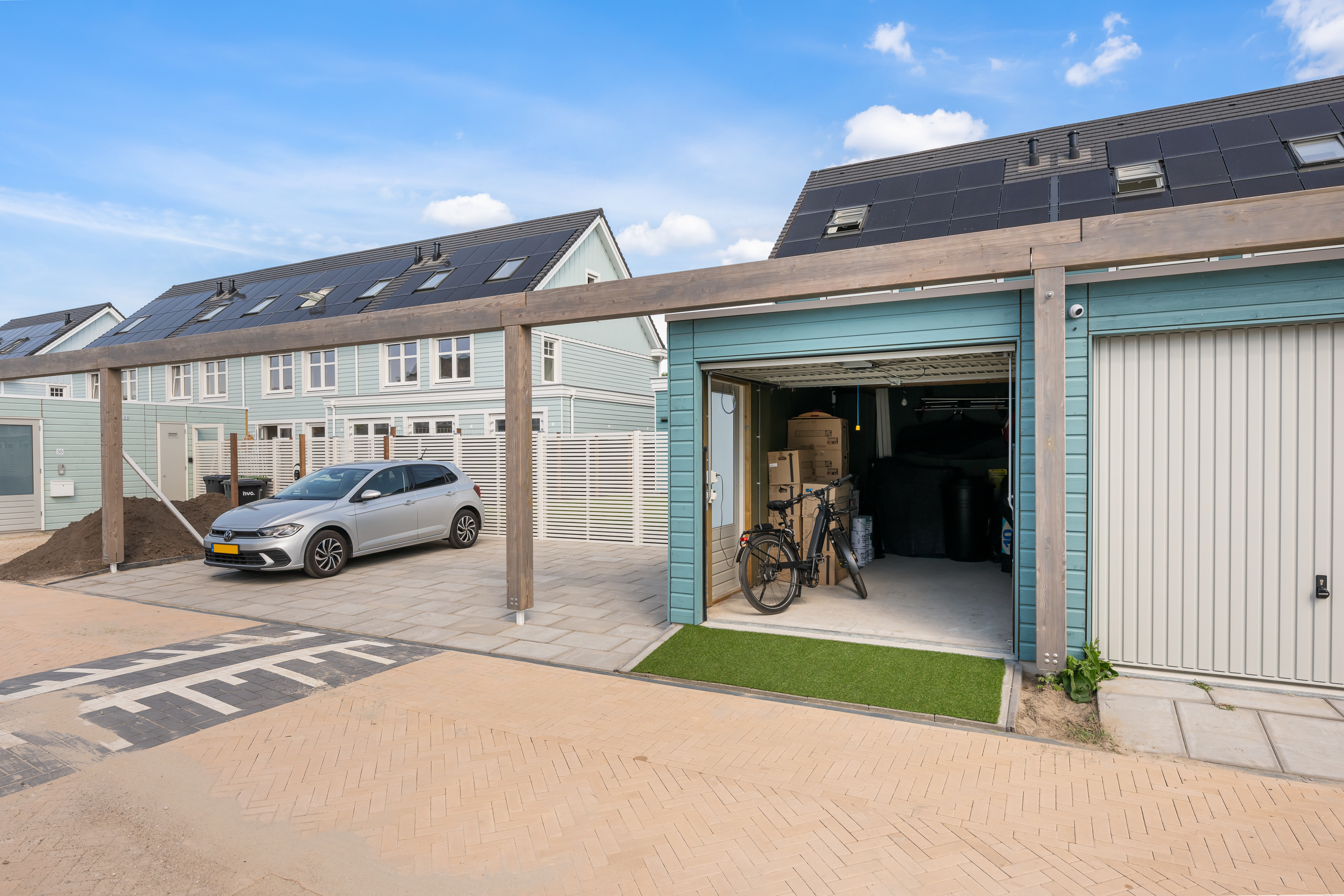 Aan de voorzijde biedt de woning een uitnodigend overdekt veranda-terras, waar je heerlijk in de ochtendzon zit. De achtertuin is verzorgd aangelegd met een groen gazon, sierbestrating en biedt veel privacy. Door de ligging op het zuidwesten geniet je in de middag en avond volop van de zon. Achterin de tuin staat een garage met daarnaast nog een tweetal eigen parkeerplaatsen.