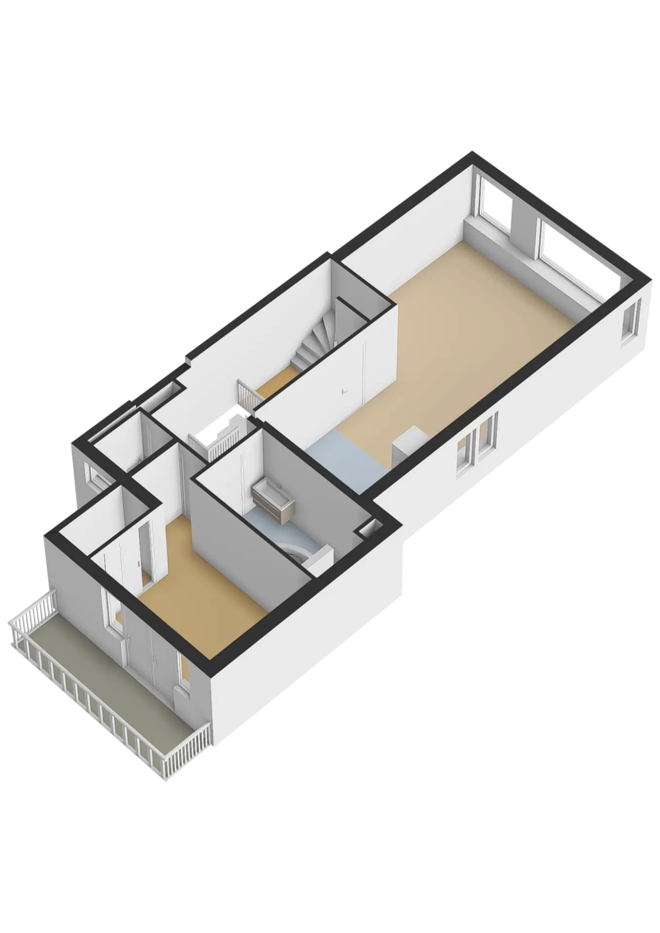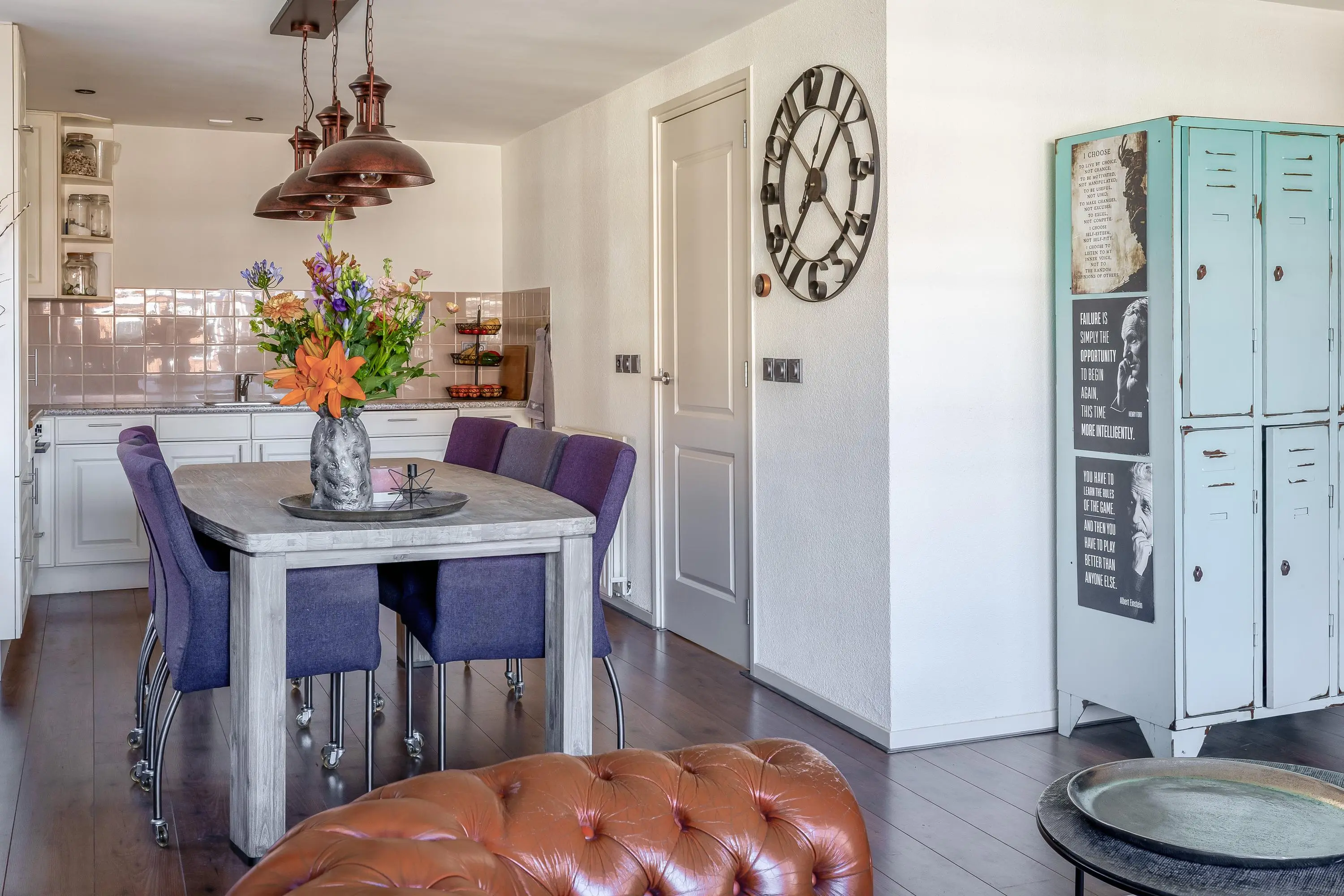 De ruime en lichte woonkamer bevindt zich aan de voorzijde van de woning en wordt gekenmerkt door grote ramen die zorgen voor veel daglicht en een open uitstraling. Hier is voldoende ruimte voor een royale zithoek en een eetgedeelte.