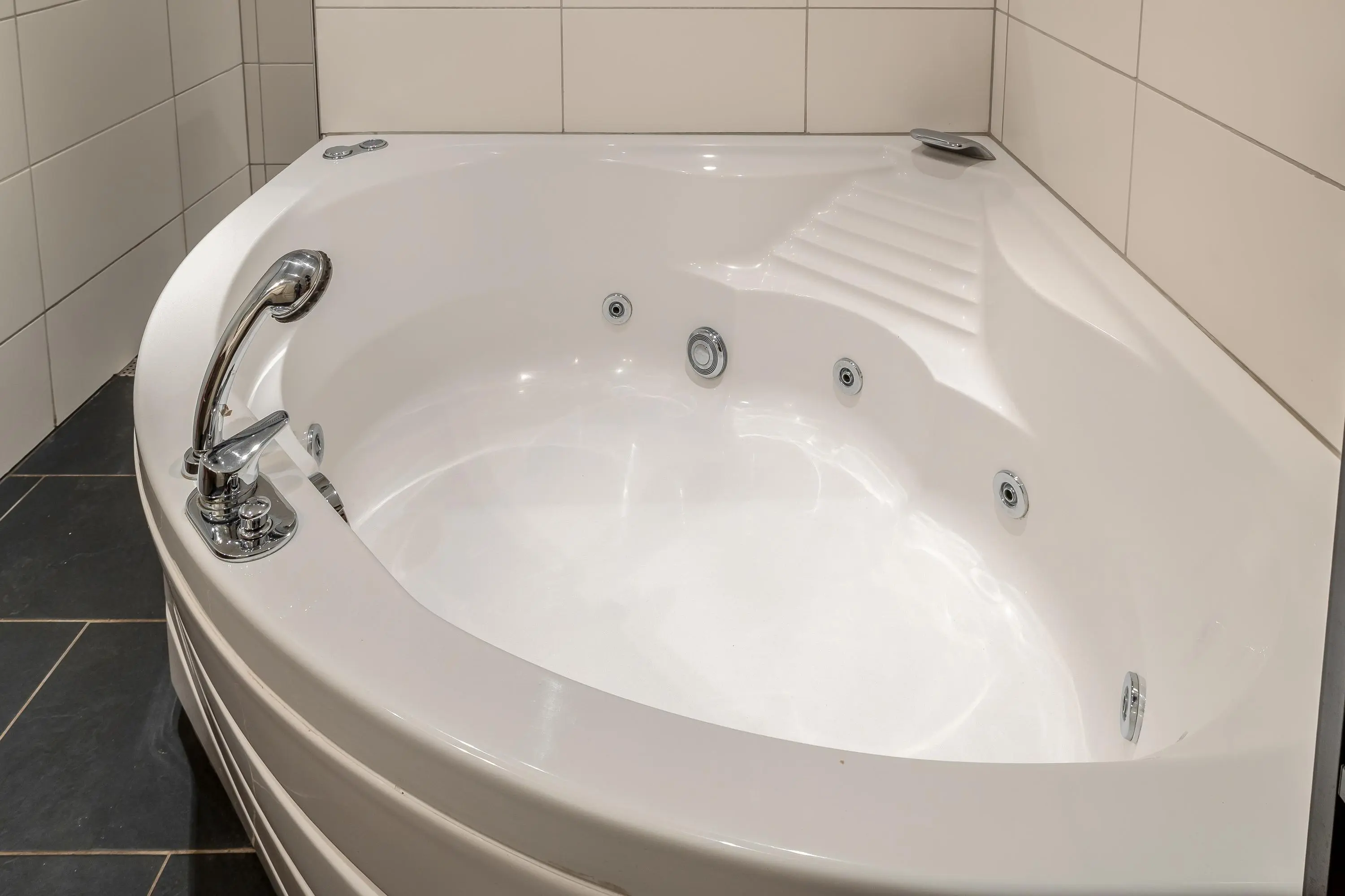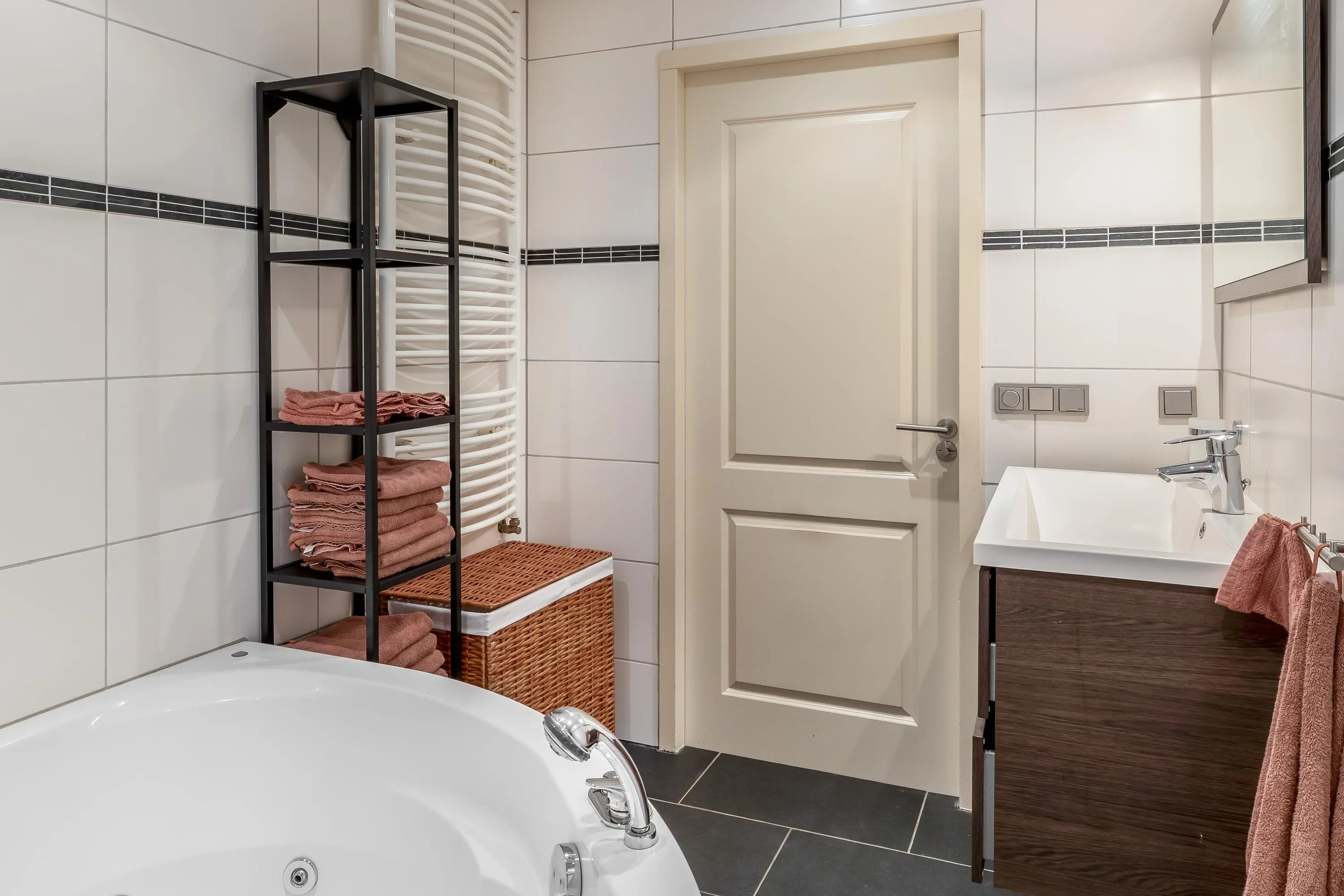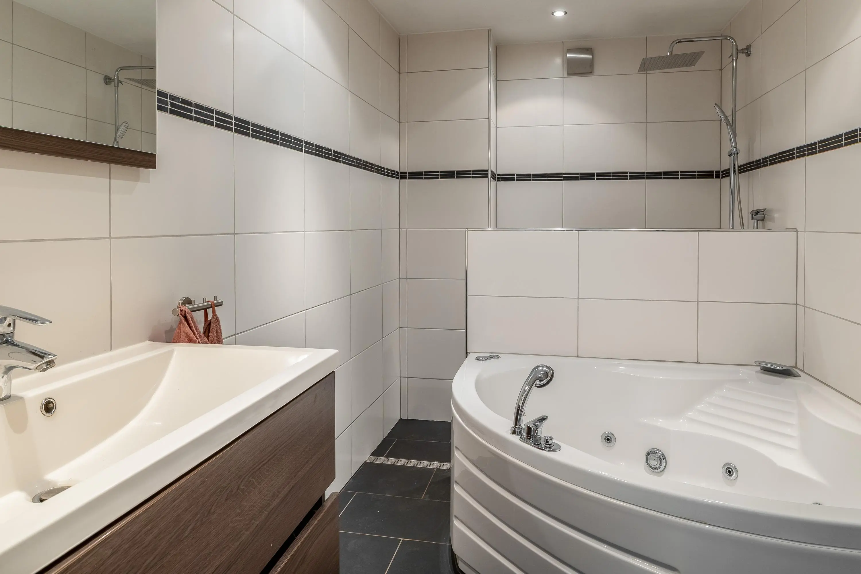 De badkamer, welke is uitgerust met een ligbad, douche, wastafelmeubel en designradiator ligt ook op deze verdieping.