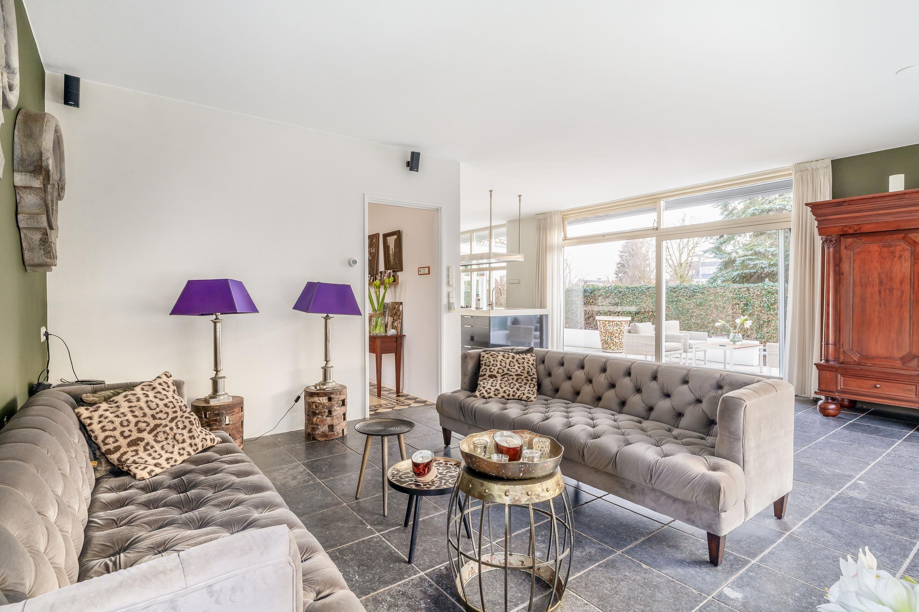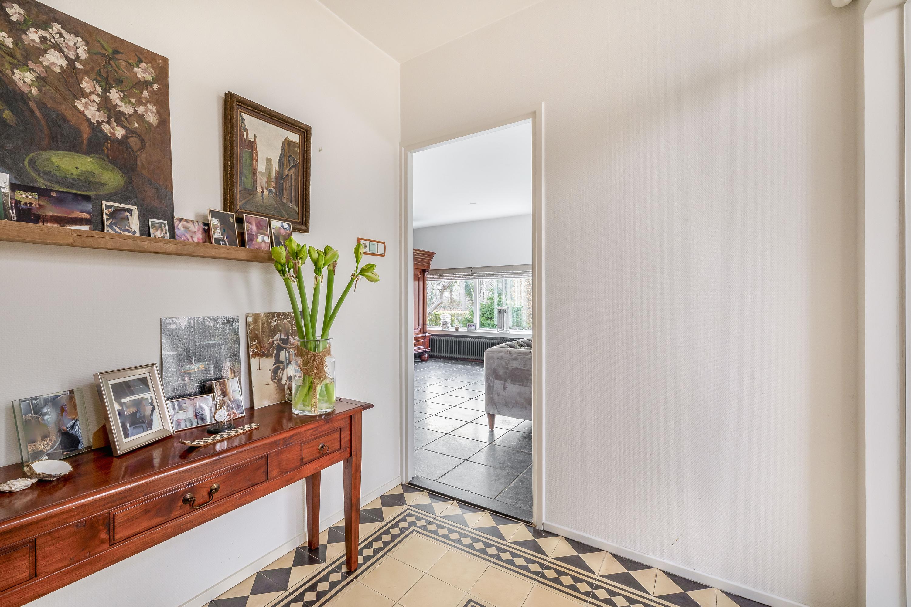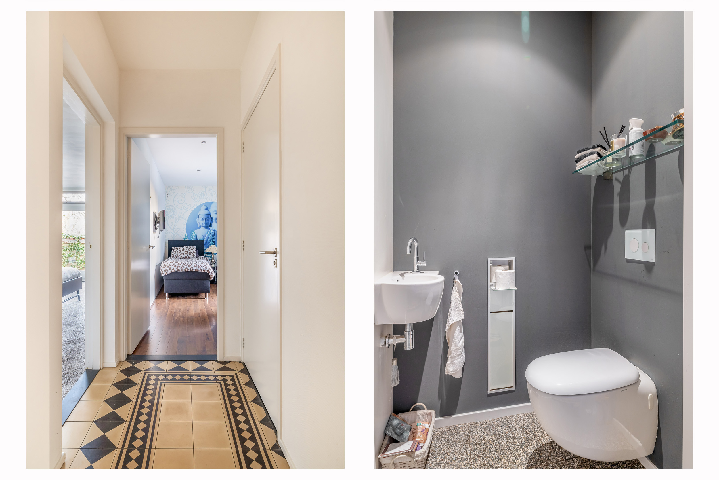 Het voorportaal van de hal zorgt voor een prettige binnenkomst. De vloertegel in meditterane sfeer brengt meteen warmte met zich mee. De woonkamer is heerlijk licht en sfeervol dankzij de grote raampartijen en de prettige plafondhoogte. De grote schuifpui biedt toegang tot het terras. Deze kant ligt heerlijk op het zuiden, dus de gehele dag is hier de zon te vinden. De strakke afwerking wordt mooi gecombineerd met warme materialen, wat zorgt voor een rustige en aangename woonbeleving. Vanuit de woonkamer is er direct zicht op en toegang tot de tuin, waardoor binnen en buiten naadloos in elkaar overlopen.