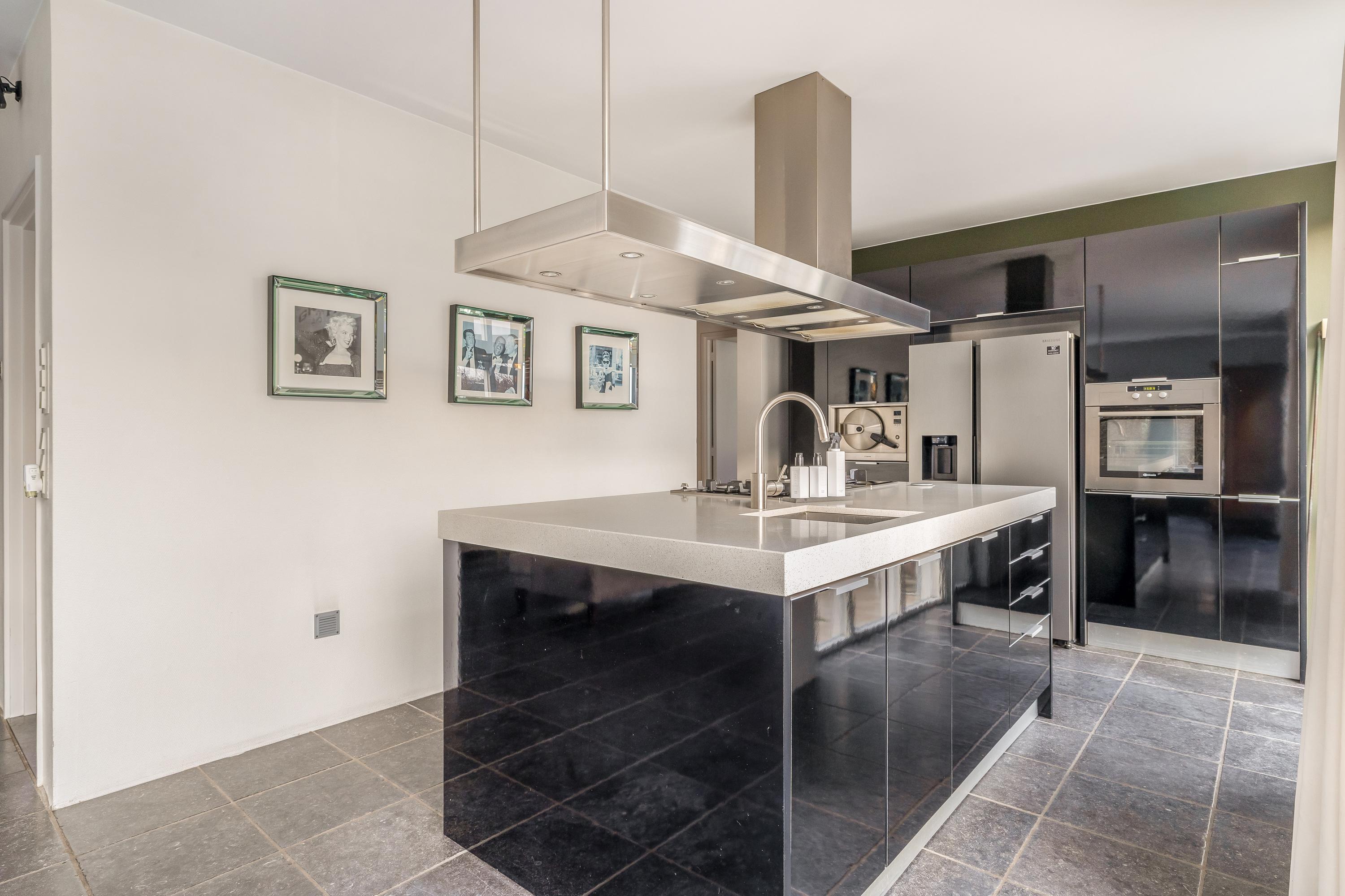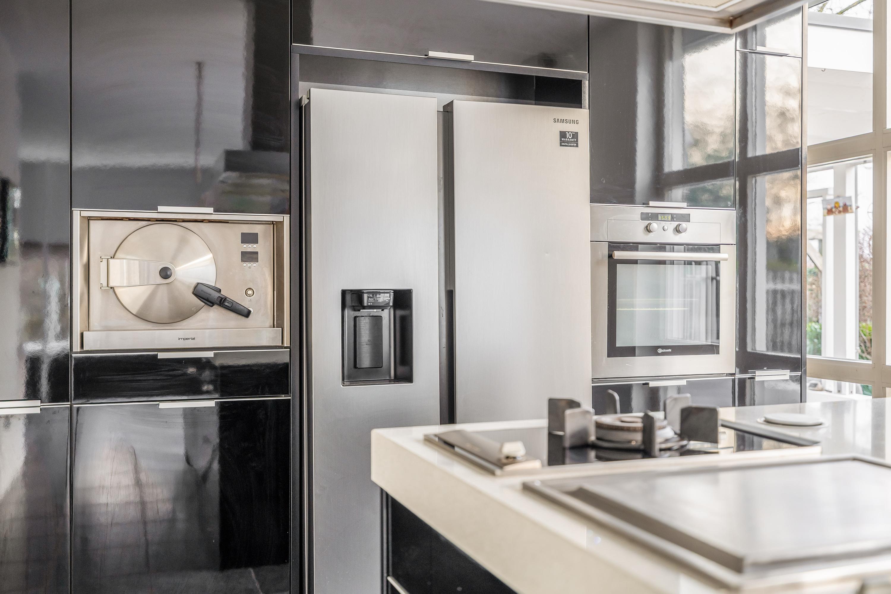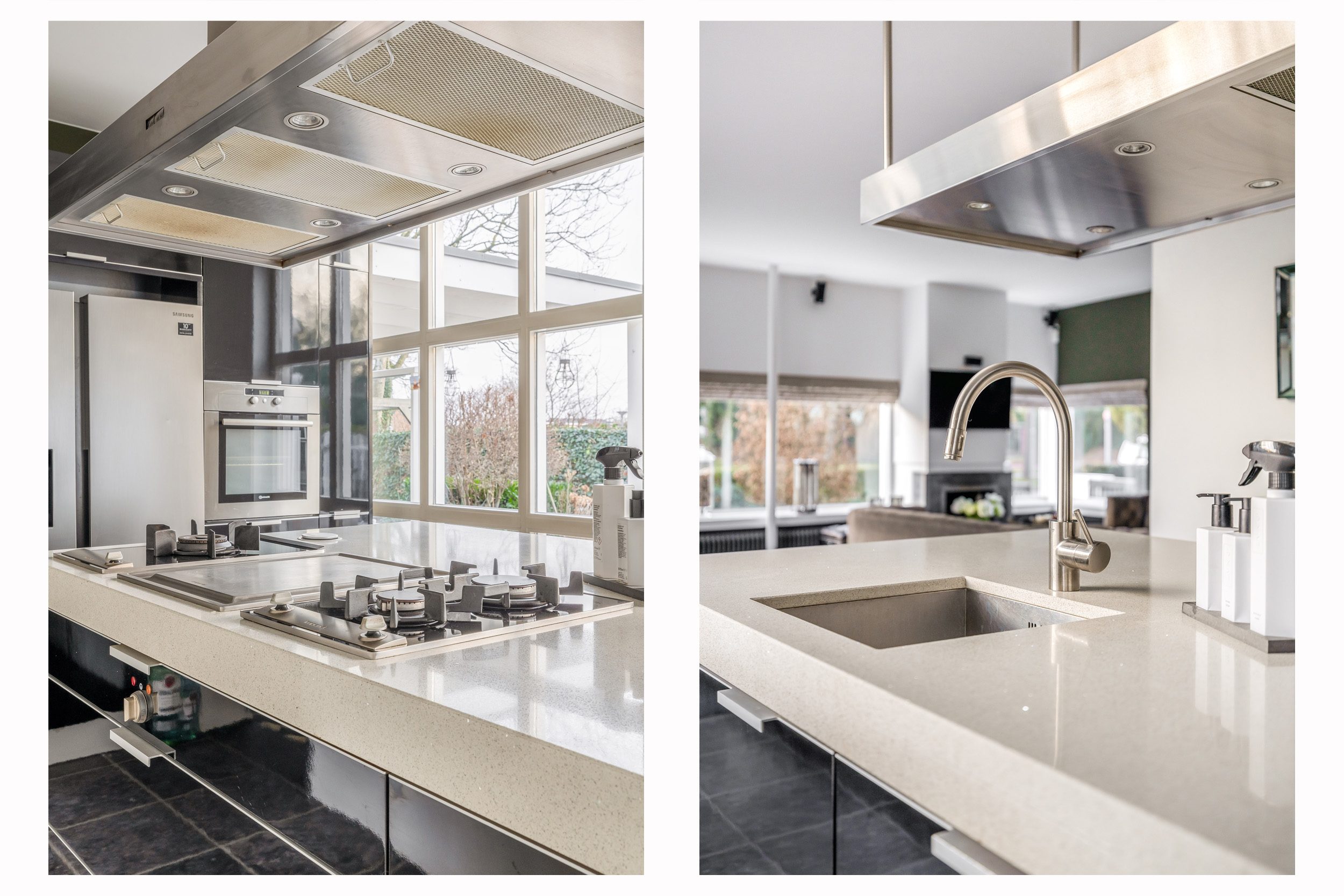 De luxe keuken is uitgevoerd met een royaal kookeiland en voorzien van diverse inbouwapparatuur. Het eiland biedt volop werkruimte en vormt een echte eyecatcher in de woning. Dankzij de grote schuifpui en ramen aan de tuinzijde is de keuken heerlijk licht en staat deze in directe verbinding met het terras. Perfect voor lange zomeravonden en gezellige diners.