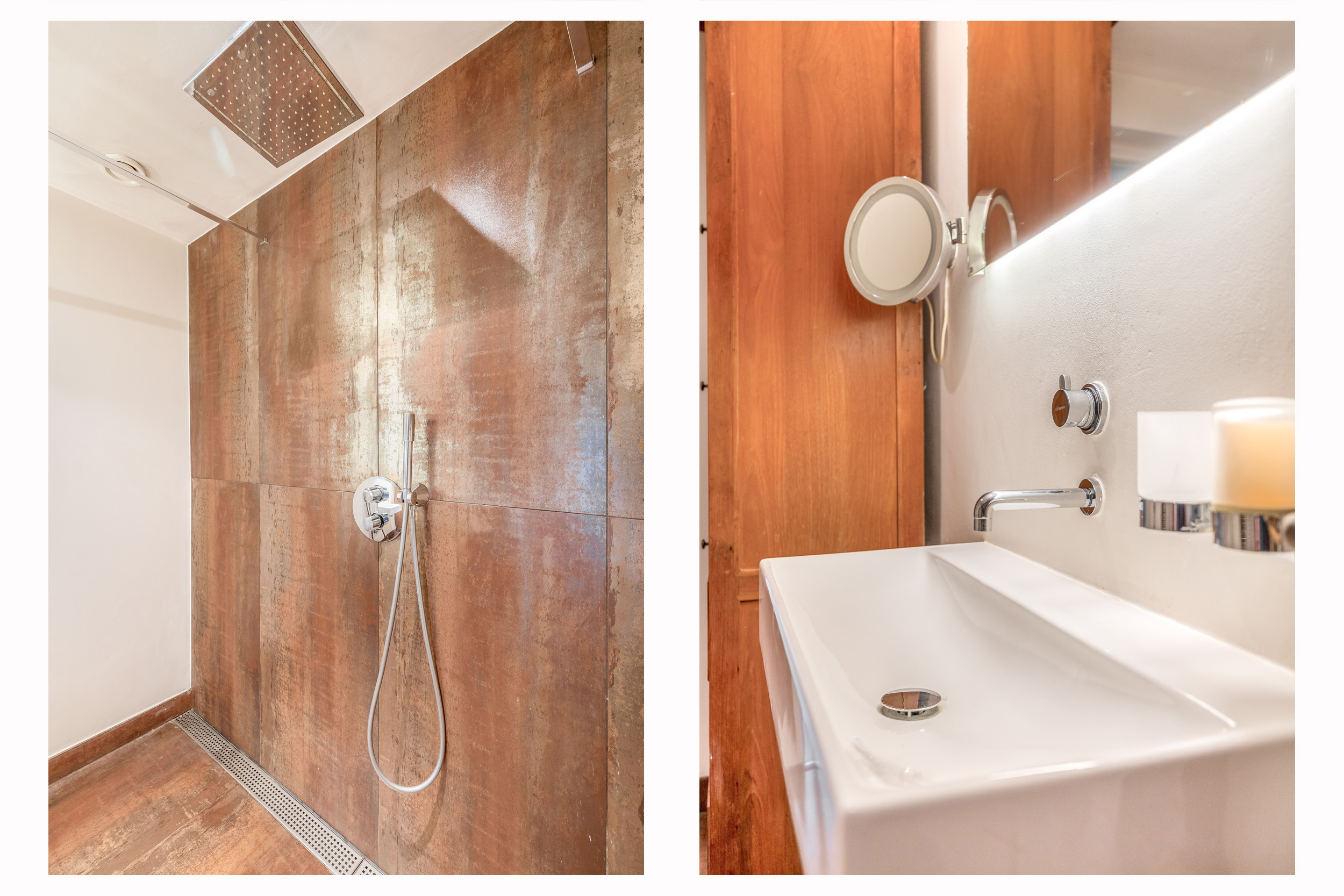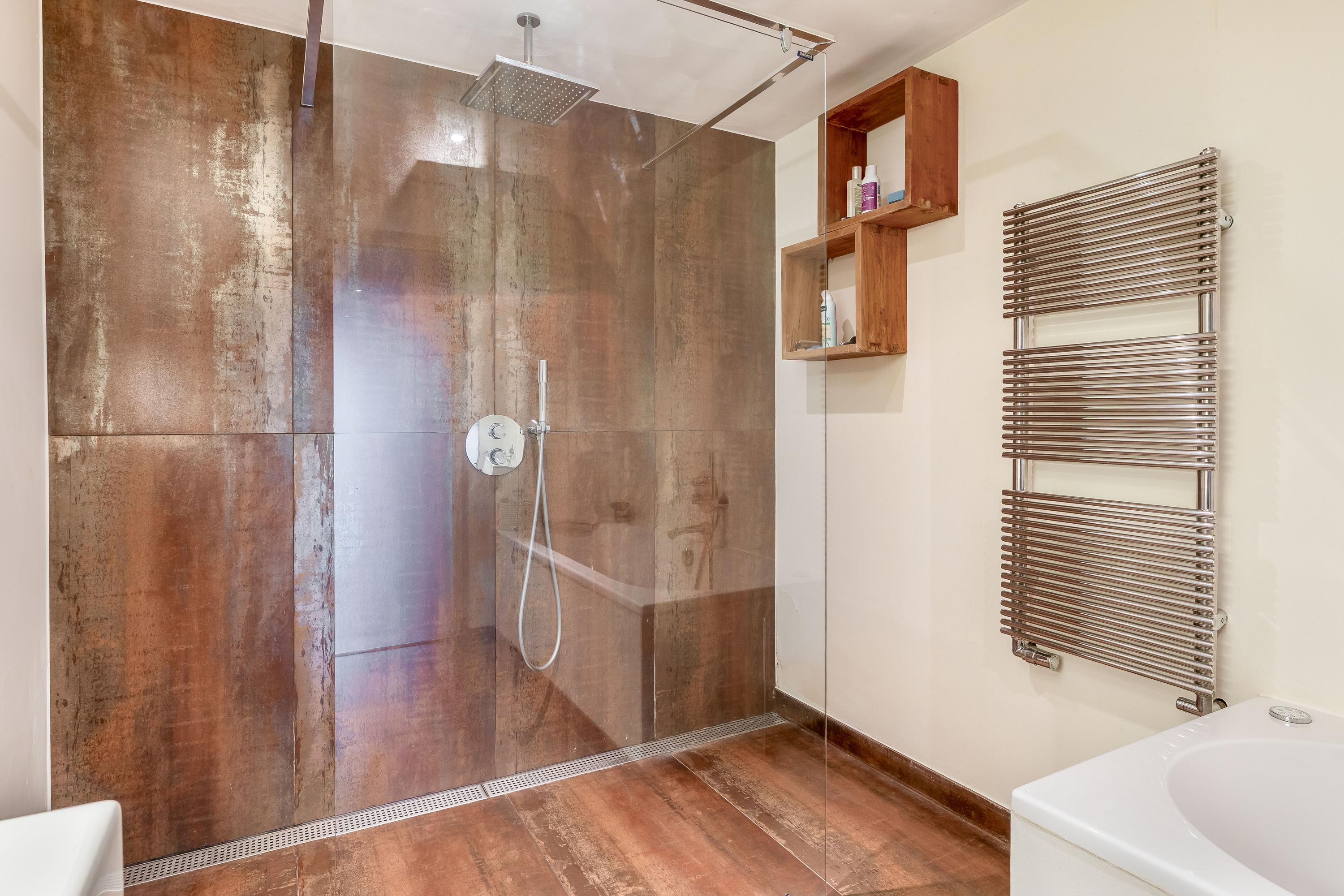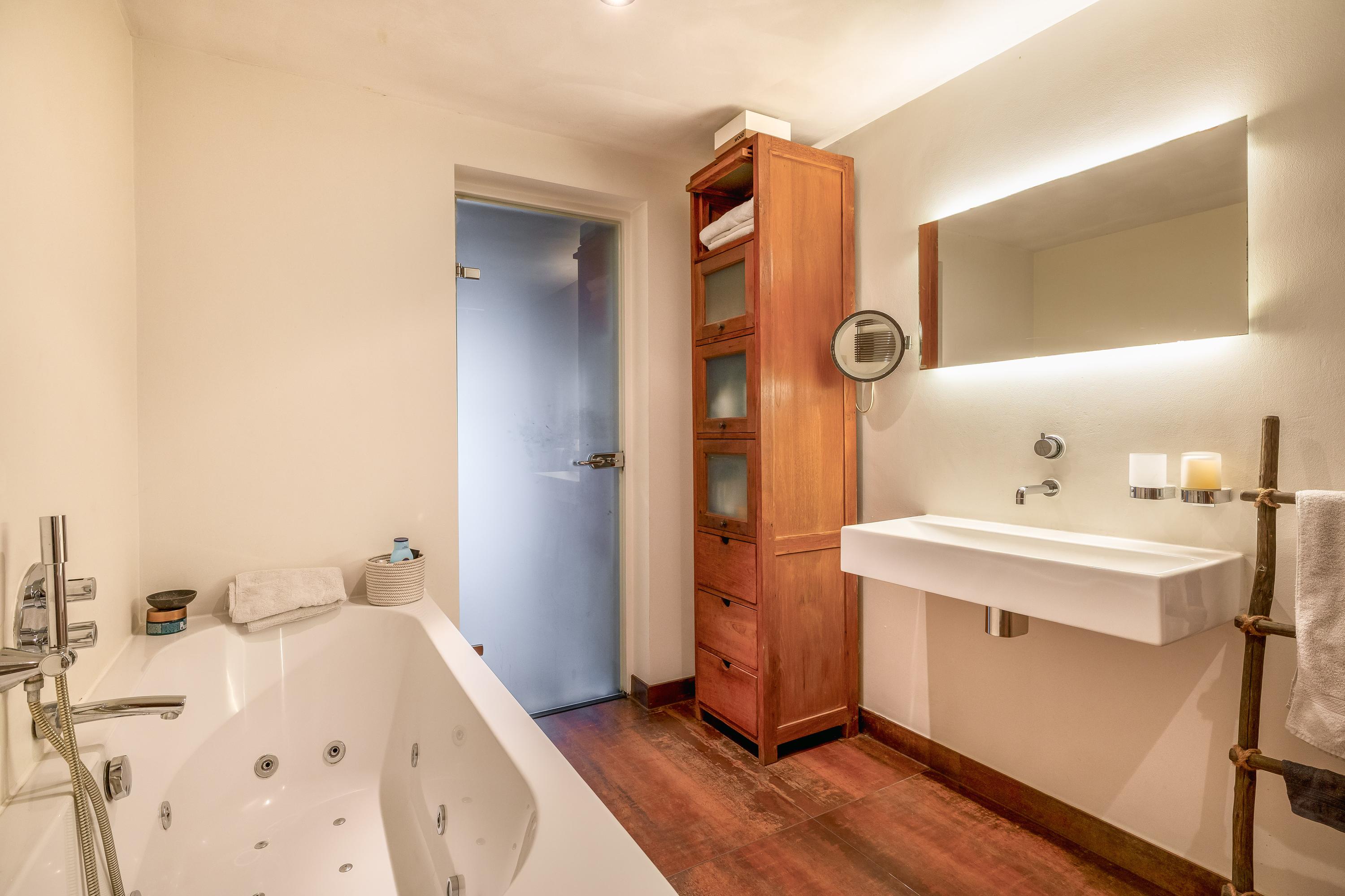 De moderne badkamer is verzorgd uitgevoerd en voorzien van een royale inloopdouche met regendouche, een ligbad met whirlpoolfunctie, een stijlvol wastafelmeubel en een designradiator. Daarnaast is er een modern afgewerkt separaat toilet bereikbaar vanuit de hal.