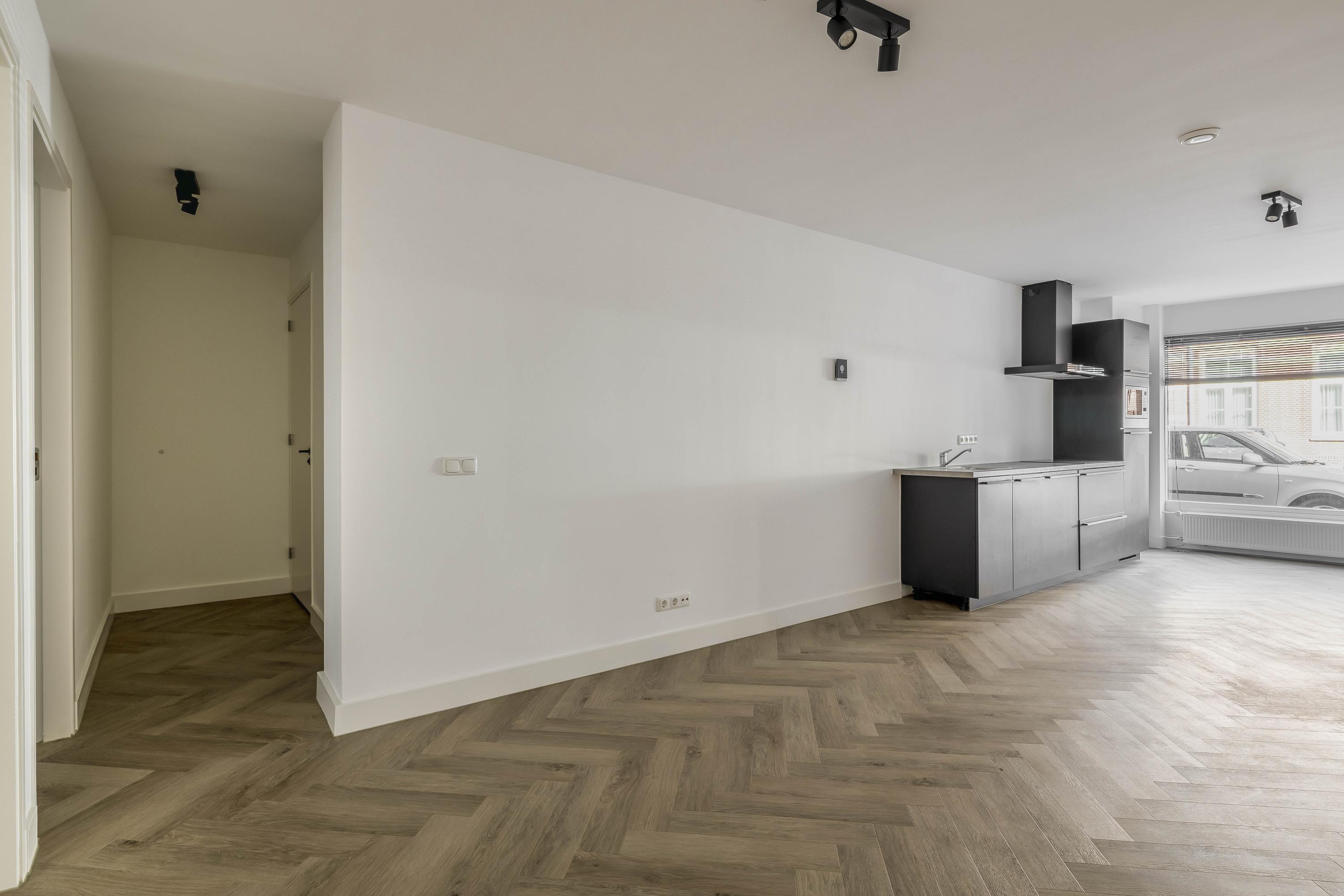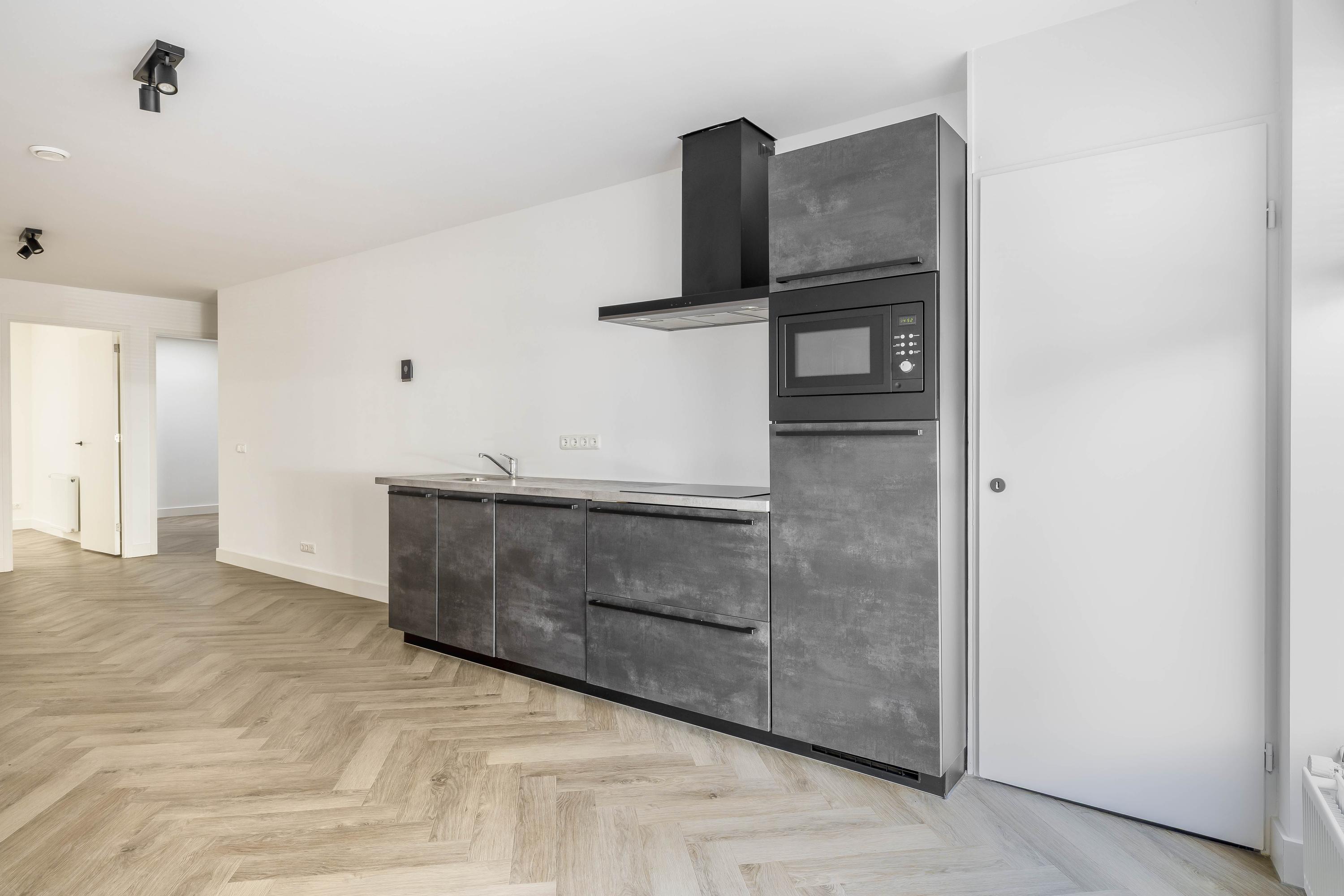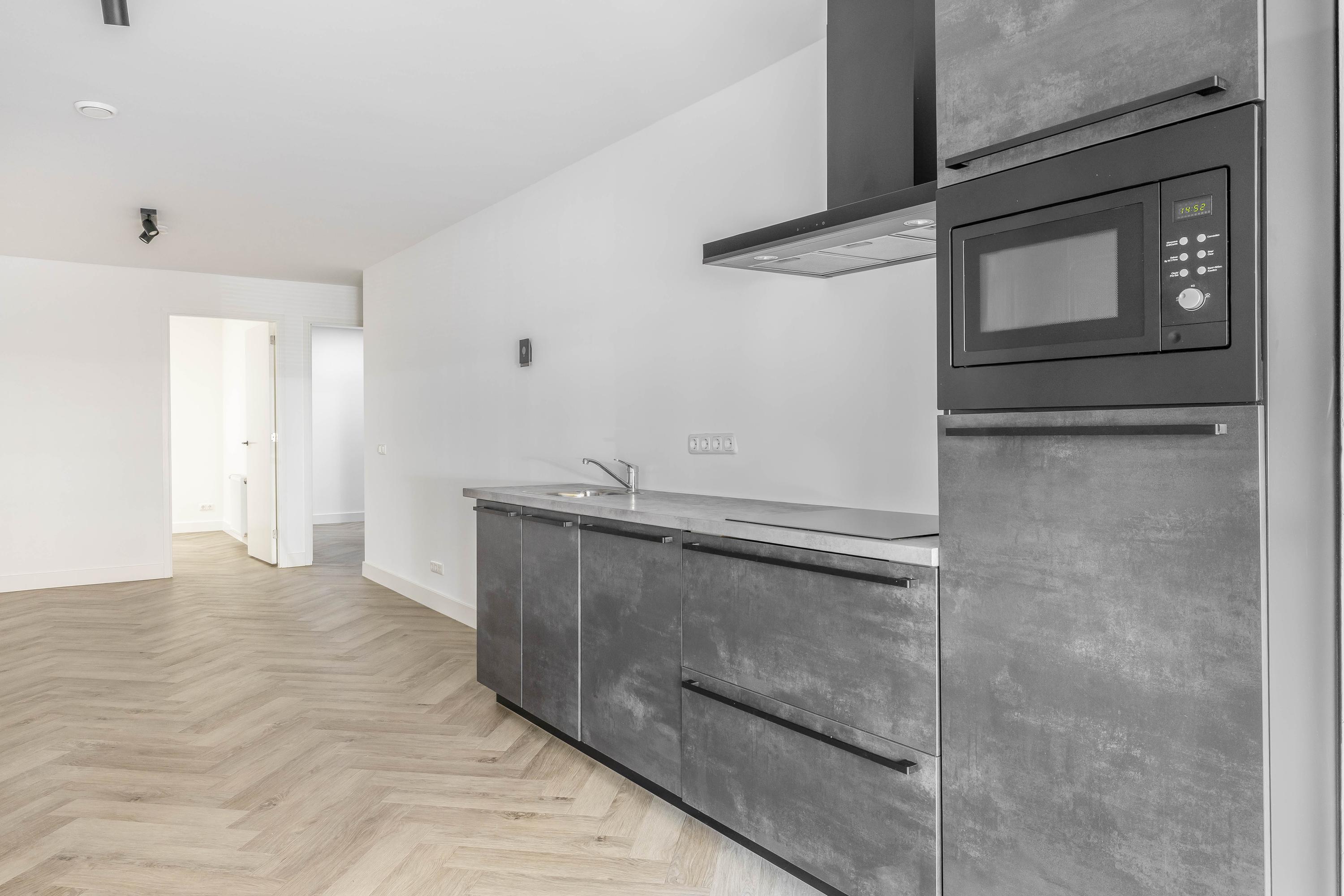 Het appartement is recent volledig gerenoveerd en heeft een moderne, industriële look met visgraat pvc-vloer en strak gestucte wanden. De woonkamer is licht en sfeervol dankzij de grote raampartij aan de voorzijde. Hier kun je een fijne zithoek creëren en hebt bovendien direct contact met de levendige straat.