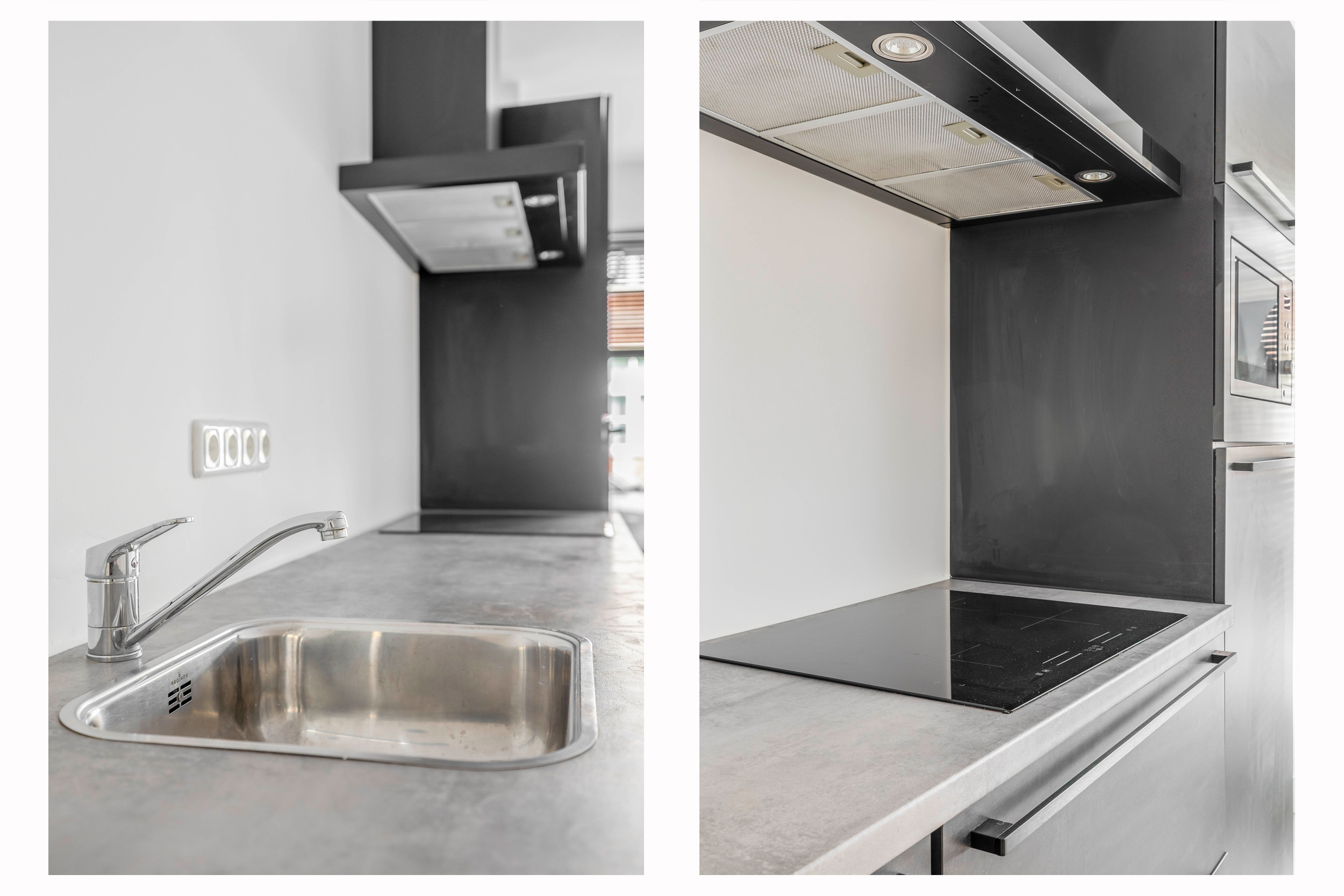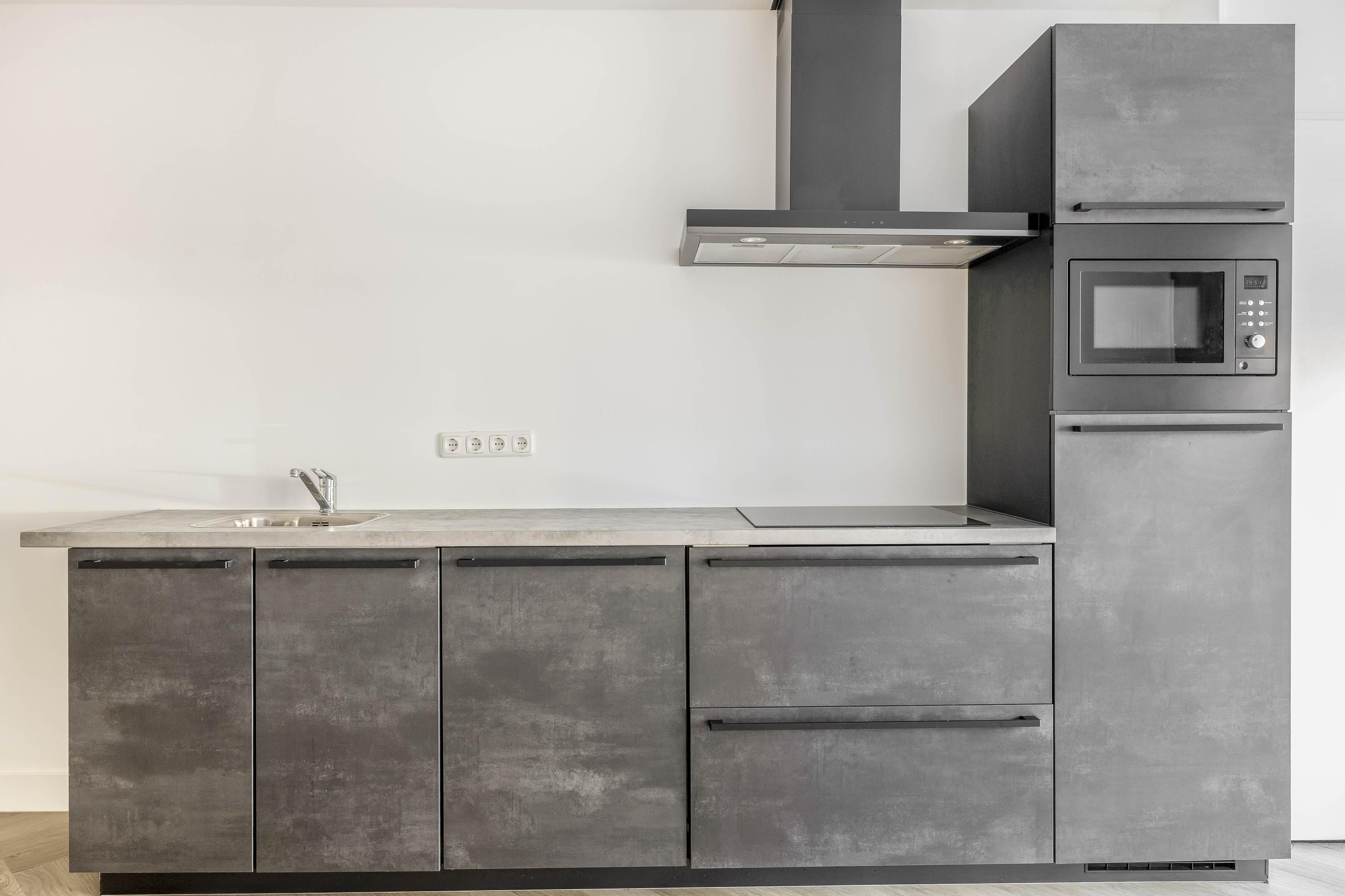 De moderne open keuken vormt een echte eyecatcher in het appartement. De betonlook fronten en het strakke werkblad geven het geheel een stoere, industriële uitstraling. De keuken is voorzien van diverse inbouwapparatuur, waaronder een inductiekookplaat, afzuigkap, magnetron en koelkast met vriesvak. Dankzij de praktische indeling en voldoende kastruimte is dit een fijne plek om te koken én te genieten.