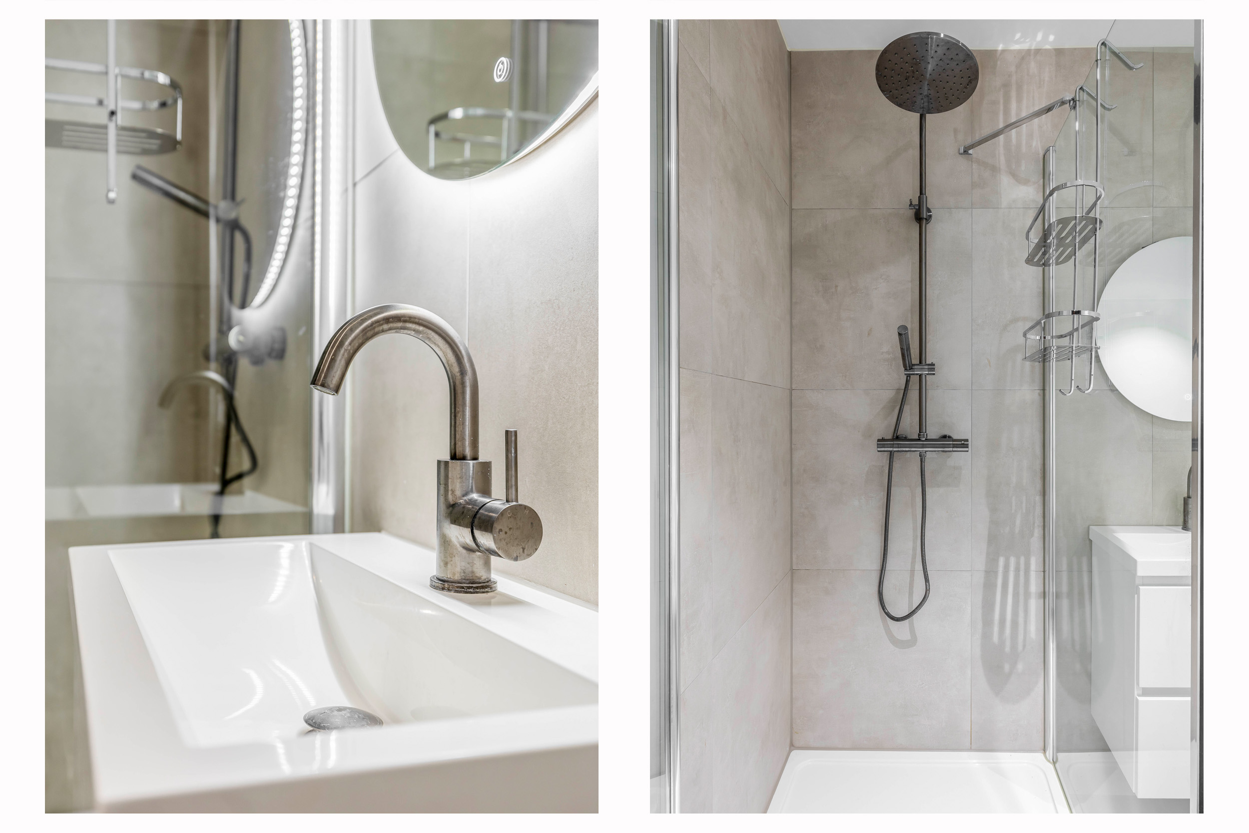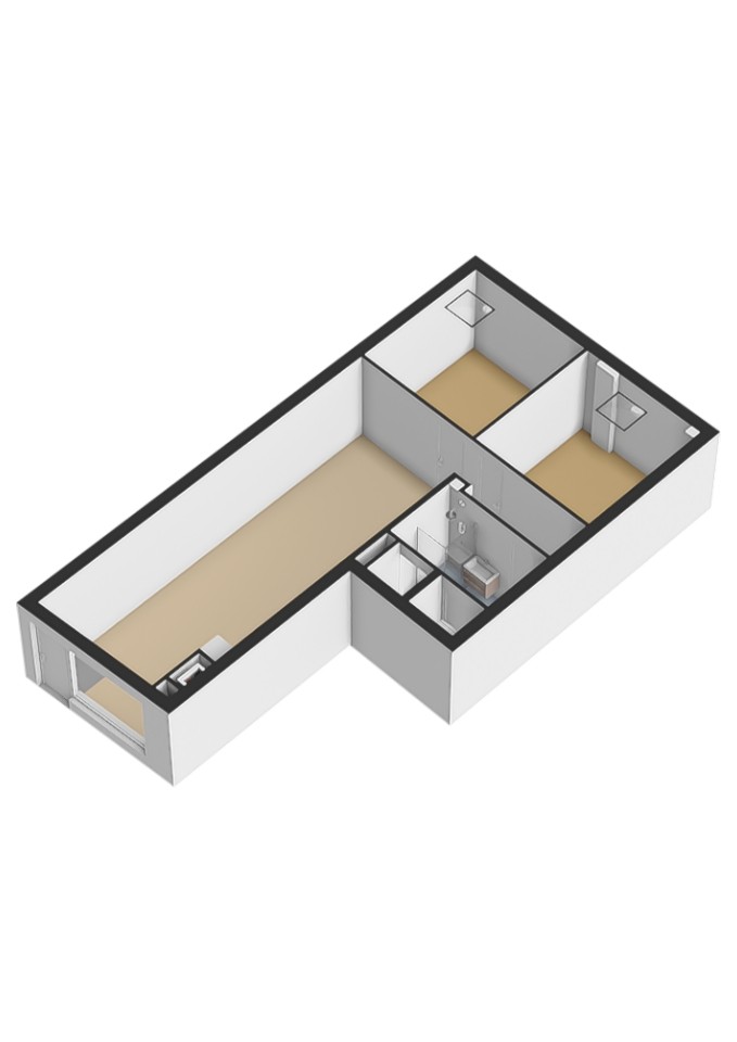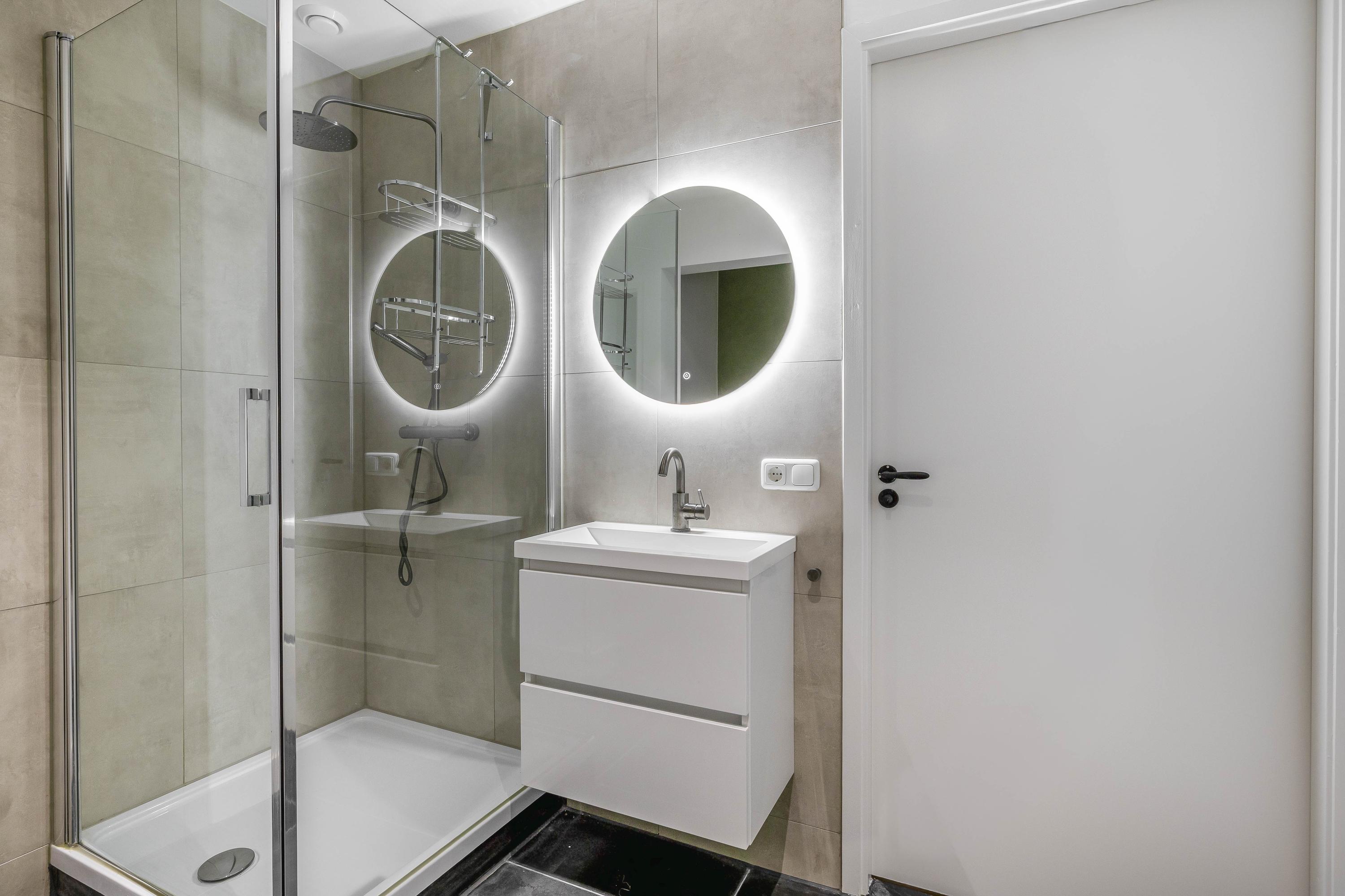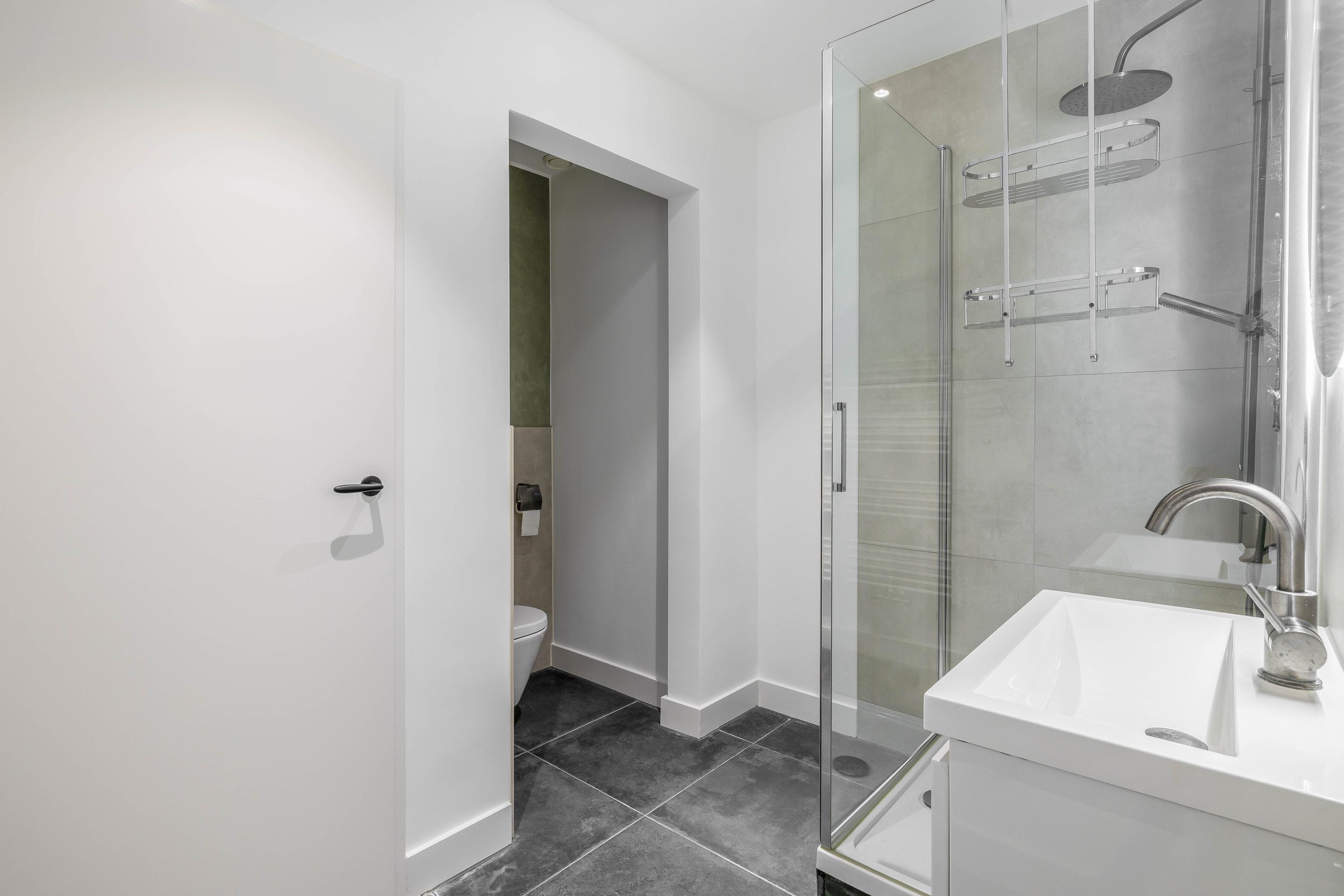 Het appartement beschikt daarnaast over twee slaapkamers, beide netjes afgewerkt en voorzien van dezelfde moderne vloer. Beide slaapkamers hebben een dakraam, waardoor er lichttoetreding is. De badkamer is eigentijds ingericht met een toilet, inloopdouche, wastafelmeubel met wastafel en een verlichte spiegel.