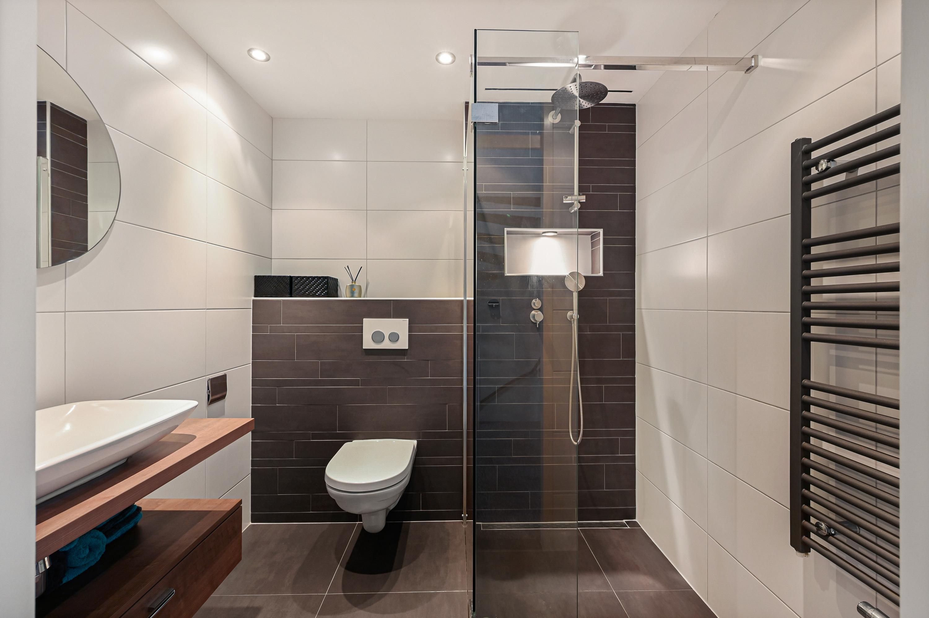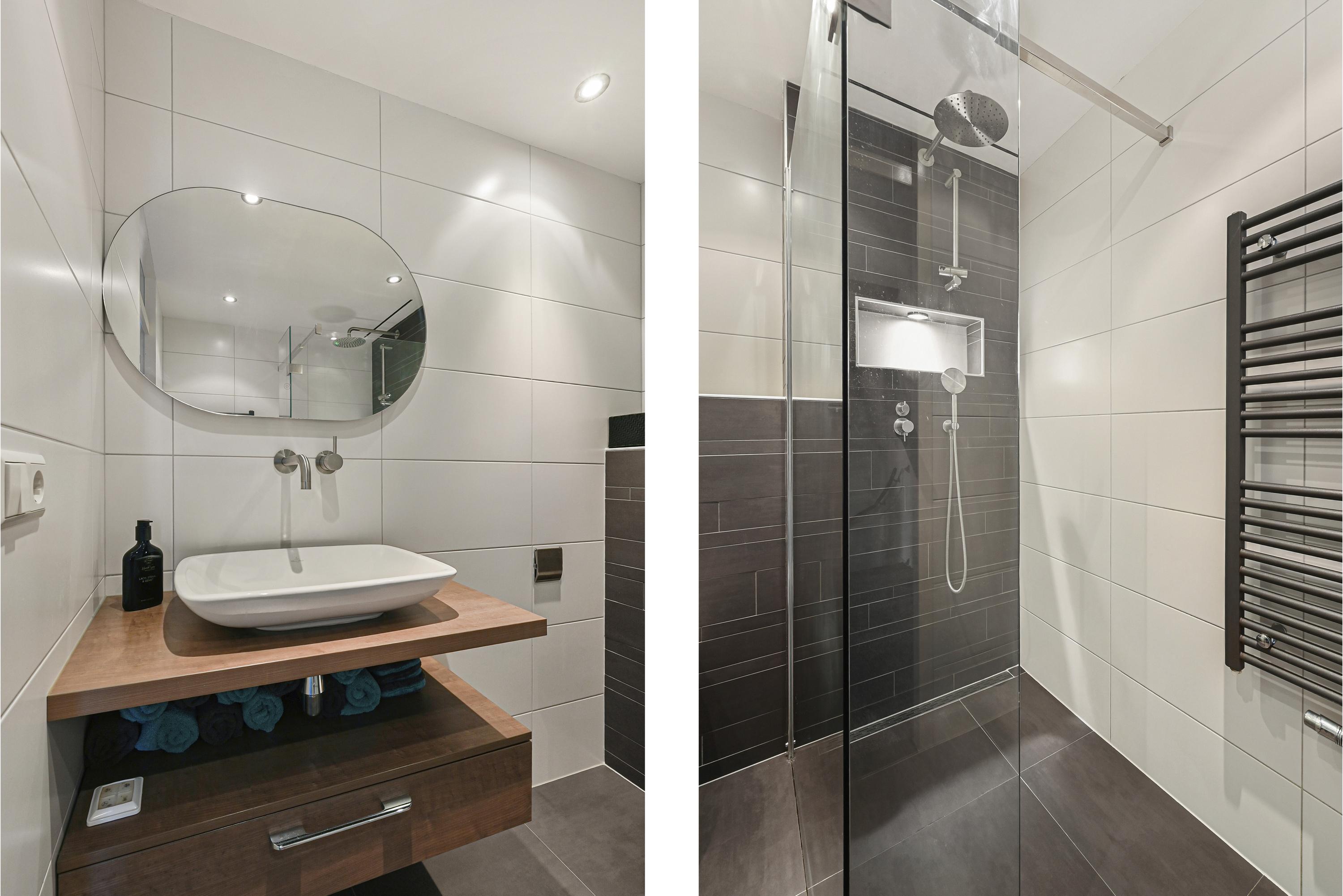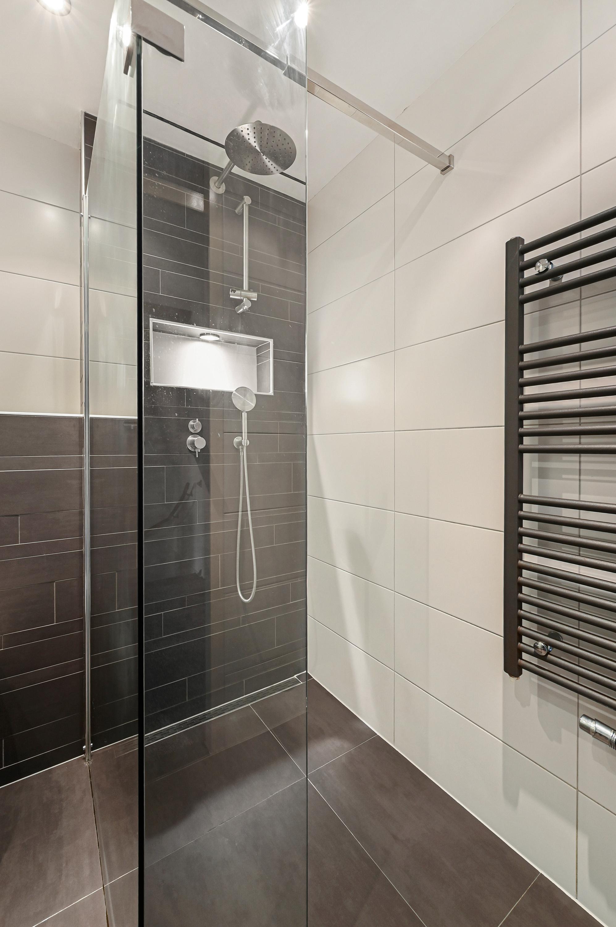 Overloop met toegang tot drie slaapkamers met kunststof kozijnen en HR++-glas (2023). De badkamer is modern en compleet met een inloopdouche, wastafelmeubel, toilet en vloerverwarming.