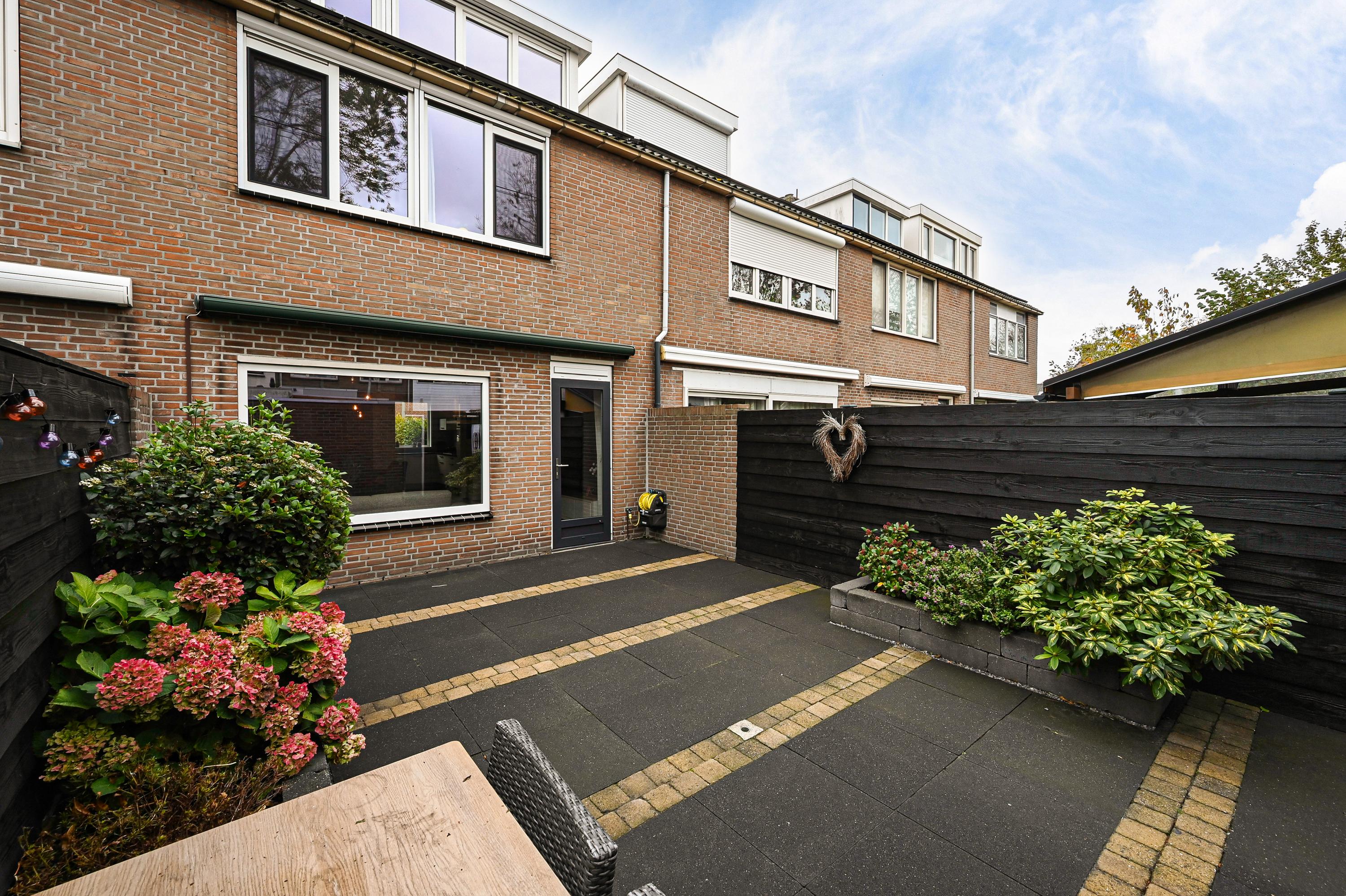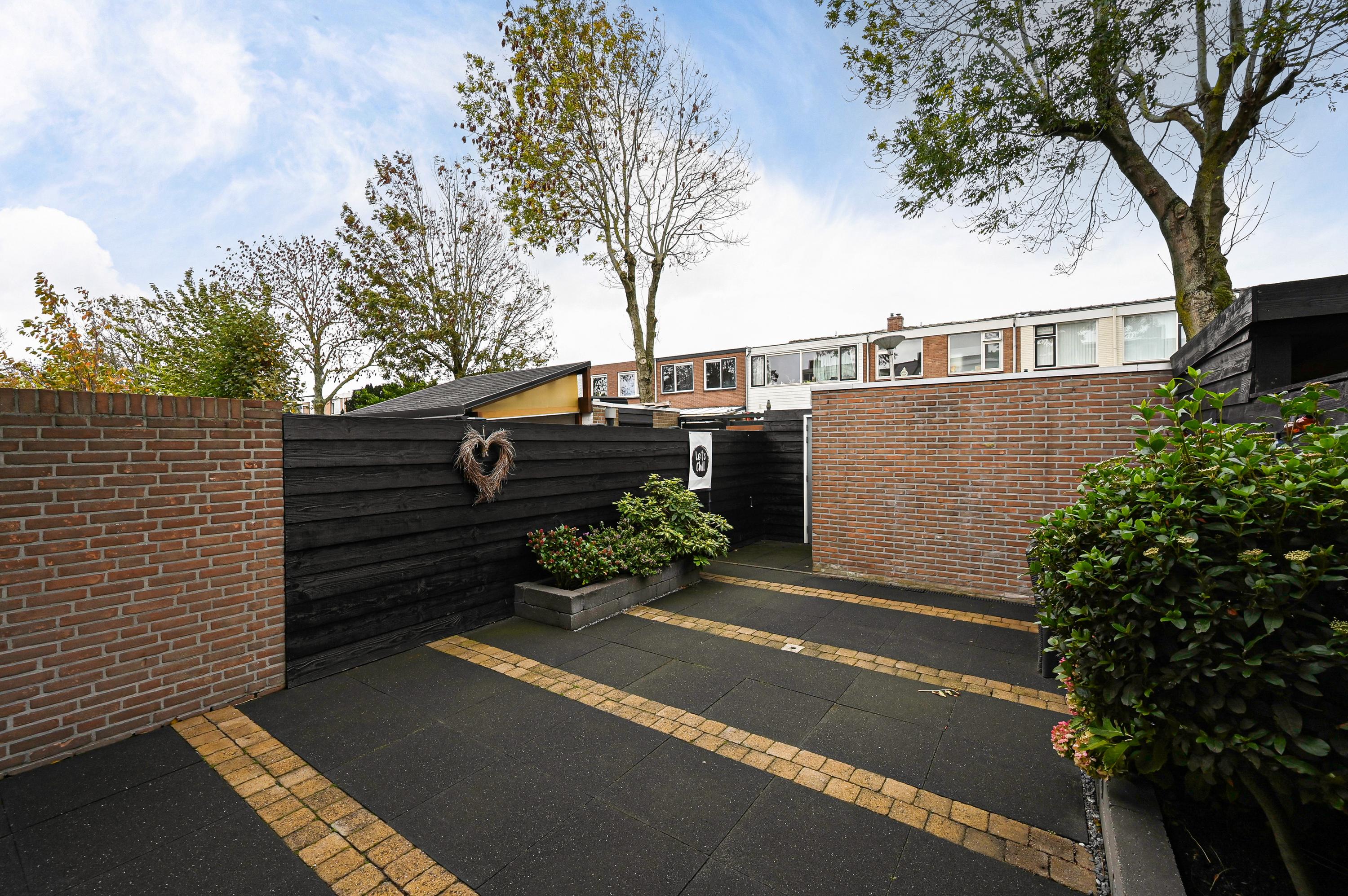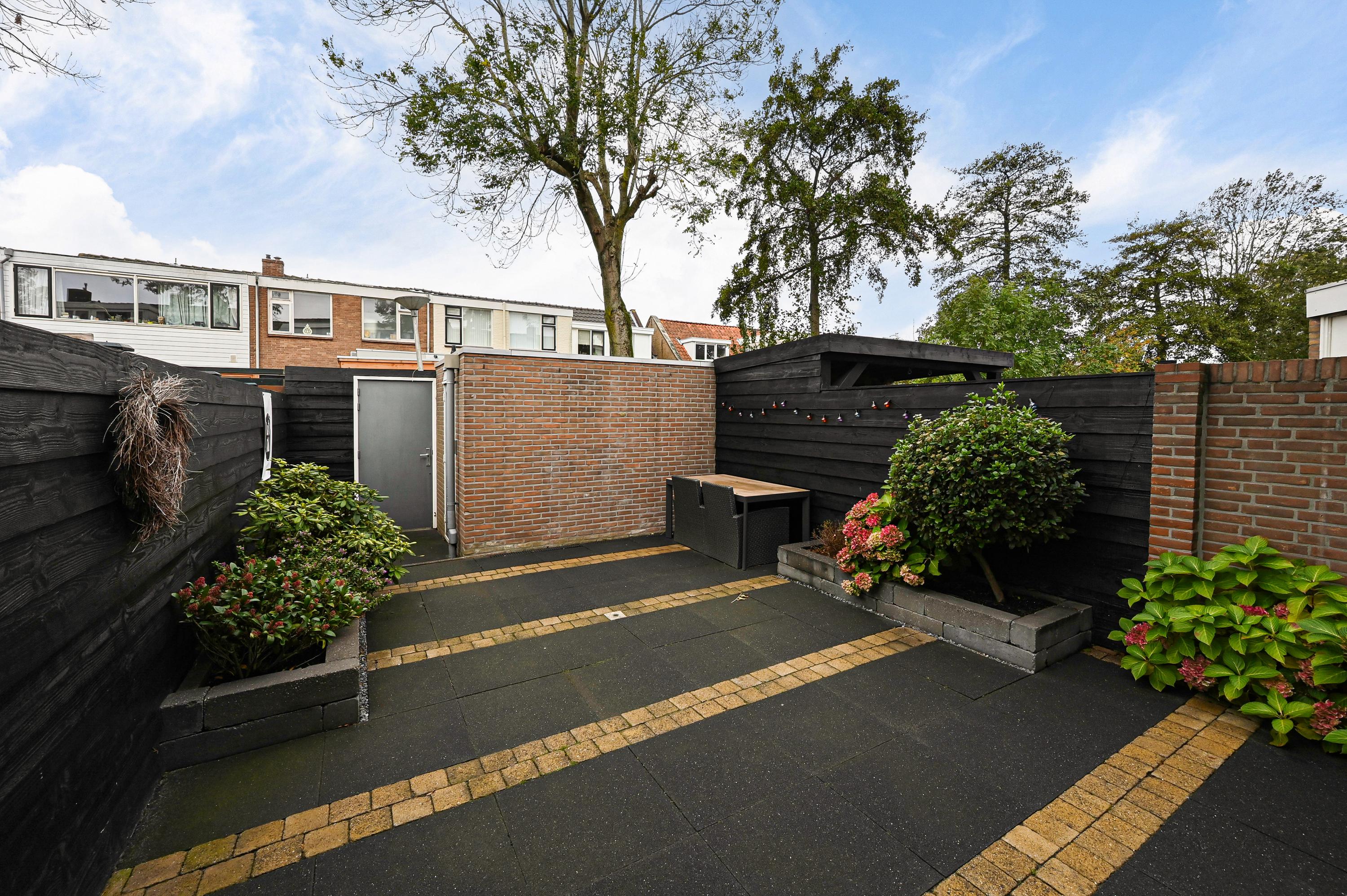 De achtertuin ligt gunstig op de zon, is verzorgd aangelegd met bestrating en beplanting, en beschikt over een praktische berging met vernieuwd dak (2016) en achterom. Aan de voorzijde is ruimte om te parkeren. Dankzij de buitenzonwering en elektrische screens kun je ook op warme dagen comfortabel buiten zitten.