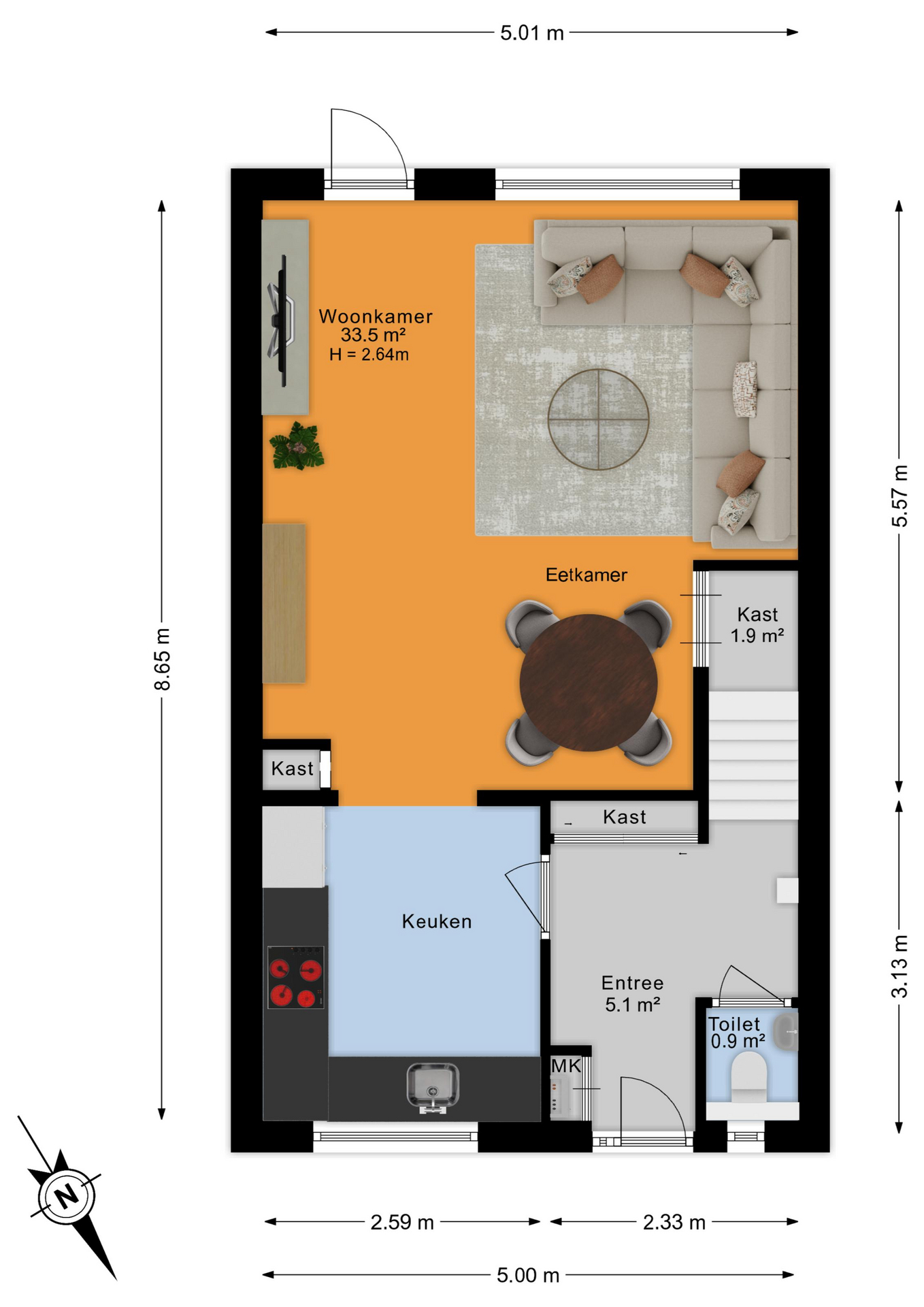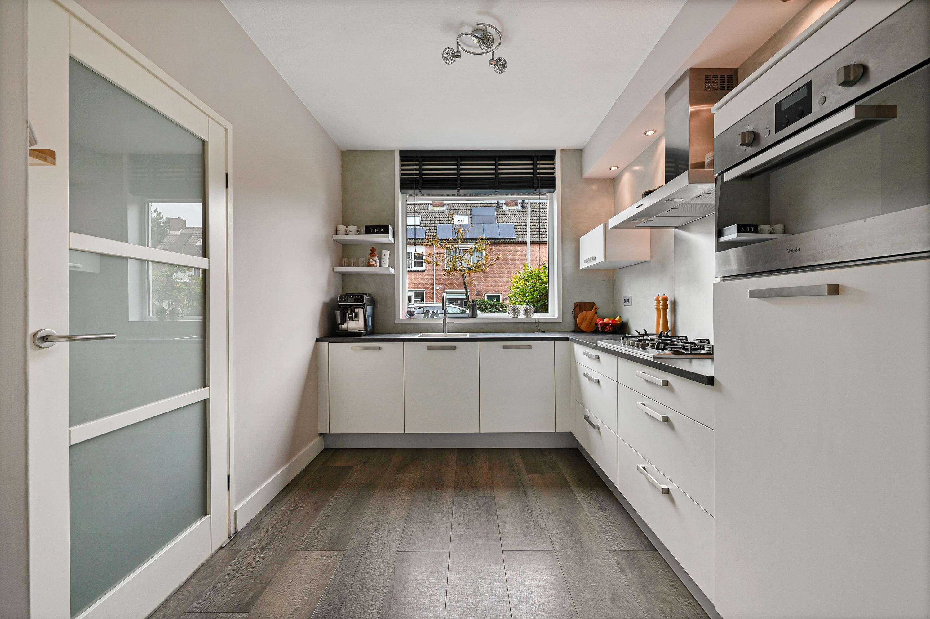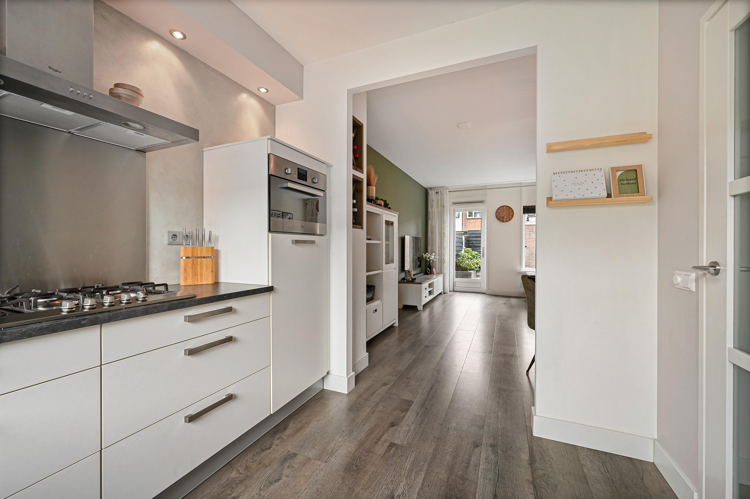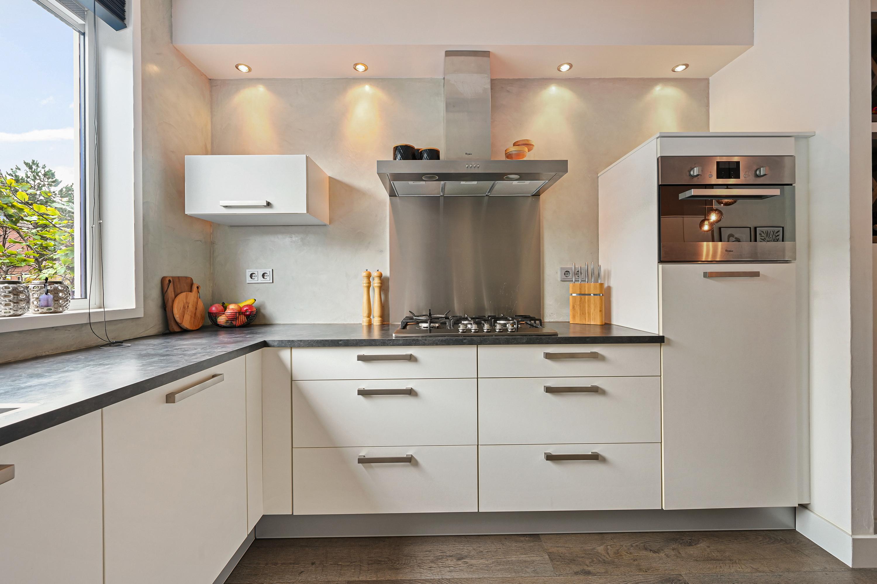Aan de voorzijde bevindt zich de open keuken (2015), uitgerust met een fornuis, afzuigkap, combimagnetron, koelkast, vaatwasser en Quooker (2024) – alles wat je nodig hebt voor comfortabel koken.