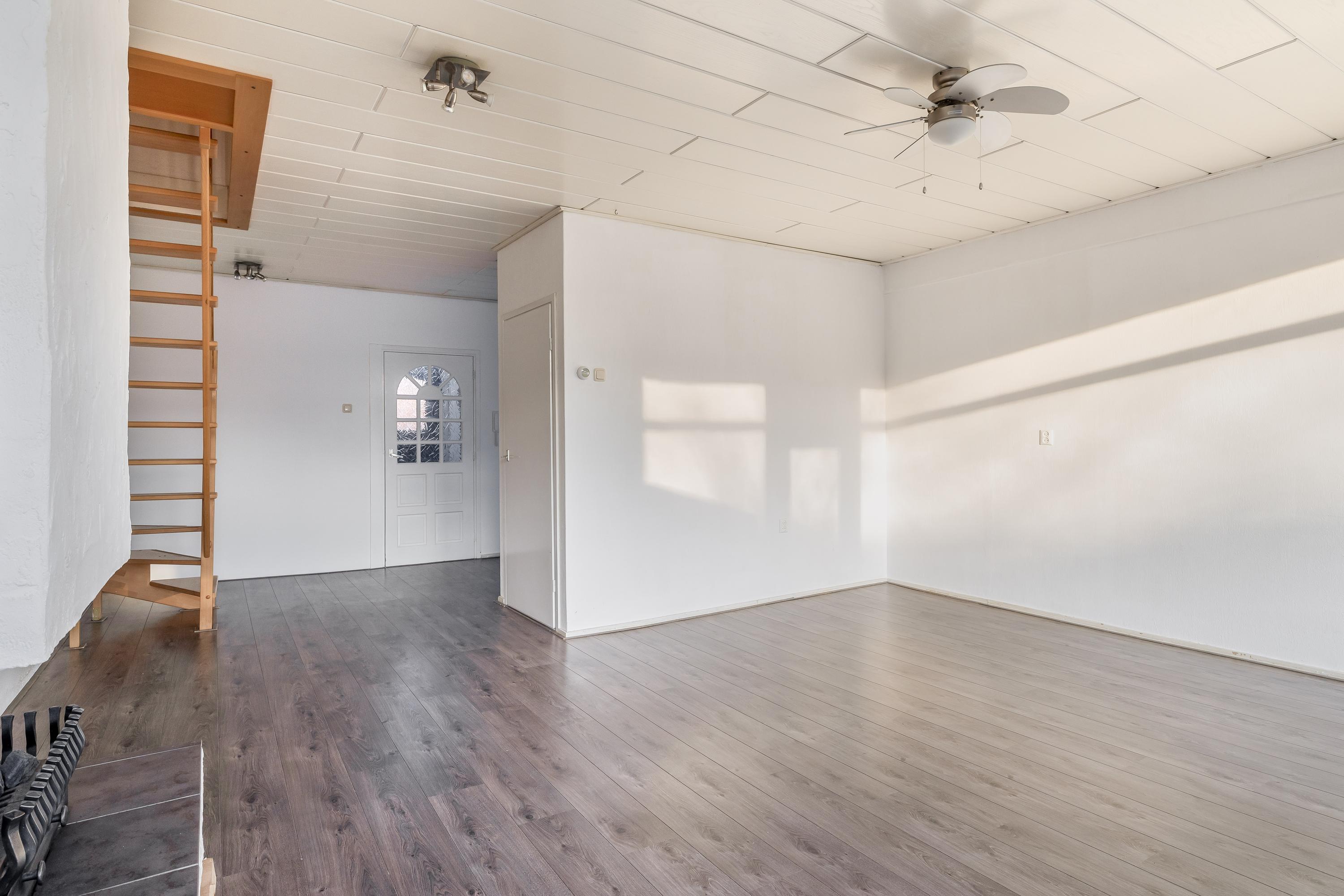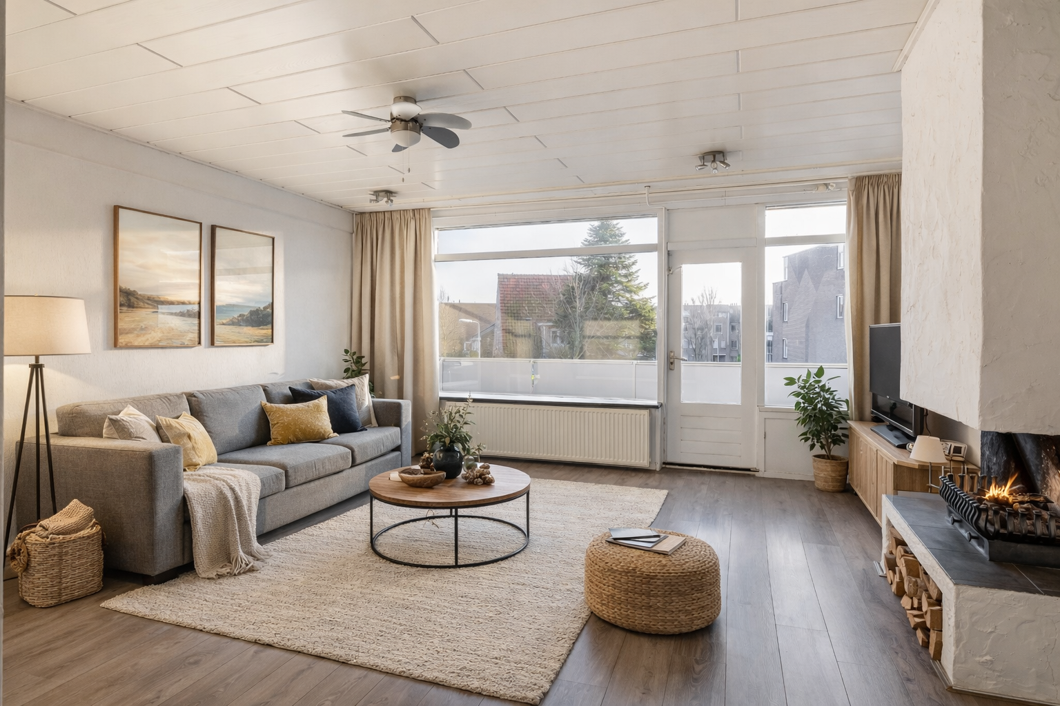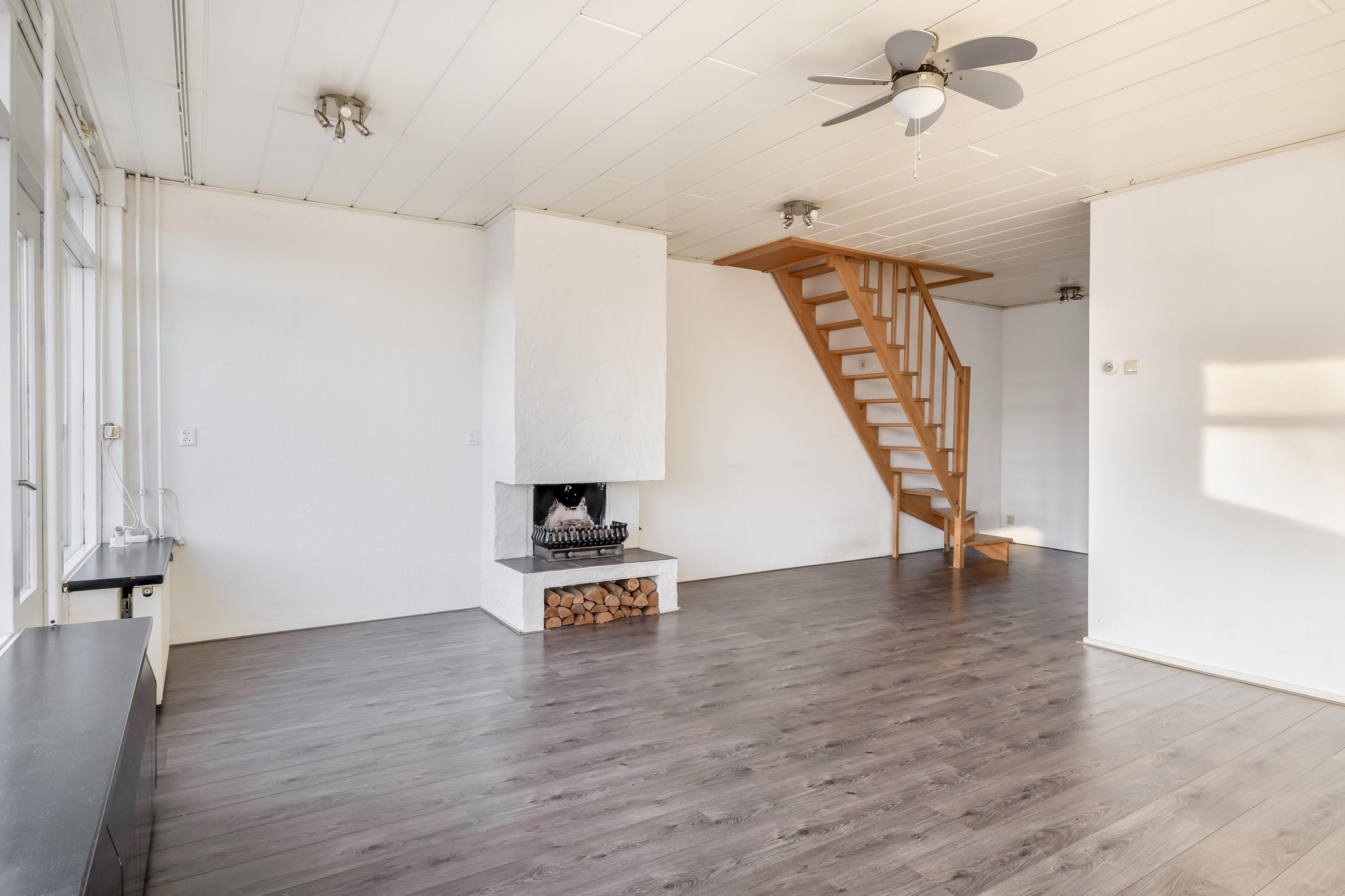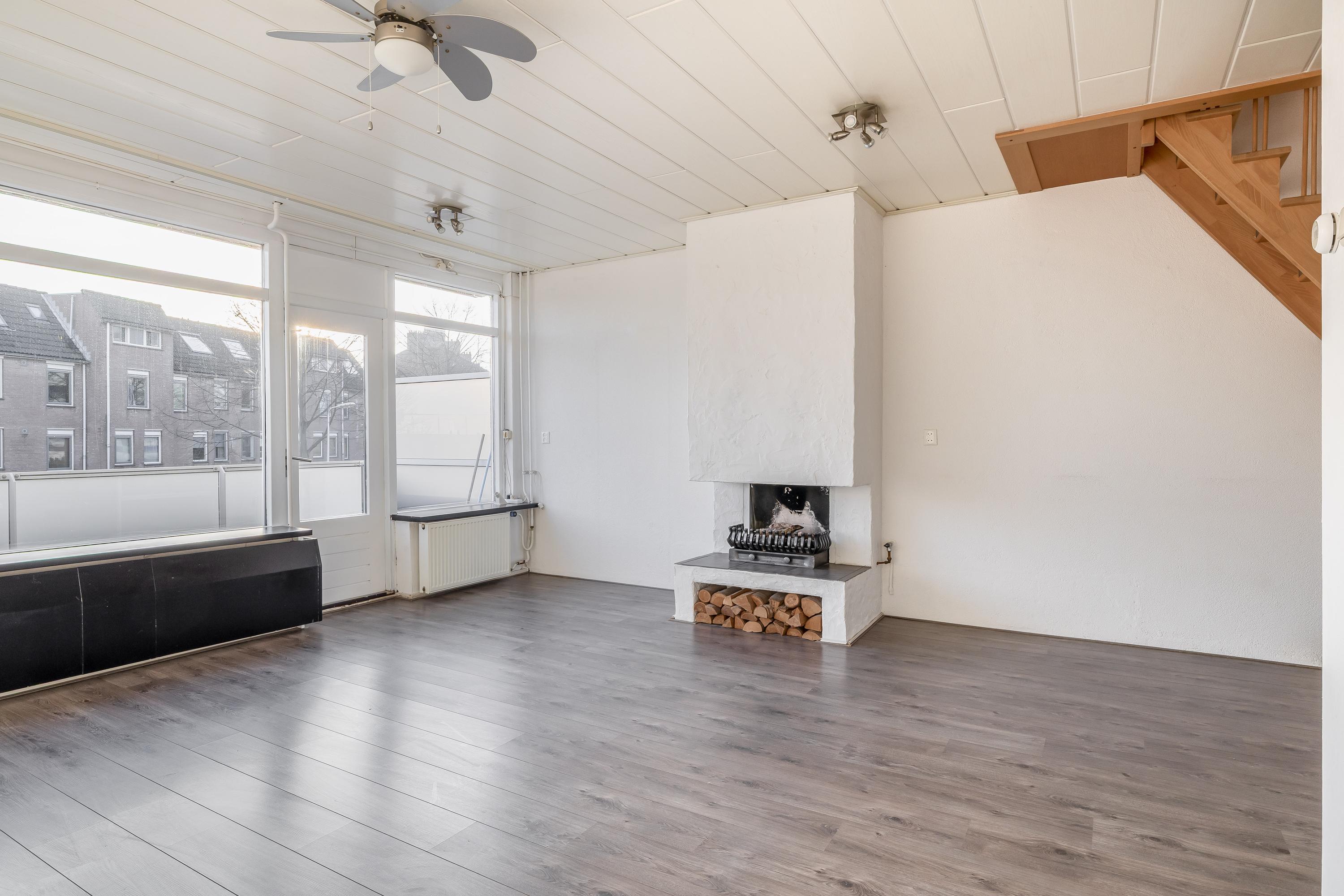De woonverdieping beschikt over een ruime en lichte woonkamer met grote raampartijen, waardoor er prettig veel daglicht binnenvalt. De ruimte is netjes afgewerkt met een laminaatvloer en lichte wanden. Dit zorgt voor een frisse en neutrale uitstraling. De open haard vormt een sfeervol element en maakt de woonkamer extra gezellig. In de woonkamer bevindt zich tevens de trap naar de verdieping, wat bijdraagt aan een speelse indeling. Een appartement met het gevoel van een huis. Via de deur is er toegang tot het ruime balkon op het zuiden, waar je volop kunt genieten van de zon.