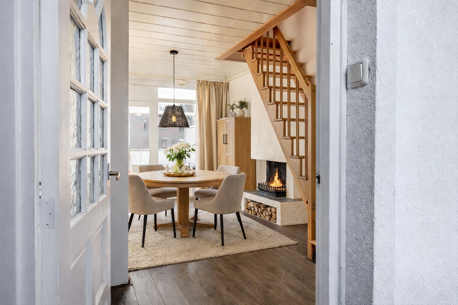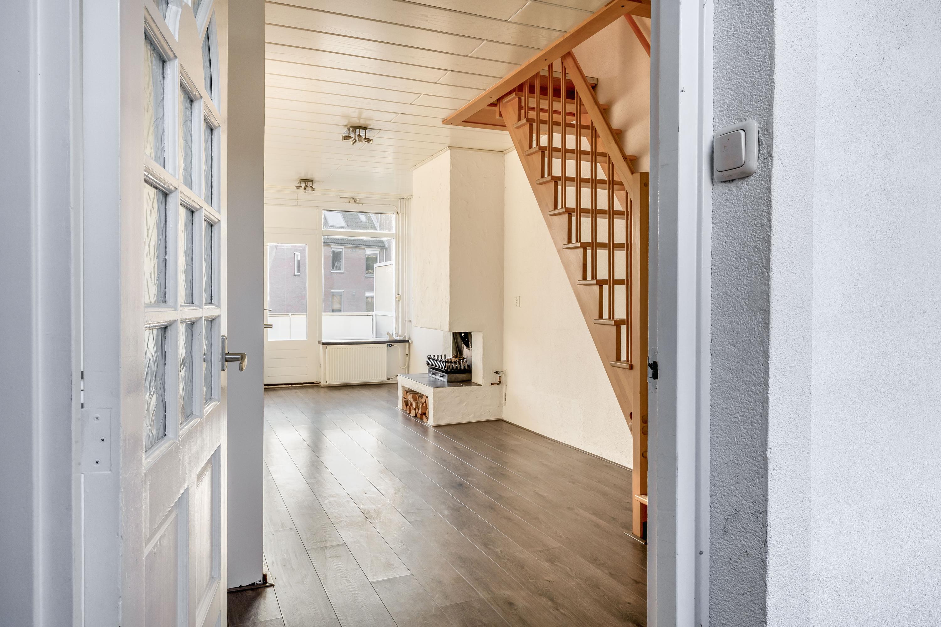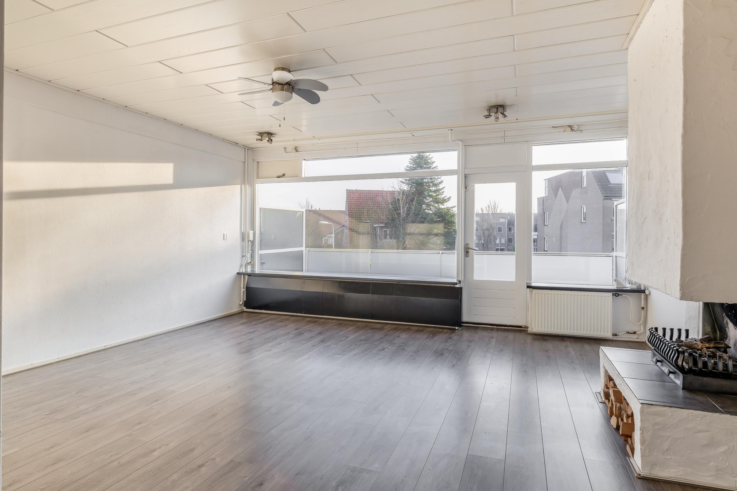 De woonverdieping beschikt over een ruime en lichte woonkamer met grote raampartijen, waardoor er prettig veel daglicht binnenvalt. De ruimte is netjes afgewerkt met een laminaatvloer en lichte wanden. Dit zorgt voor een frisse en neutrale uitstraling. De open haard vormt een sfeervol element en maakt de woonkamer extra gezellig. In de woonkamer bevindt zich tevens de trap naar de verdieping, wat bijdraagt aan een speelse indeling. Een appartement met het gevoel van een huis. Via de deur is er toegang tot het ruime balkon op het zuiden, waar je volop kunt genieten van de zon.