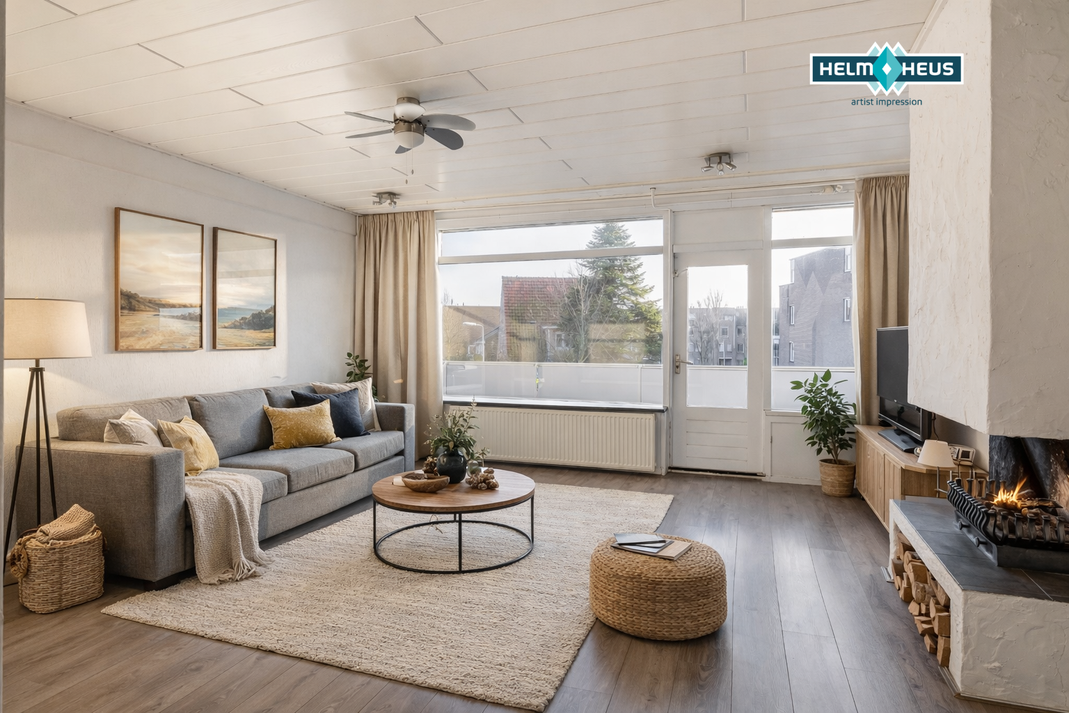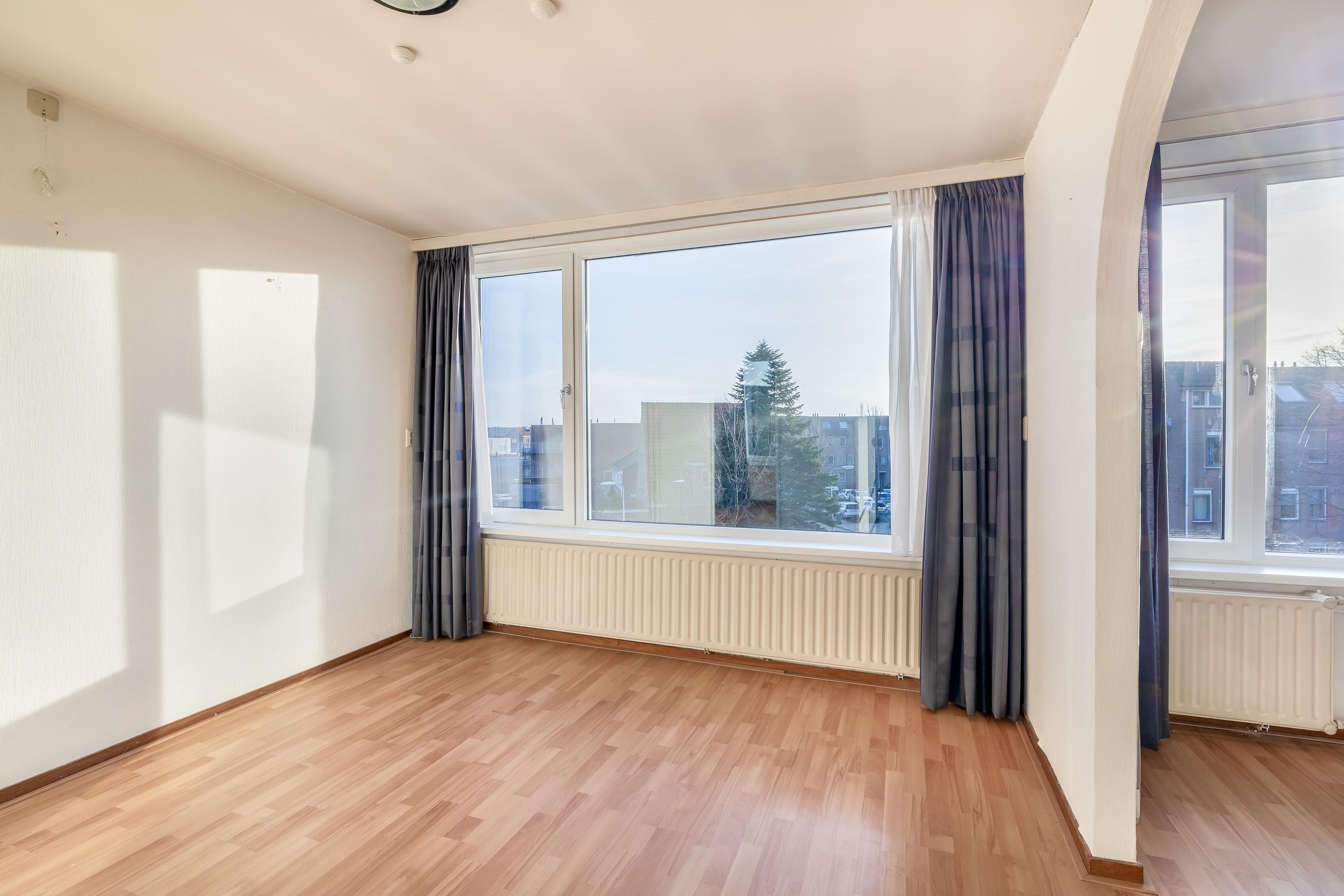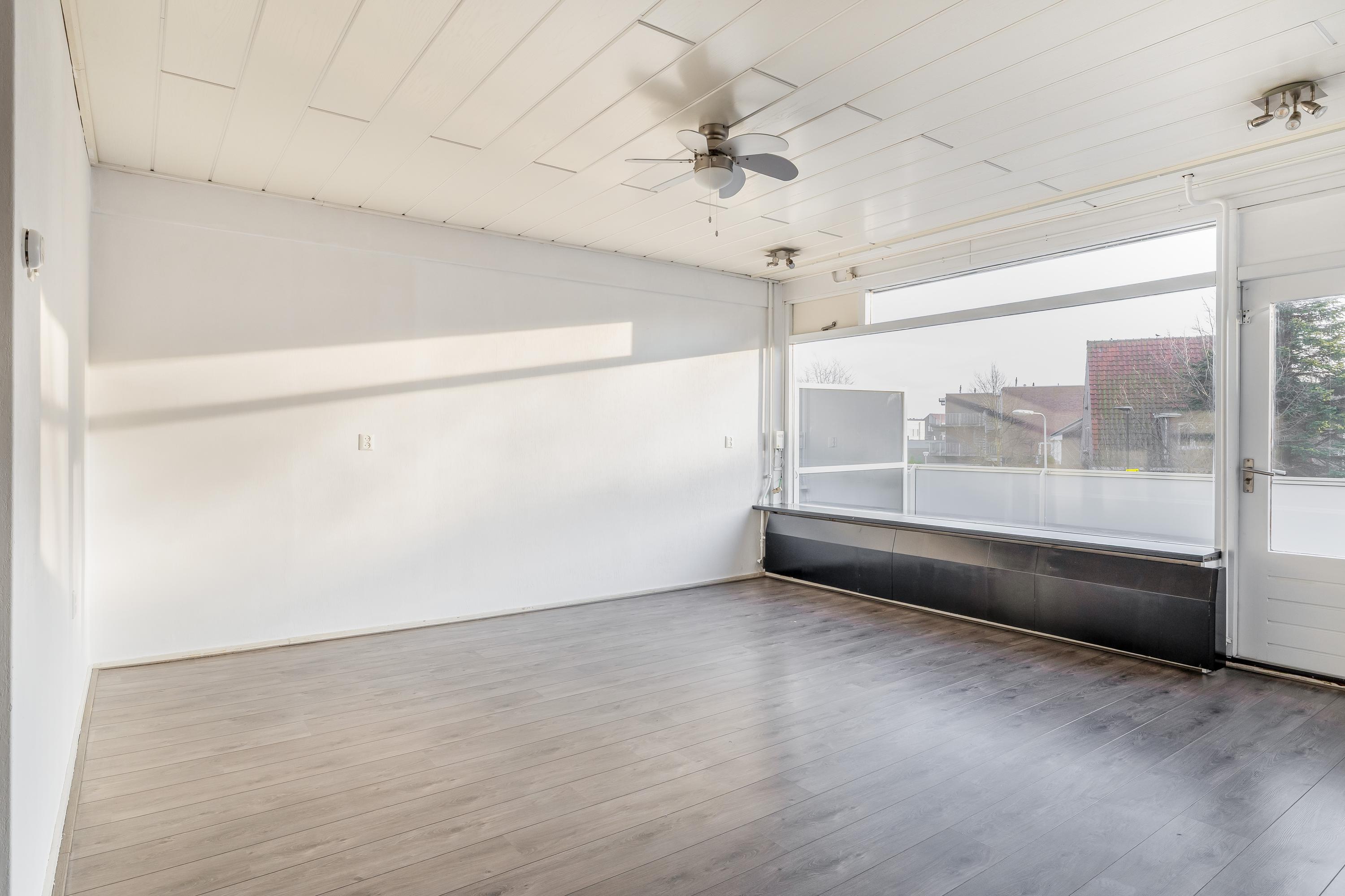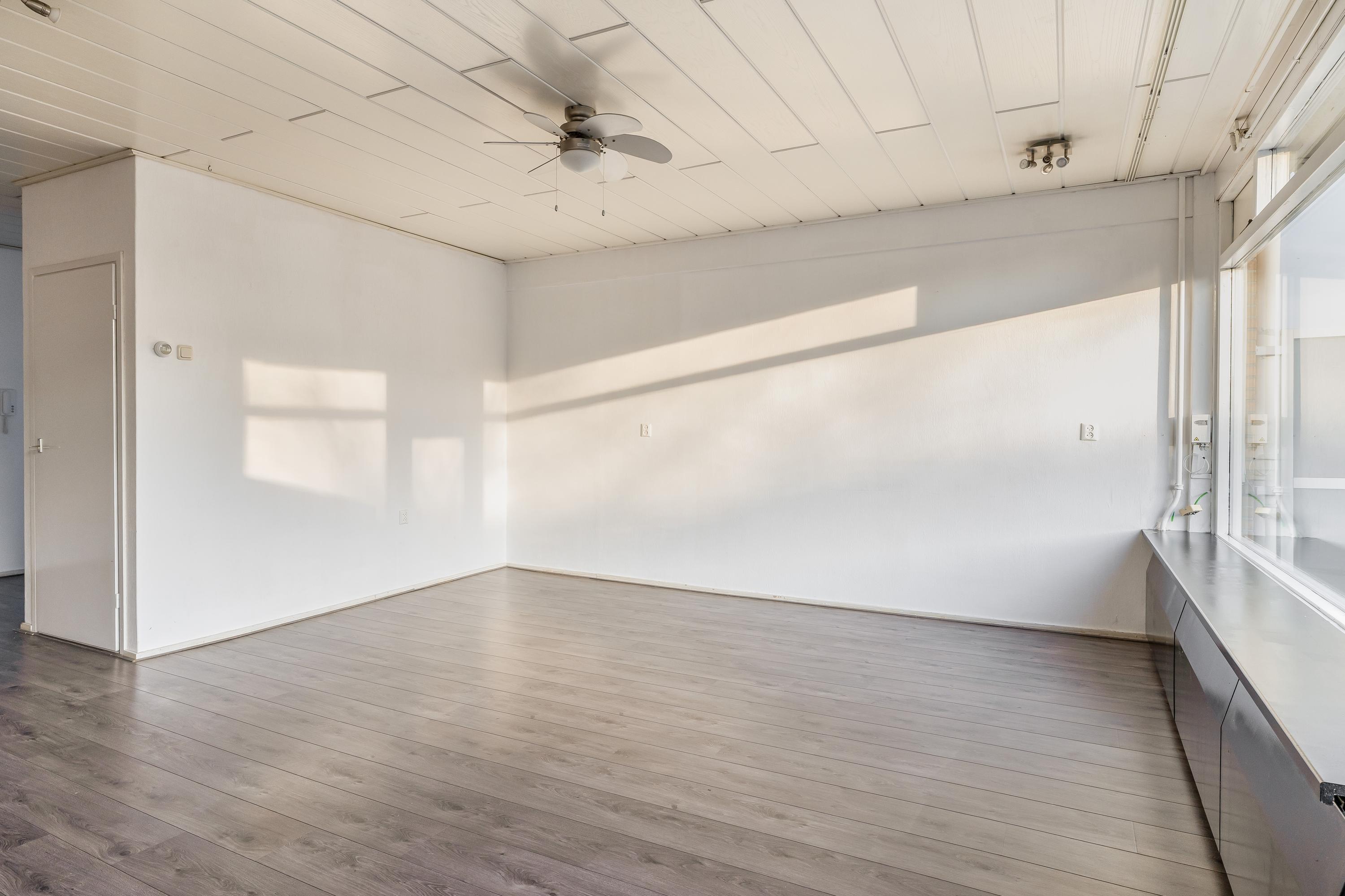 De woonverdieping beschikt over een ruime en lichte woonkamer met grote raampartijen, waardoor er prettig veel daglicht binnenvalt. De ruimte is netjes afgewerkt met een laminaatvloer en lichte wanden. Dit zorgt voor een frisse en neutrale uitstraling. De open haard vormt een sfeervol element en maakt de woonkamer extra gezellig. In de woonkamer bevindt zich tevens de trap naar de verdieping, wat bijdraagt aan een speelse indeling. Een appartement met het gevoel van een huis. Via de deur is er toegang tot het ruime balkon op het zuiden, waar je volop kunt genieten van de zon.