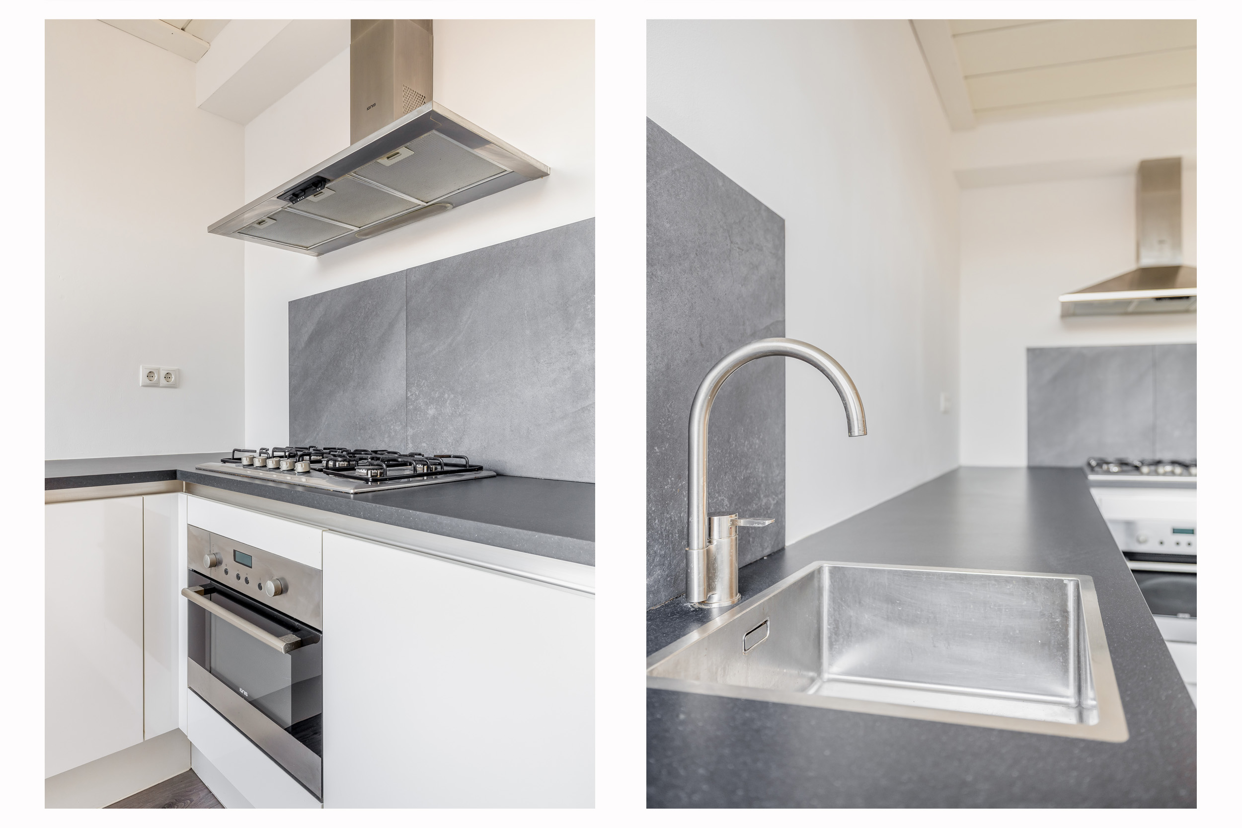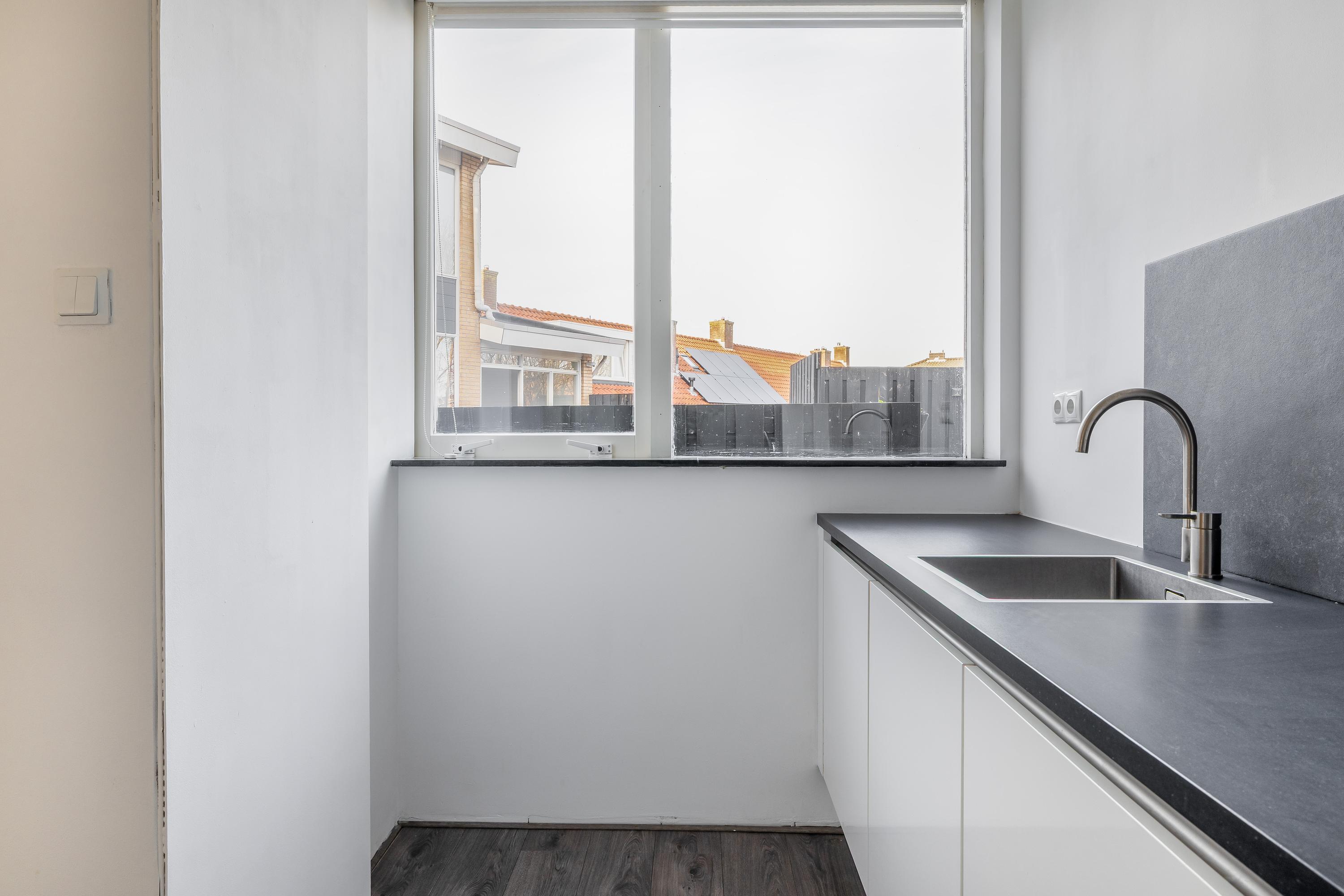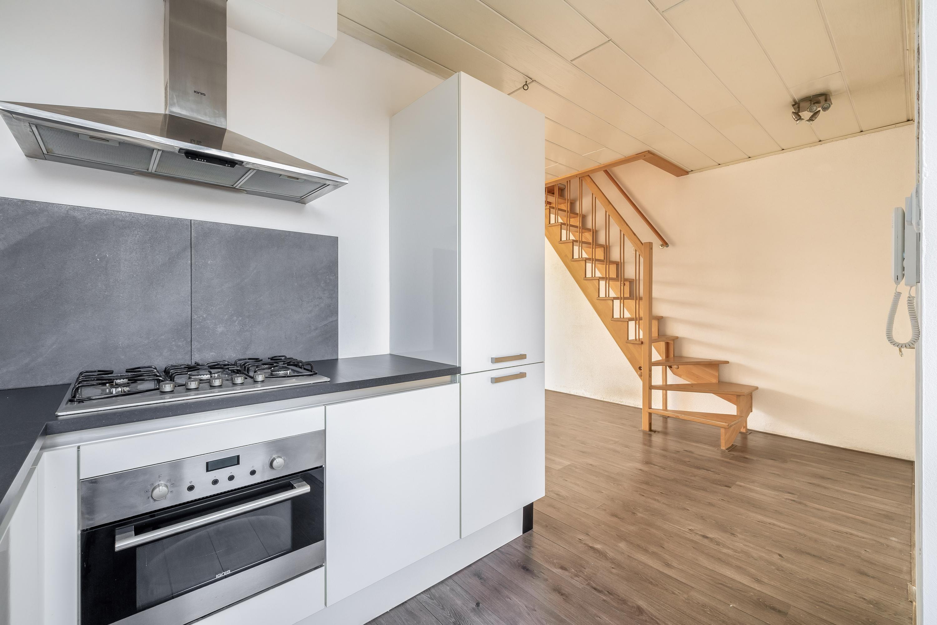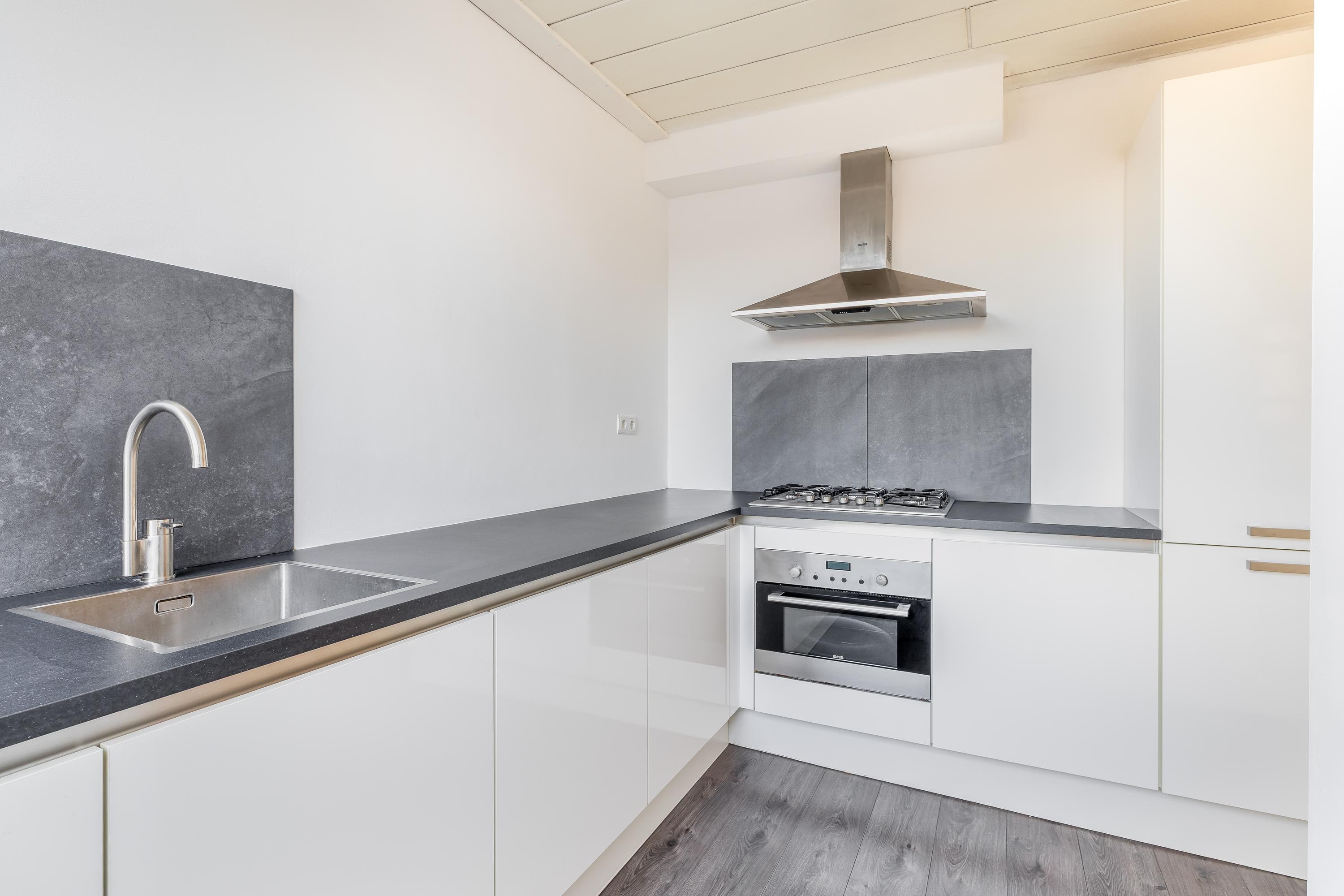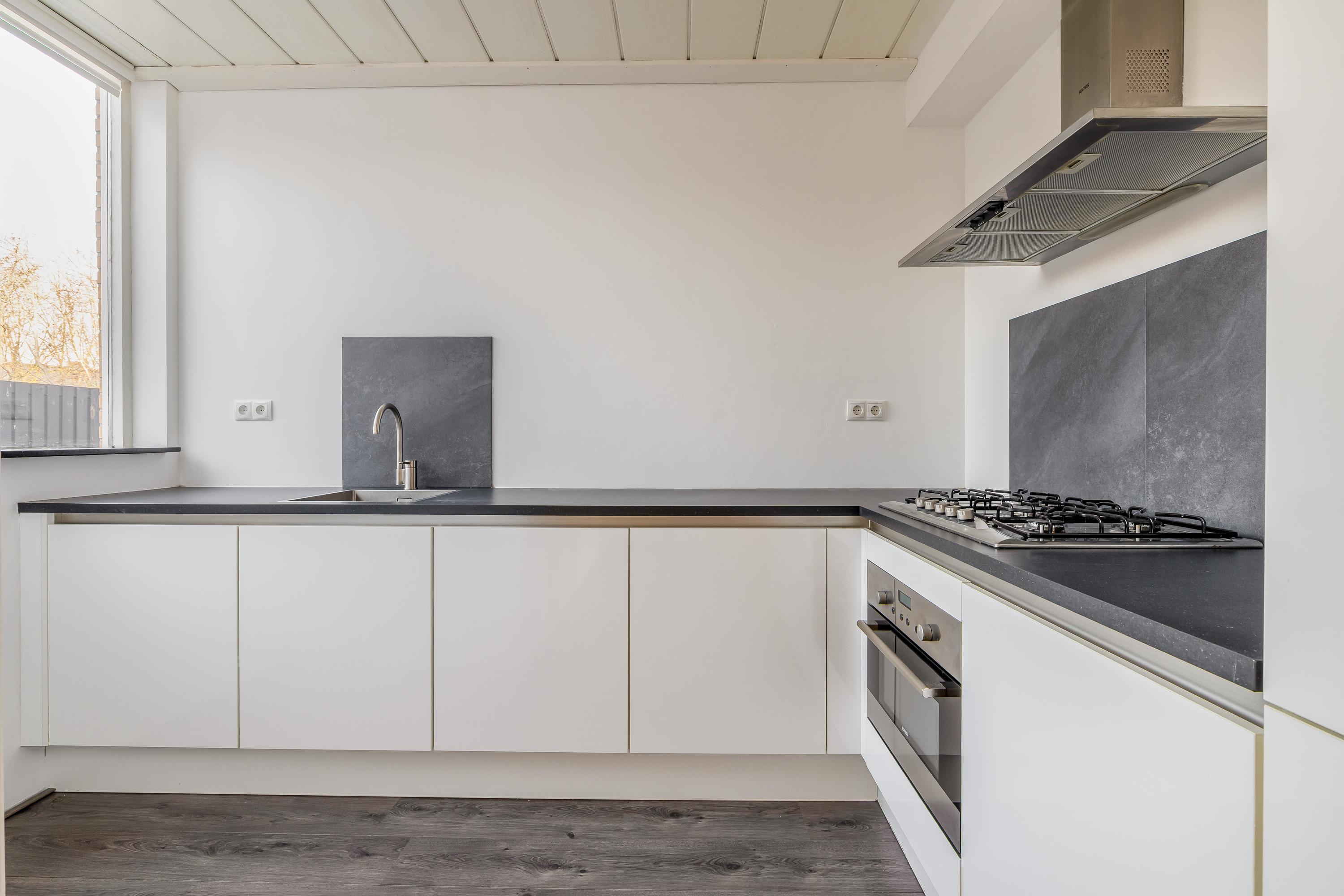 Aansluitend bevindt zich de keuken, die in 2017 is vernieuwd. De keuken is strak en modern uitgevoerd en voorzien van diverse inbouwapparatuur, waaronder een gaskookplaat, afzuigkap, oven, afwasmachine en spoelbak. In de keuken is een boiler aanwezig ten behoeve van het warme water. Dankzij de praktische opstelling en het ruime werkblad is dit een functionele en prettige plek om te koken.