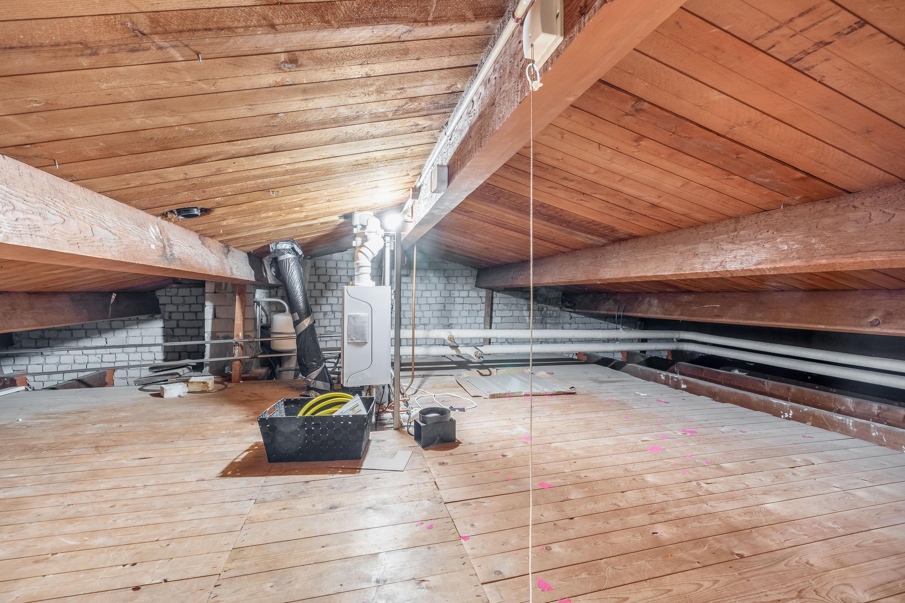 Via een vlizo trap bereik je de vliering. Hier bevinden zich de cv-ketel (CV-ketel Remeha 2022) en dankzij de royale afmetingen is er volop ruimte voor extra opslag! Tevens is er nog een inpandige berging te vinden in de onderbouw.