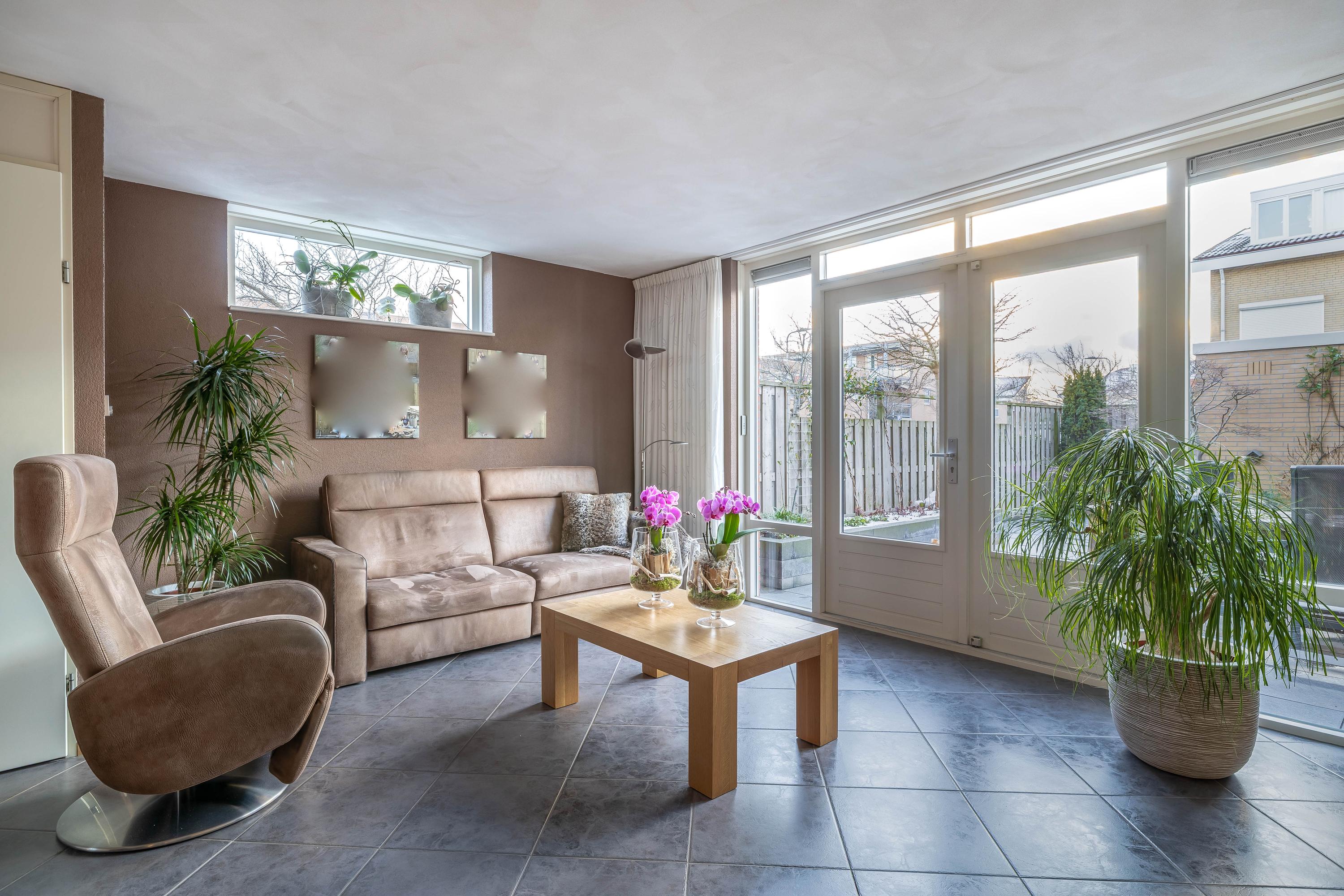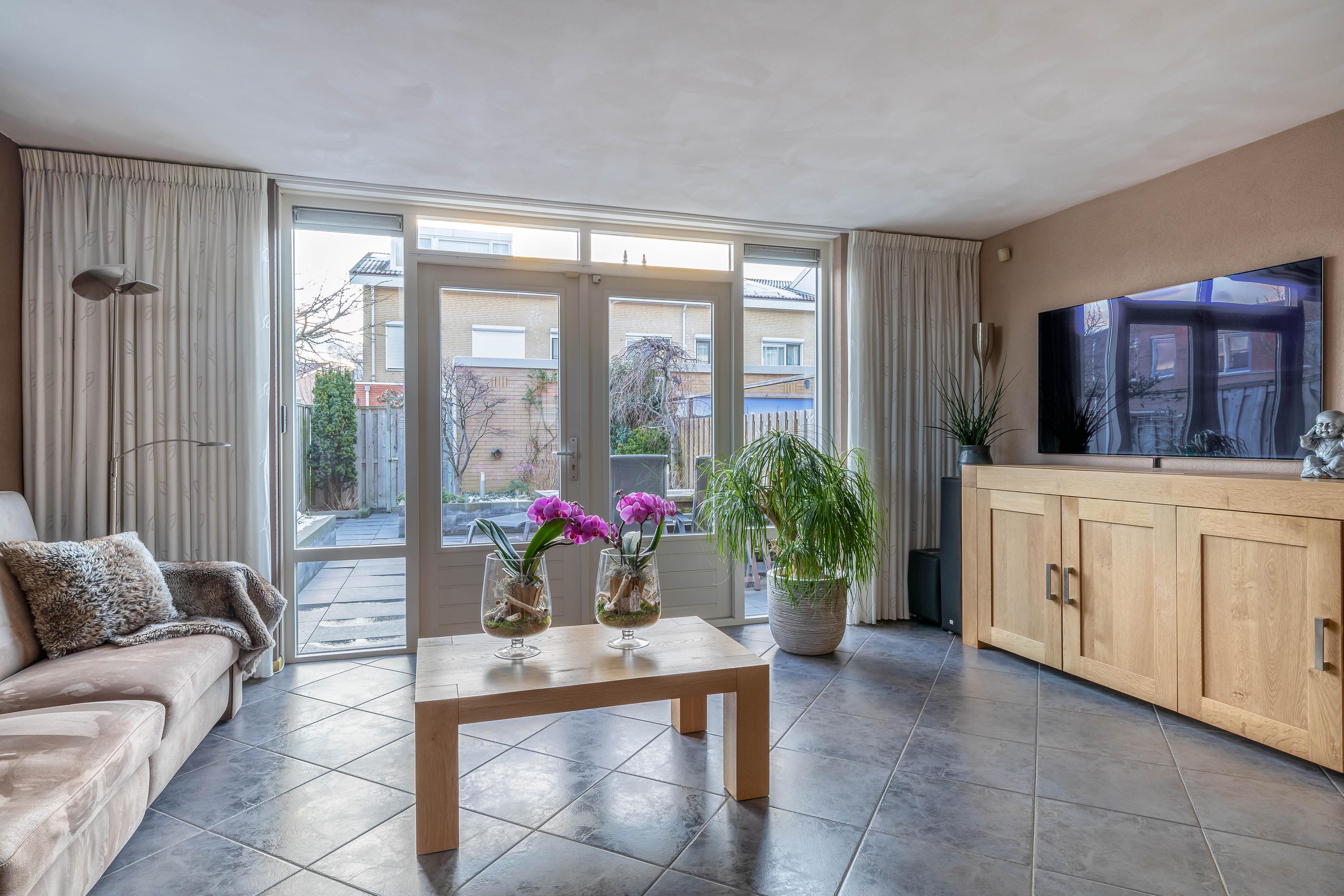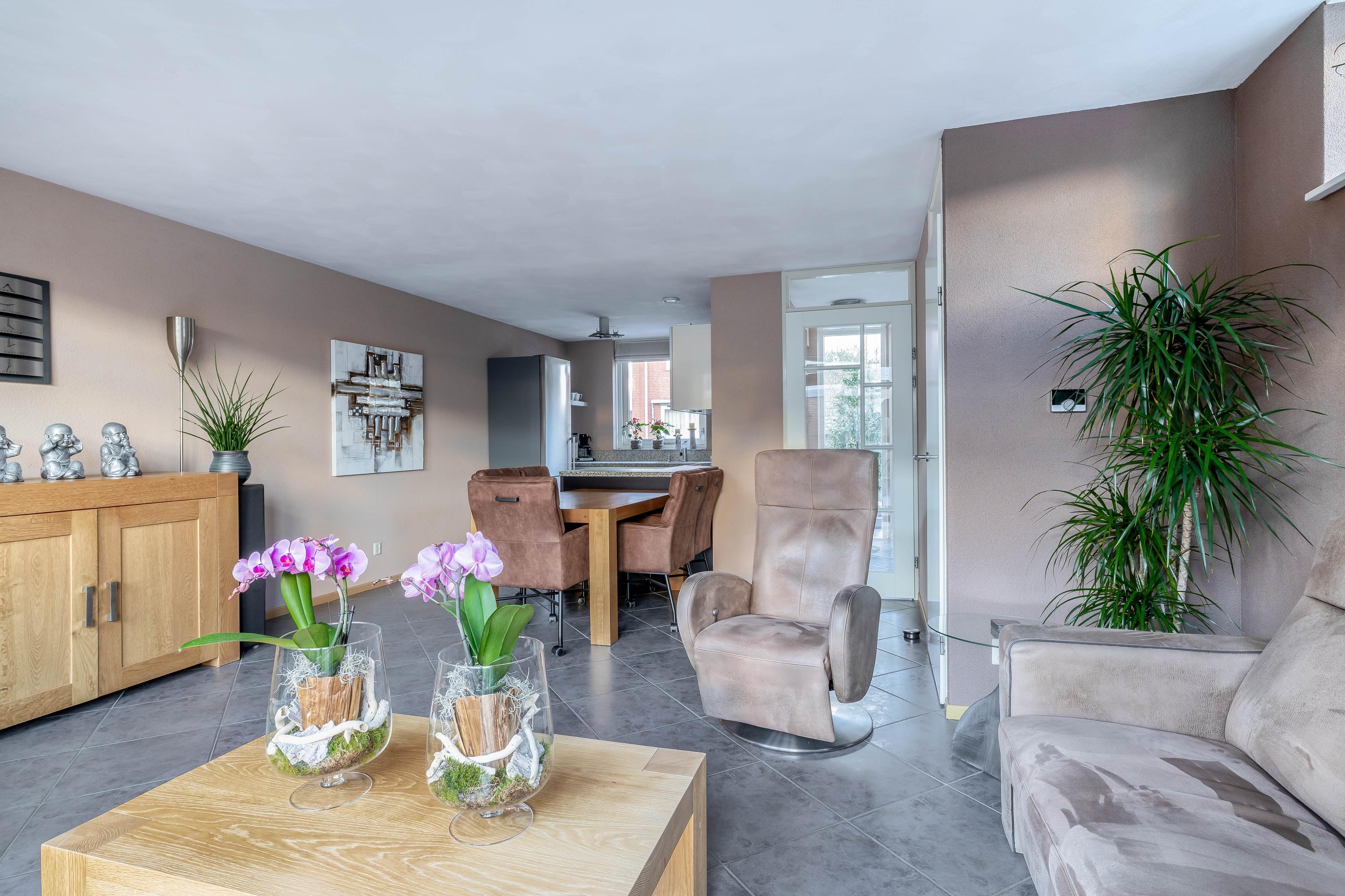 Je komt binnen in de nette entree met garderobe, meterkast en een moderne toiletruimte. Vanuit hier loop je door naar de woonkamer: een heerlijke, lichte leefruimte met grote raampartijen en openslaande deuren naar de tuin. De zithoek is gezellig en ruim opgezet, met volop ruimte voor een comfortabele bank en extra zitstoelen.