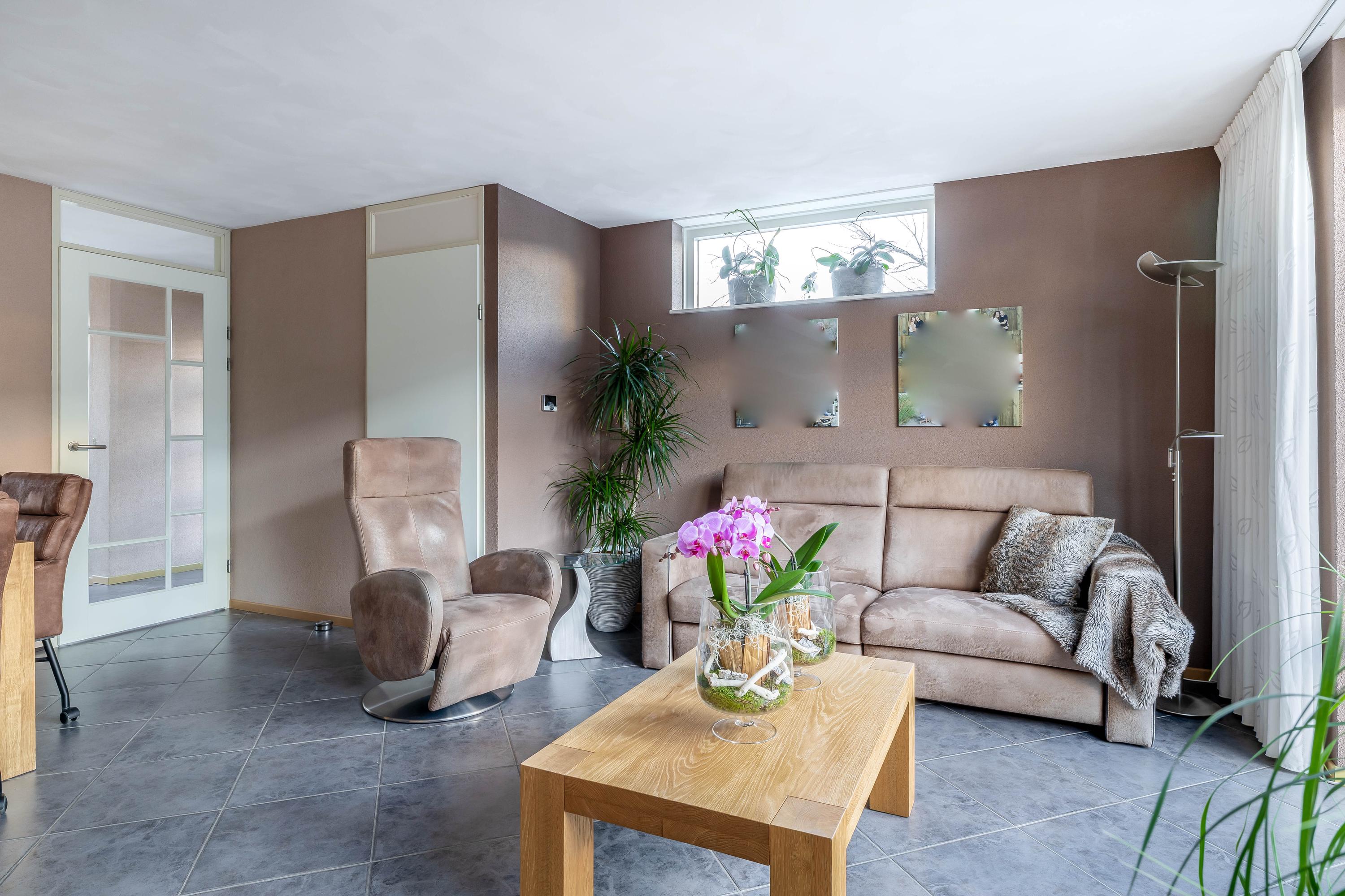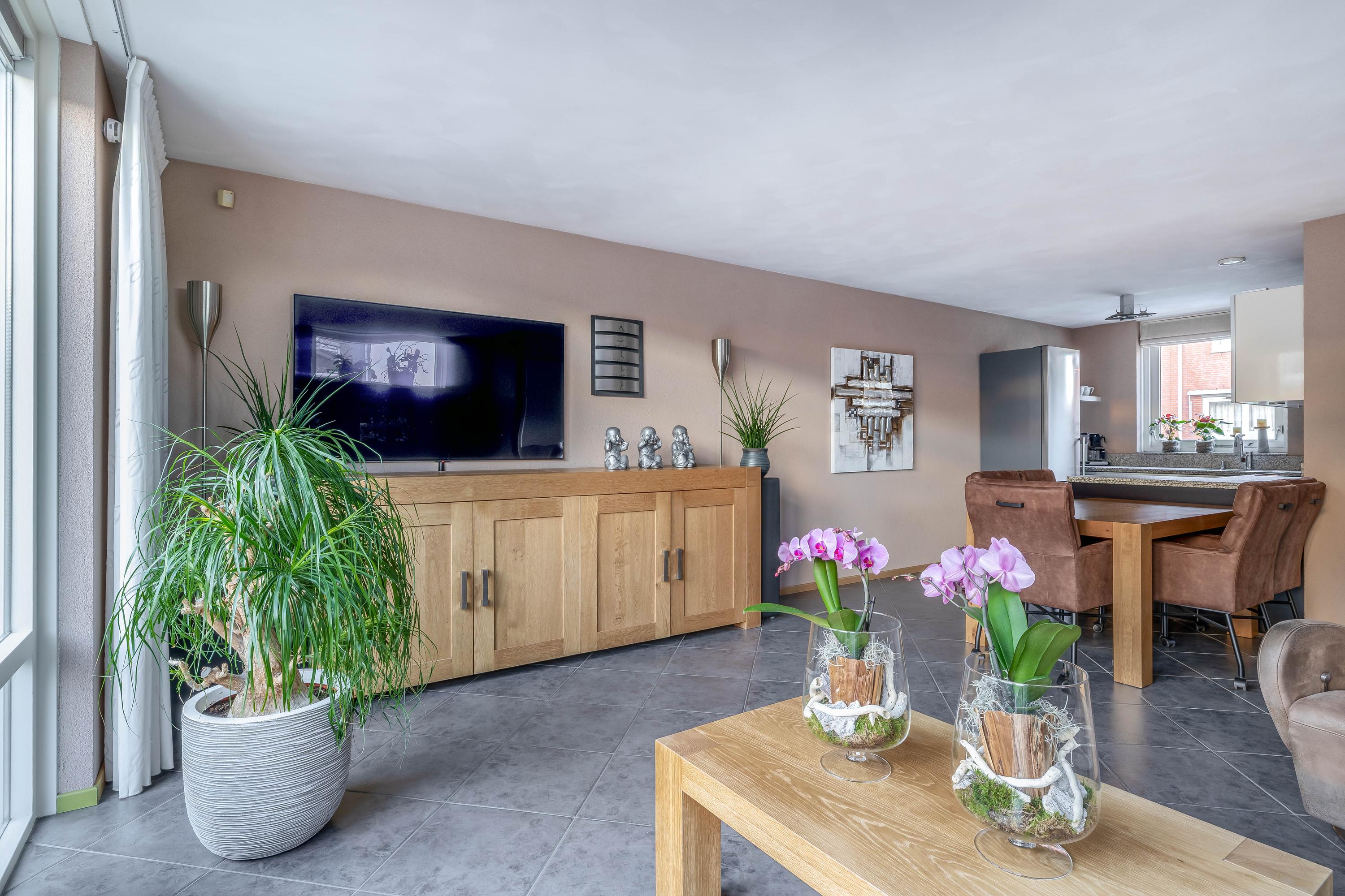 Aan de andere zijde van de woonkamer is ruimte voor een gezellige eethoek, waar je comfortabel met familie of vrienden samenkomt. De begane grond is afgewerkt met een nette tegelvloer en voorzien van vloerverwarming, wat zorgt voor extra comfort.