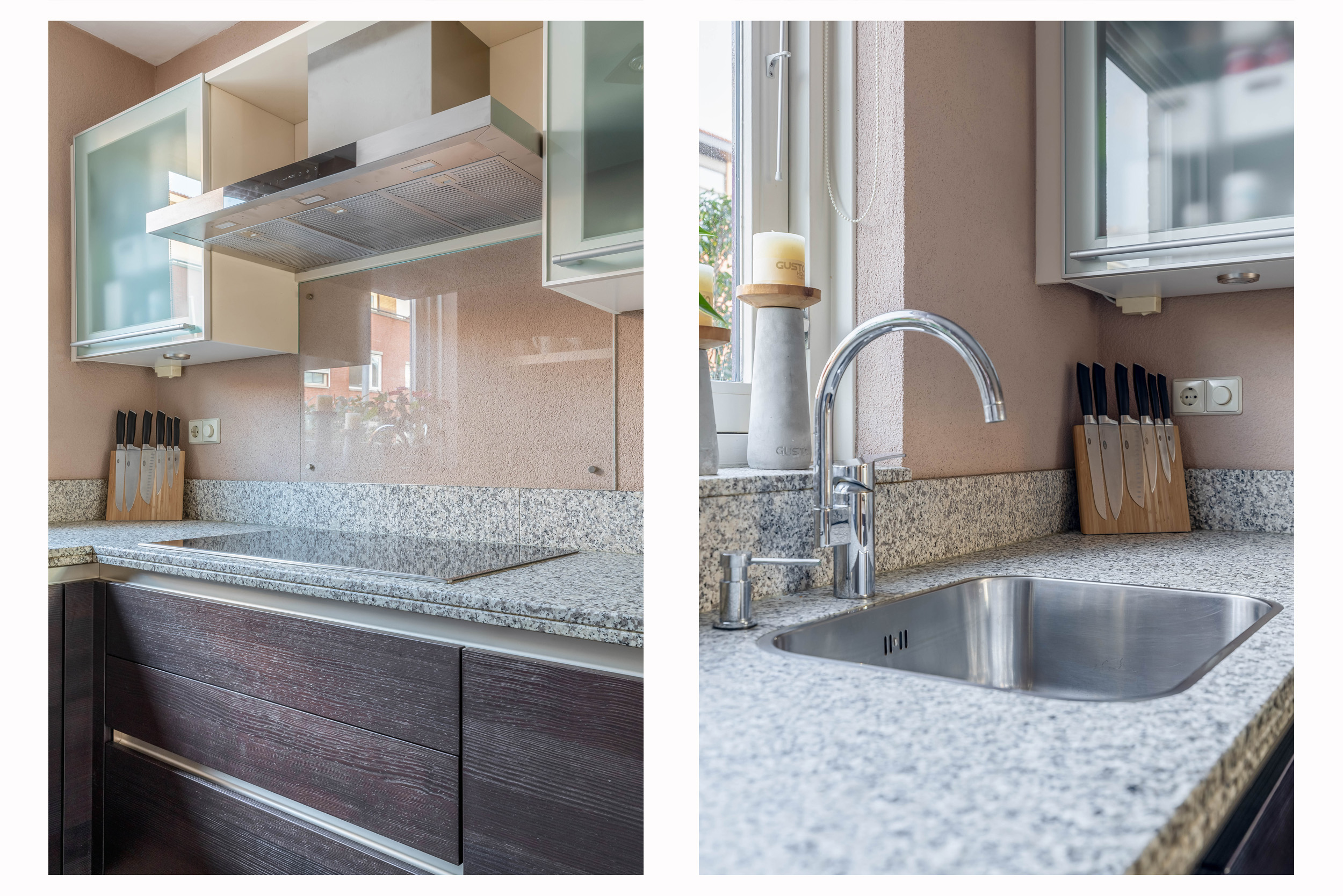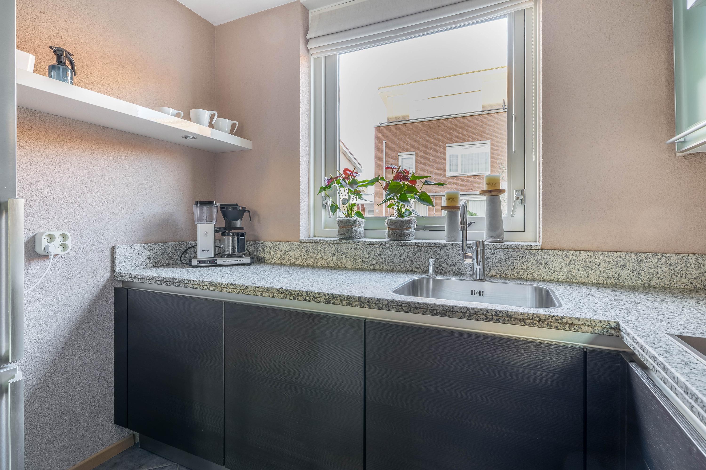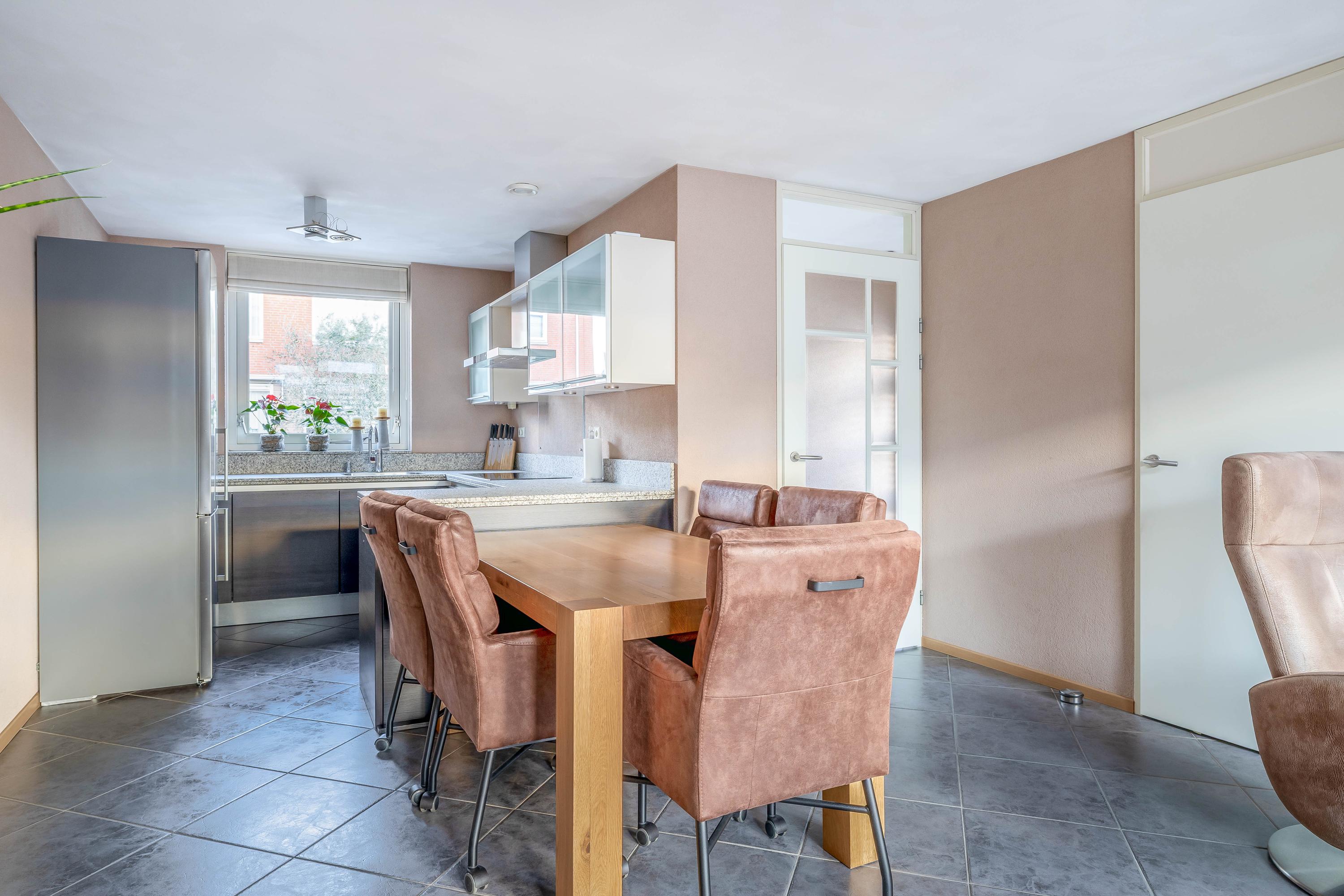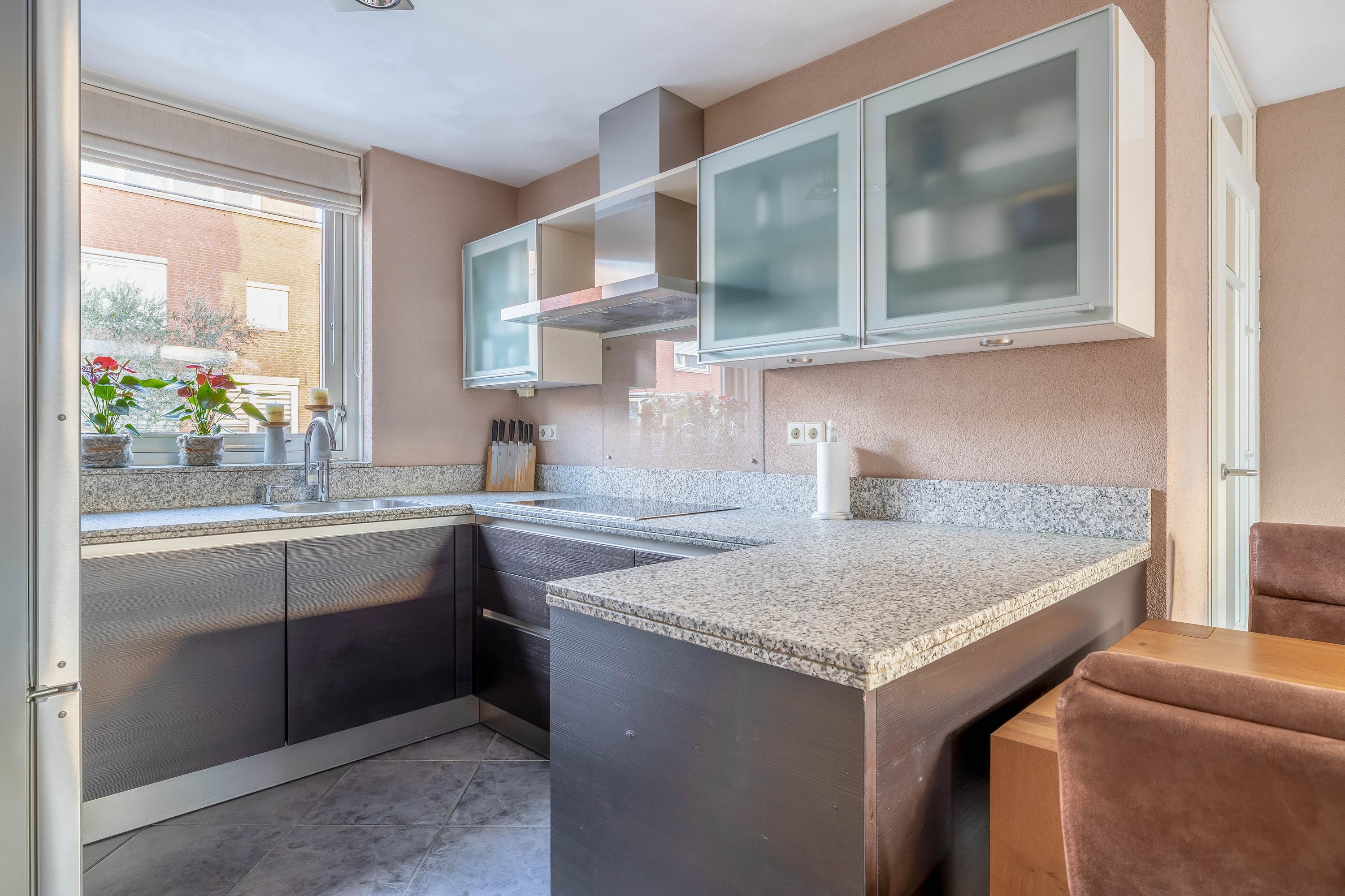 De keuken ligt aan de voorzijde van de woning en heeft een praktische hoekopstelling met veel werk- en bergruimte. Het natuurstenen werkblad, de moderne fronten en diverse inbouwapparatuur maken dit een fijne plek om te koken, met leuk zicht op de straat.