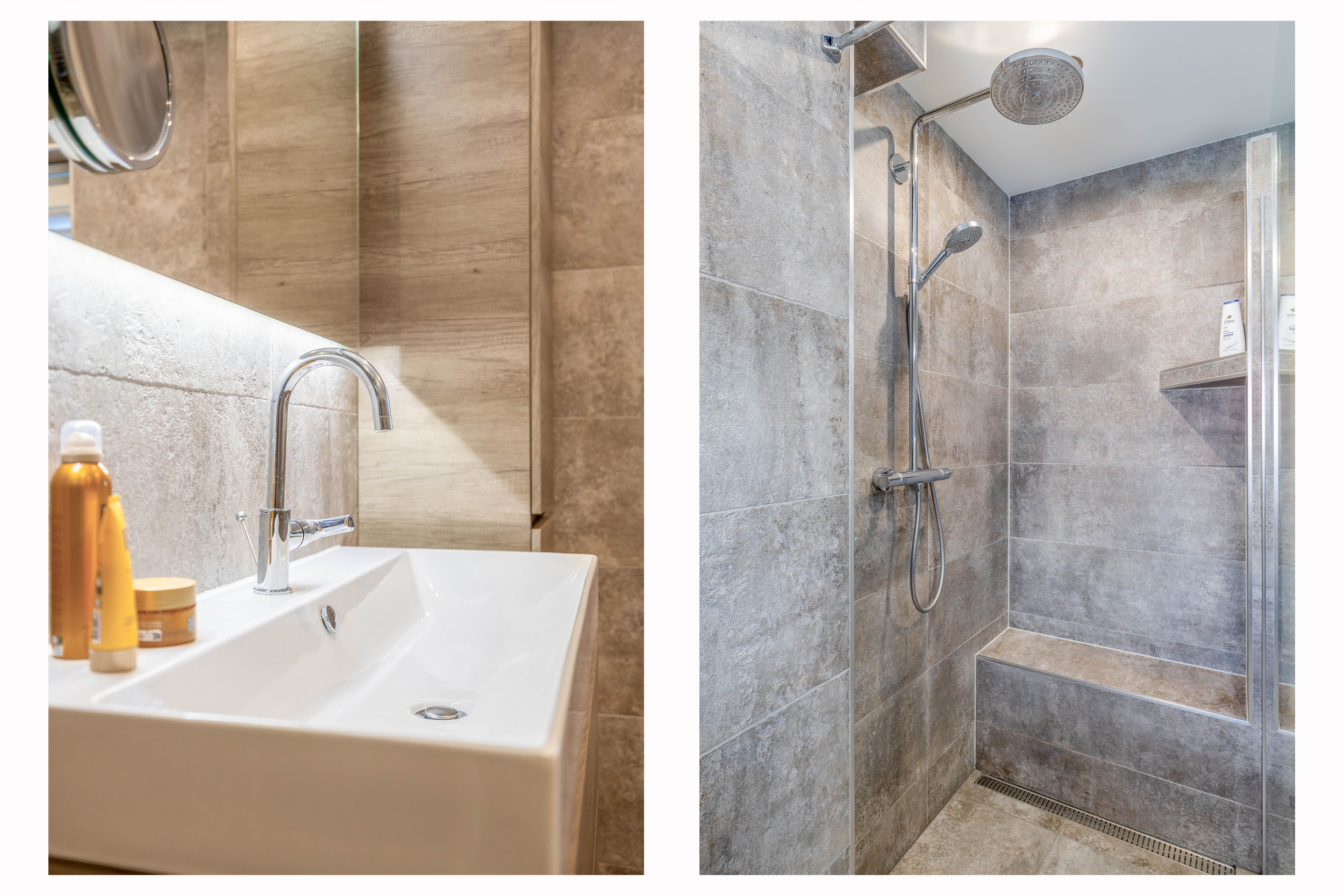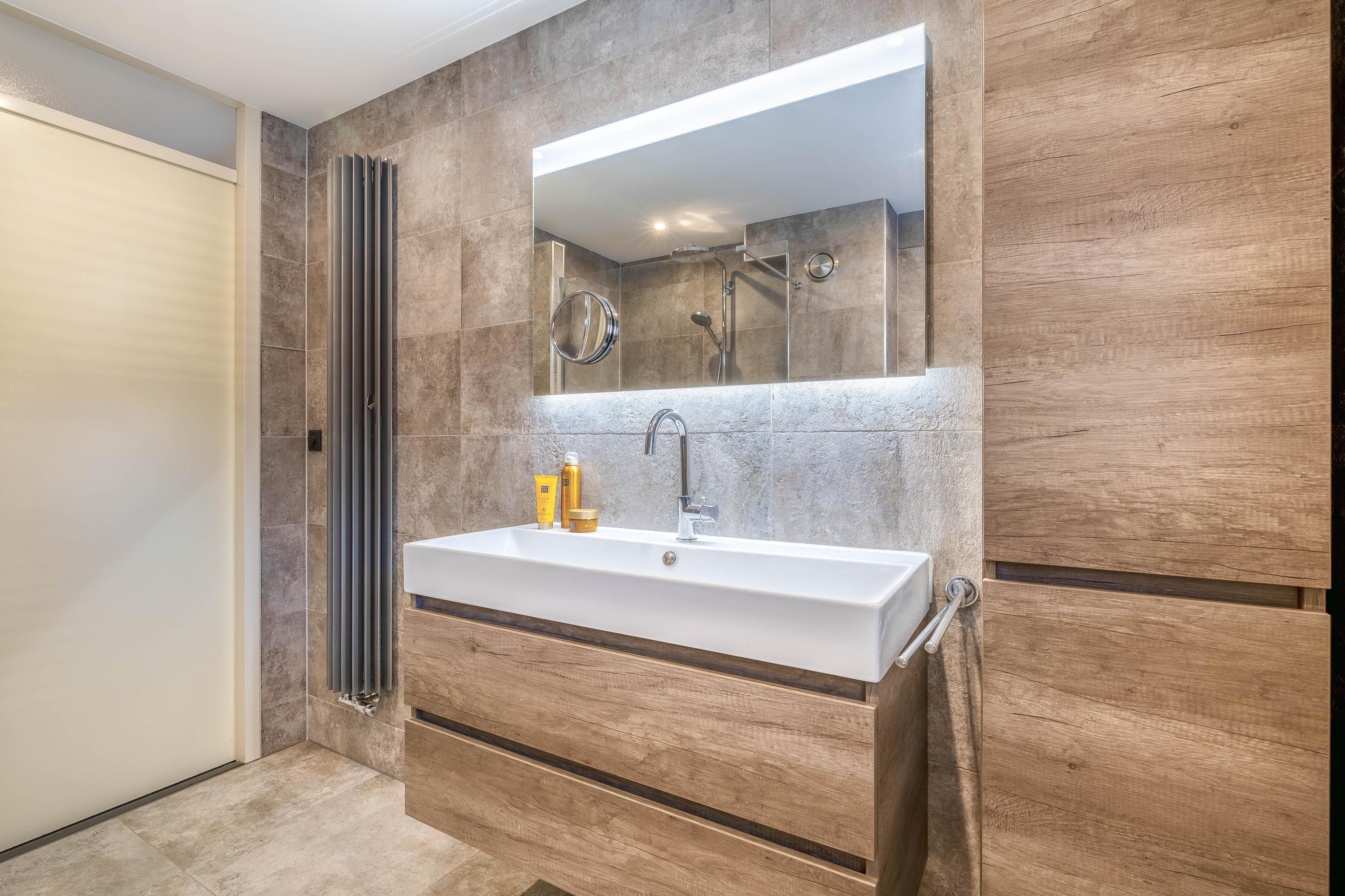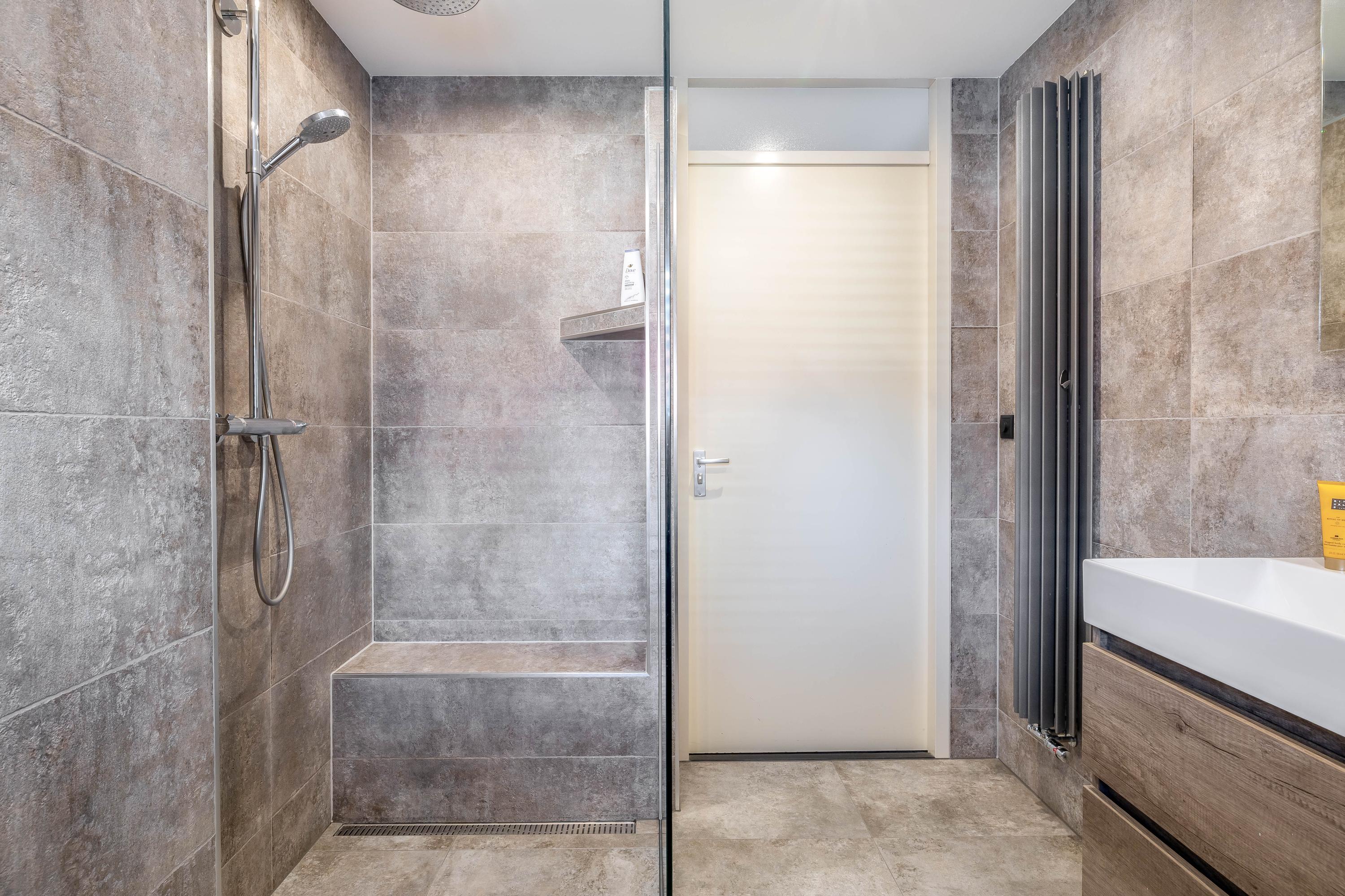 De badkamer is modern en compleet uitgevoerd met een inloopdouche, wastafelmeubel en toilet. De neutrale kleurstelling en strakke afwerking geven de ruimte een luxe uitstraling.