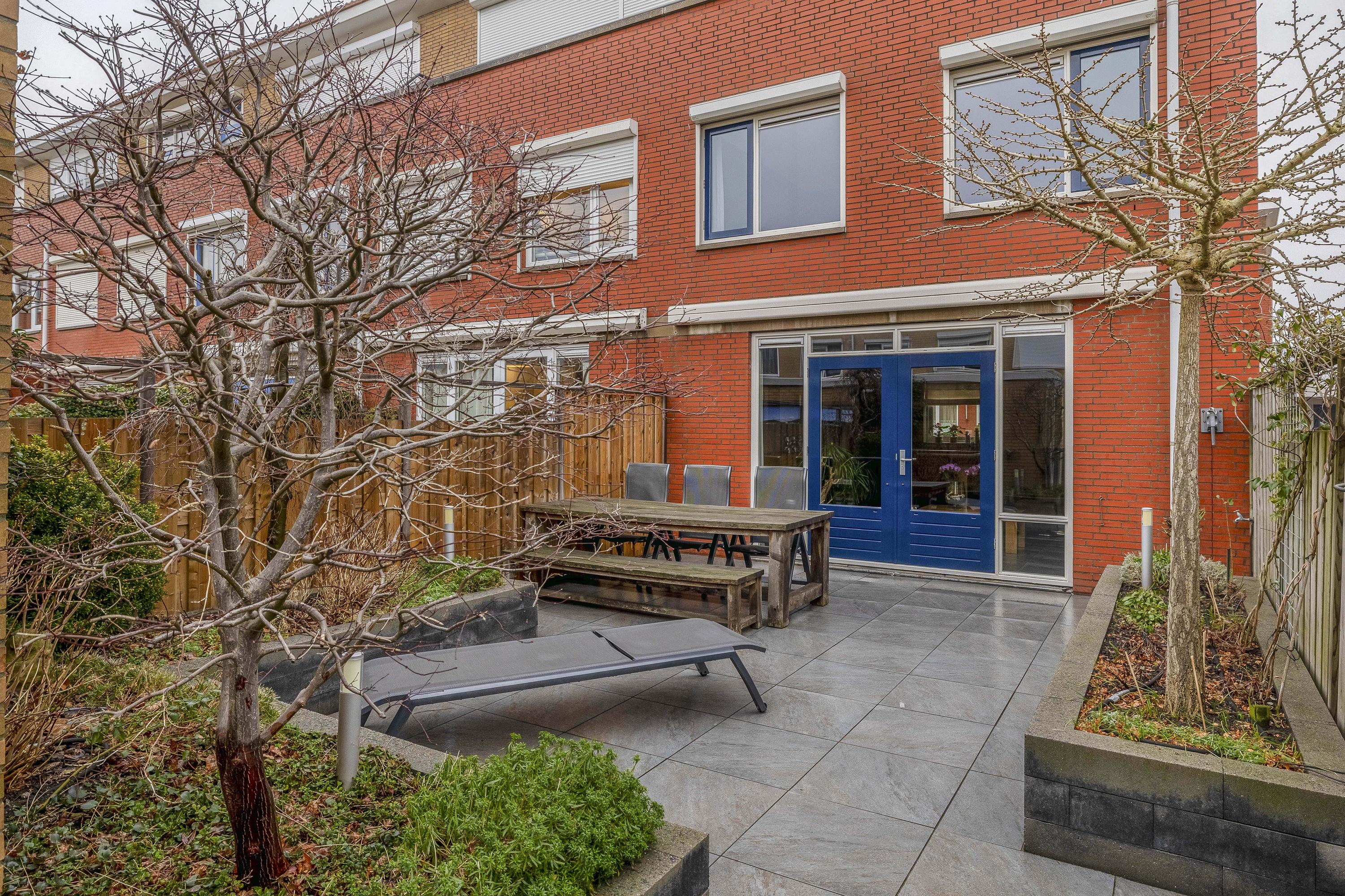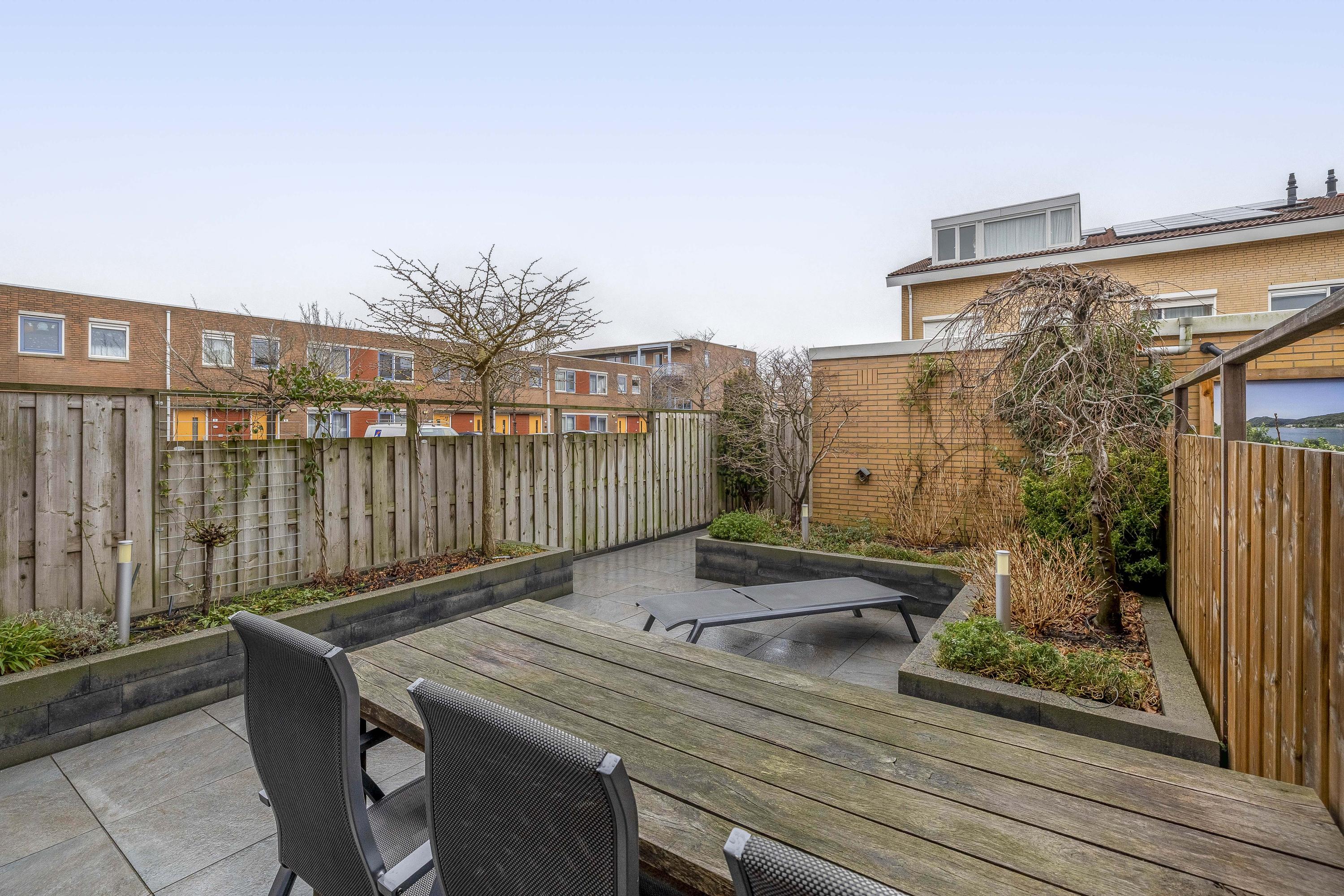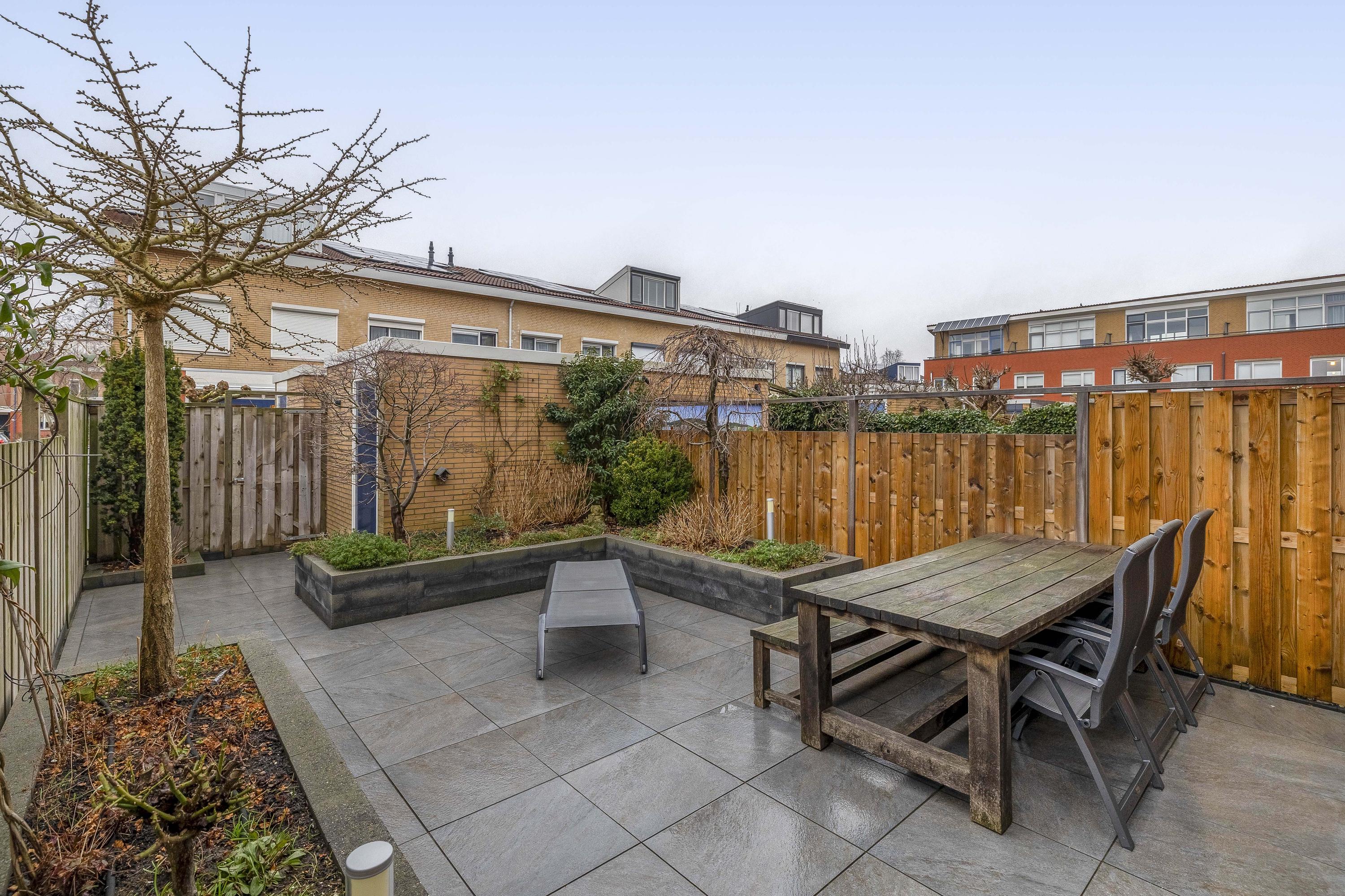Via de woonkamer bereik je de zonnige achtertuin. Deze is keurig aangelegd, biedt volop privacy en heeft meerdere fijne zitplekken. Achterin staat een vrijstaande berging en er is een handige achterom aanwezig.