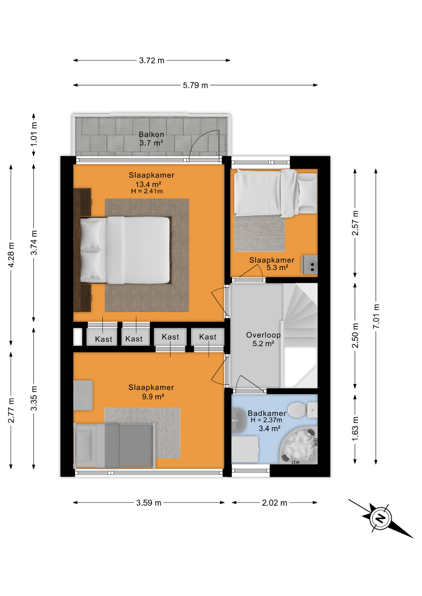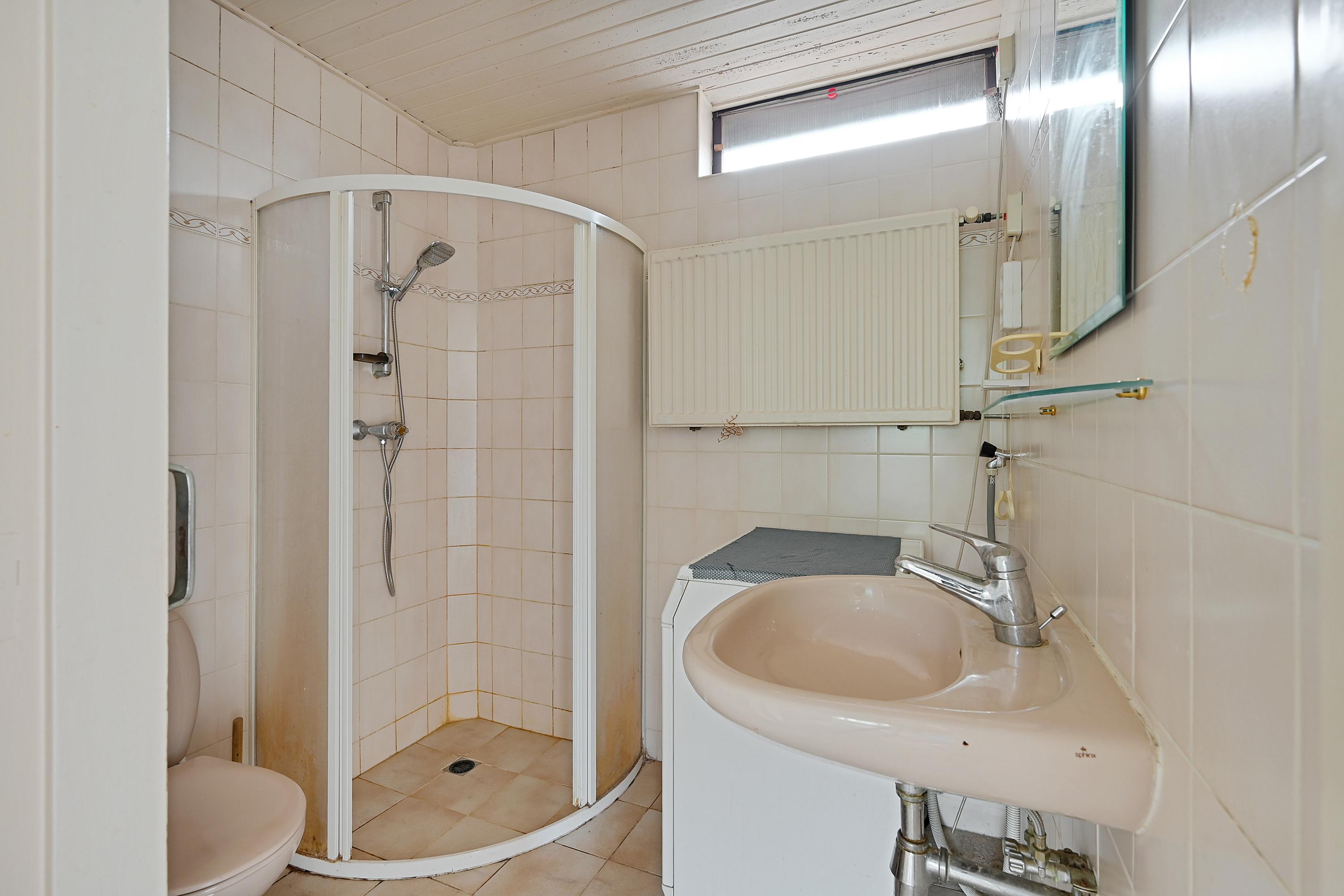 Op de eerste verdieping vind je drie slaapkamers, elk met hun eigen mogelijkheden. De grootste kamer ligt aan de achterzijde en heeft niet alleen genoeg ruimte voor een tweepersoonsbed en een kast, maar ook direct toegang tot een balkon – een fijne plek om even buiten te zitten. De andere twee kamers zijn perfect in te richten als kinder-, logeer- of werkkamer. De badkamer is eenvoudig maar praktisch, voorzien van een douchecabine, wastafel en toilet. Daarnaast is er ruimte voor de wasmachine, wat het extra handig maakt in het dagelijks gebruik.
