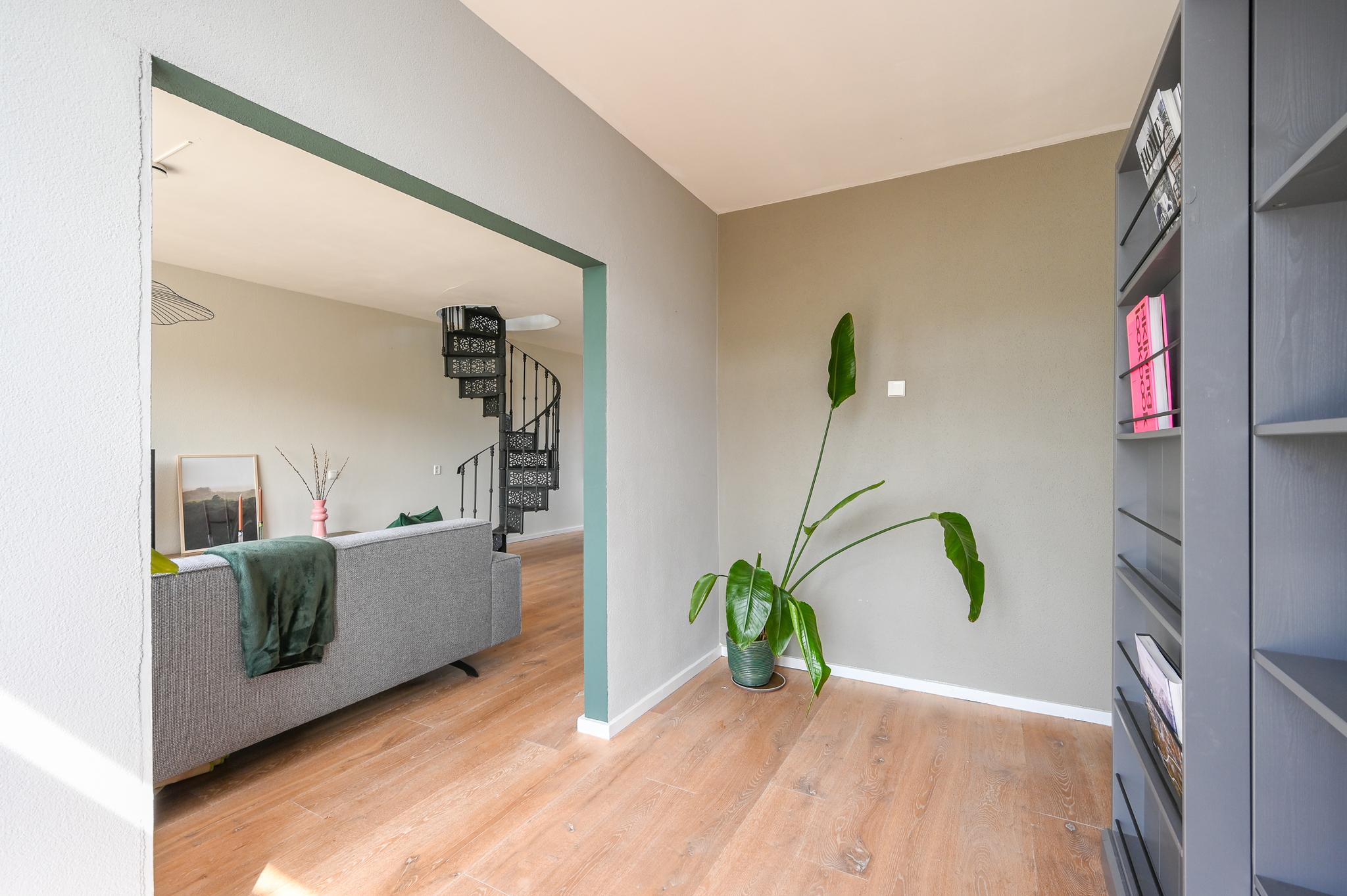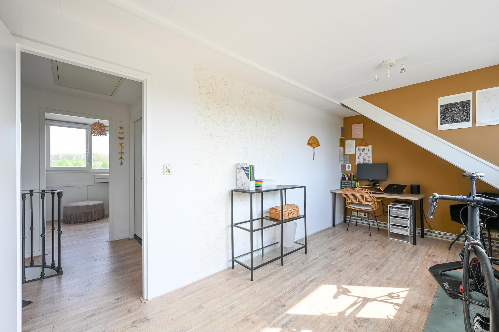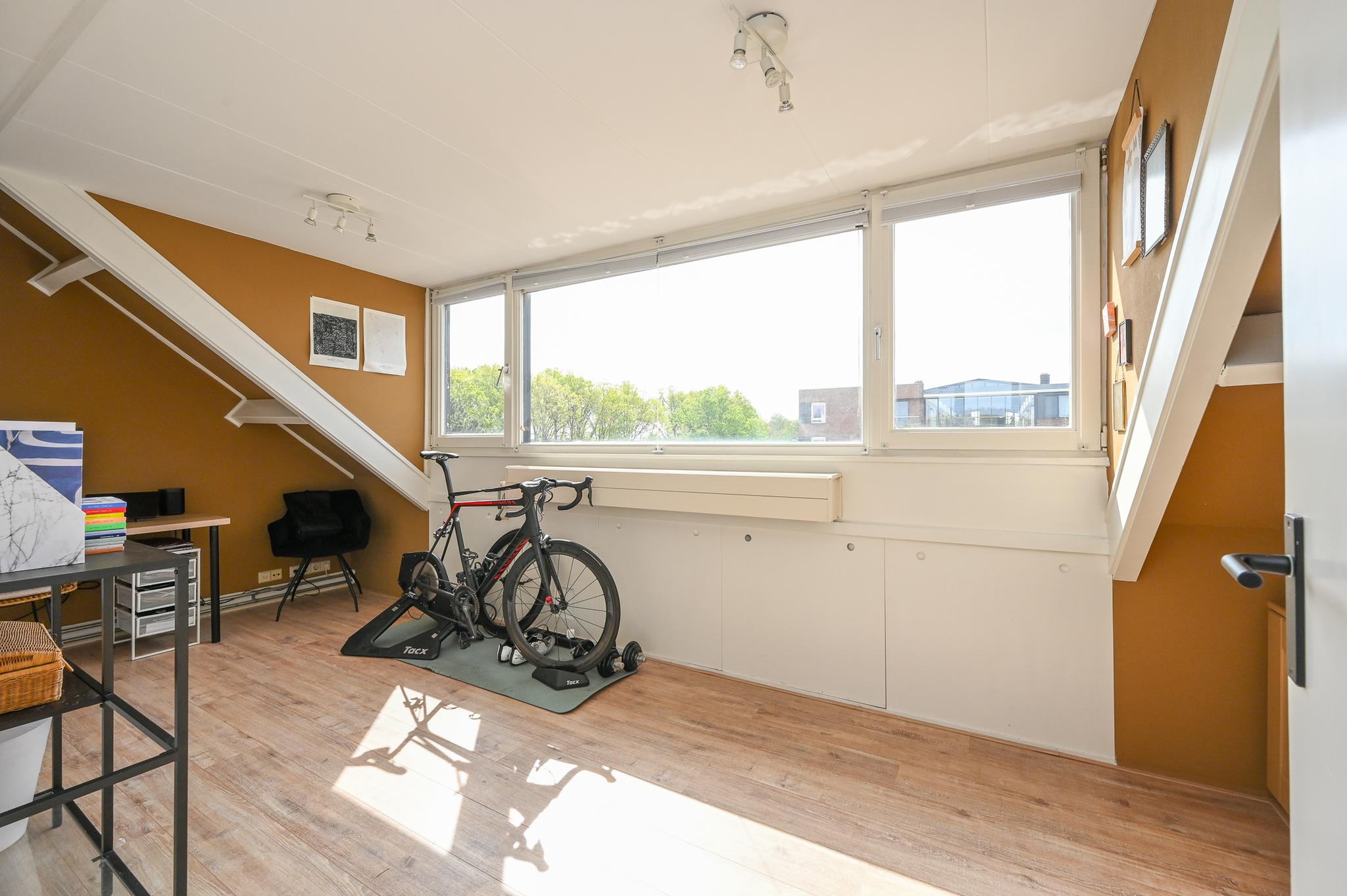 Een extra ruimte ligt aan de achterzijde van het appartement. Voordat de dakopbouw geplaatst werd was hier een praktische slaapkamer. De muur is eruit gehaald waardoor er ruimte is ontstaan voor een thuis kantoor, een extra slaapkamer of een fijne plek om te lezen.