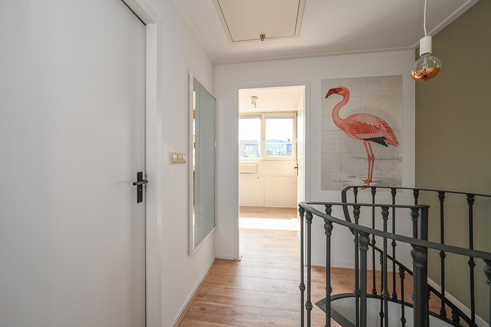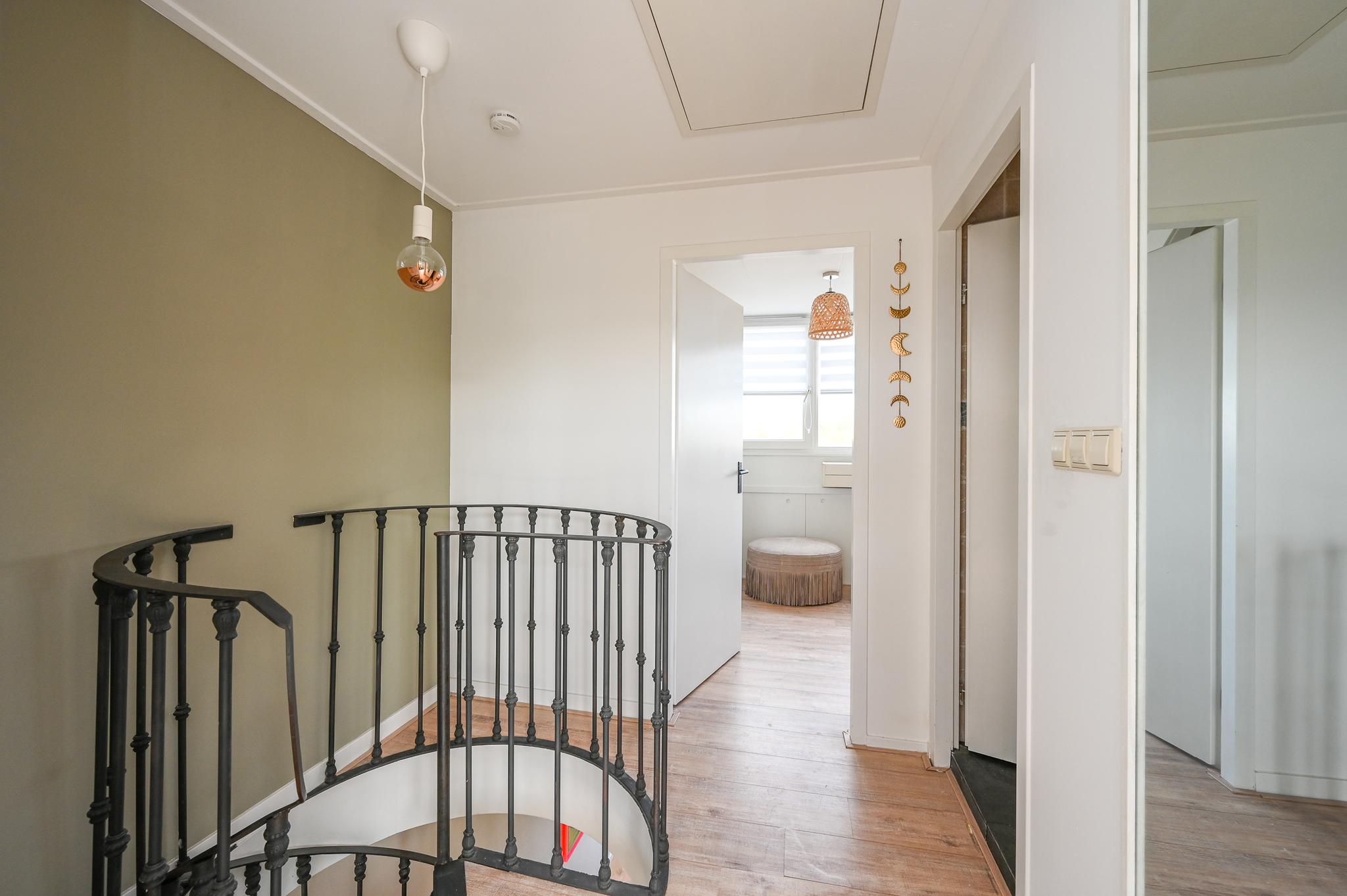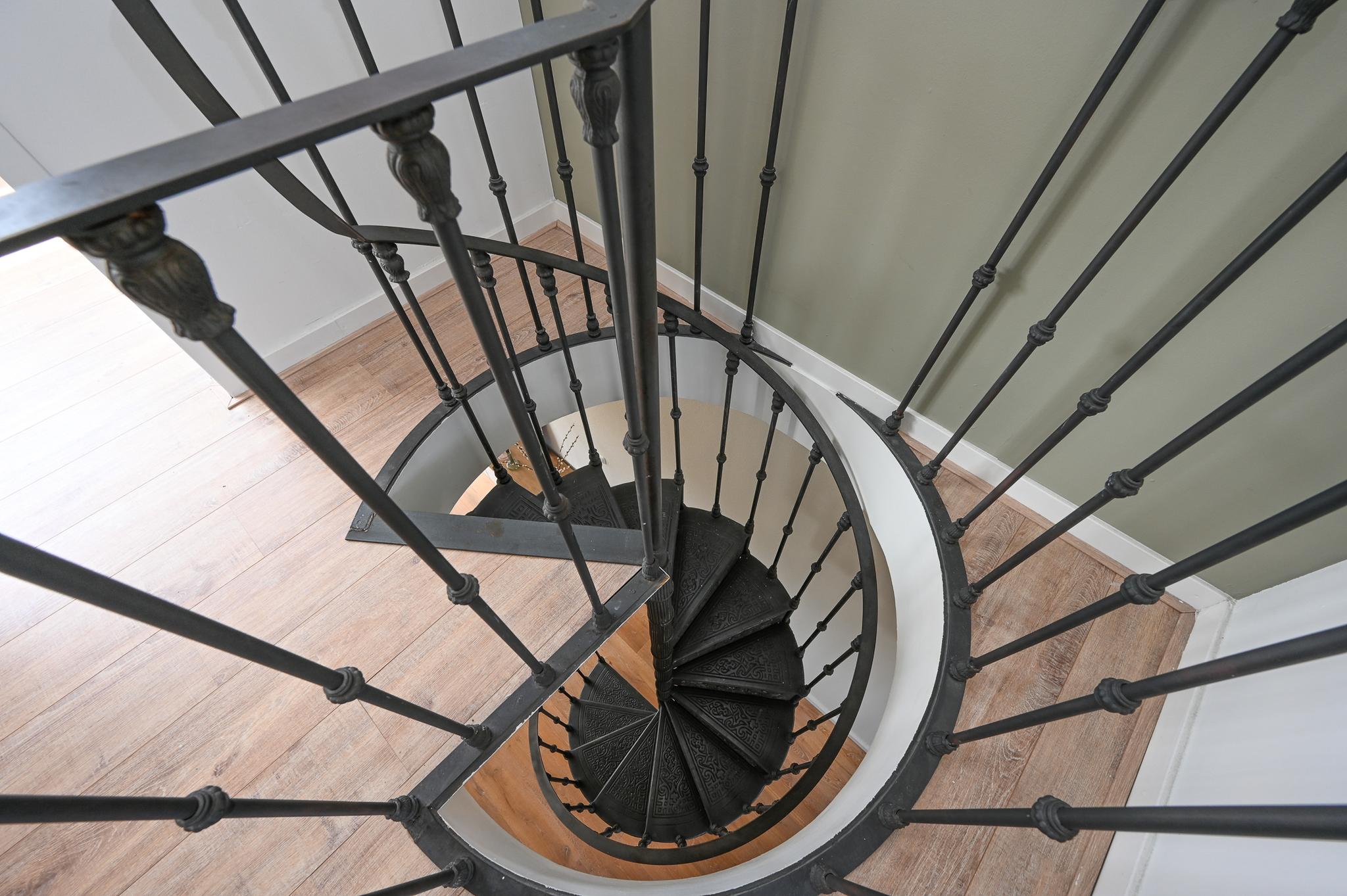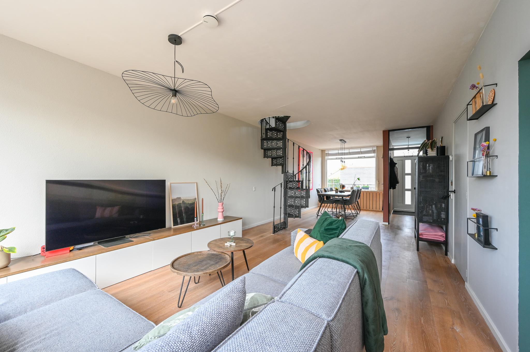 Het zitgedeelte biedt genoeg ruimte voor een comfortabele bank, met een fraaie opstelling richting het terras. Aan de voorzijde van de woning is er plek voor een royale eethoek – perfect voor gezellige diners of spelletjesavonden. De eyecatcher van dit huis is de stijlvolle wenteltrap. Deze biedt toegang tot de slaap verdieping.