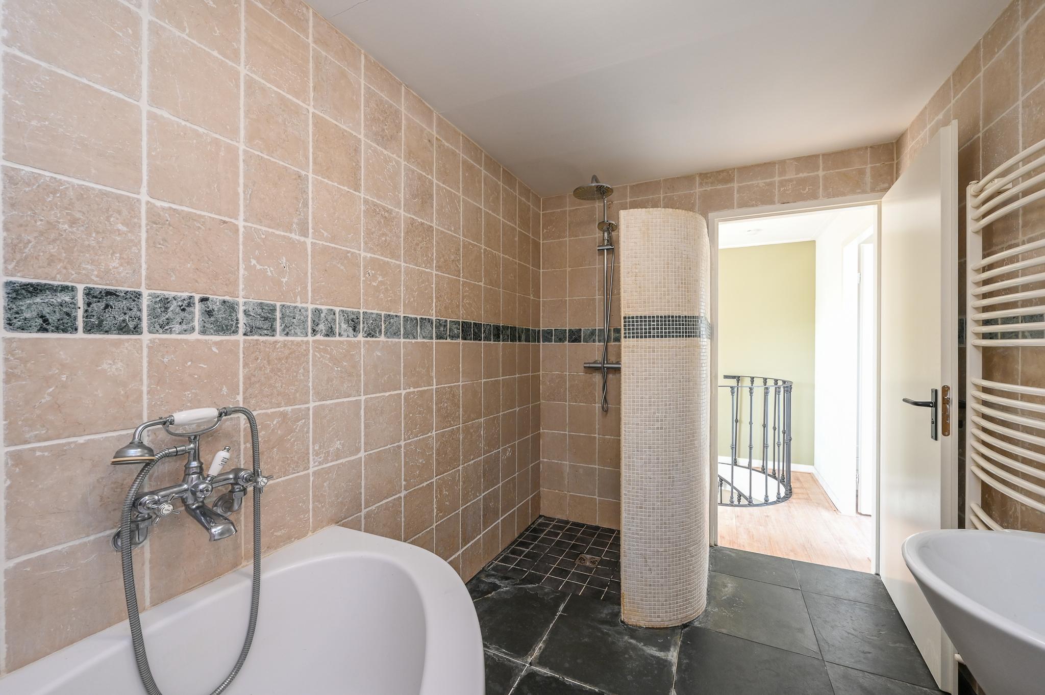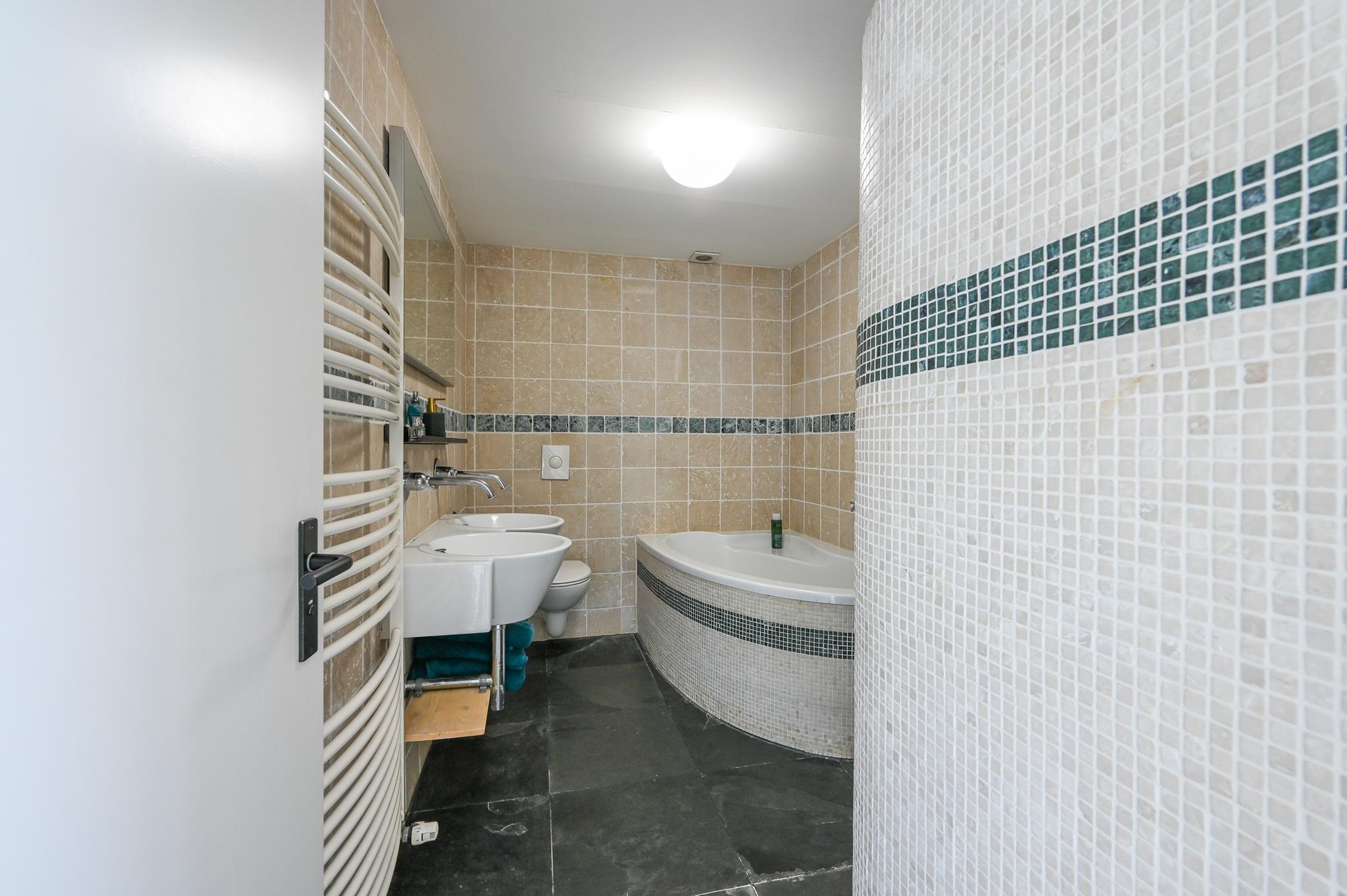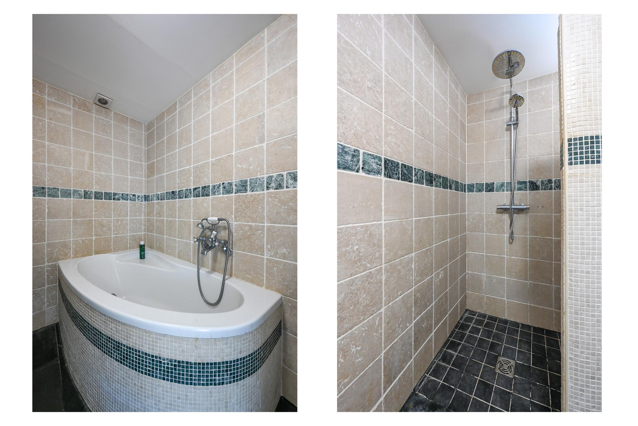 De badkamer is netjes onderhouden en volledig uitgerust met een ligbad, een inloopdouche, een wastafel en een tweede toilet – praktisch, ruim en comfortabel.