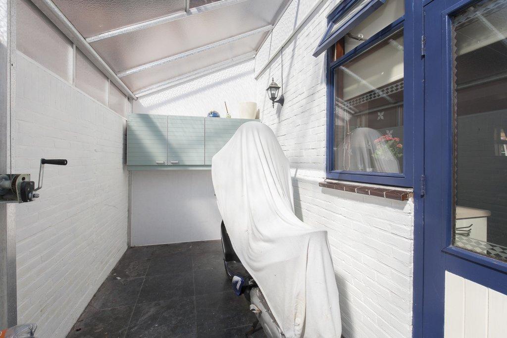 Entree met hal, garderobe en meterkast. De heerlijk lichte woonkamer bevindt zich aan de voorzijde en beschikt over twee grote ramen met authentieke glas-in-loodramen, waardoor er veel natuurlijk licht binnenvalt. De vloer is afgewerkt met lichte plavuizen en voorzien van comfortabele vloerverwarming. De wanden zijn in neutrale tinten uitgevoerd en voorzien van lambrisering. De royale open keuken in hoekopstelling is uitgerust met een 5-pits gasfornuis met RVS-afzuigkap, een combimagnetron en een vaatwasmachine. Aangrenzend bevinden zich twee praktische inbouwkasten met onder andere de opstelplaats voor wasmachine, droger en cv-ketel (2017). Vanuit de keuken is er toegang tot de met glas overdekte berging. Vanuit hier biedt een schuifdeur (via de buren) toegang tot de achterom/poort.