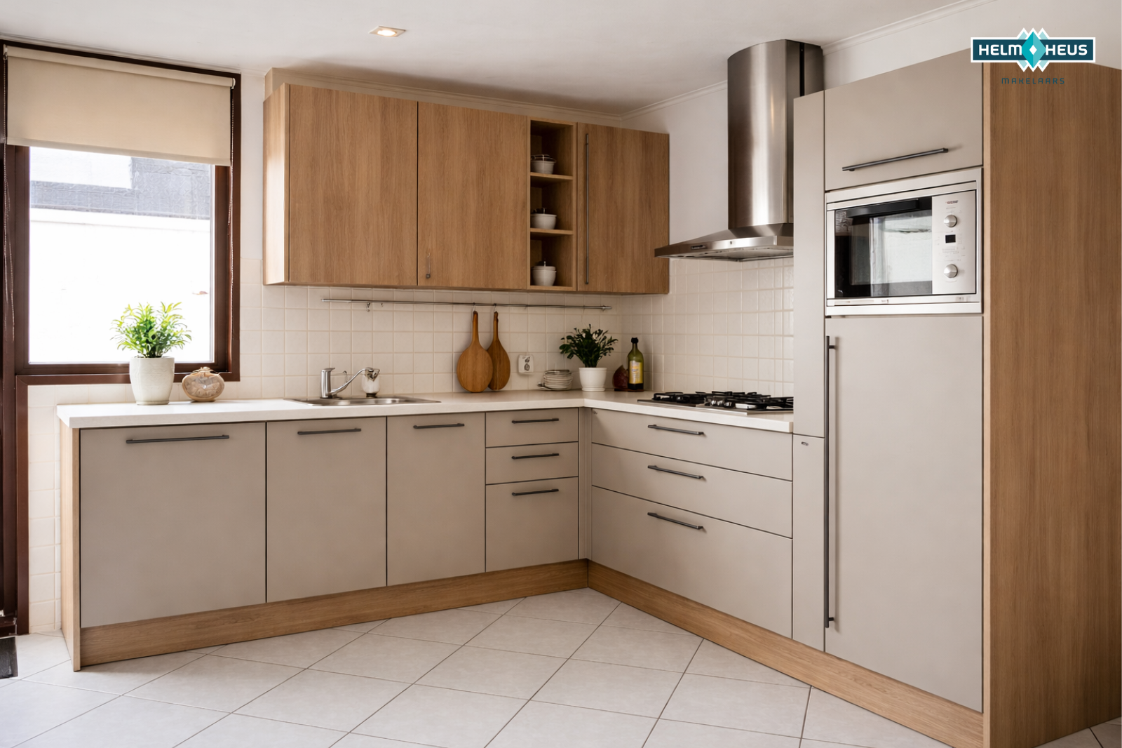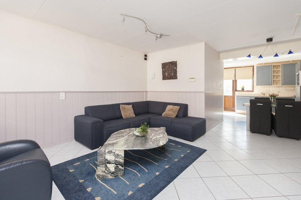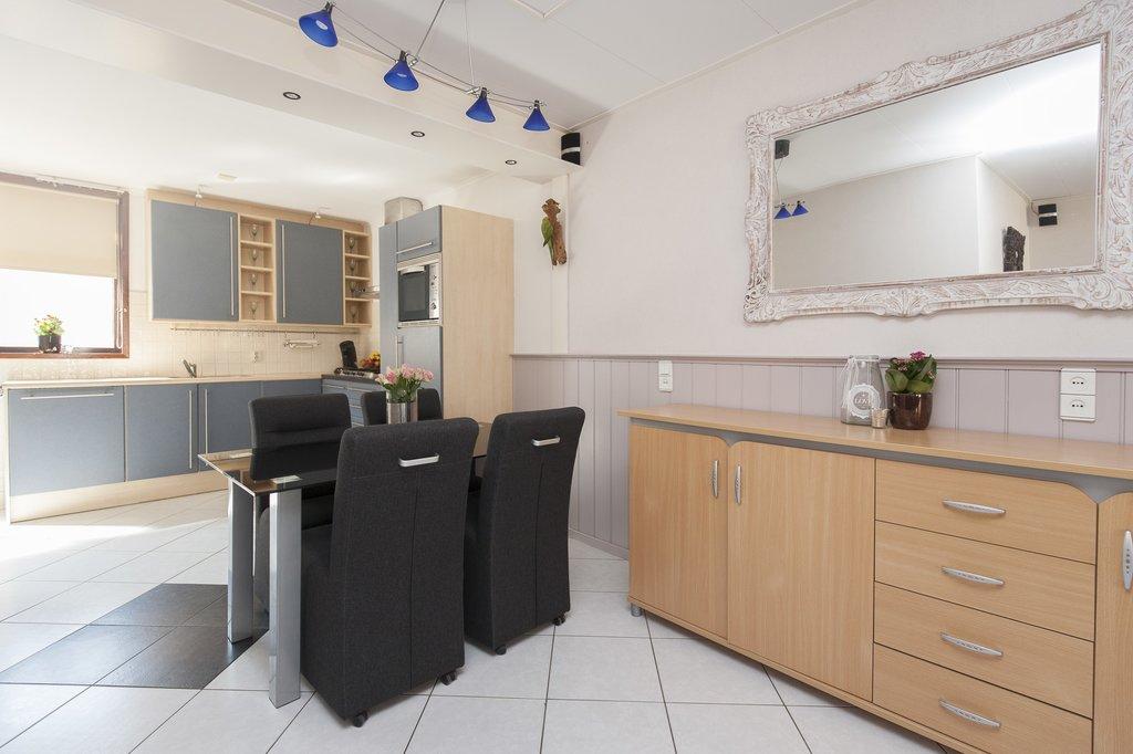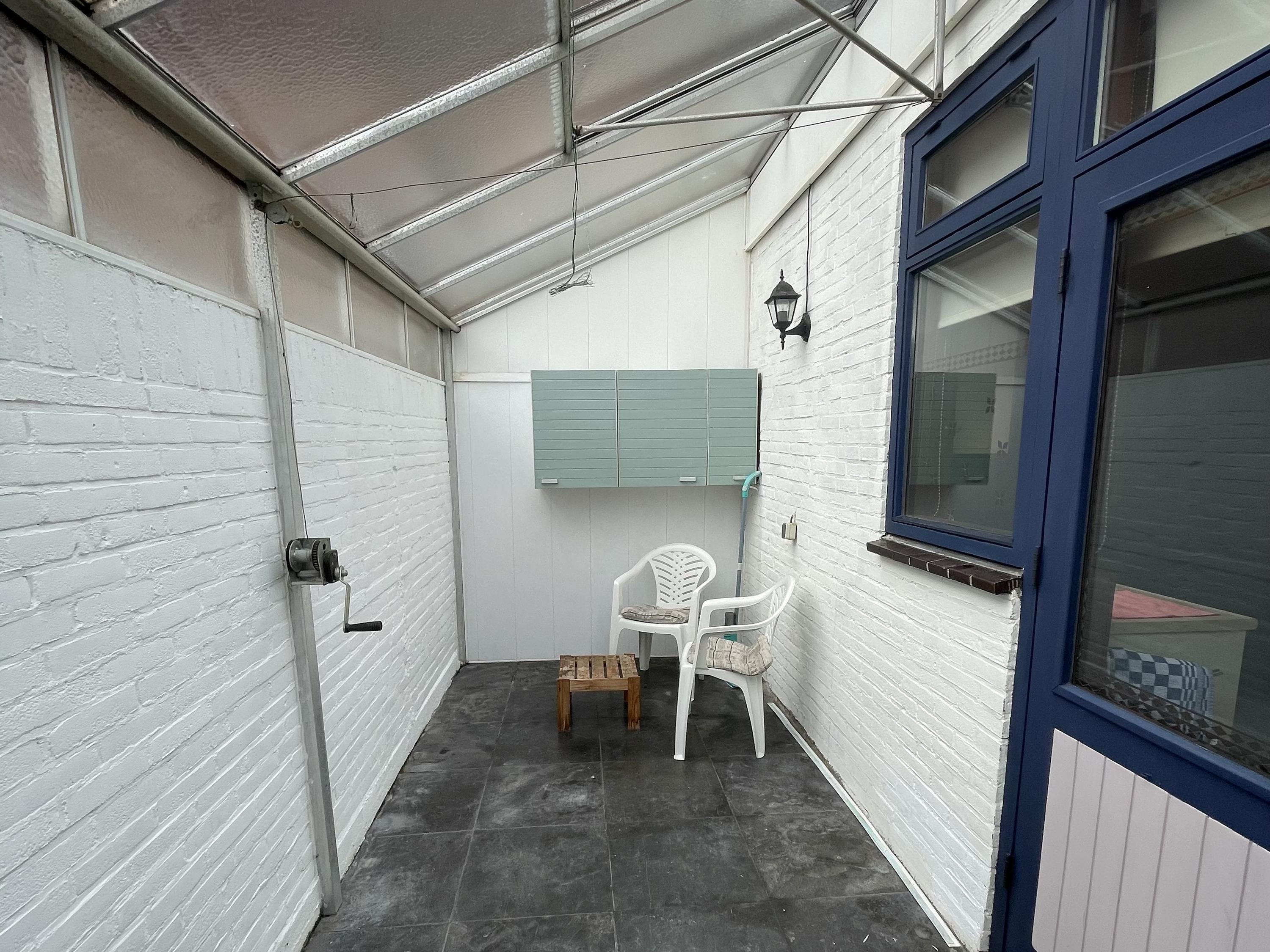Entree met hal, garderobe en meterkast. De heerlijk lichte woonkamer bevindt zich aan de voorzijde en beschikt over twee grote ramen met authentieke glas-in-loodramen, waardoor er veel natuurlijk licht binnenvalt. De vloer is afgewerkt met lichte plavuizen en voorzien van comfortabele vloerverwarming. De wanden zijn in neutrale tinten uitgevoerd en voorzien van lambrisering. De royale open keuken in hoekopstelling is uitgerust met een 5-pits gasfornuis met RVS-afzuigkap, een combimagnetron en een vaatwasmachine. Aangrenzend bevinden zich twee praktische inbouwkasten met onder andere de opstelplaats voor wasmachine, droger en cv-ketel (2017). Vanuit de keuken is er toegang tot de met glas overdekte berging. Vanuit hier biedt een schuifdeur (via de buren) toegang tot de achterom/poort.