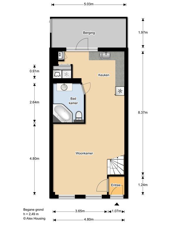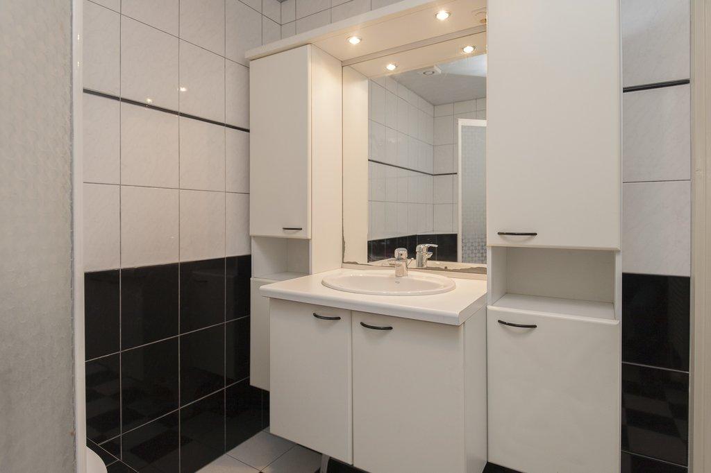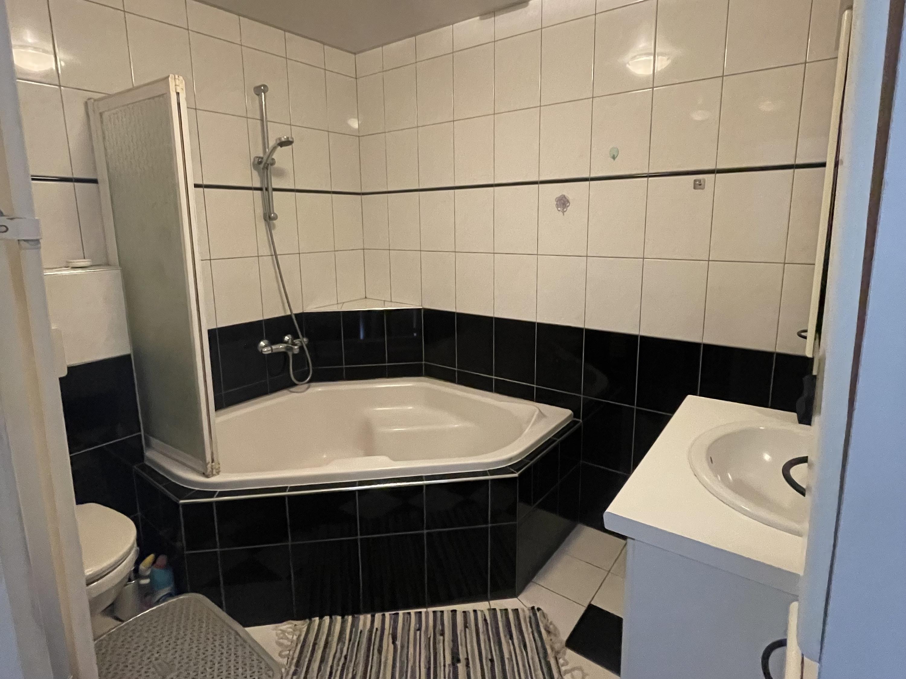 De badkamer is volledig betegeld in een zwart-wit kleurstelling en biedt alles wat je nodig hebt. Er is een hoekbad met douchegelegenheid, voorzien van een praktische douchewand. Verder vind je hier een toilet en een modern wastafelmeubel met veel kastruimte en ingebouwde verlichting. Via een vaste trap in de woonkamer is de eerste verdieping bereikbaar.