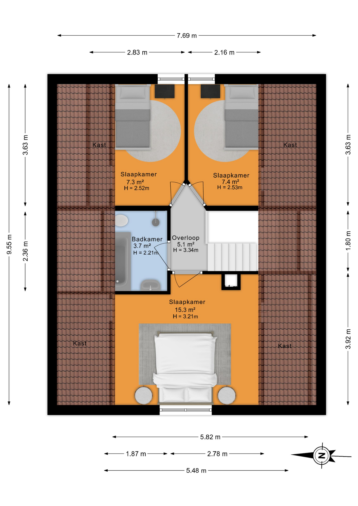 Boven bevinden zich drie slaapkamers, elk met handige bergruimte achter de knieschotten. De badkamer is functioneel uitgevoerd met een ligbad, douche en toilet.