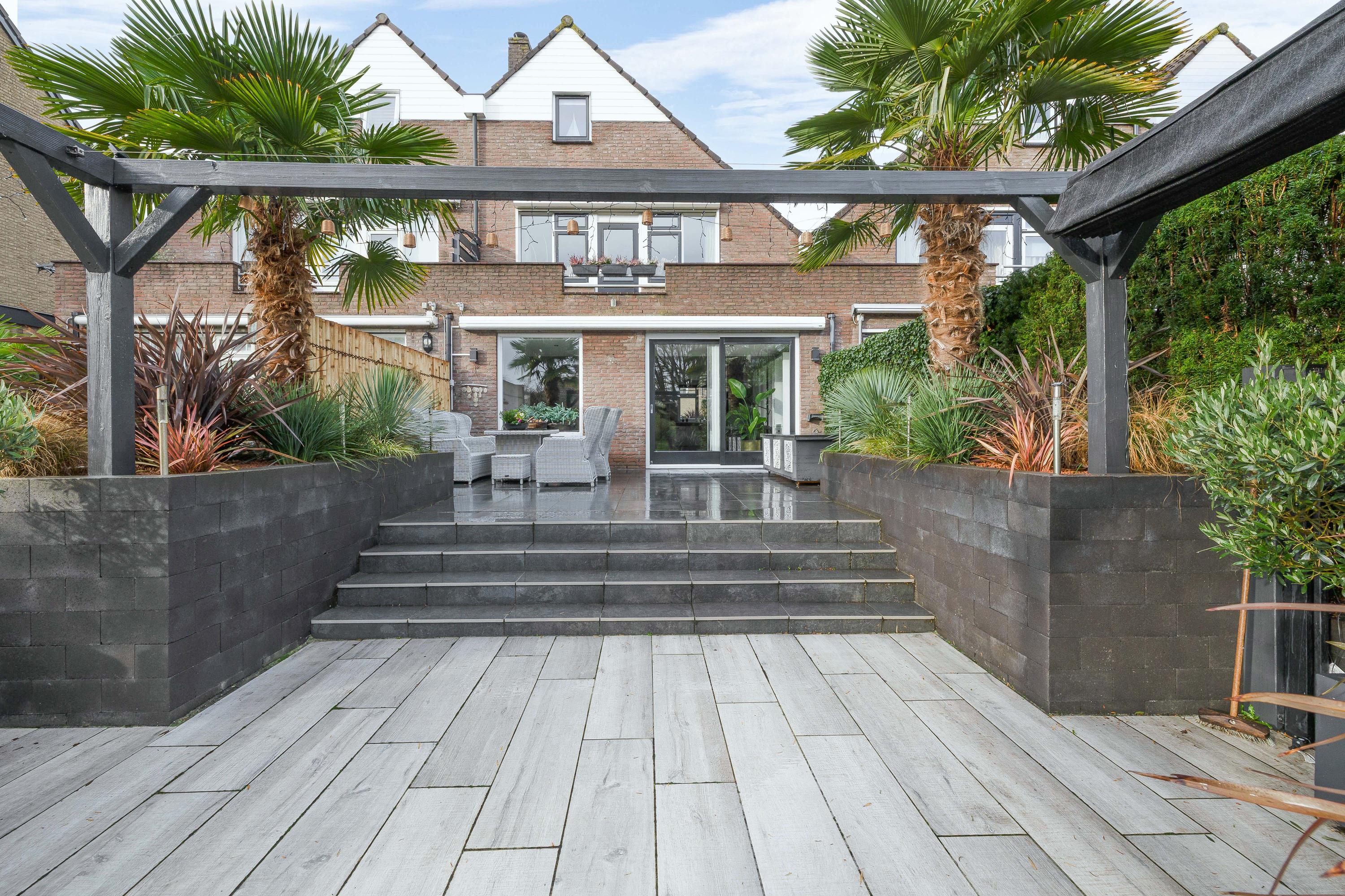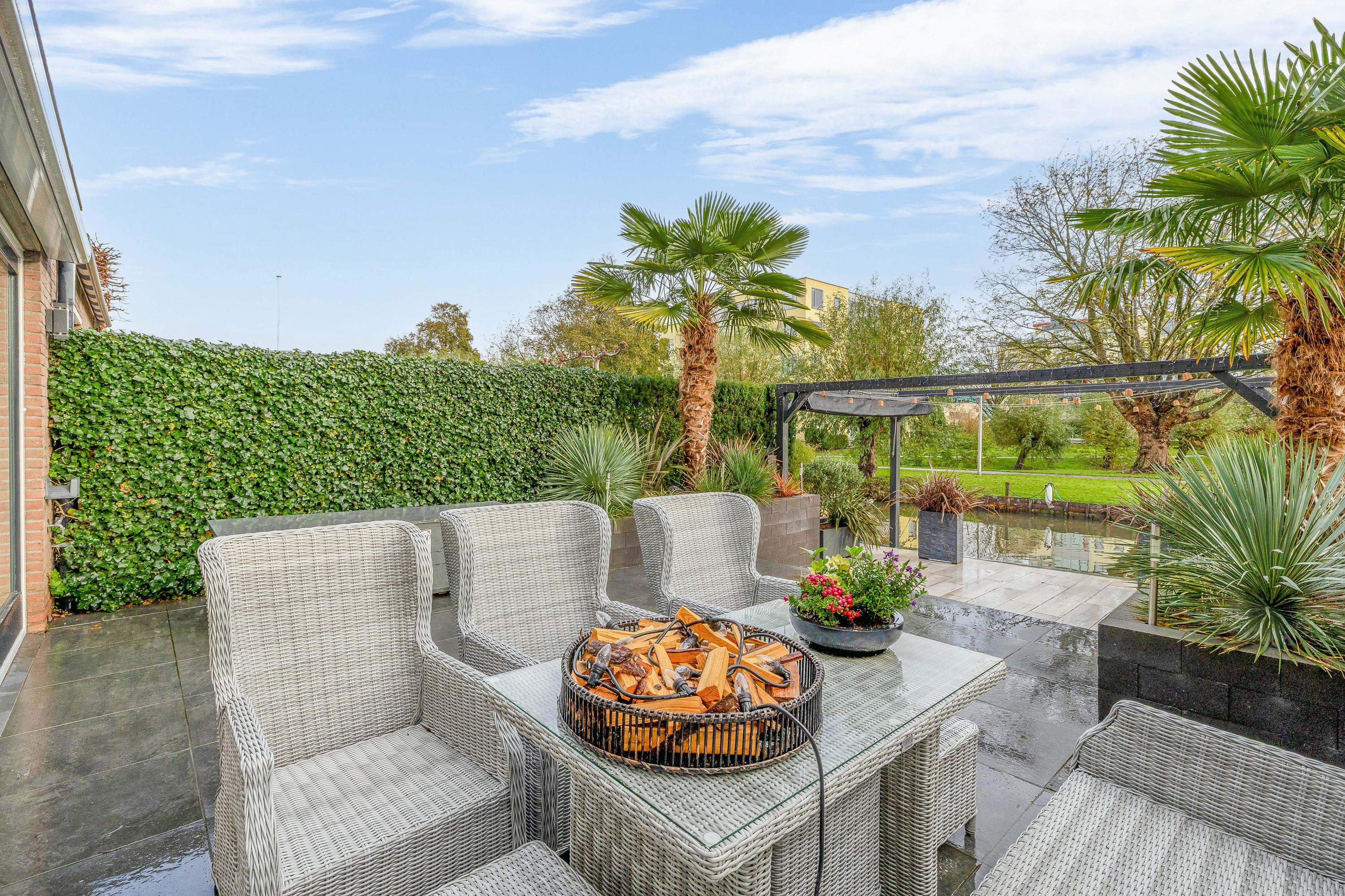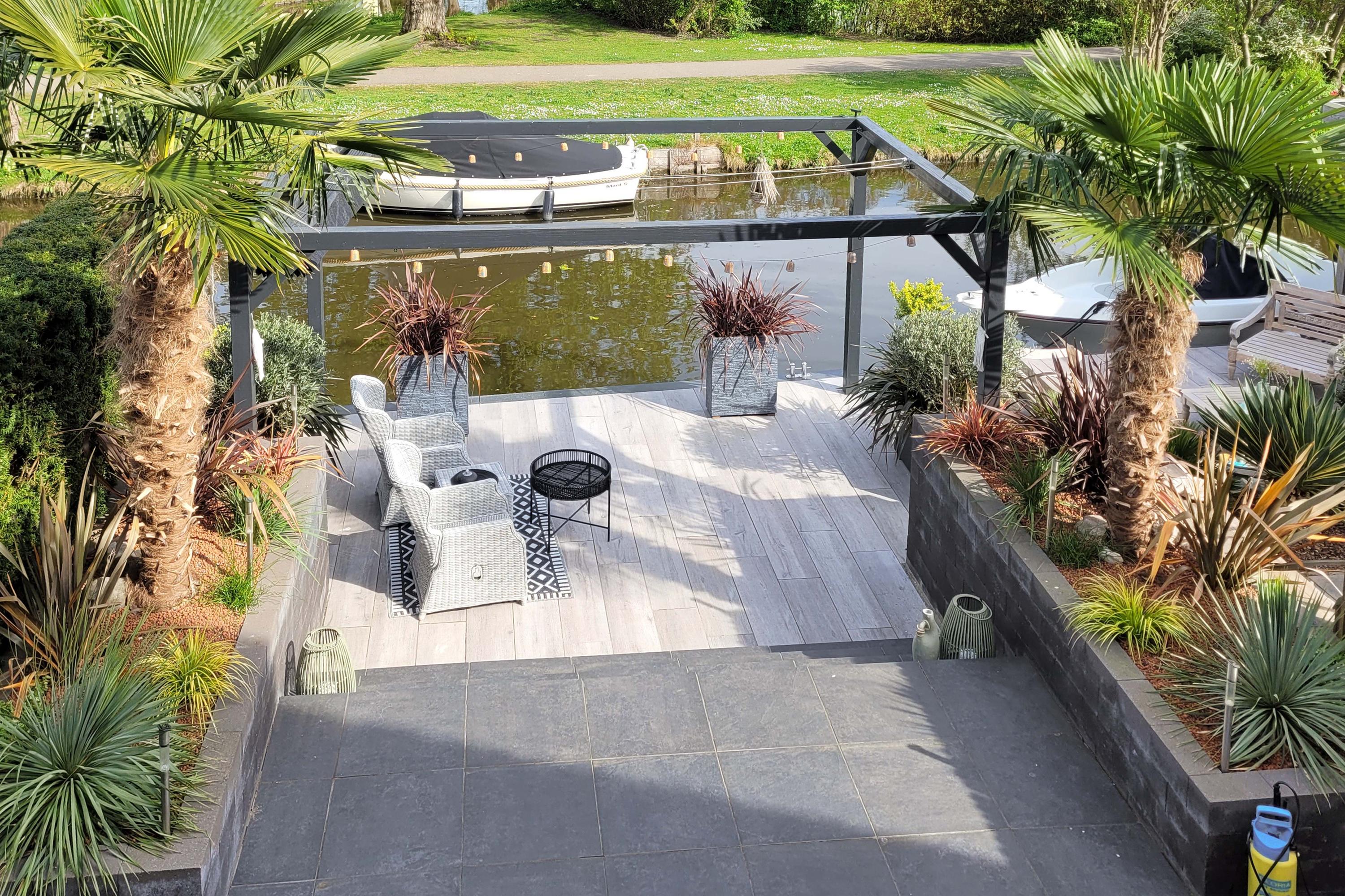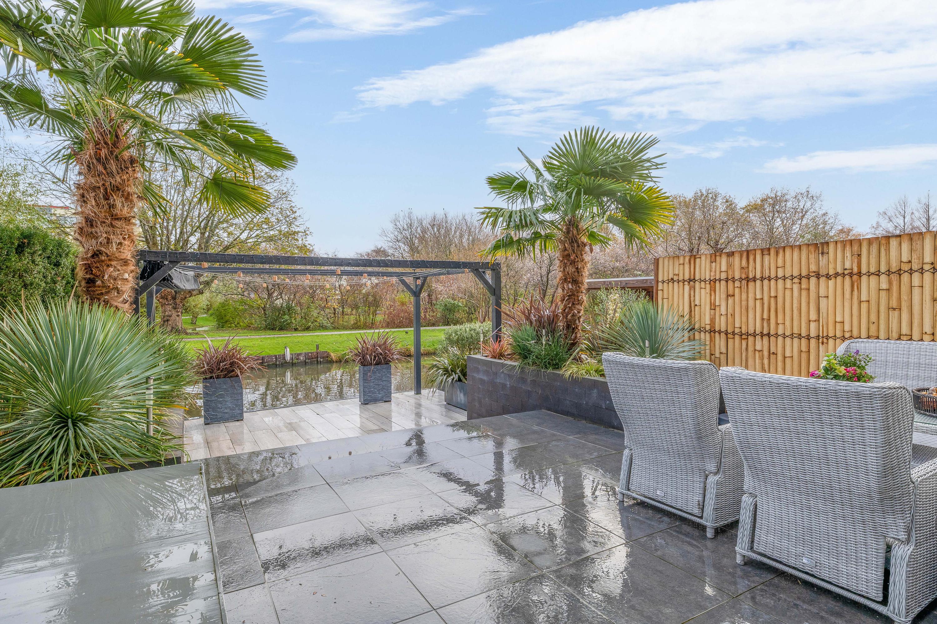 De achtertuin is puur genieten: luxe bestrating, tropische beplanting, diverse zitplekken en een ligging direct aan het water maken dit een unieke buitenruimte waarin dagelijks ontspannen vanzelf gaat. De voortuin is eveneens verzorgd aangelegd en sluit perfect aan op de uitstraling van de woning.