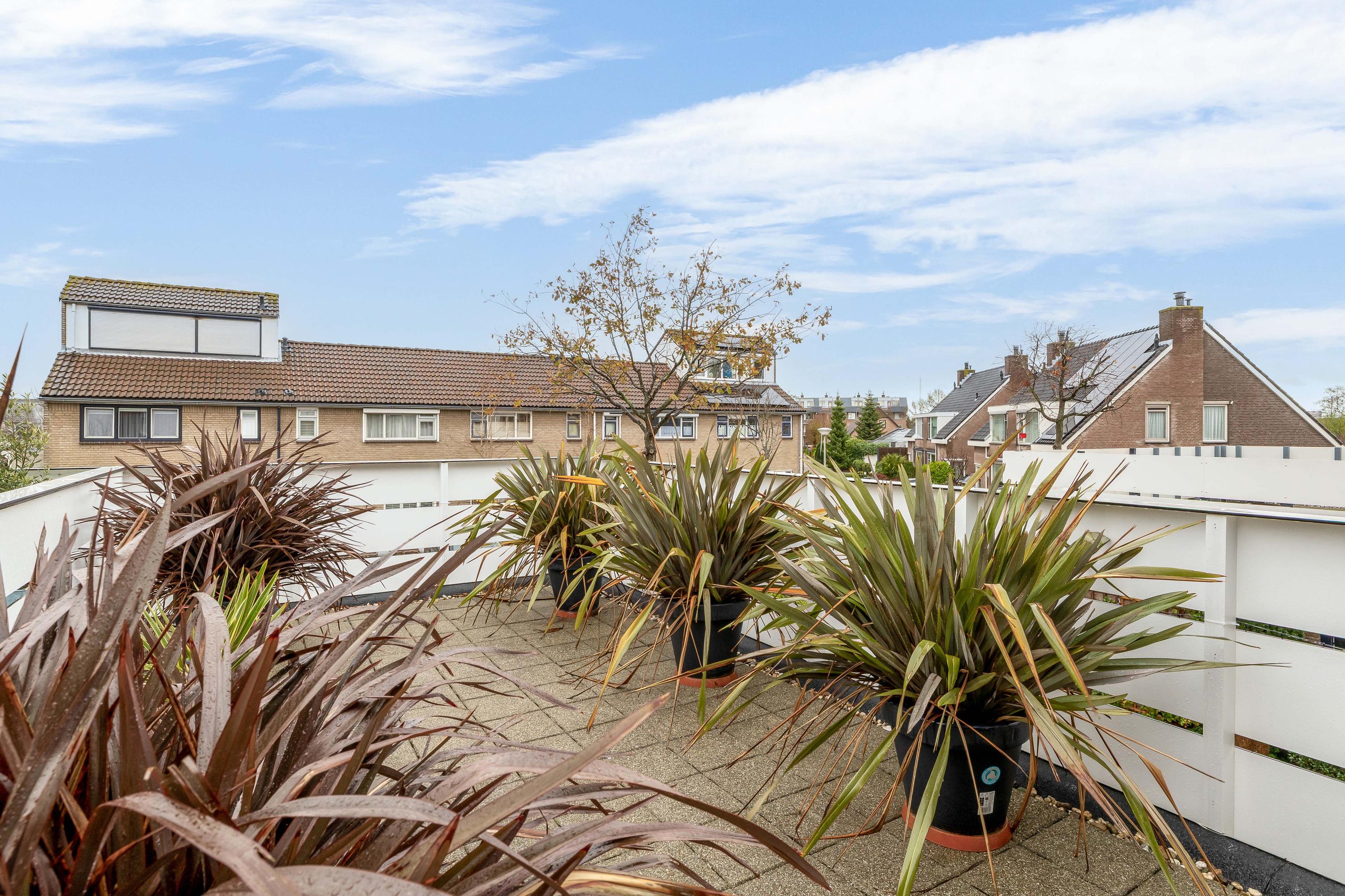 Aan beide zijden zijn buitenruimtes: een balkon aan de achterzijde en een ruim dakterras aan de voorzijde.
