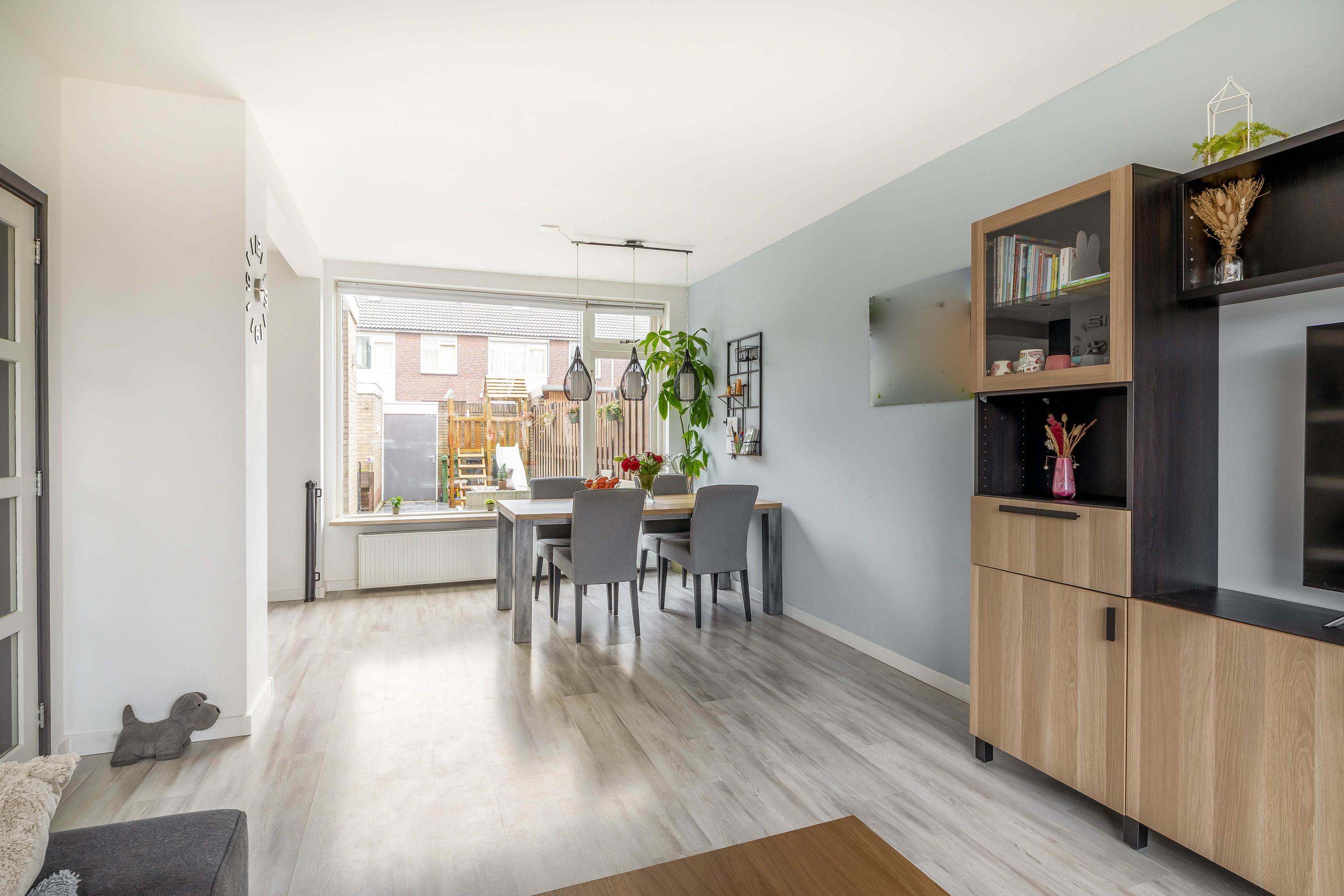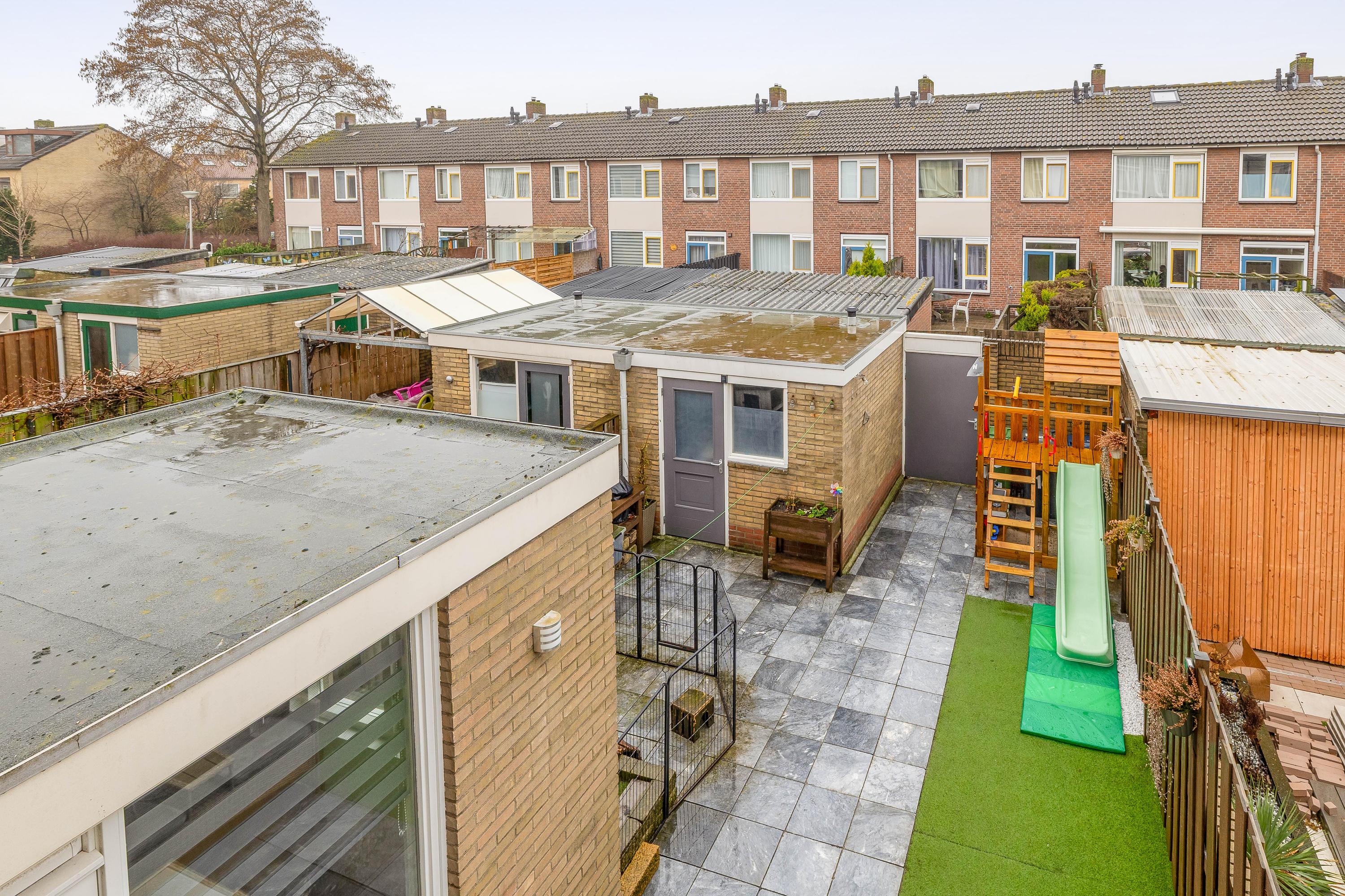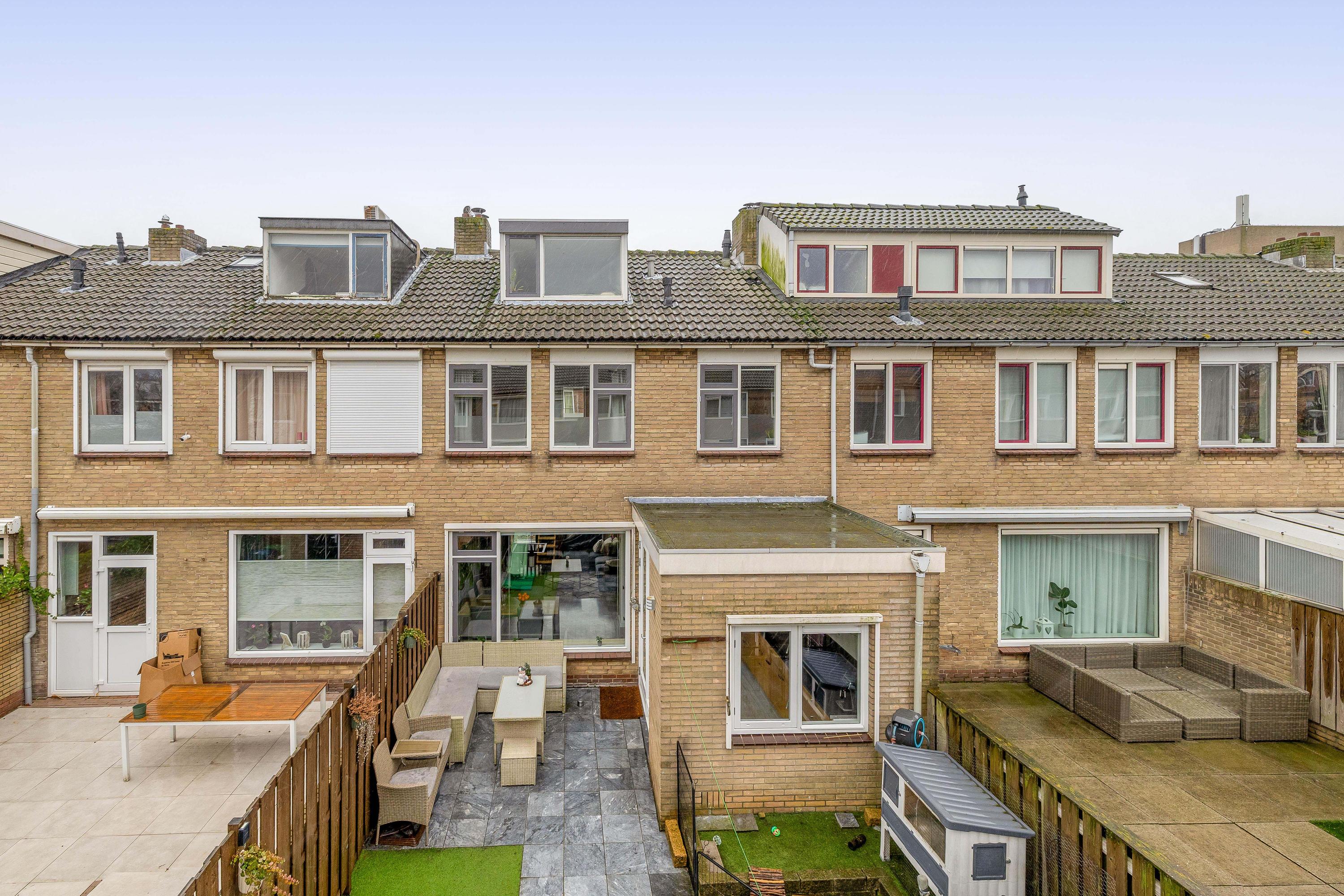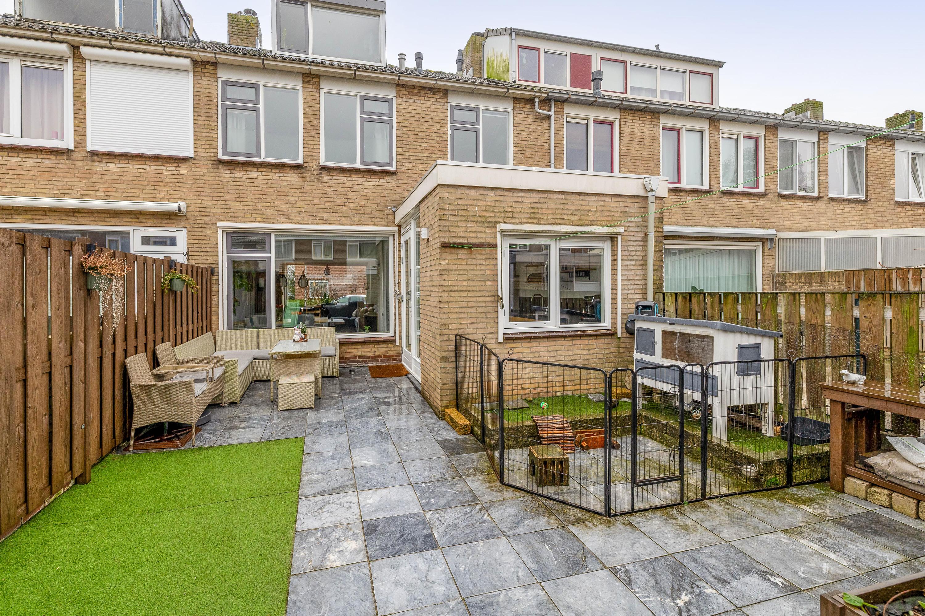 De achtertuin is een fijne plek om te ontspannen en te genieten van het buitenleven. Er is voldoende ruimte voor een terras, speelplek en groen. Extra prettig is de directe achterom: zodra je de poort uitloopt, kunnen kinderen meteen spelen. De voortuin zorgt daarnaast voor een prettige afstand tot de straat.