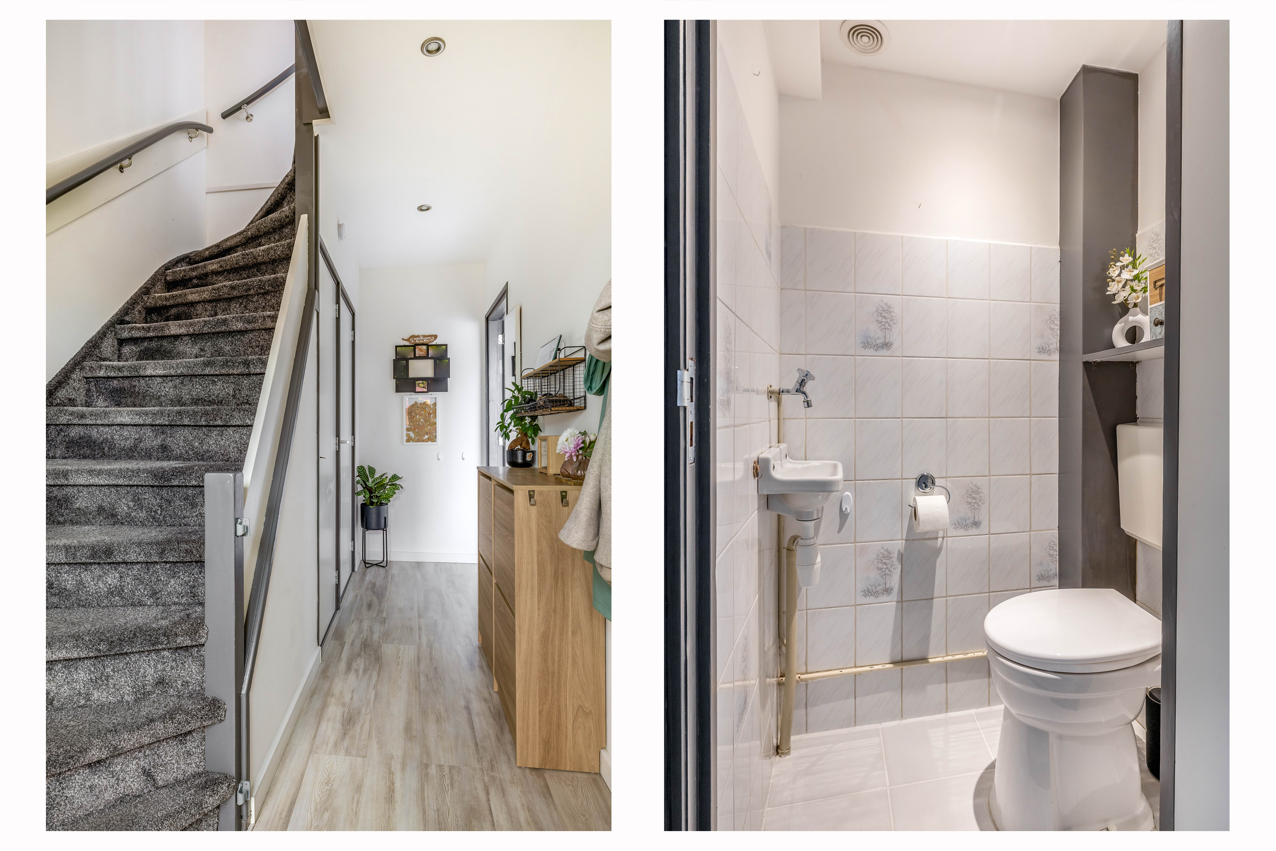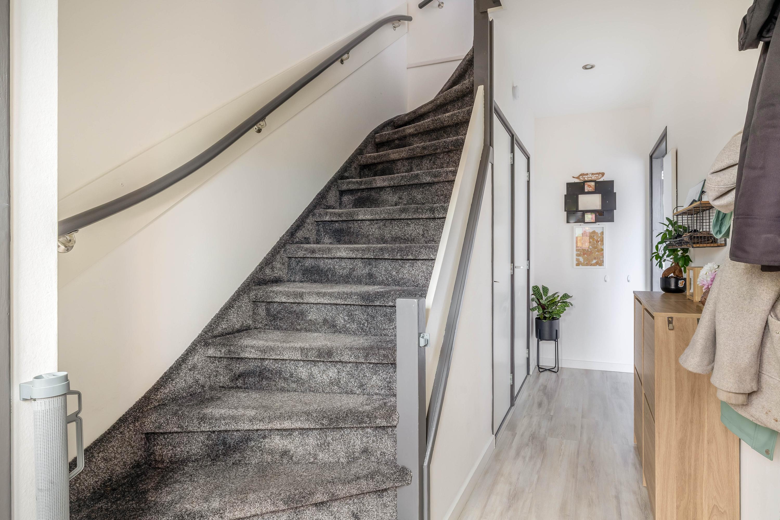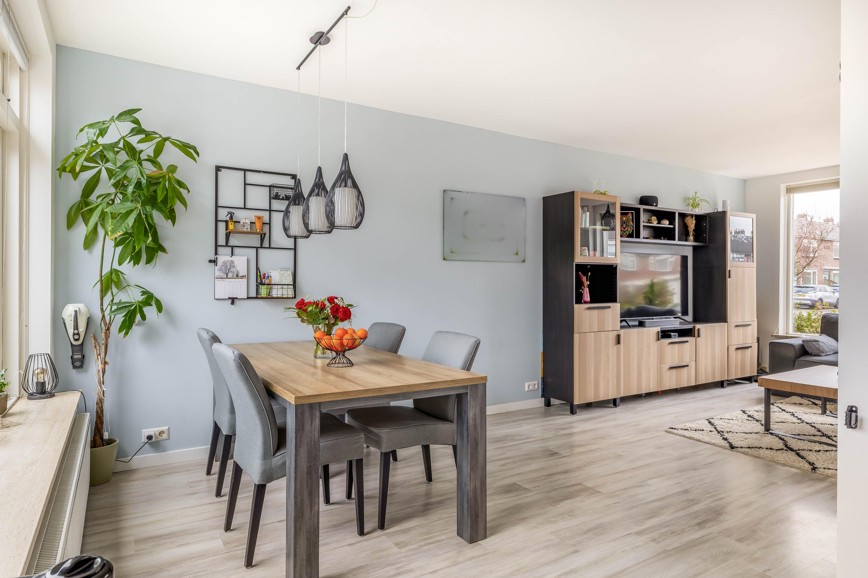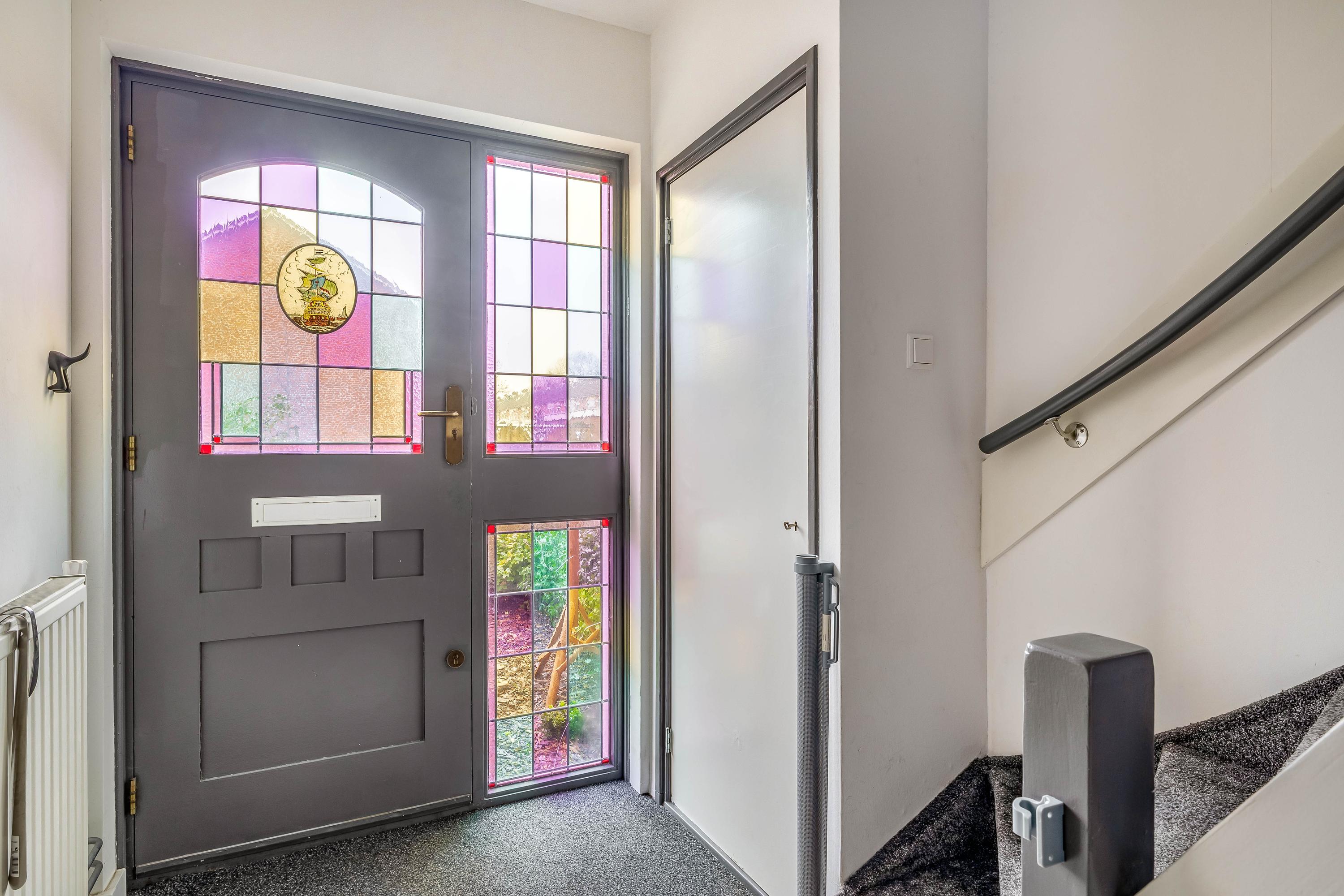 Via de voortuin kom je binnen in de hal met meterkast, praktische kast en het toilet. Vanuit hier loop je door naar de woonkamer.