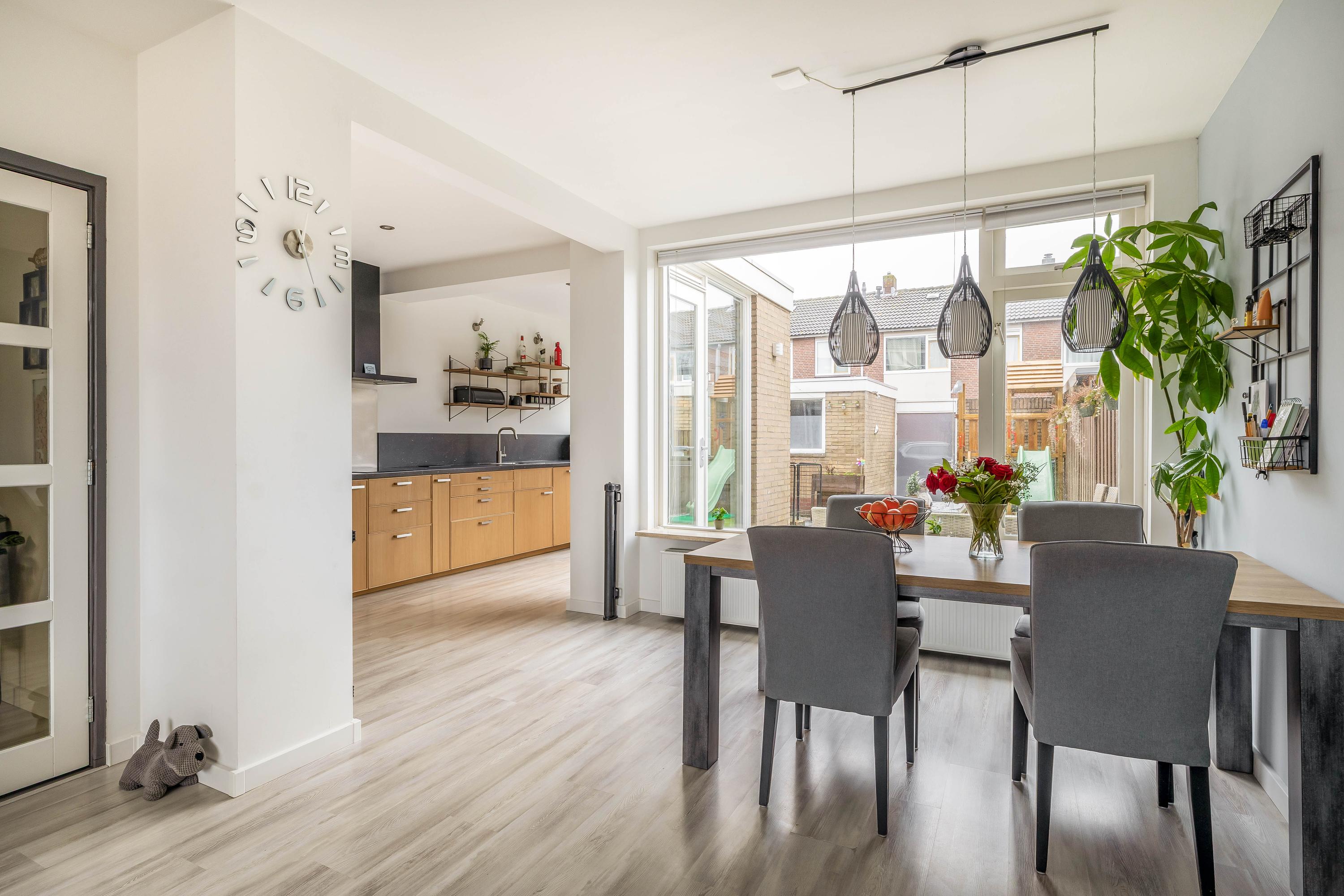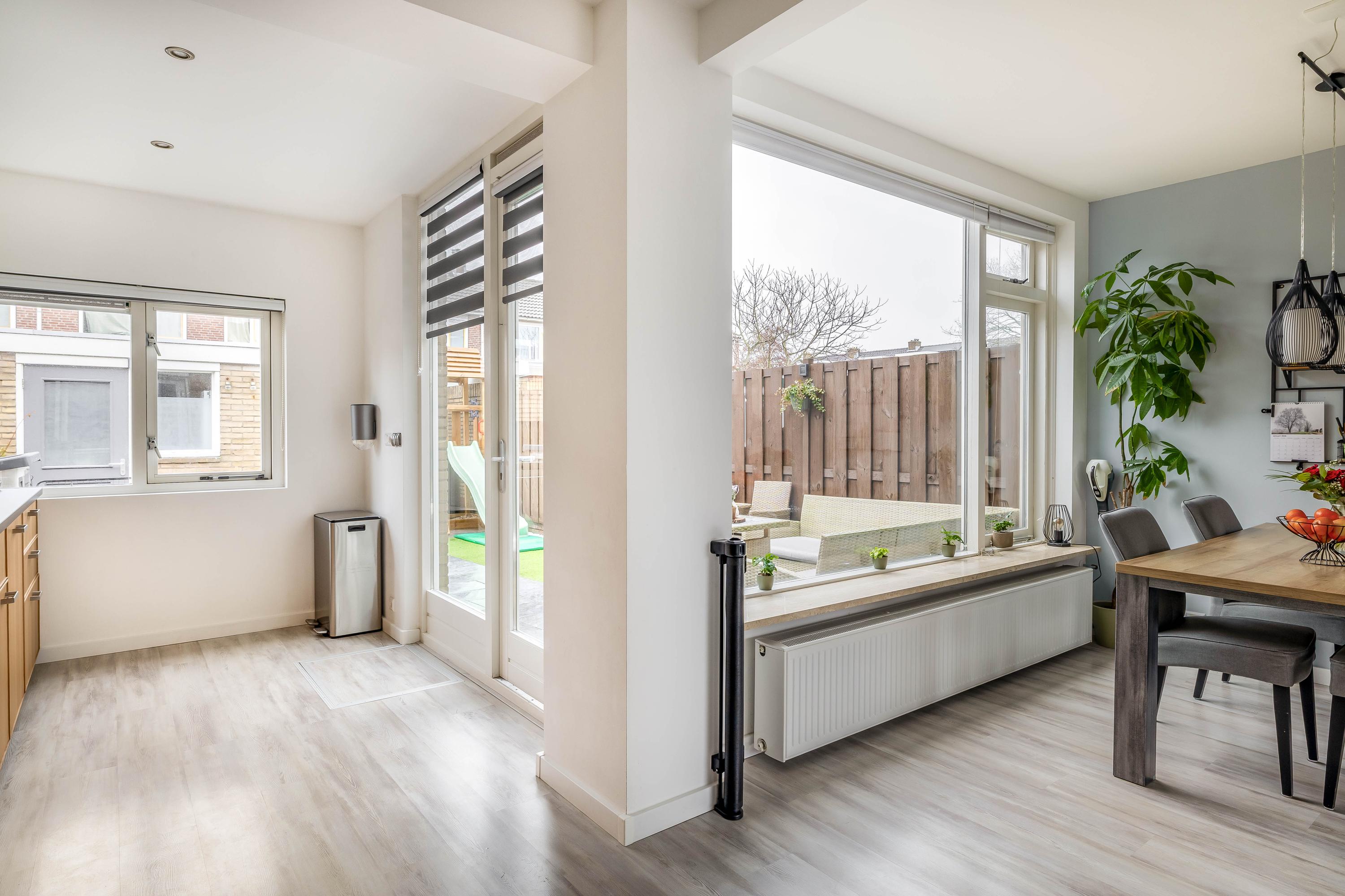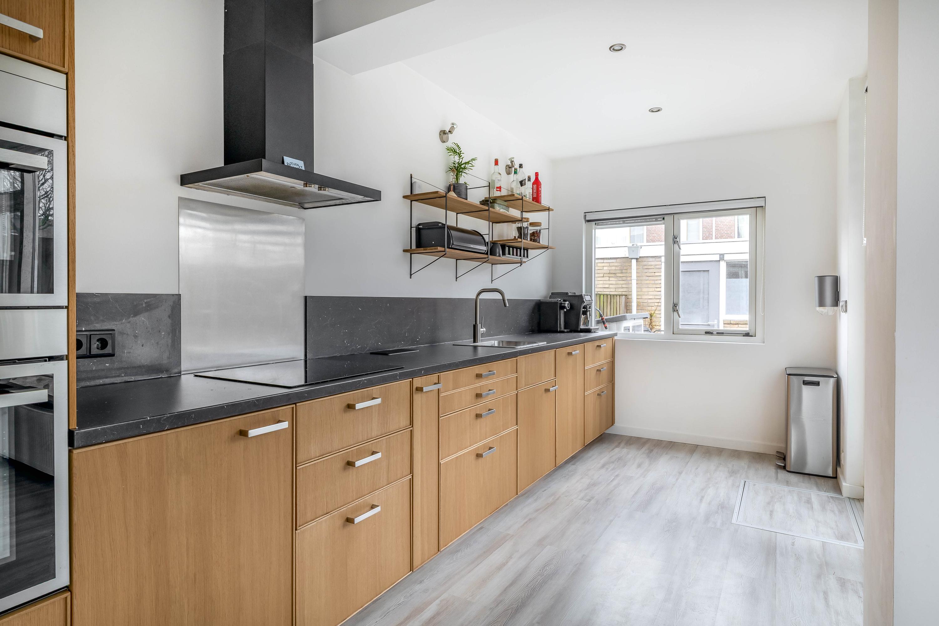 De keuken is strak en praktisch ingericht met veel werk- en kastruimte en diverse inbouwapparatuur. Dankzij de grote raampartijen aan de achterzijde, onder andere bij de eethoek en bijkeuken, wordt de tuin echt bij de woning betrokken. Binnen en buiten voelen hier als één geheel.