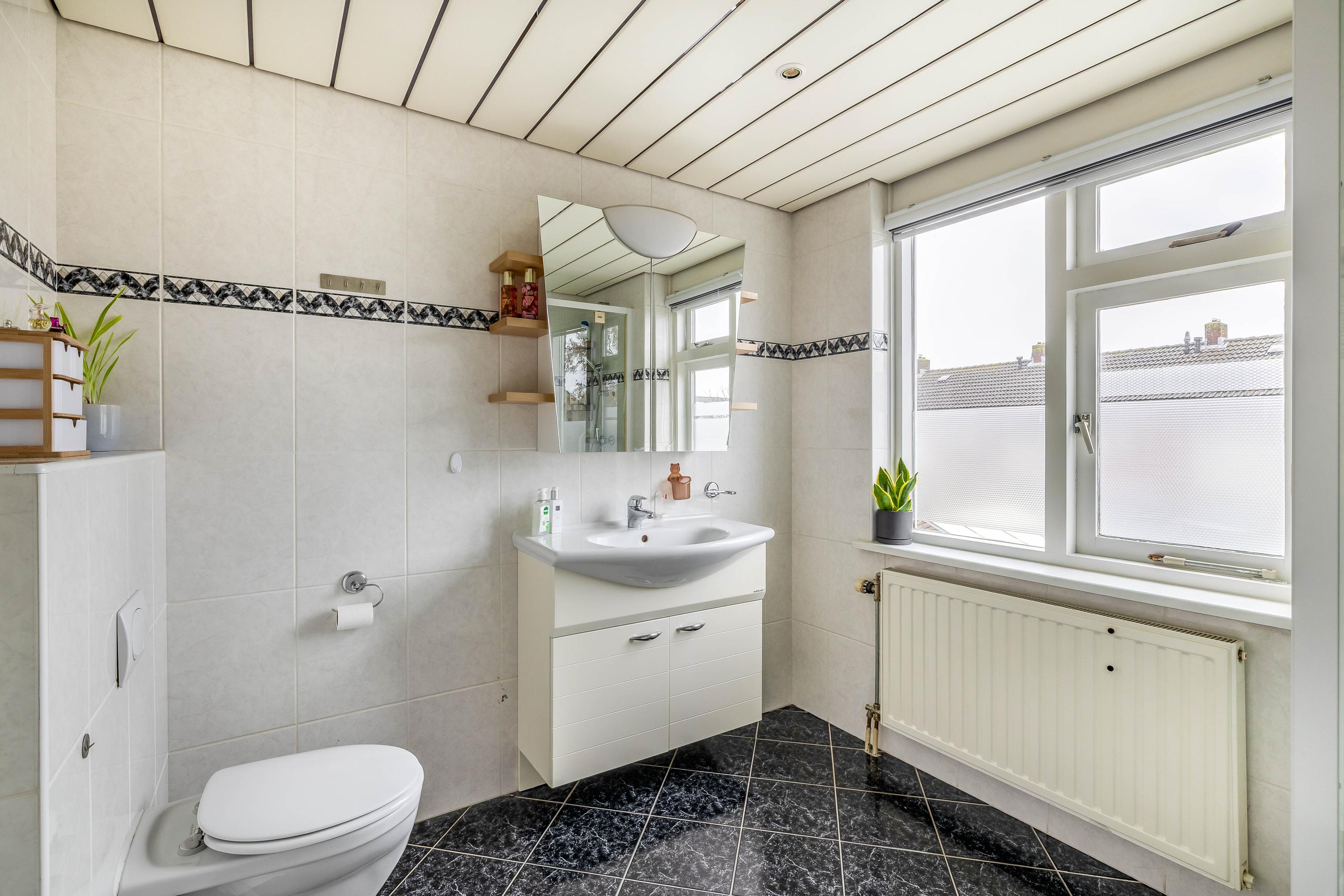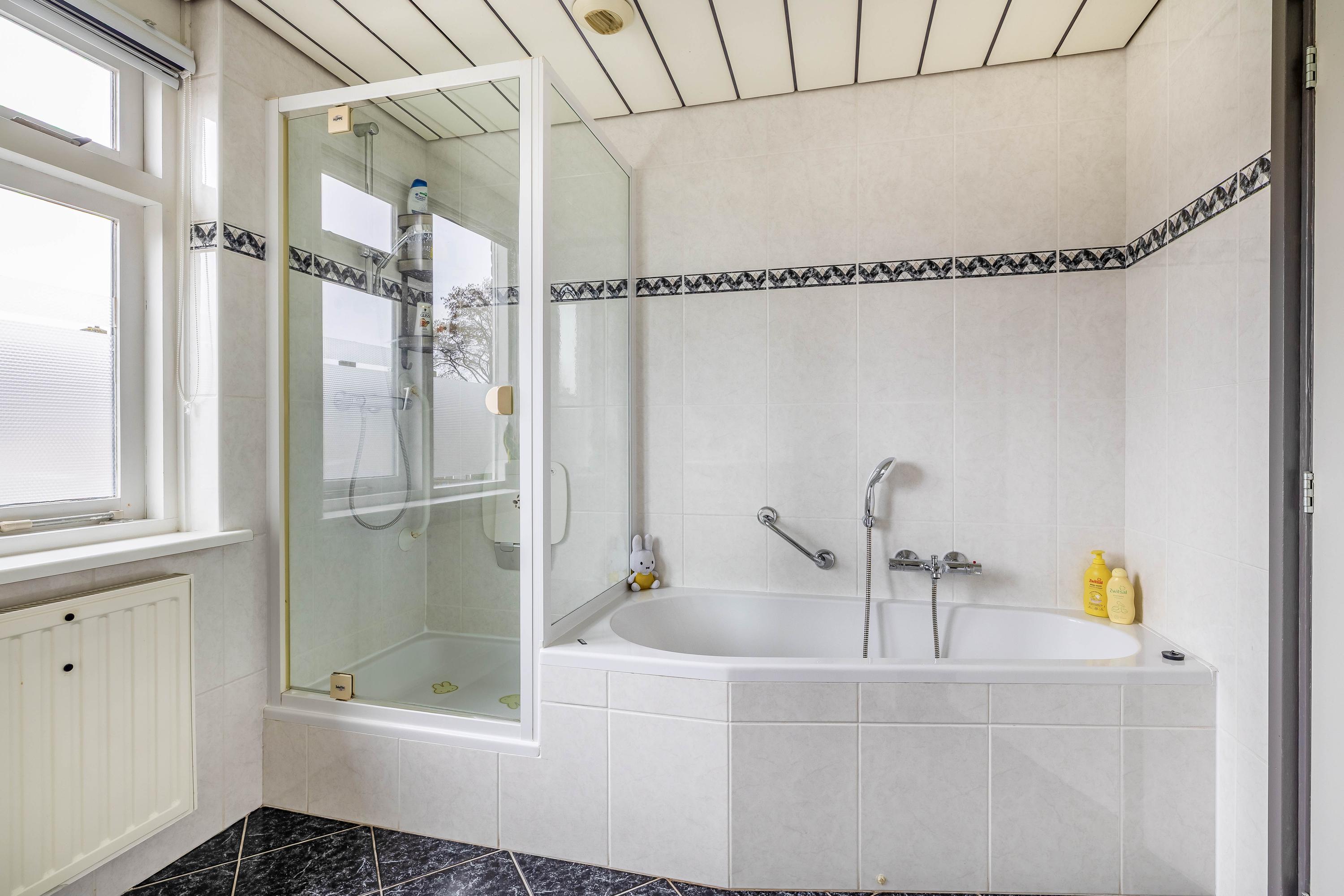 De badkamer is voor dit type woning uitzonderlijk ruim (betreft een voormalig slaapkamer) en compleet uitgevoerd met een ligbad, douche, wastafel en toilet. Een echte plus voor gezinnen en iedereen die houdt van comfort en ruimte.