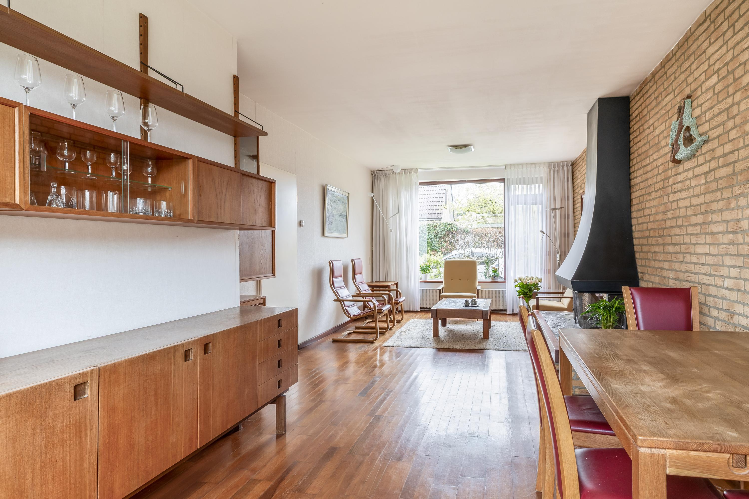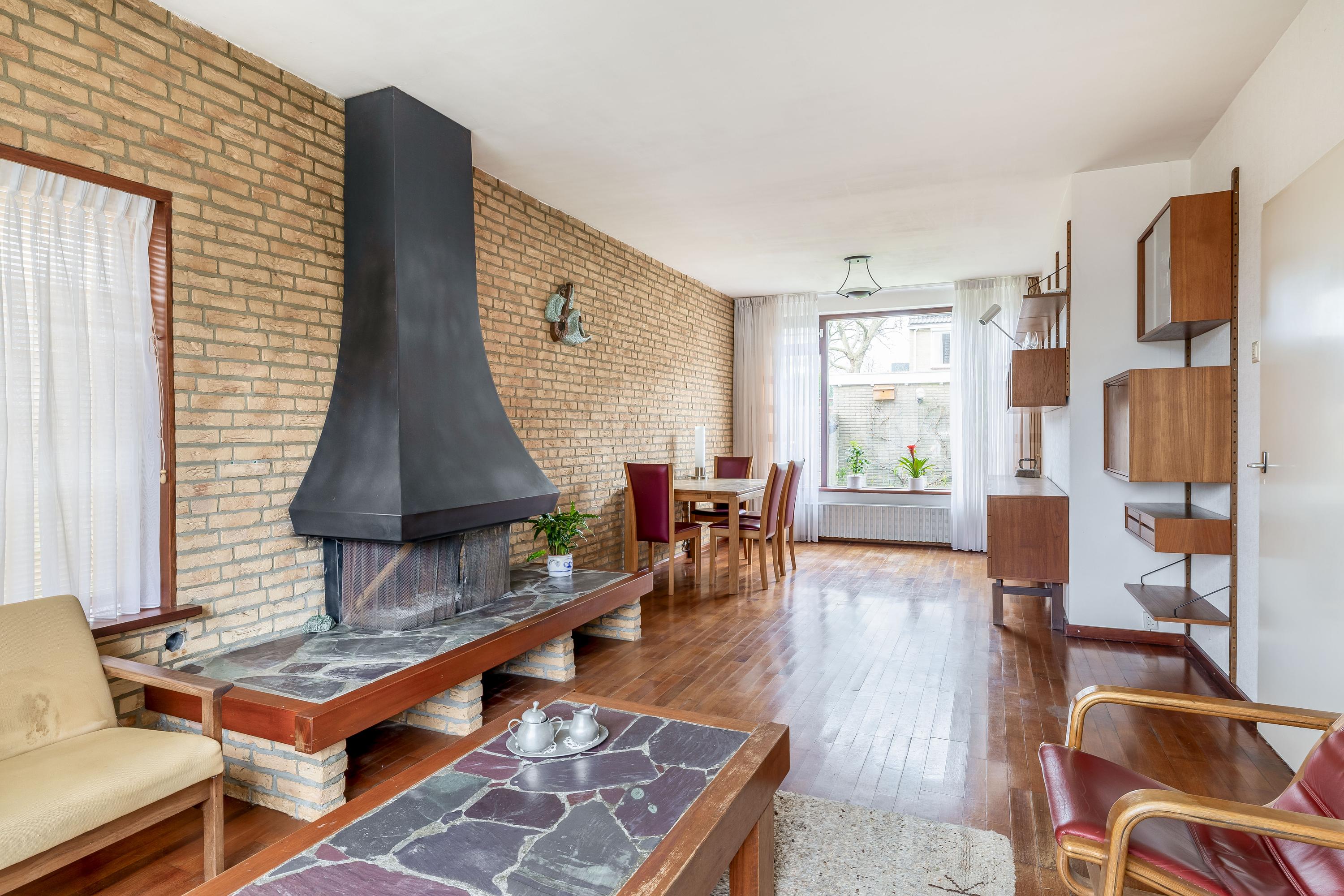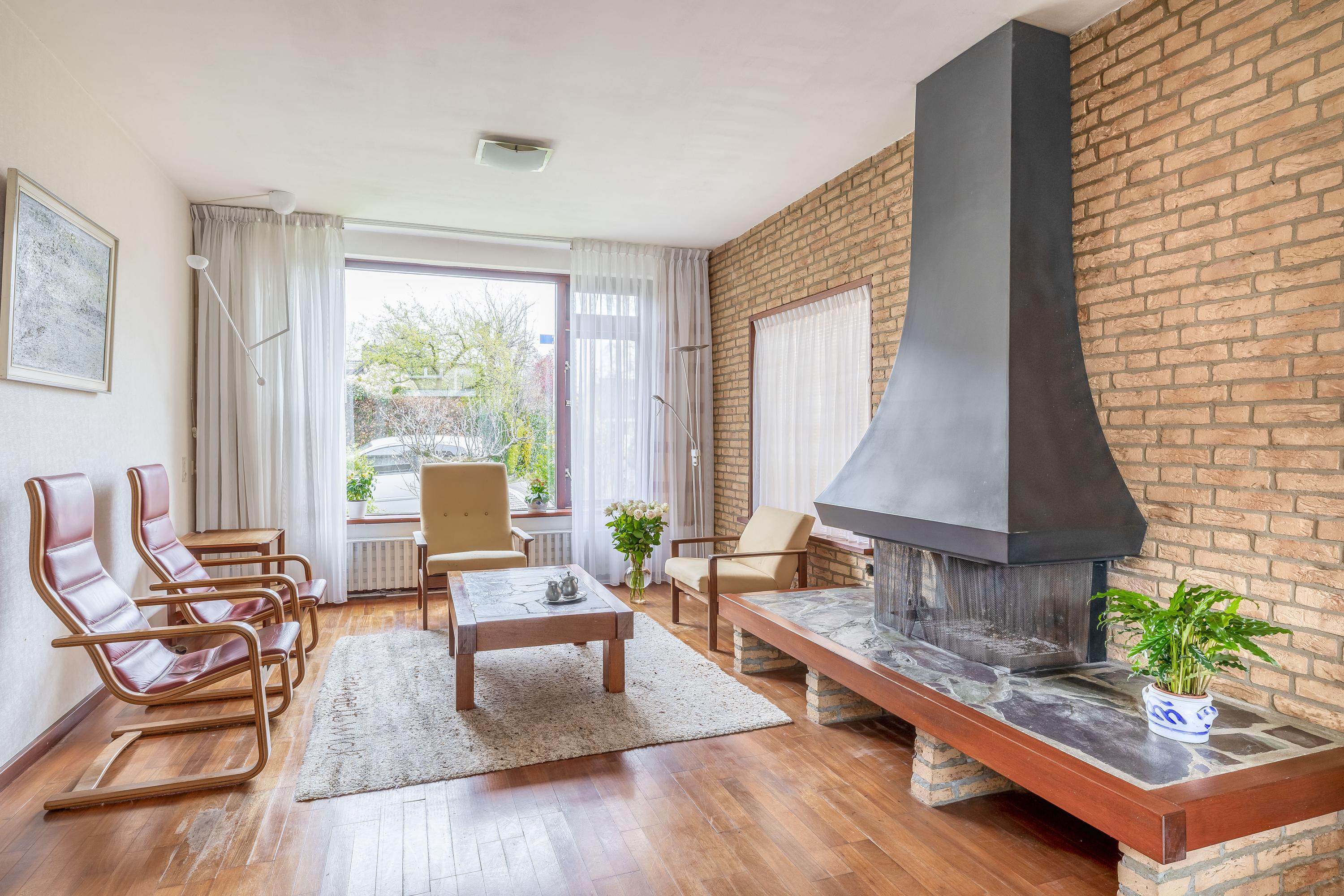 Bij binnenkomst in de woning komt u in de hal, waar zich het toilet en de meterkast bevinden. Daarnaast is er voldoende ruimte voor het creëren van een garderobe. De entree vormt een praktische en functionele binnenkomst met toegang tot de overige vertrekken van de woning. De woonkamer kenmerkt zich door de prettige lichtinval en een fijne, praktische indeling. De grote raampartij aan de voorzijde zorgt voor een open en ruimtelijk gevoel. De ruimte is afgewerkt met een parketvloer, die zorgt voor een warme en tijdloze uitstraling. De open haard vormt een centraal element in de woonkamer en geeft de ruimte extra sfeer en karakter. Dankzij de royale afmetingen is er voldoende plaats voor een comfortabele zithoek en een eethoek, waardoor de woonkamer zich uitstekend leent voor zowel dagelijks gebruik als het ontvangen van gasten.