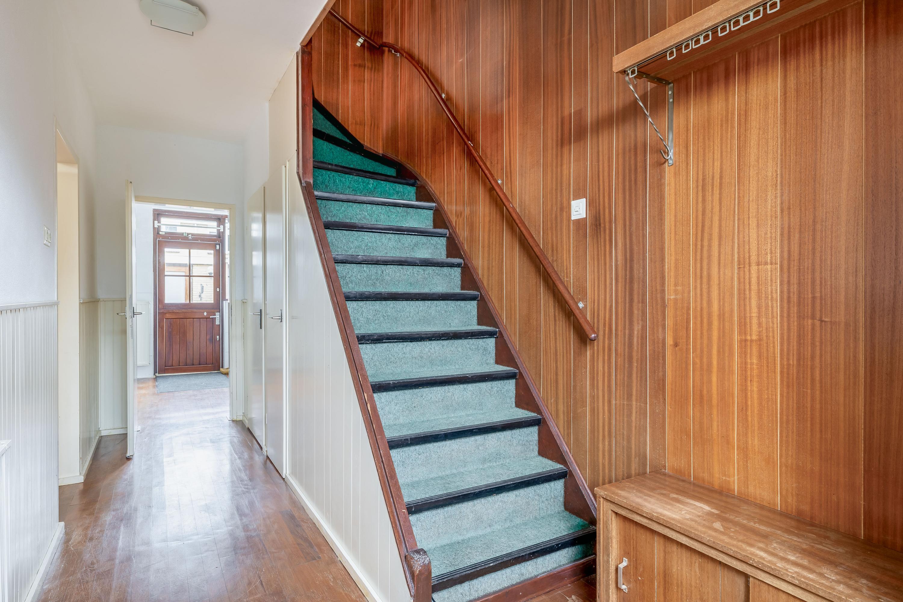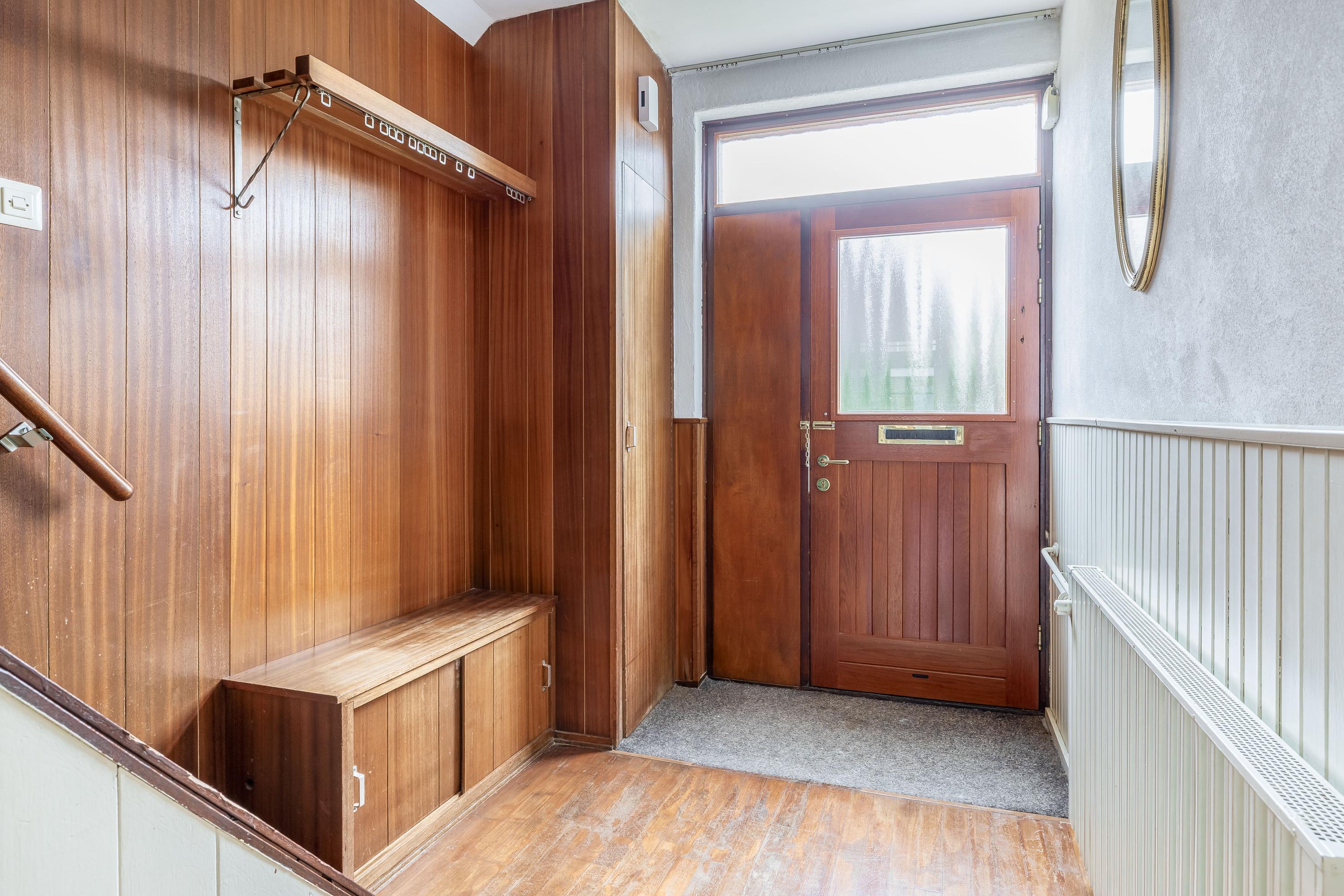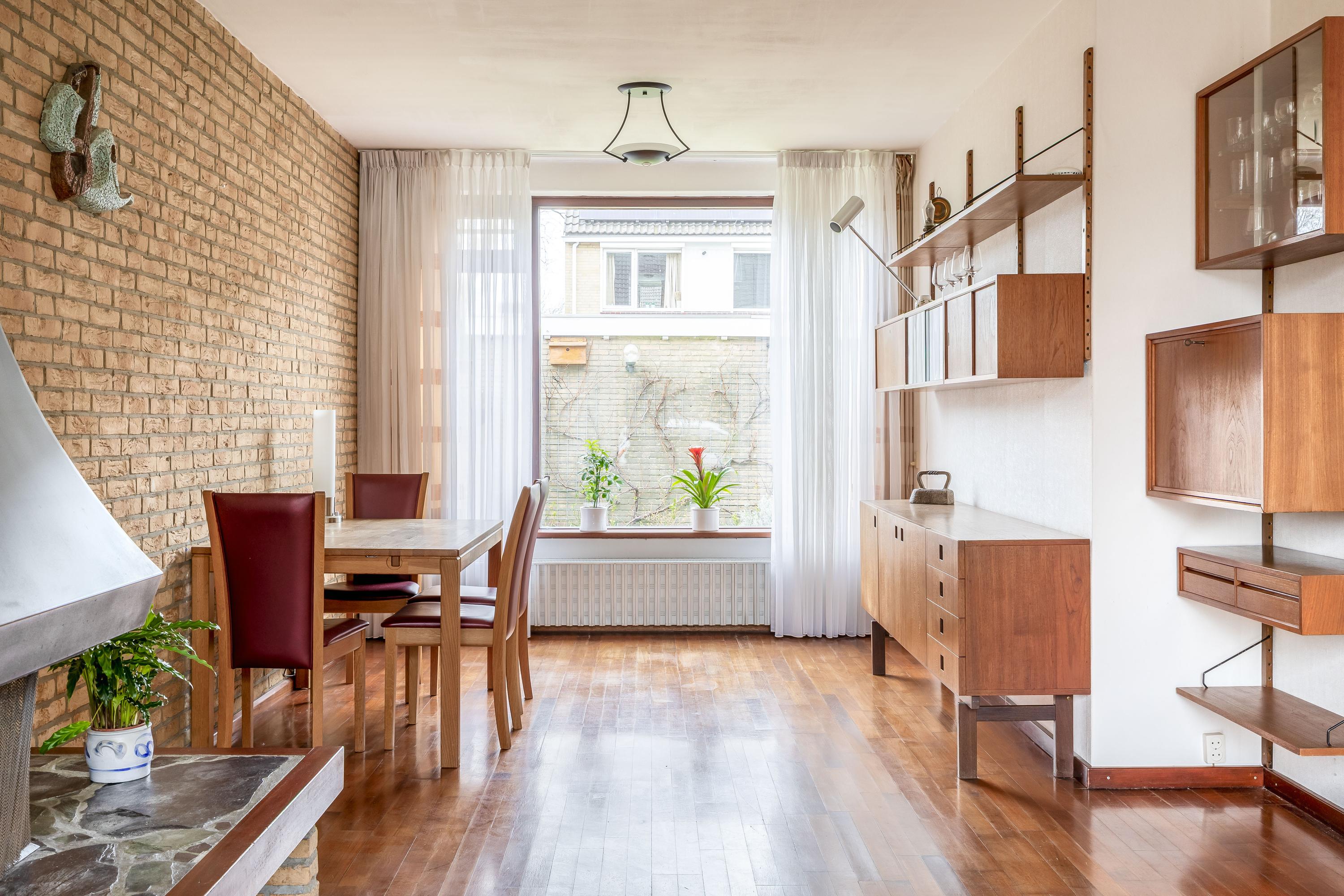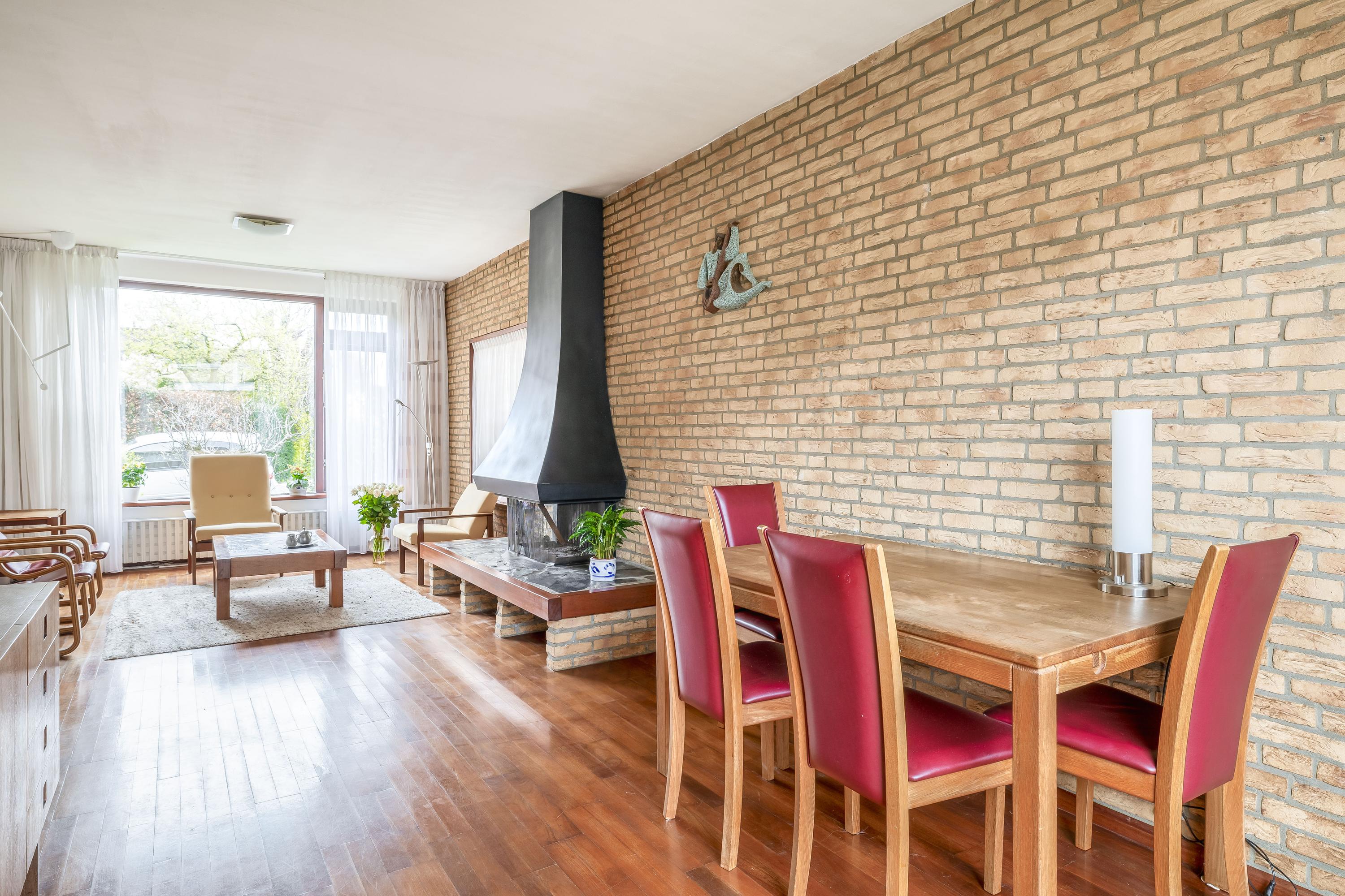Bij binnenkomst in de woning komt u in de hal, waar zich het toilet en de meterkast bevinden. Daarnaast is er voldoende ruimte voor het creëren van een garderobe. De entree vormt een praktische en functionele binnenkomst met toegang tot de overige vertrekken van de woning. De woonkamer kenmerkt zich door de prettige lichtinval en een fijne, praktische indeling. De grote raampartij aan de voorzijde zorgt voor een open en ruimtelijk gevoel. De ruimte is afgewerkt met een parketvloer, die zorgt voor een warme en tijdloze uitstraling. De open haard vormt een centraal element in de woonkamer en geeft de ruimte extra sfeer en karakter. Dankzij de royale afmetingen is er voldoende plaats voor een comfortabele zithoek en een eethoek, waardoor de woonkamer zich uitstekend leent voor zowel dagelijks gebruik als het ontvangen van gasten.