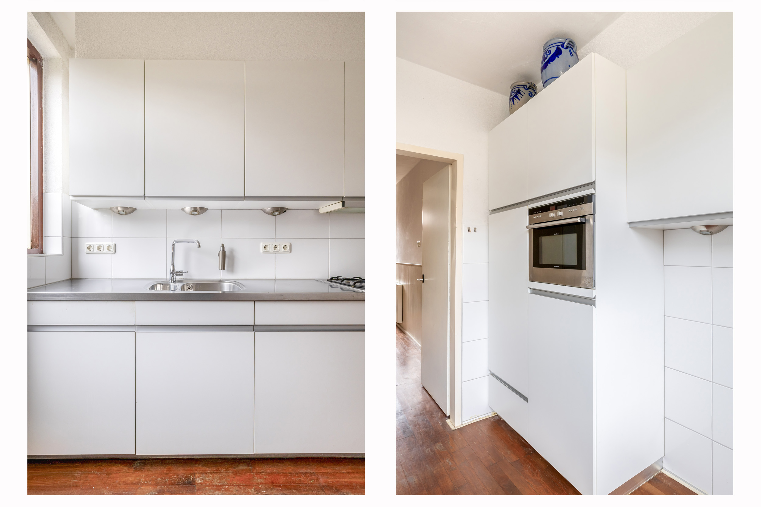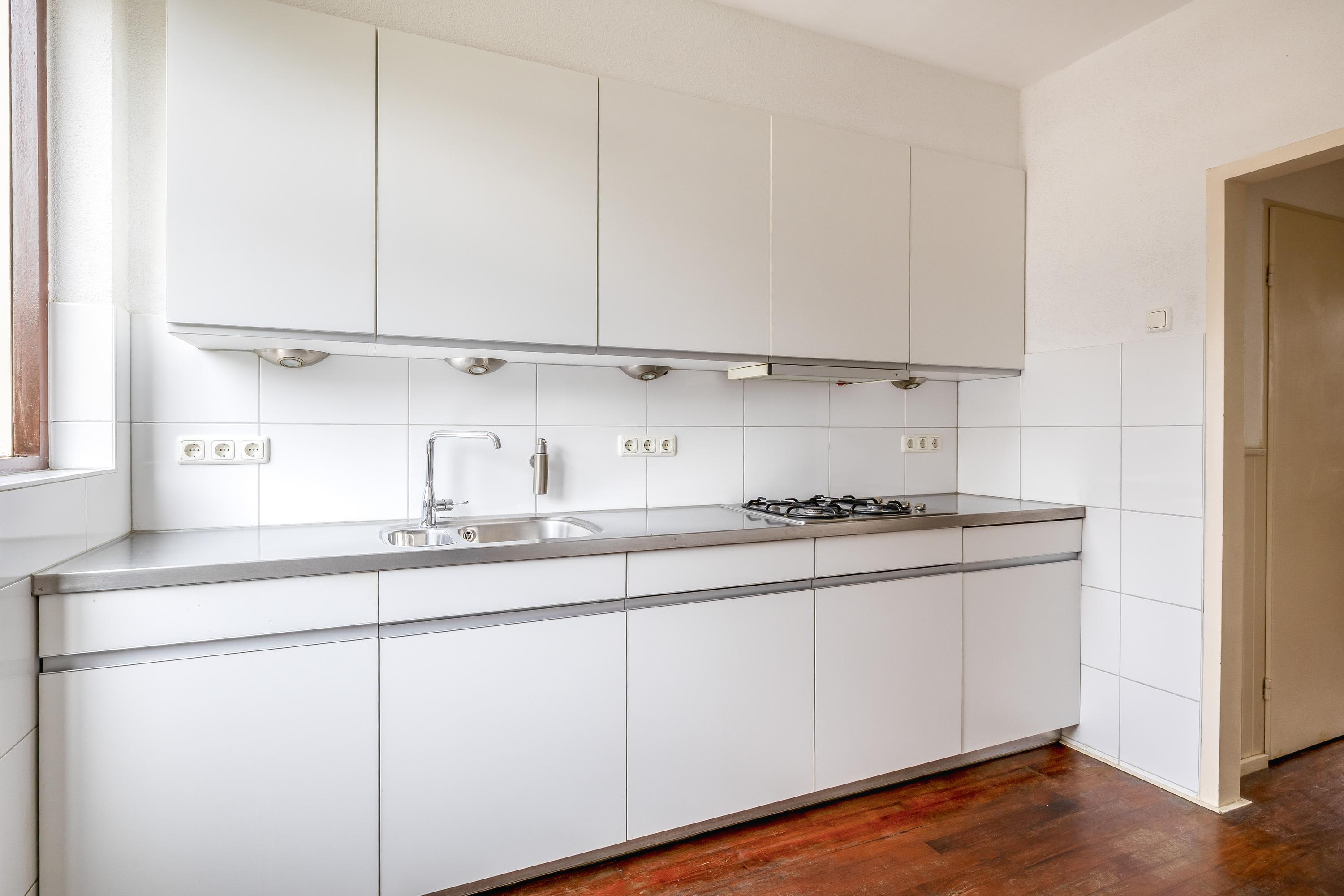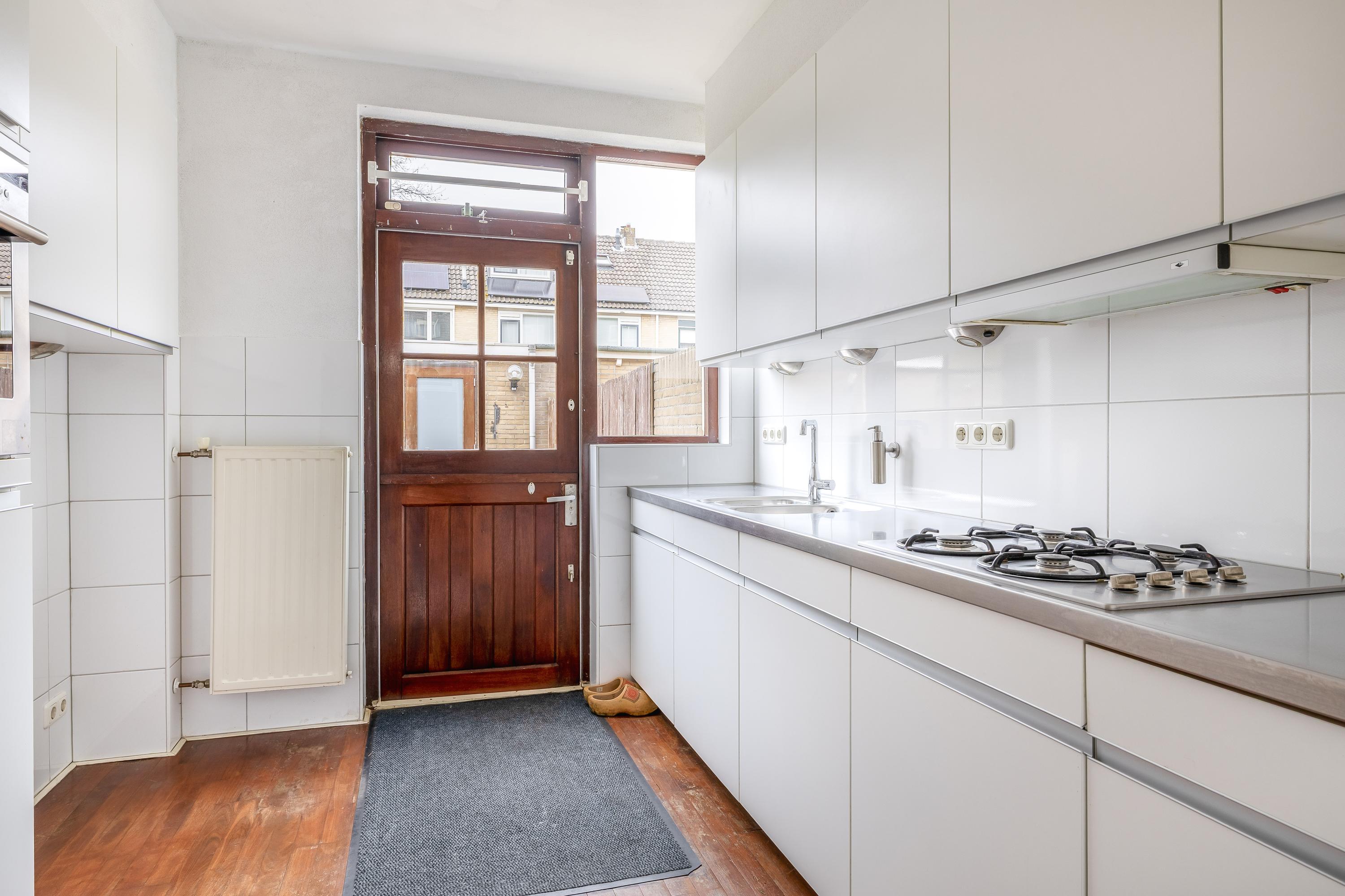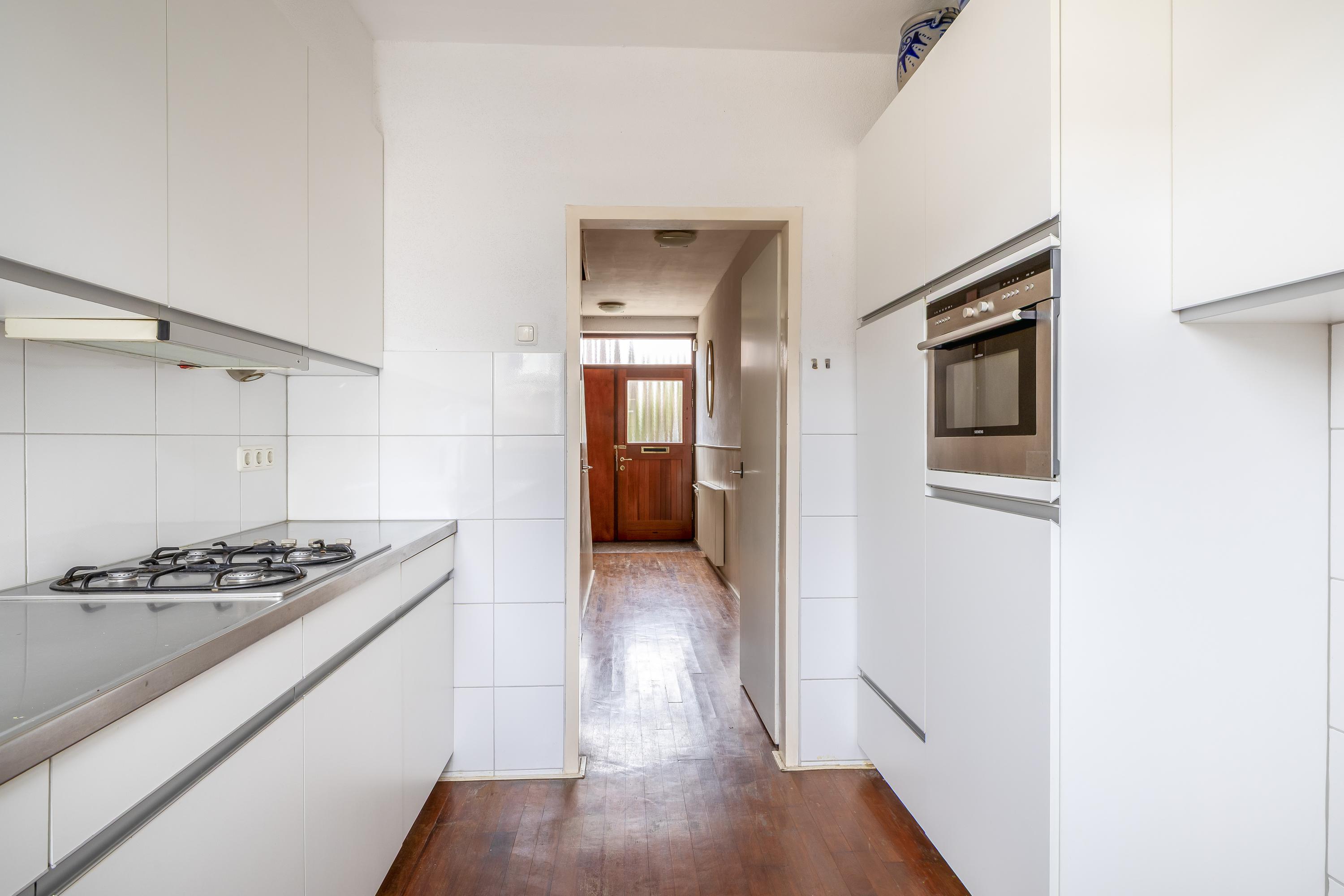 De keuken, vernieuwd in 2014, is uitgevoerd in een lichte kleurstelling en heeft een strakke nette uitstraling. De praktische opstelling biedt voldoende werk- en bergruimte en is voorzien van diverse inbouwapparatuur o.a. 4-pitsgaskookstel met afzuiging, koel-vriescombinatie en combi-oven. Dankzij de directe verbinding met de tuin vormt de keuken een fijne plek waar binnen en buiten naadloos in elkaar overlopen.