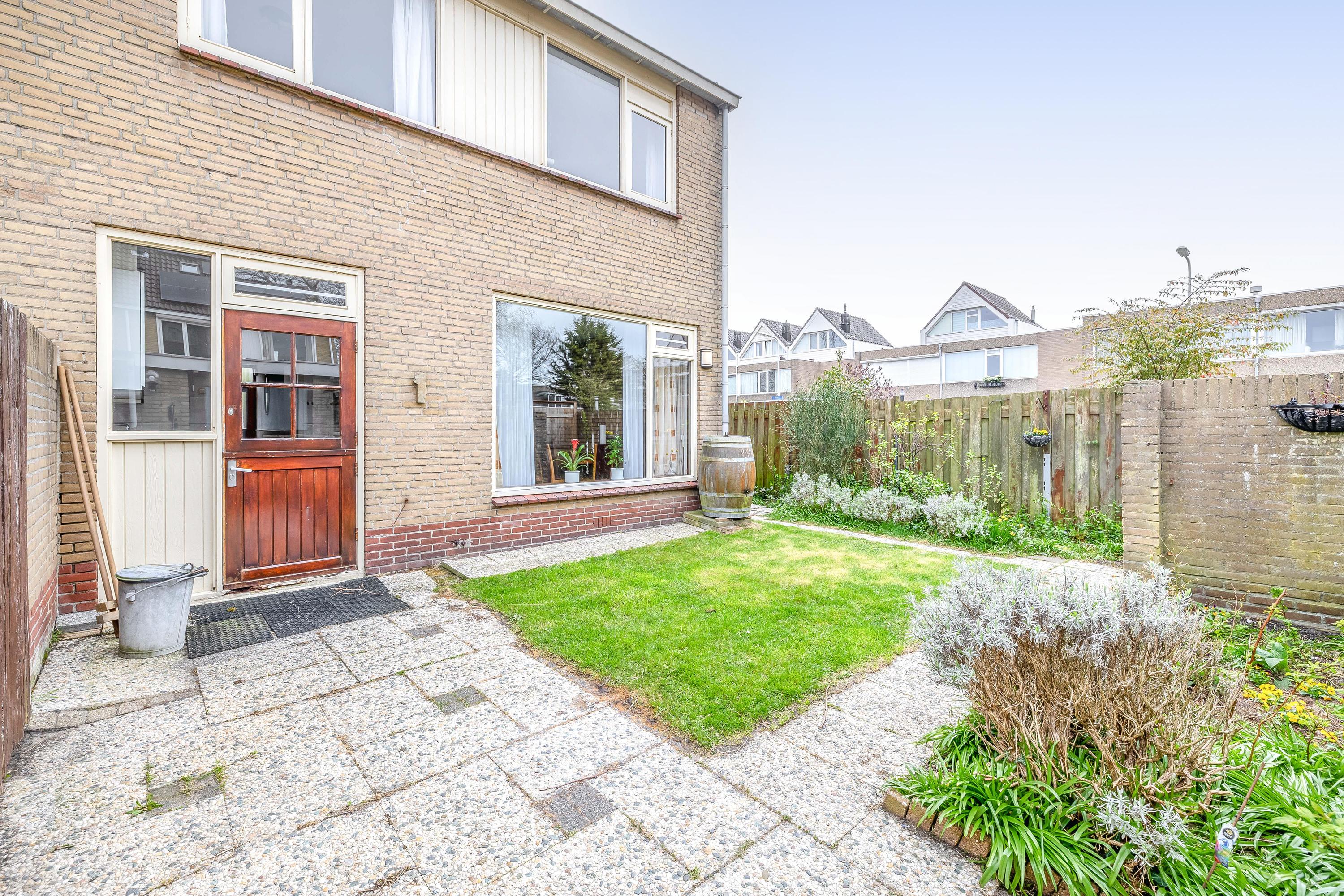De achtertuin is gelegen op het noordwesten, waardoor u hier kunt genieten van de middag- en avondzon. De tuin is praktisch ingericht met een combinatie van gazon, bestrating en groene beplanting, wat zorgt voor een prettige balans tussen onderhoudsgemak en sfeer. Er is voldoende ruimte voor het plaatsen van een zitje, zodat u optimaal van de buitenruimte kunt genieten. Achterin de tuin bevindt zich de toegang tot de naastgelegen garage. Deze garage biedt ruimte voor het parkeren van een auto en is bovendien voorzien van water en elektra, wat extra gebruiksmogelijkheden biedt, bijvoorbeeld voor hobby of opslag.