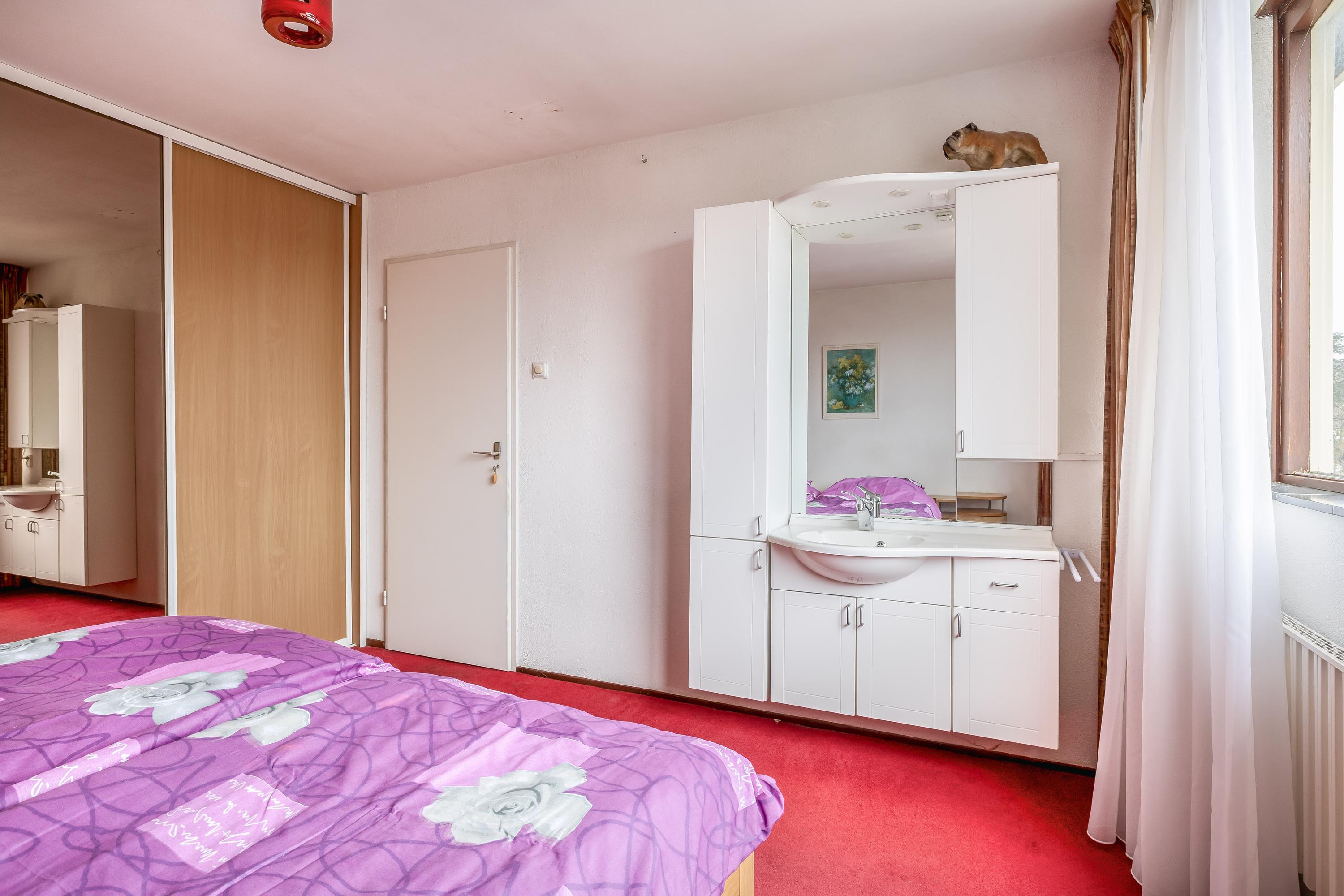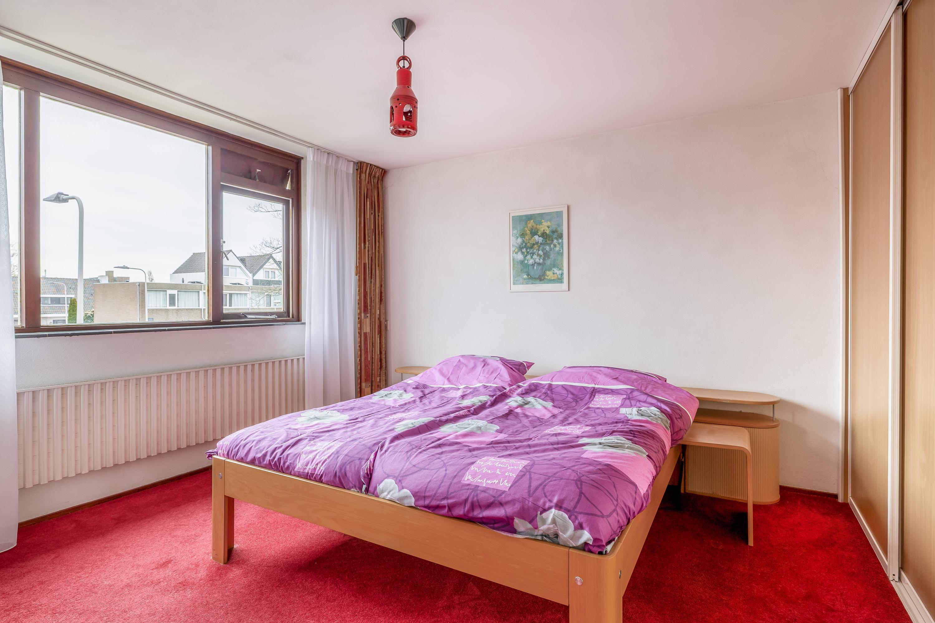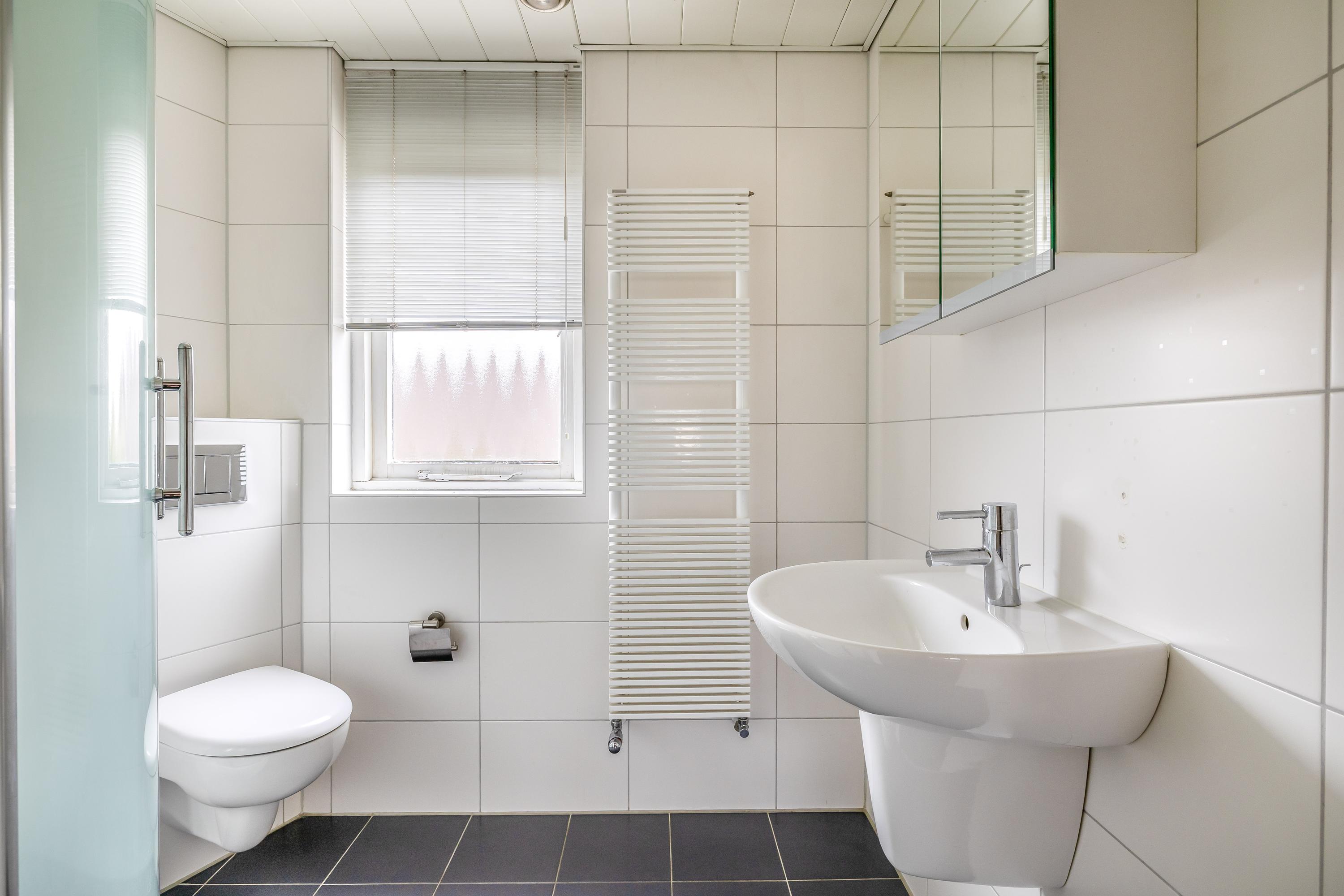 De overloop biedt toegang tot de verschillende vertrekken op deze verdieping en beschikt over een praktische inbouwkast, ideaal voor extra bergruimte. Vanaf de overloop bereikt u drie slaapkamers, waaronder een royale masterbedroom met wastafelmeubel. De kamers zijn functioneel ingedeeld en bieden diverse mogelijkheden voor slapen, werken of het inrichten van een hobbyruimte. De badkamer is in 2015 vernieuwd en uitgevoerd in een moderne, lichte stijl. De ruimte is volledig betegeld en heeft een verzorgde uitstraling. De badkamer is praktisch ingedeeld en voorzien van een douche, wastafel en toilet. Daarnaast zorgt het aanwezige raam voor natuurlijke ventilatie en daglicht, wat bijdraagt aan een frisse en comfortabele ruimte.