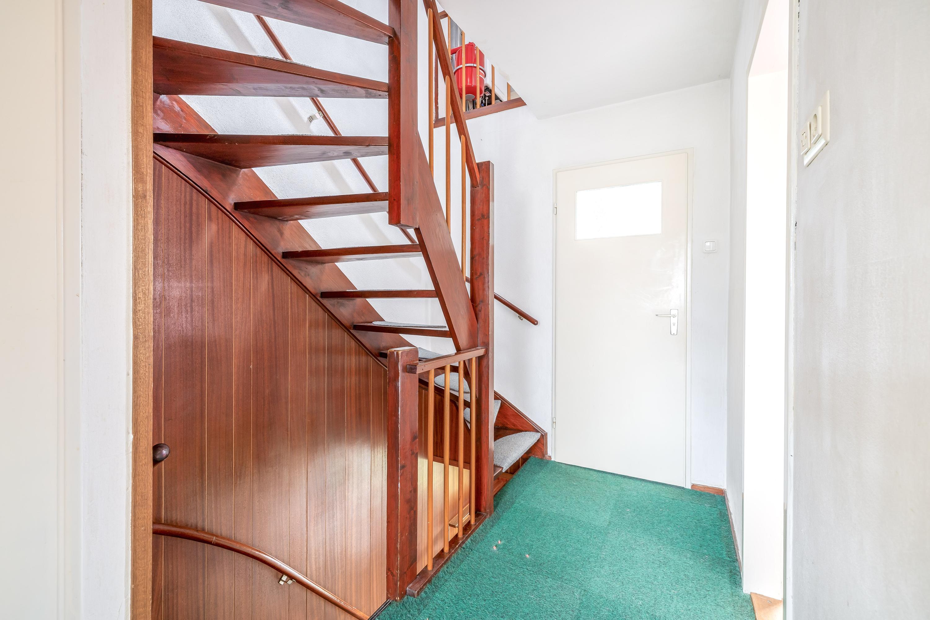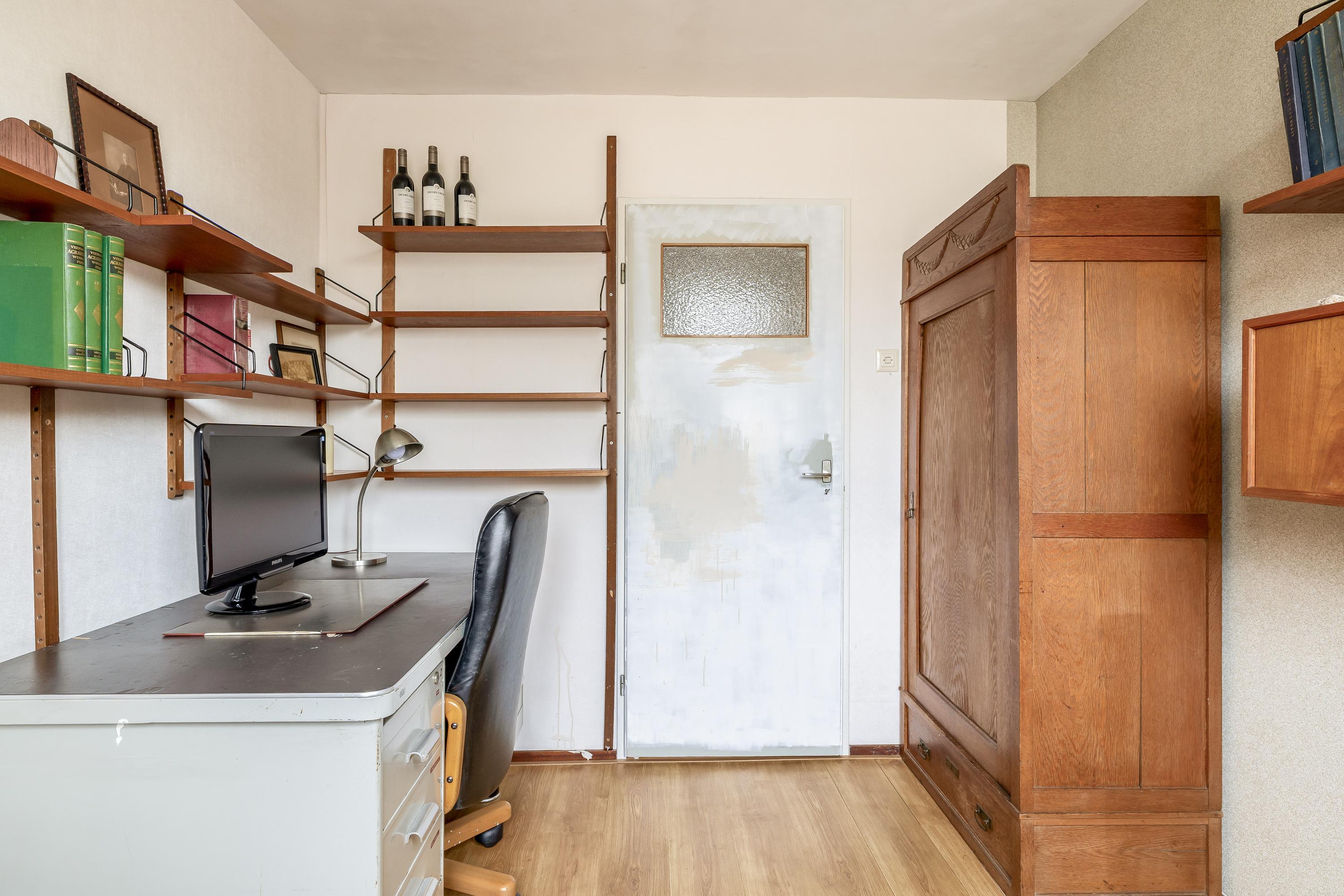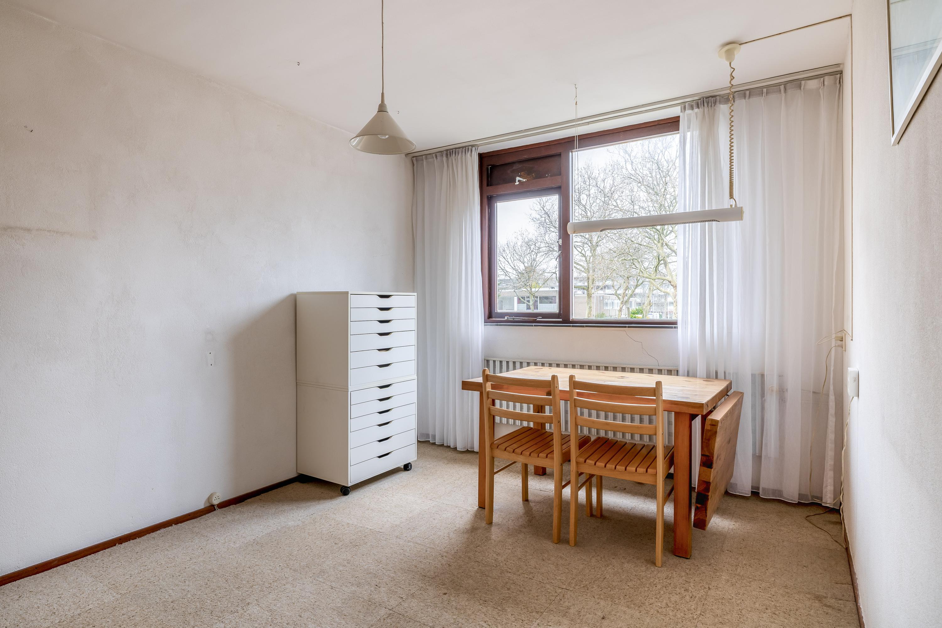 De overloop biedt toegang tot de verschillende vertrekken op deze verdieping en beschikt over een praktische inbouwkast, ideaal voor extra bergruimte. Vanaf de overloop bereikt u drie slaapkamers, waaronder een royale masterbedroom met wastafelmeubel. De kamers zijn functioneel ingedeeld en bieden diverse mogelijkheden voor slapen, werken of het inrichten van een hobbyruimte. De badkamer is in 2015 vernieuwd en uitgevoerd in een moderne, lichte stijl. De ruimte is volledig betegeld en heeft een verzorgde uitstraling. De badkamer is praktisch ingedeeld en voorzien van een douche, wastafel en toilet. Daarnaast zorgt het aanwezige raam voor natuurlijke ventilatie en daglicht, wat bijdraagt aan een frisse en comfortabele ruimte.