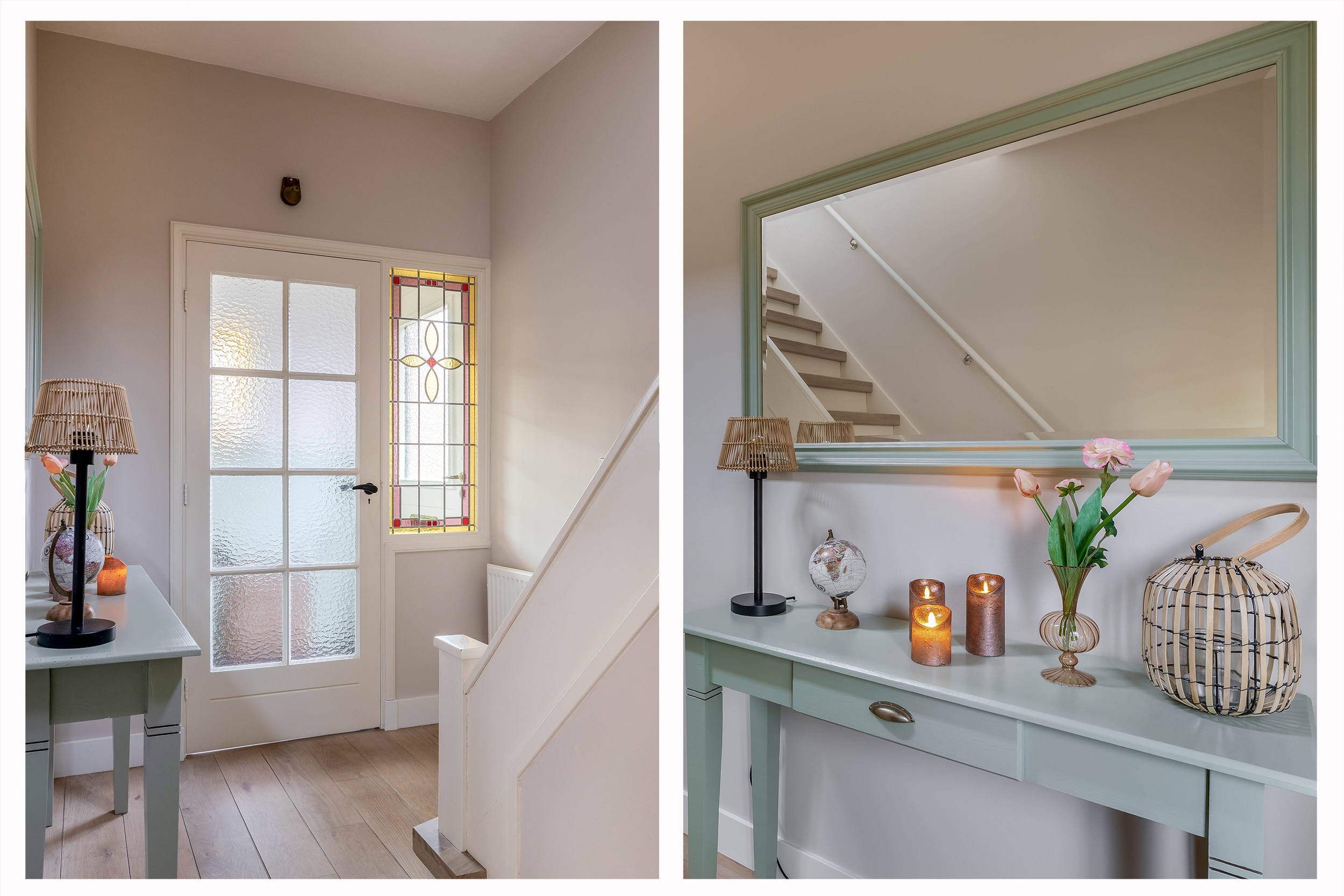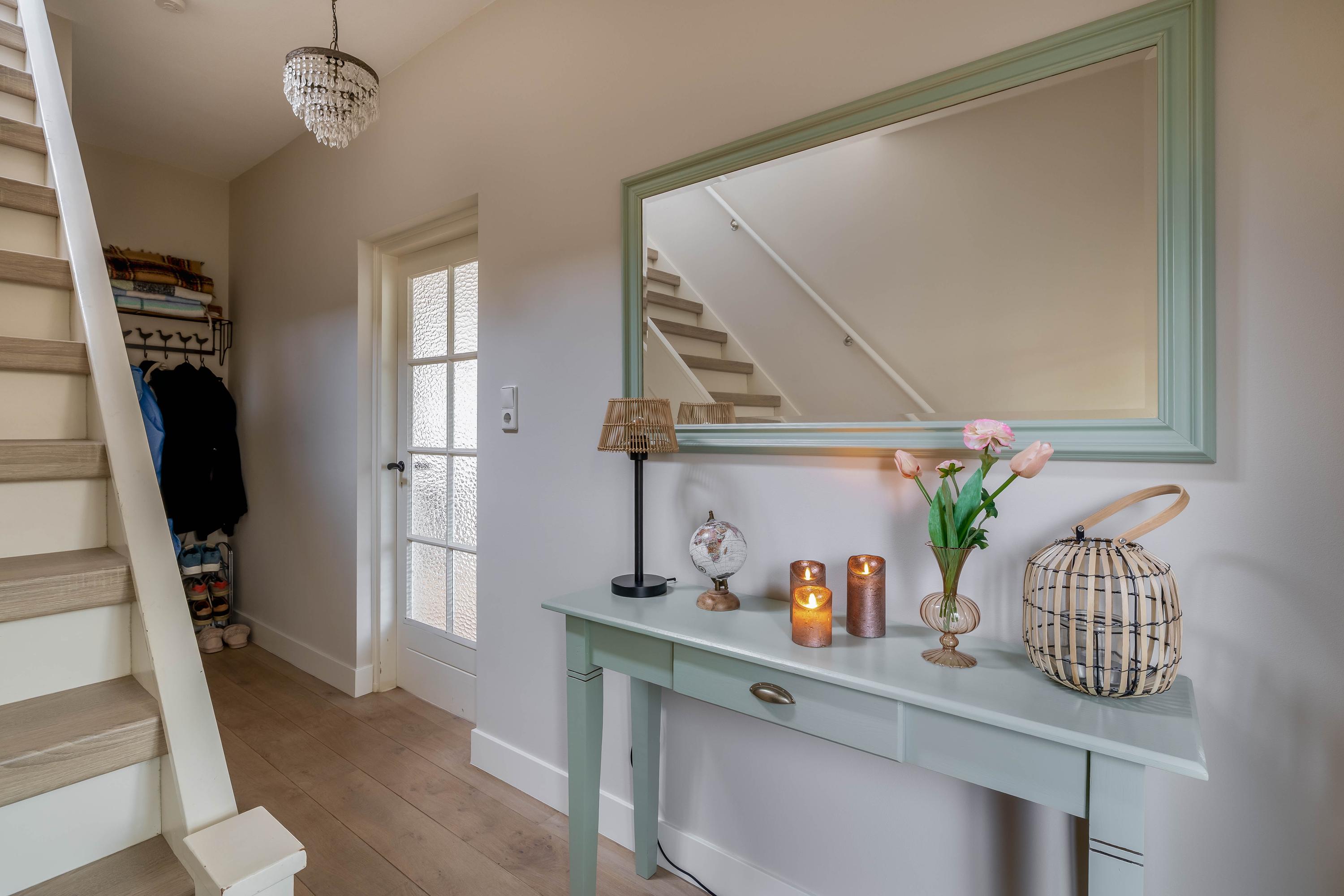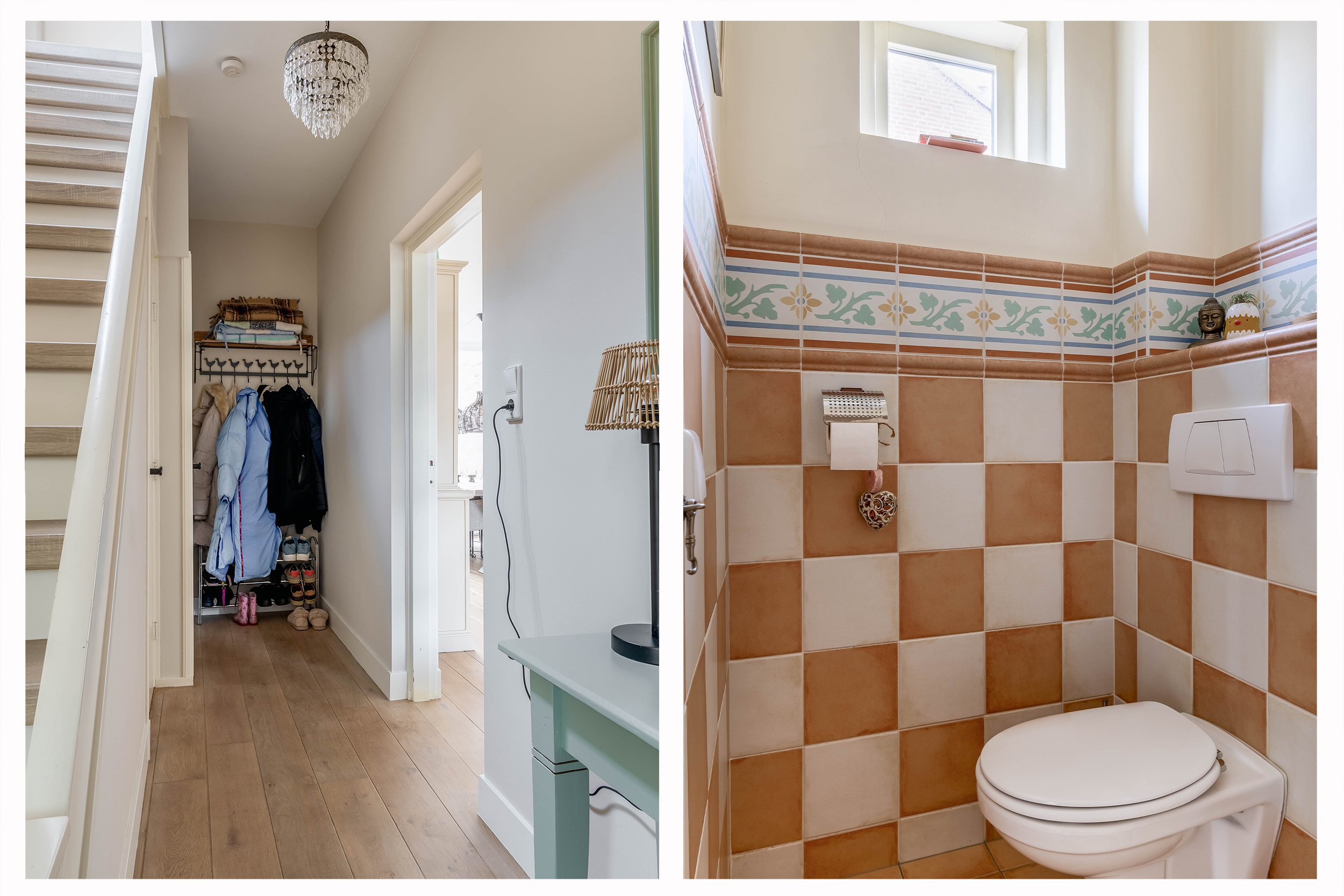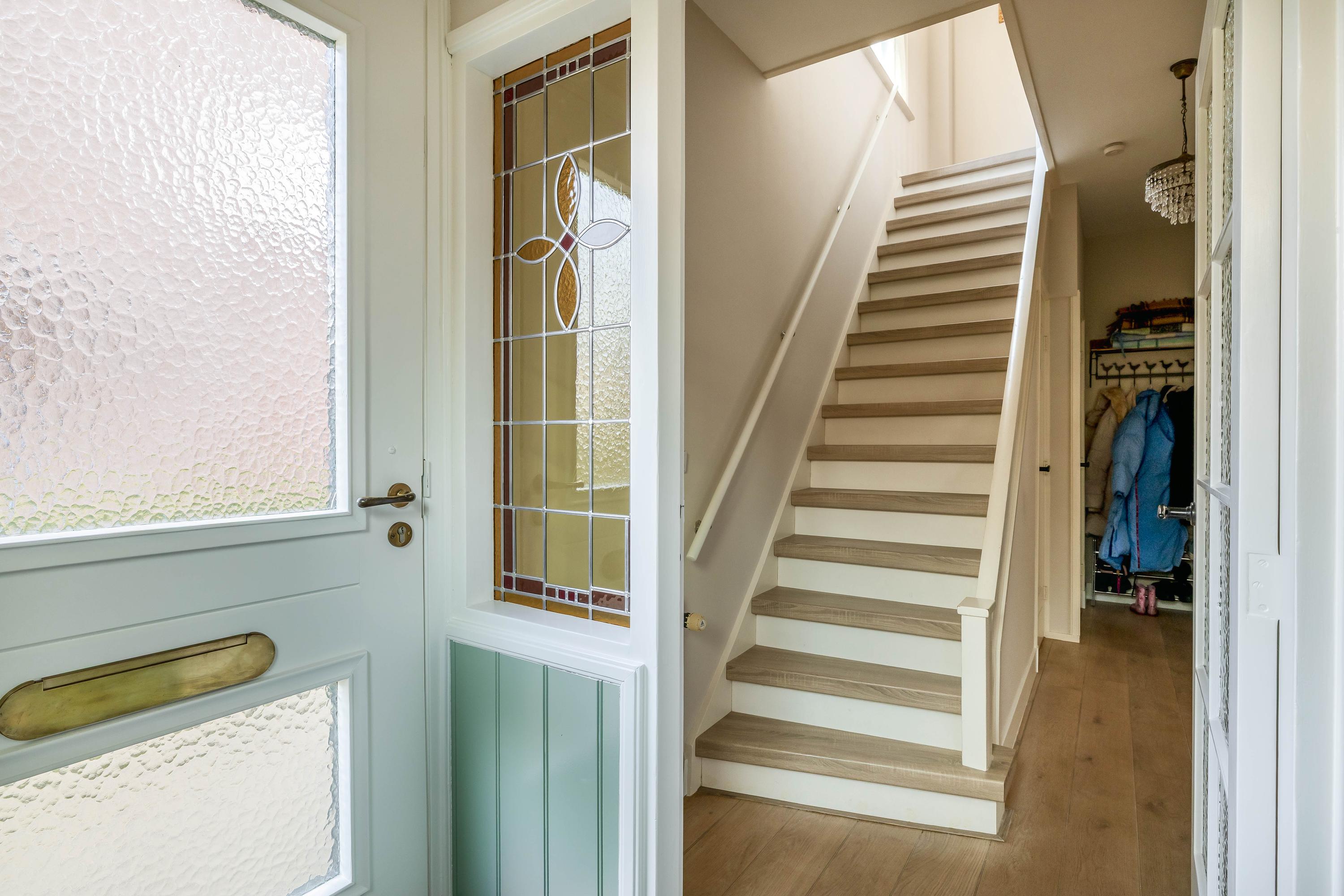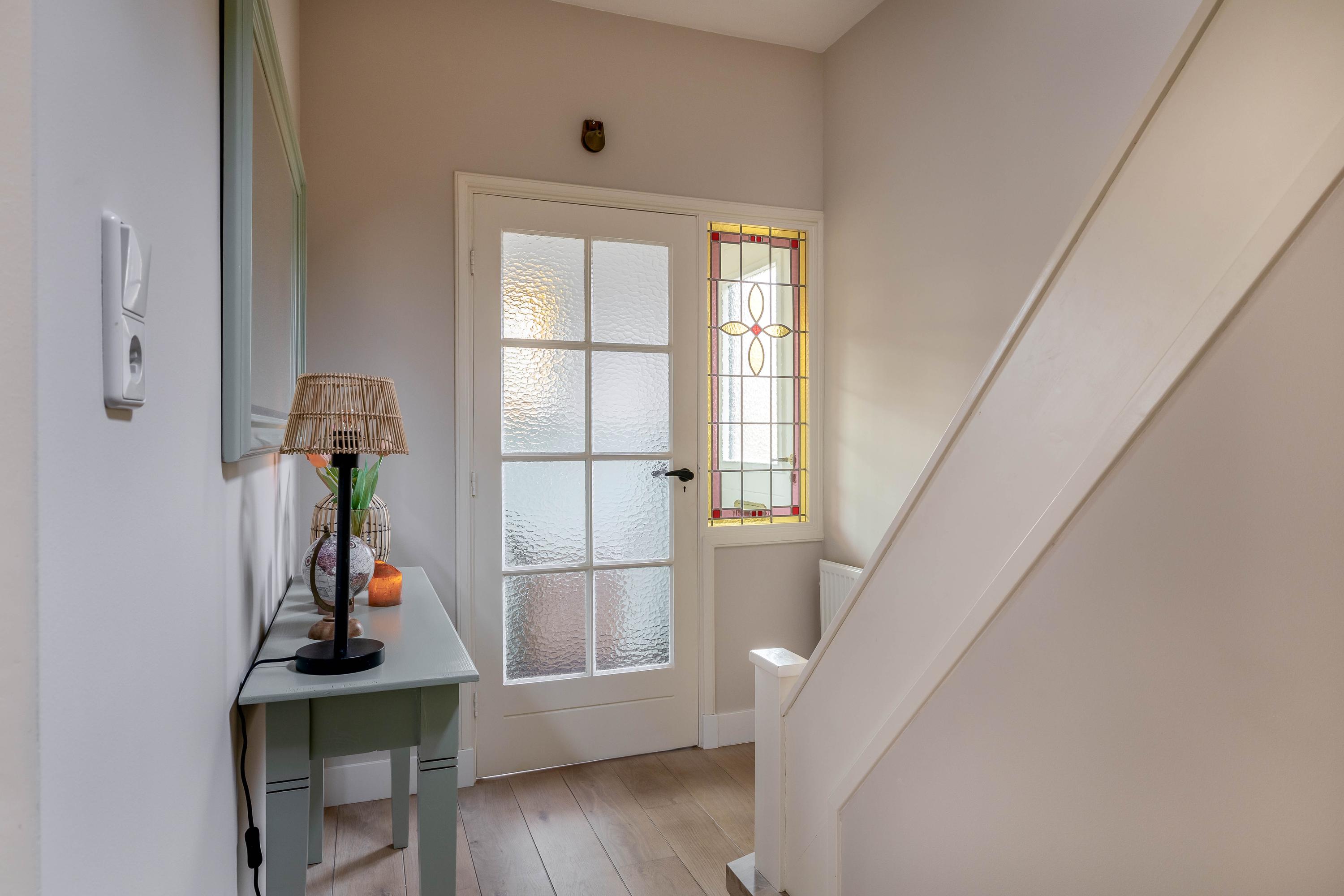 Begane grond; via de riante oprit betreedt u de woning, entree aan de zijkant van de woning, tochthal met authentieke glas-in-lood-details, hal met trapopgang, vaste kast en toiletruimte. Vanuit de hal is toegang tot de woonkamer.